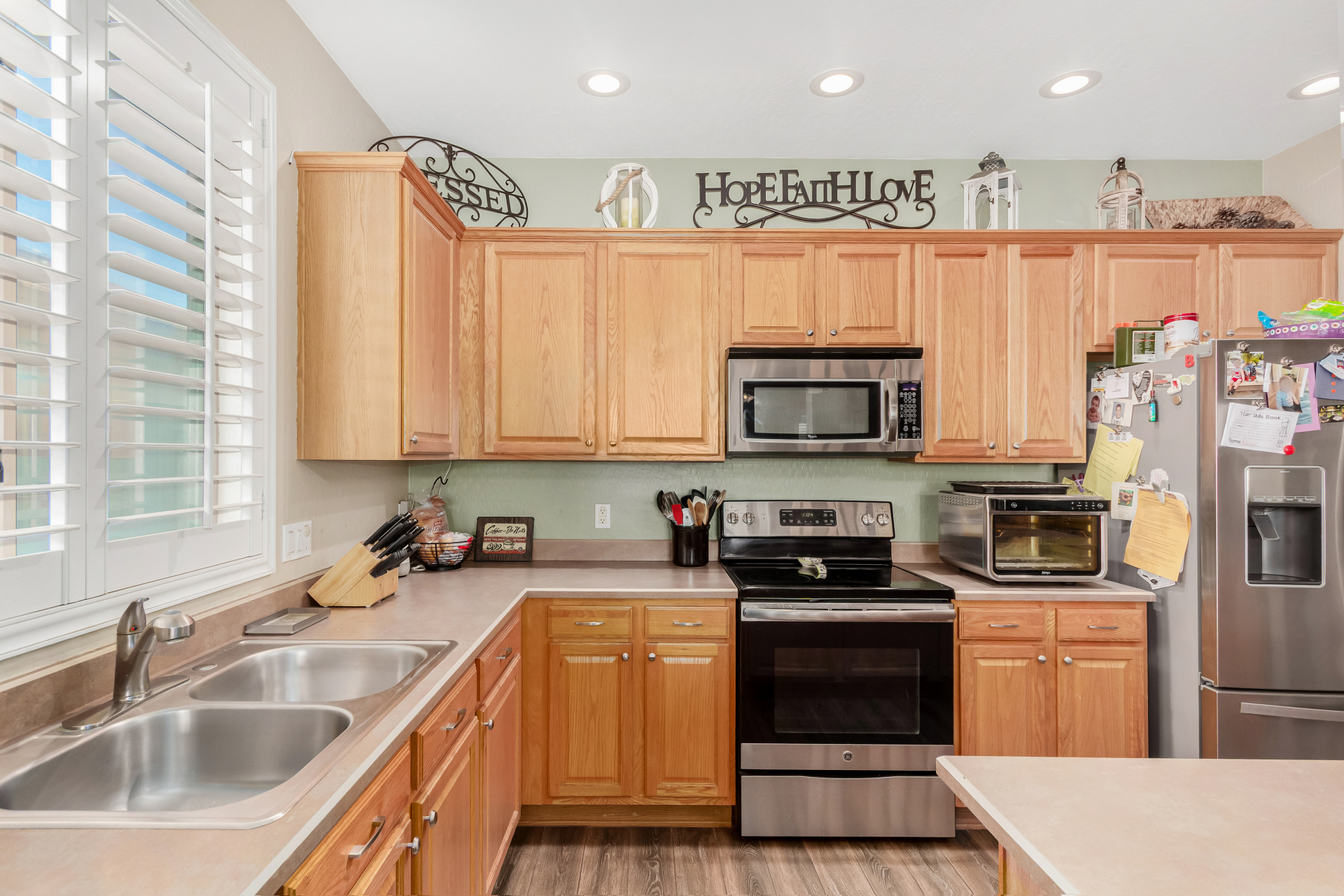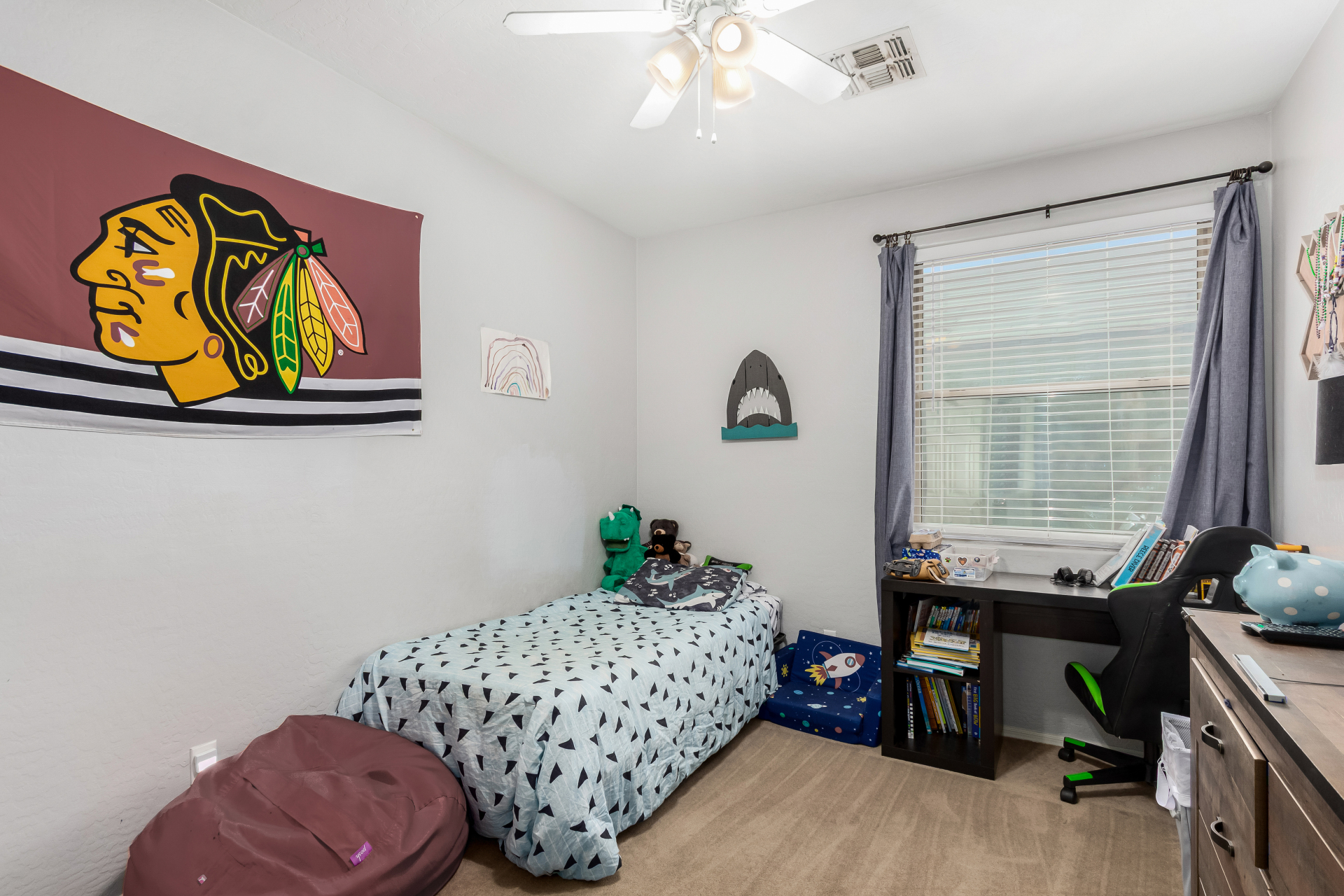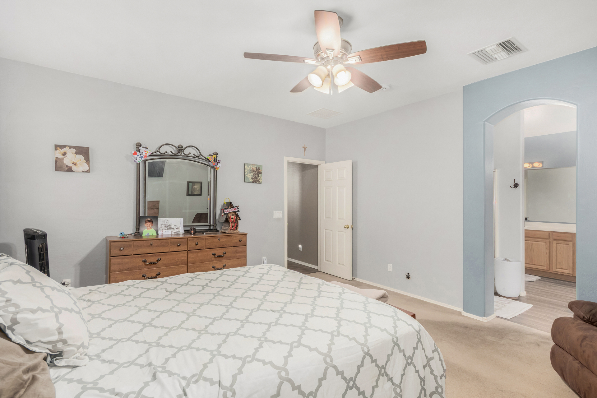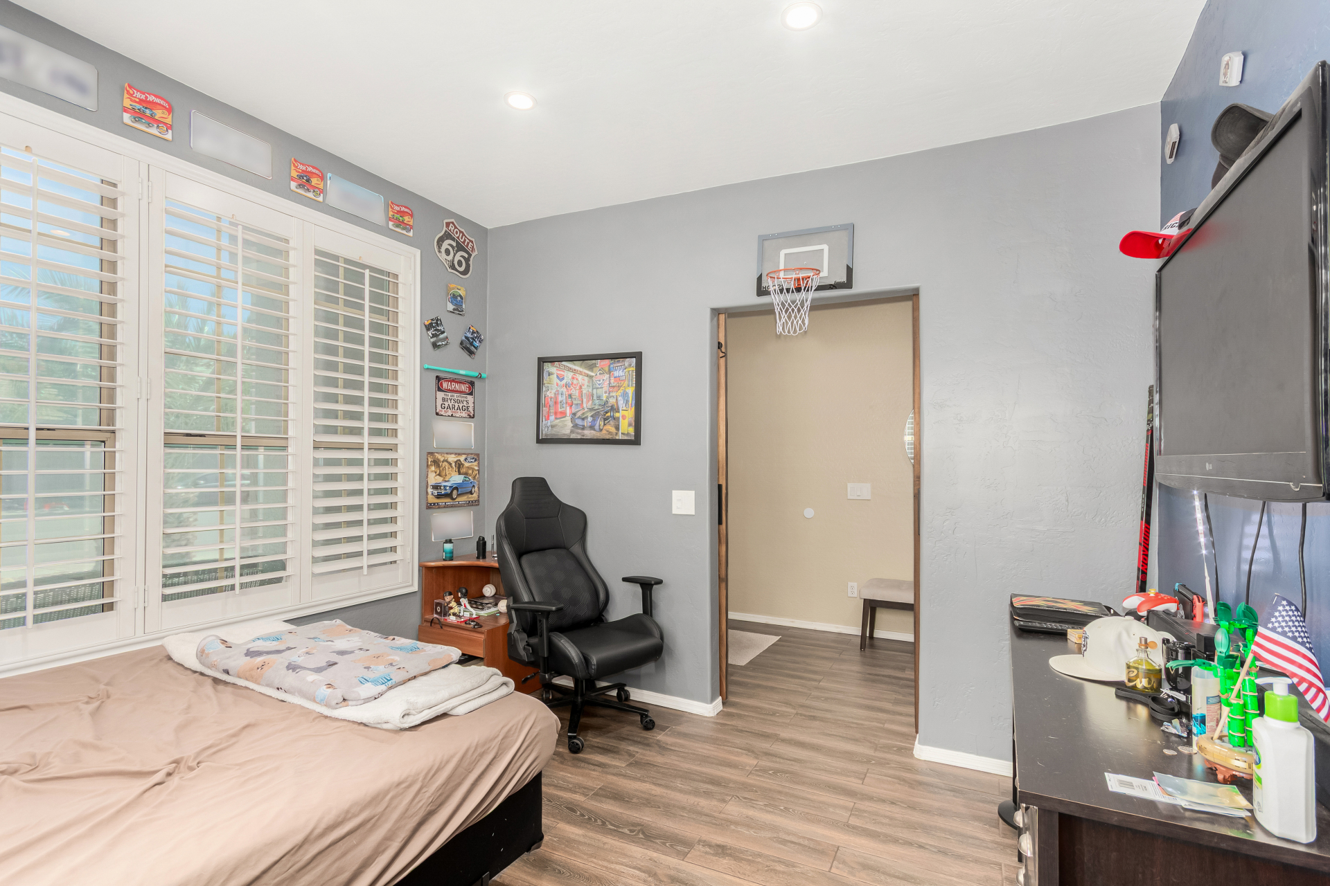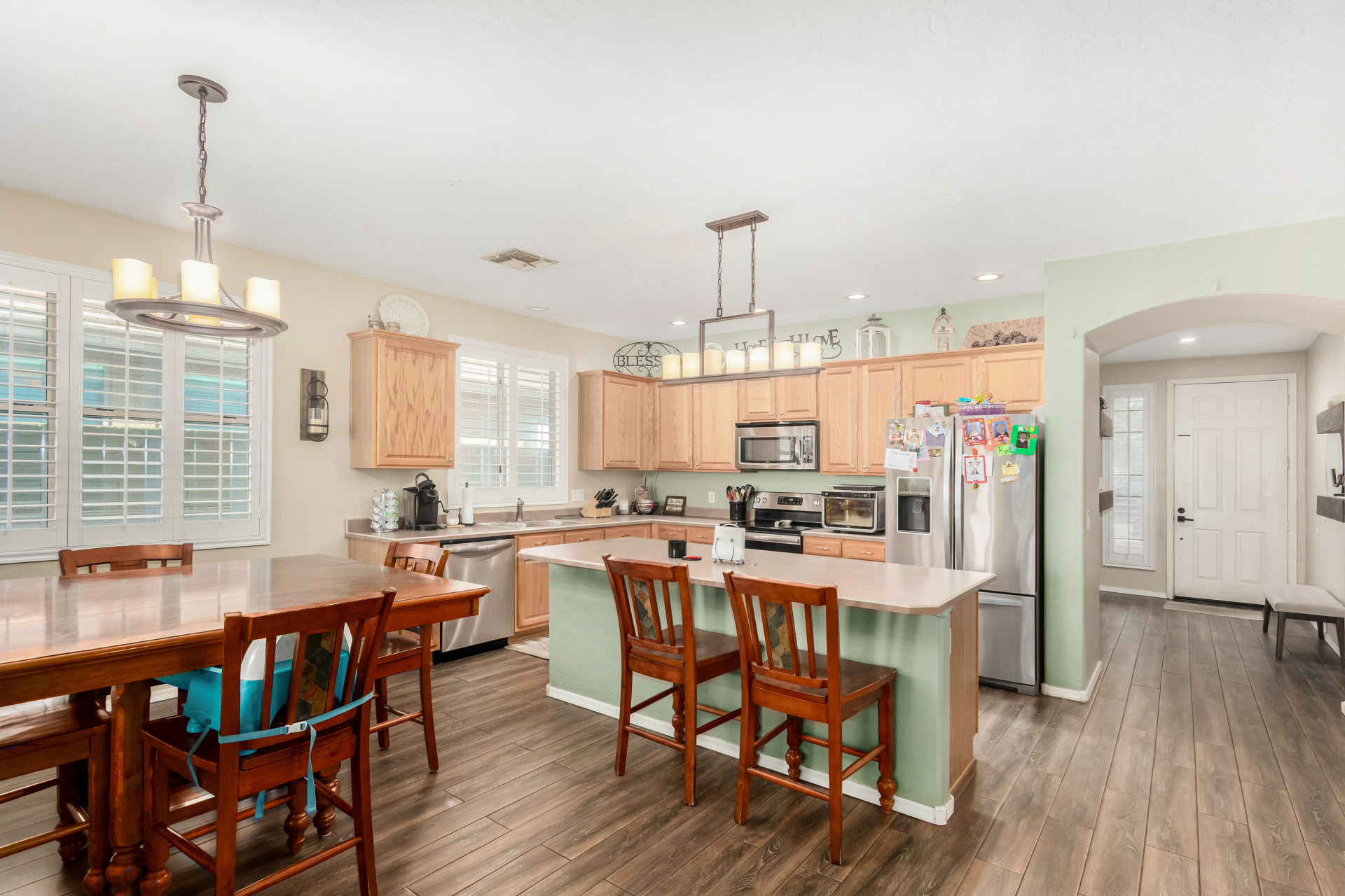 Spacious single-level home 3 bedrooms, 2 bathrooms, bonus room, 2 Car Garage in Dove Valley Ranch! A paver courtyard entrance leads to the front door. The inviting interior features tons of natural light, plantation shutters, designer paint, and wood-look tile flooring w/carpet in all the right places. You'll love the welcoming living room paired with French doors to the back! The eat-in kitchen boasts SS appliances, ample wood cabinetry, a pantry, recessed & pendant lights, and an island w/breakfast bar. Versatile den for an office or extra bedroom as well! Enter the primary bedroom to find an ensuite with dual sinks, a separate tub/shower, & a walk-in closet. The private backyard, with artificial turf & extended paver-covered patio is the ideal spot to relax or enjoy BBQ. Make it yours!