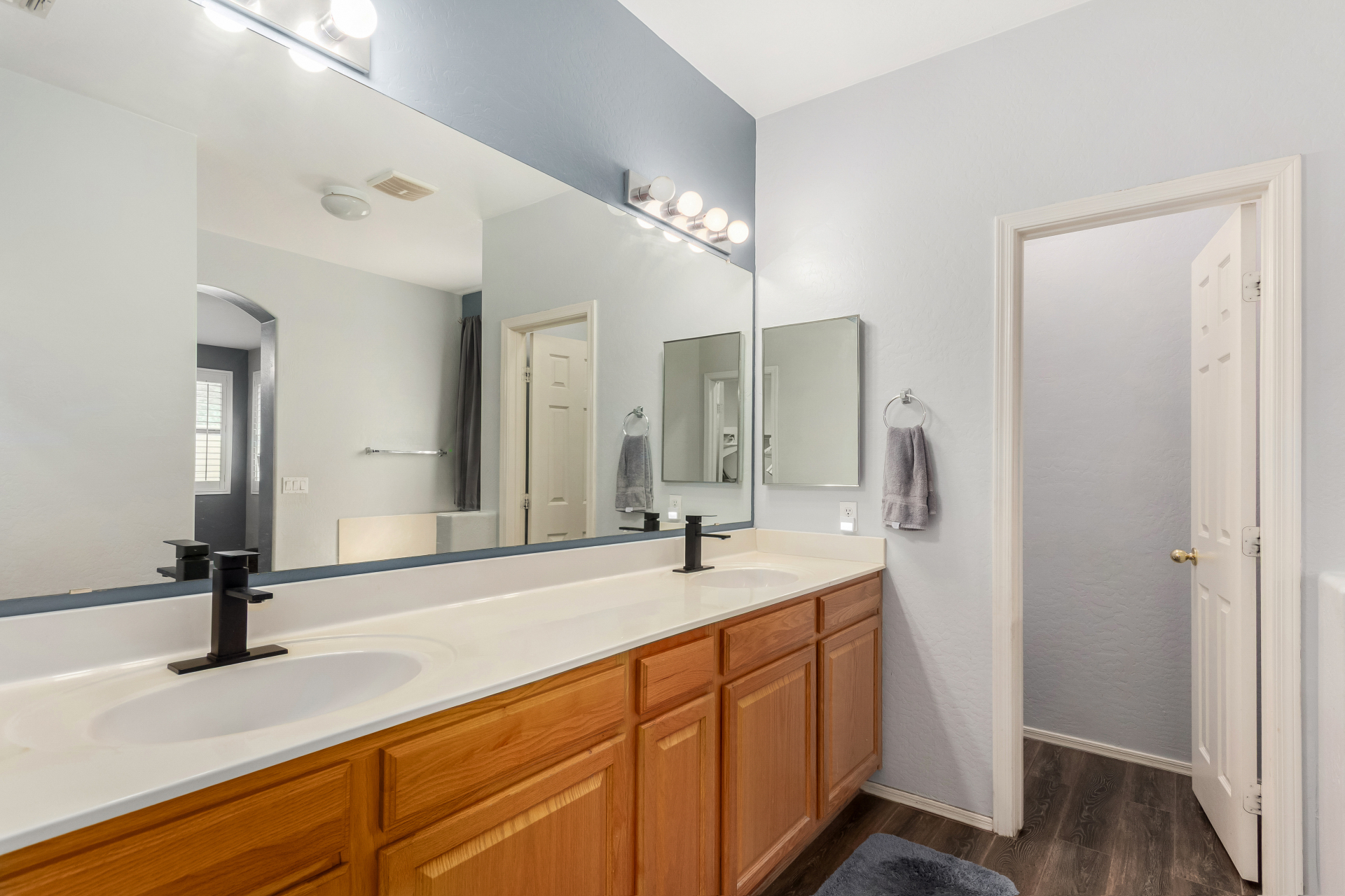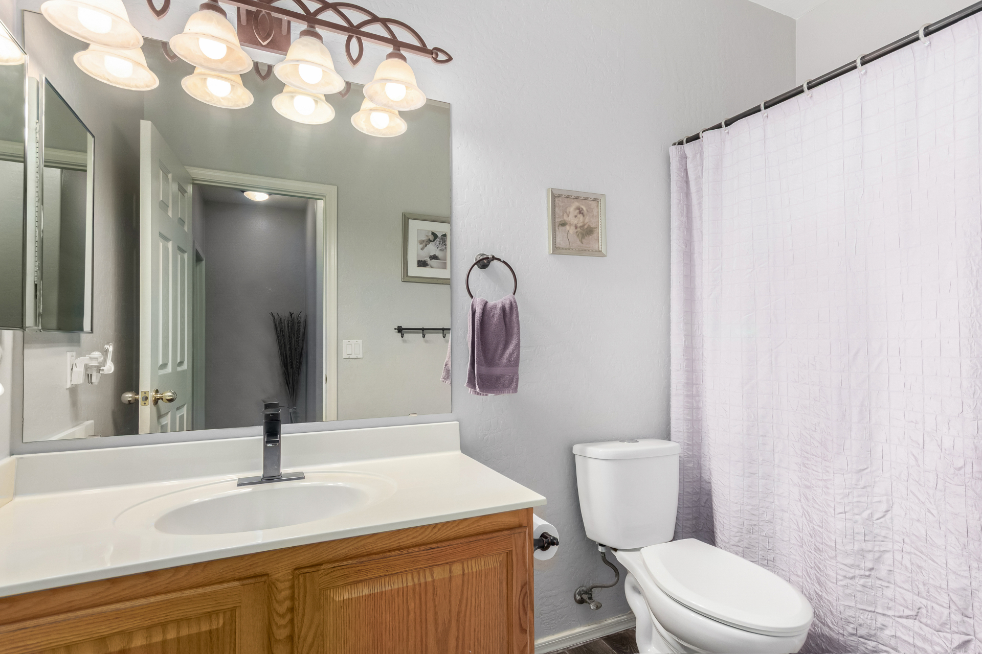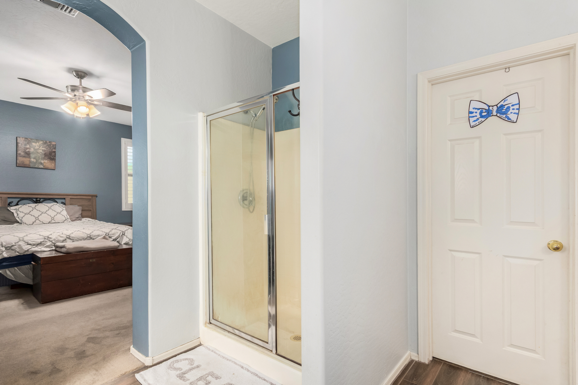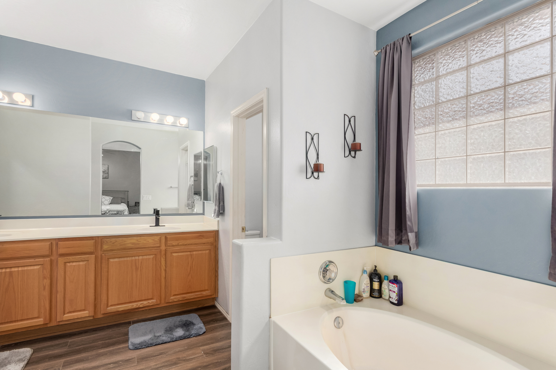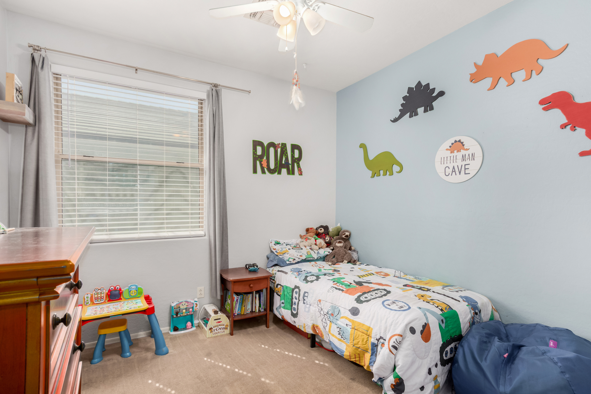 Spacious single-level home 3 bedrooms, 2 bathrooms, bonus room, 2 Car Garage in Dove Valley Ranch! A paver courtyard entrance leads to the front door. The inviting interior features tons of natural light, plantation shutters, designer paint, and wood-look tile flooring w/carpet in all the right places. You'll love the welcoming living room paired with French doors to the back! The eat-in kitchen boasts SS appliances, ample wood cabinetry, a pantry, recessed & pendant lights, and an island w/breakfast bar. Versatile den for an office or extra bedroom as well! Enter the primary bedroom to find an ensuite with dual sinks, a separate tub/shower, & a walk-in closet. The private backyard, with artificial turf & extended paver-covered patio is the ideal spot to relax or enjoy BBQ. Make it yours!