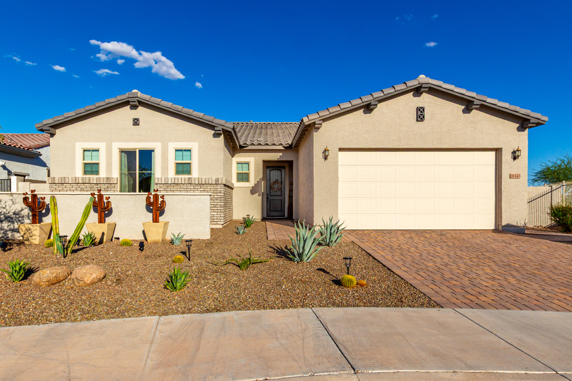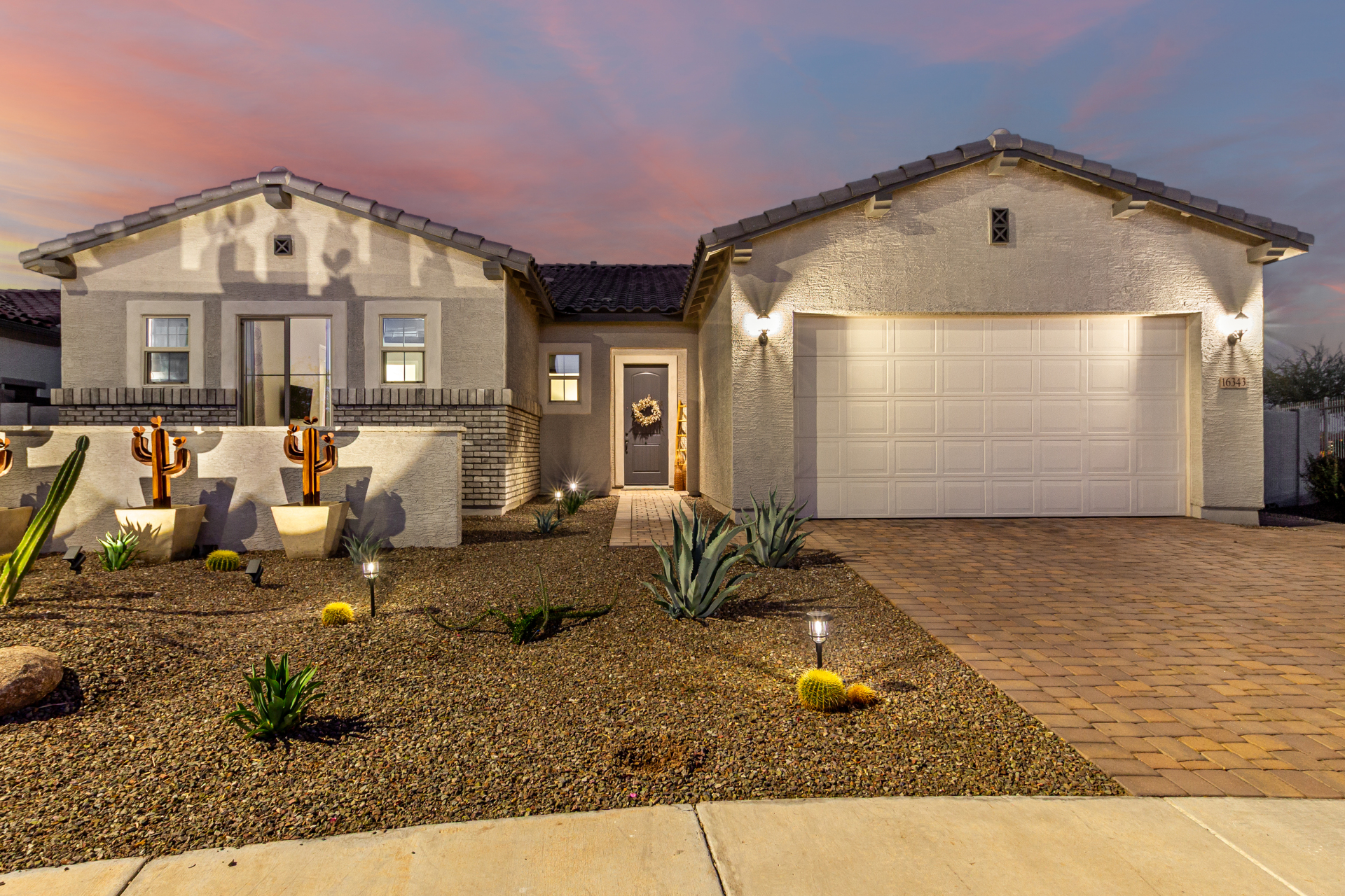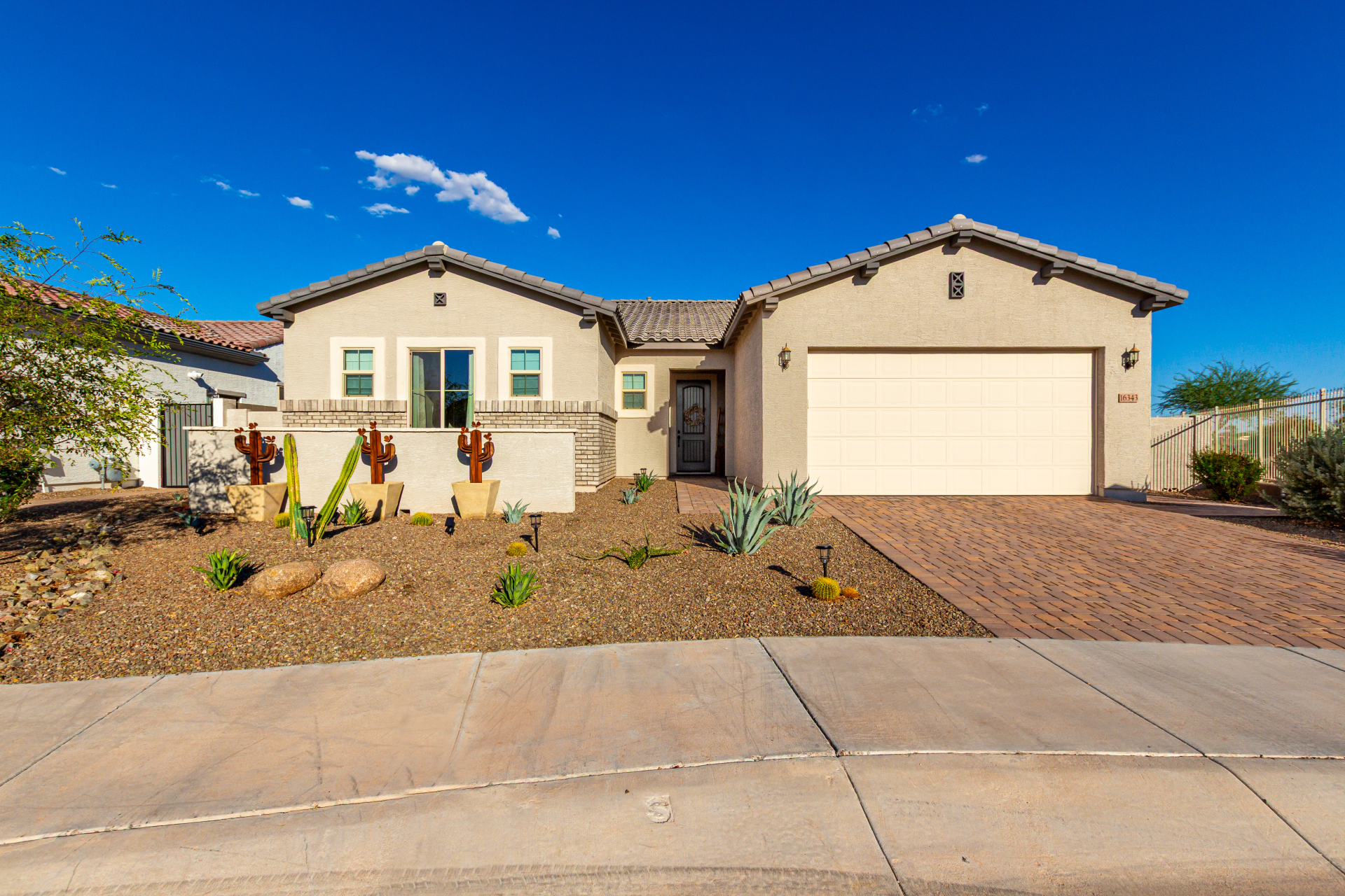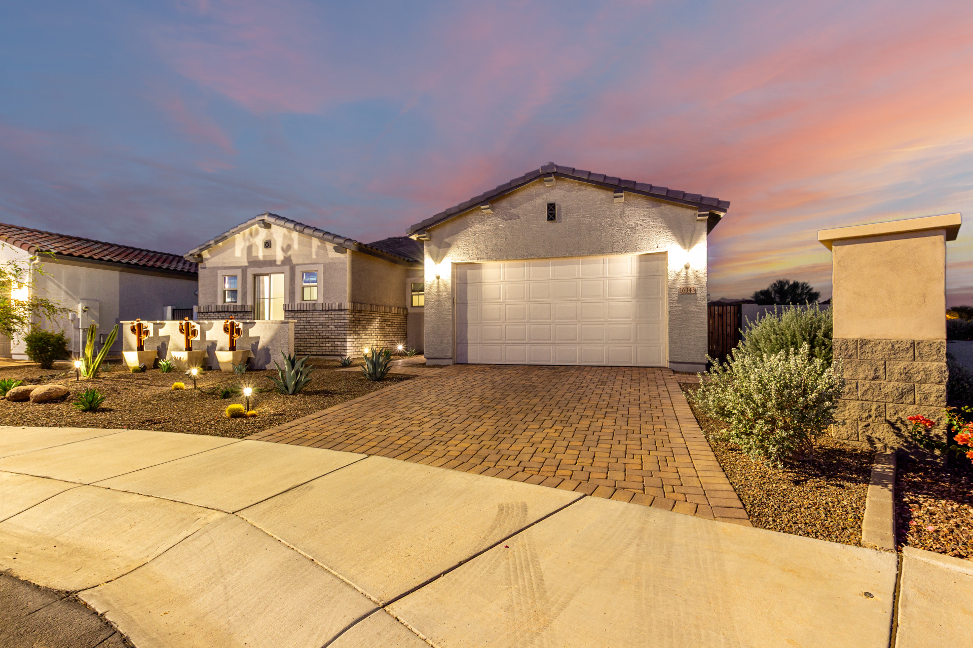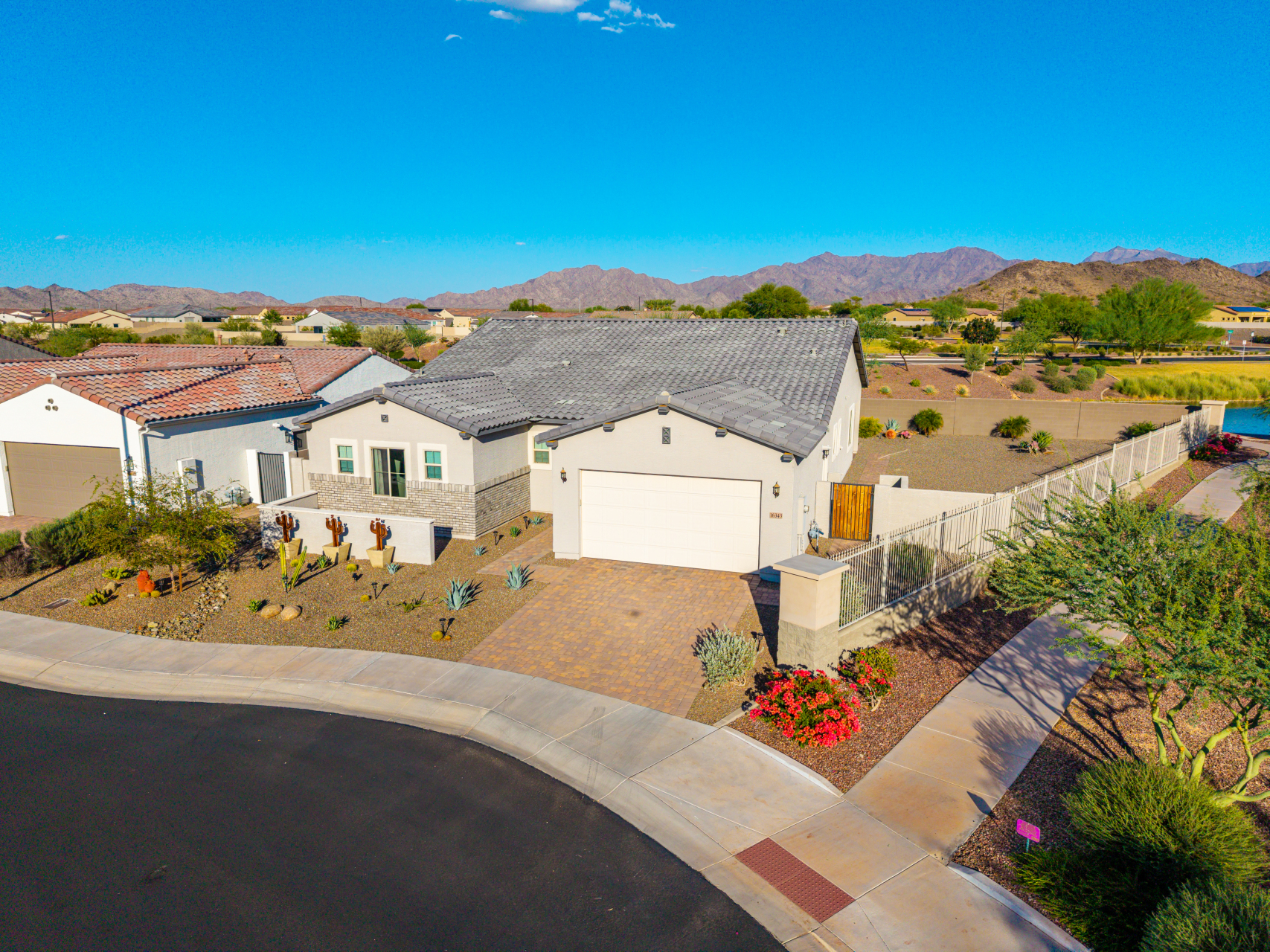 Find your ideal retirement haven in the 55+ gated Community of CantaMia! This gorgeous waterfront home sits on a corner lot, adjacent to a common area - no direct neighbors behind & on one side. It offers 3 beds, 3 baths, desert landscape, & a 2-car garage w/paver driveway. The interior exudes elegance with 10 ft ceilings, tons of natural light, neutral palette, & wood-look tile floors t/out. Excellent floor plan featuring a formal living room and a desirable great room with surround sound & sliding doors to the back. The gourmet kitchen boasts SS appliances w/cooktop gas, granite counters & backsplash, a walk-in pantry, recessed lighting, ample cabinetry w/crown molding, and an island w/breakfast bar. The main bedroom has outdoor access and an ensuite with two vanities & a walk-in closet