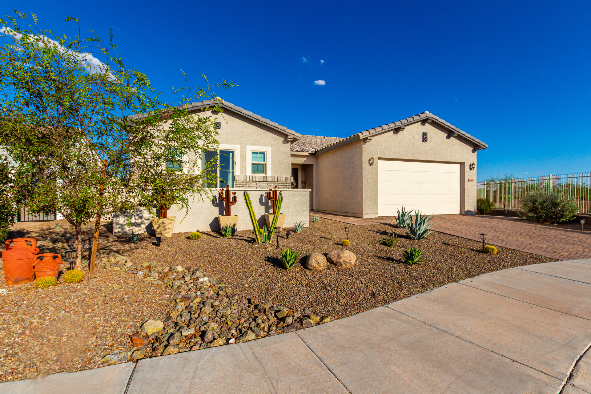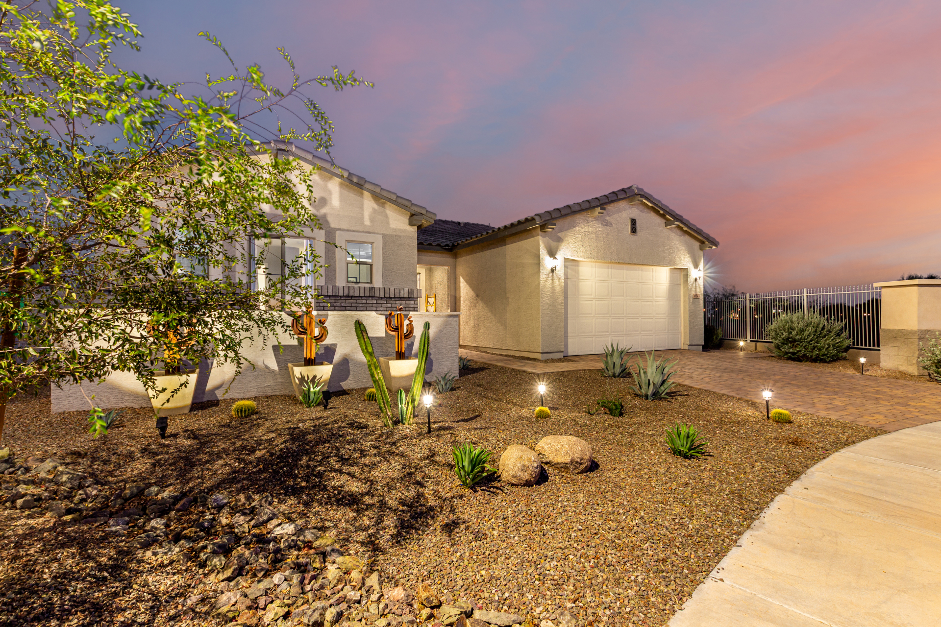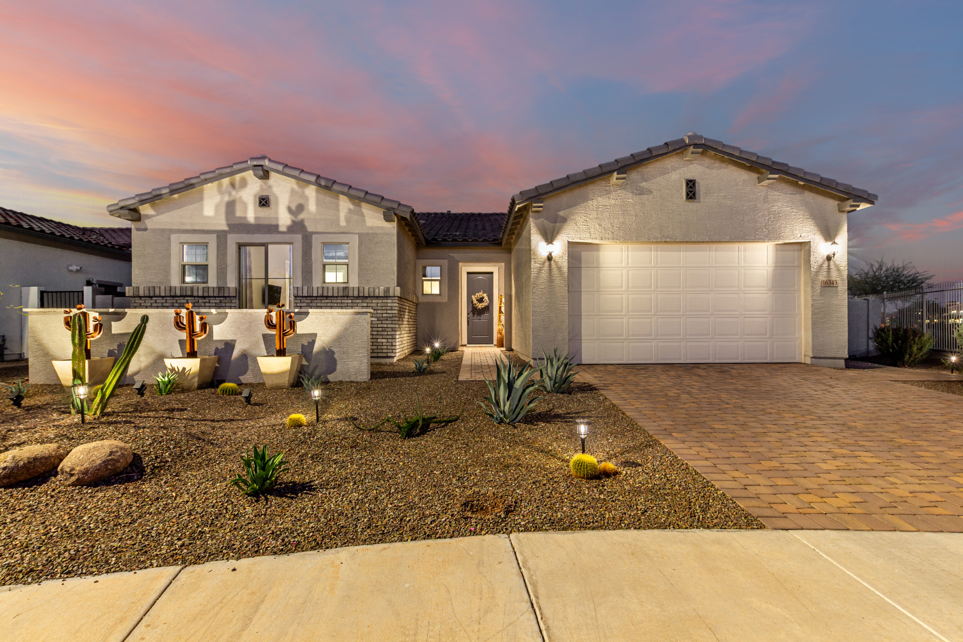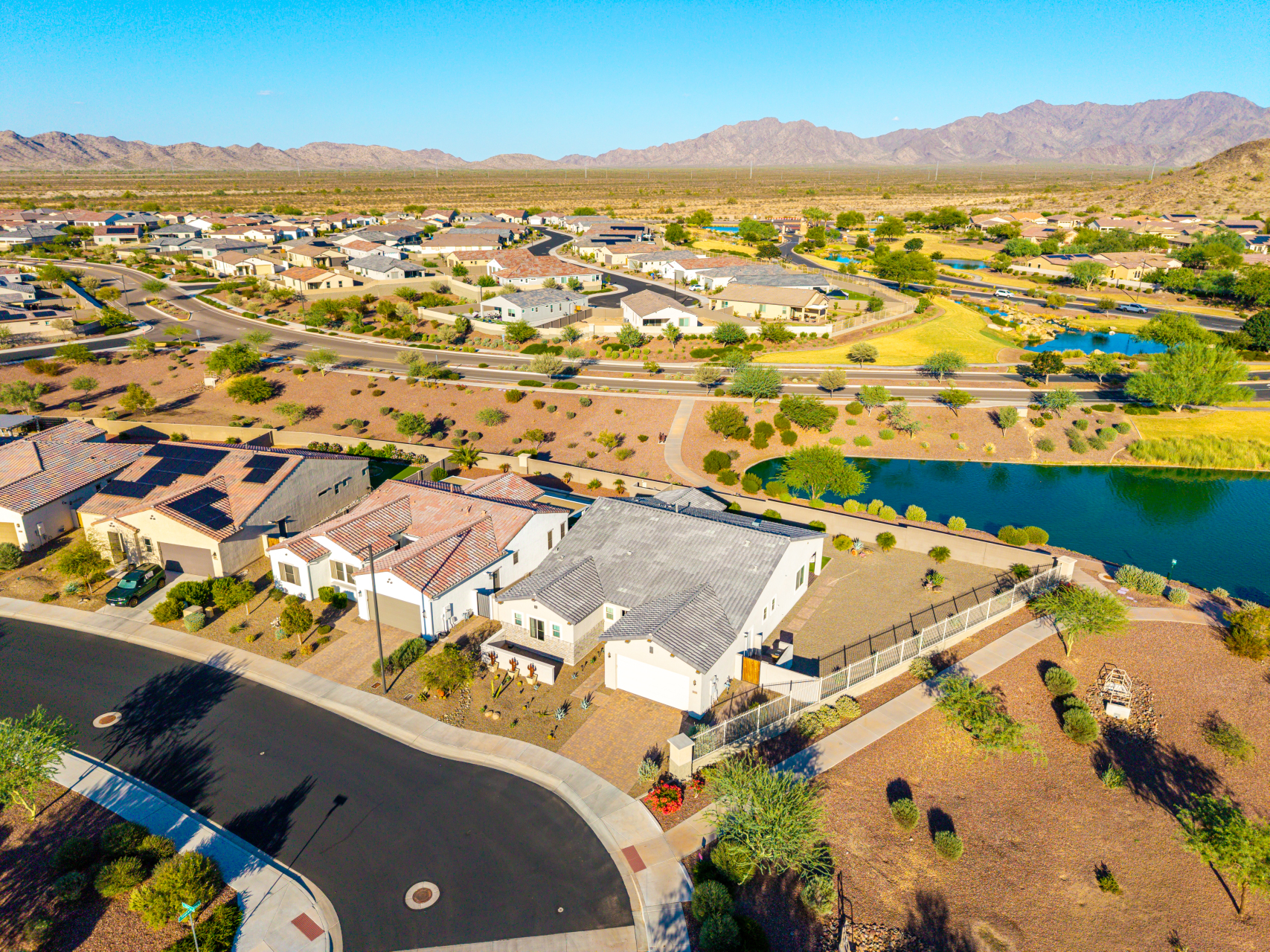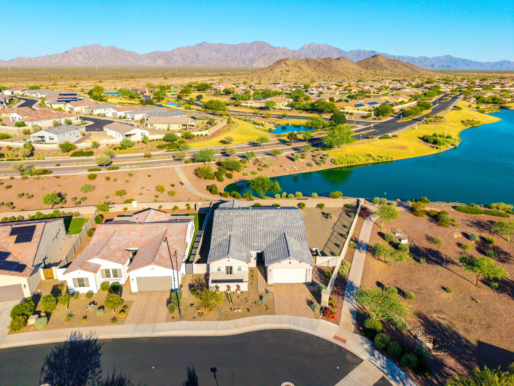Find your ideal retirement haven in the 55+ gated Community of CantaMia! This gorgeous waterfront home sits on a corner lot, adjacent to a common area - no direct neighbors behind & on one side. It offers 3 beds, 3 baths, desert landscape, & a 2-car garage w/paver driveway. The interior exudes elegance with 10 ft ceilings, tons of natural light, neutral palette, & wood-look tile floors t/out. Excellent floor plan featuring a formal living room and a desirable great room with surround sound & sliding doors to the back. The gourmet kitchen boasts SS appliances w/cooktop gas, granite counters & backsplash, a walk-in pantry, recessed lighting, ample cabinetry w/crown molding, and an island w/breakfast bar. The main bedroom has outdoor access and an ensuite with two vanities & a walk-in closet