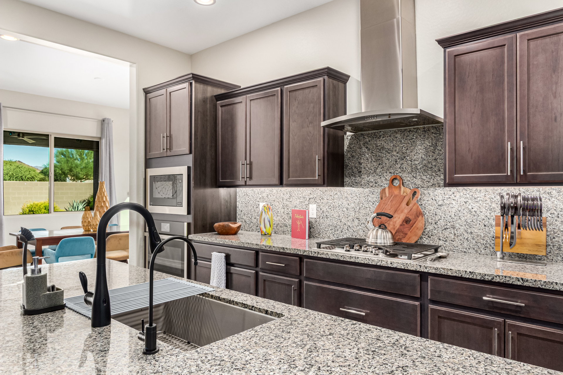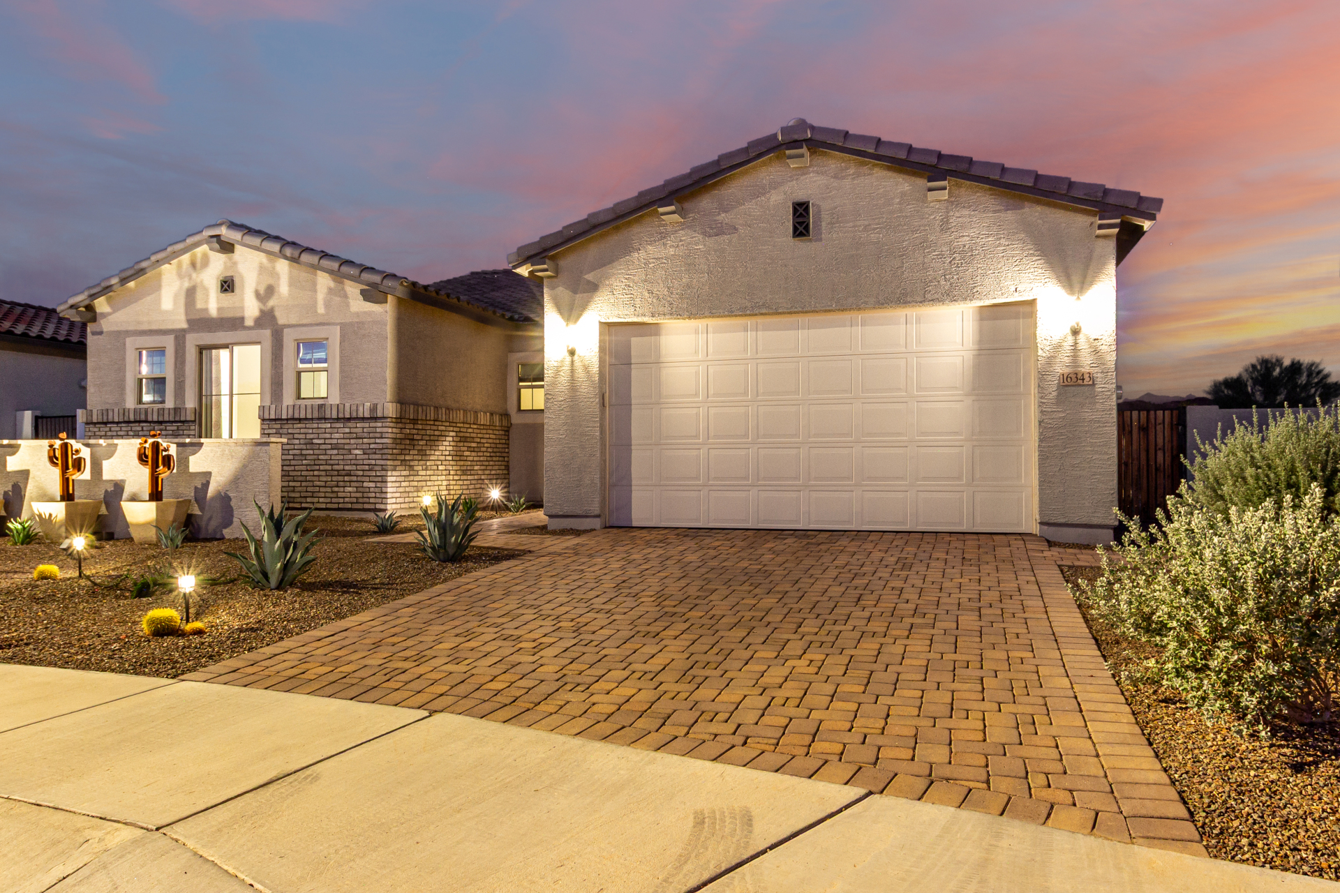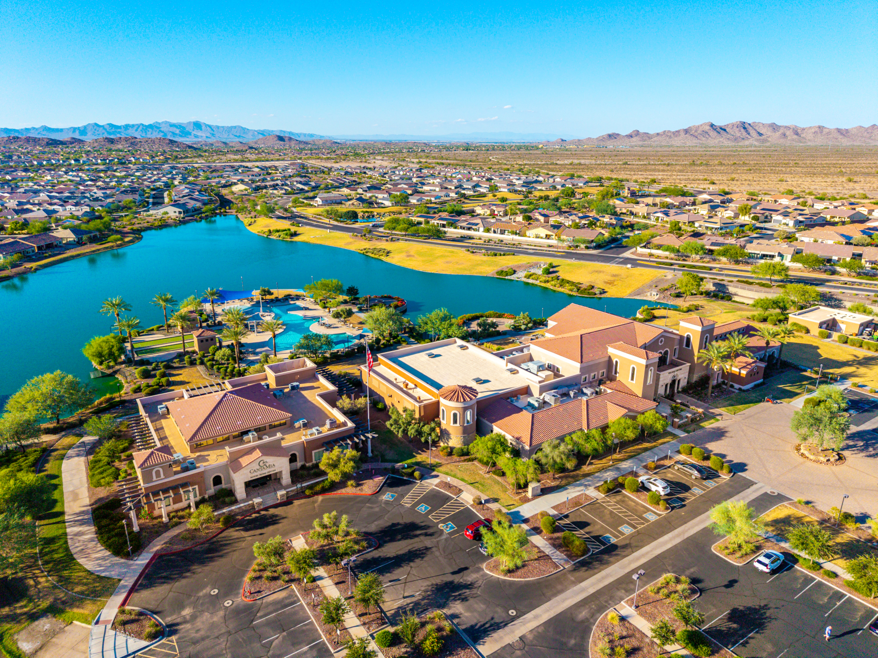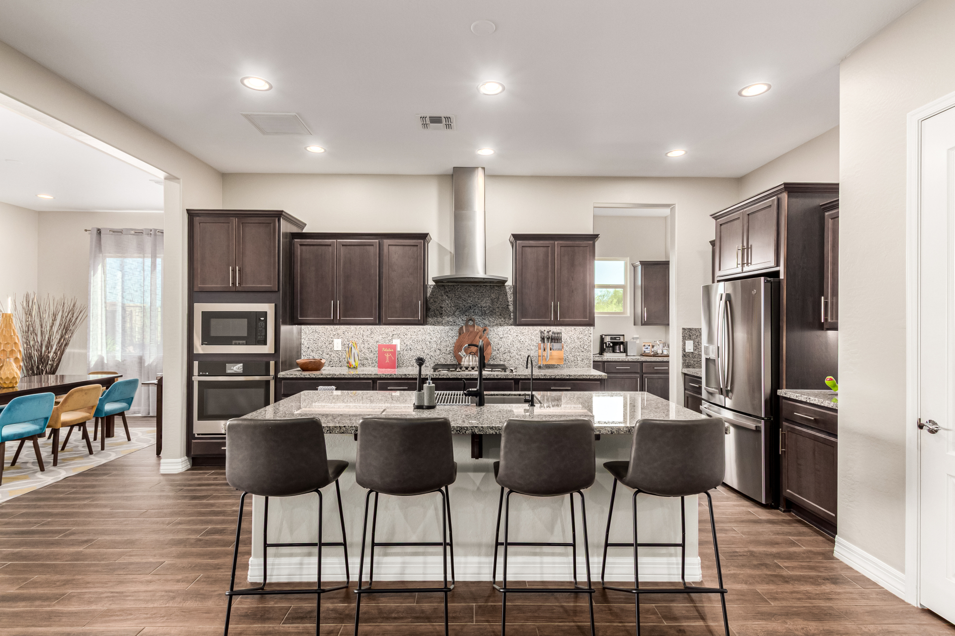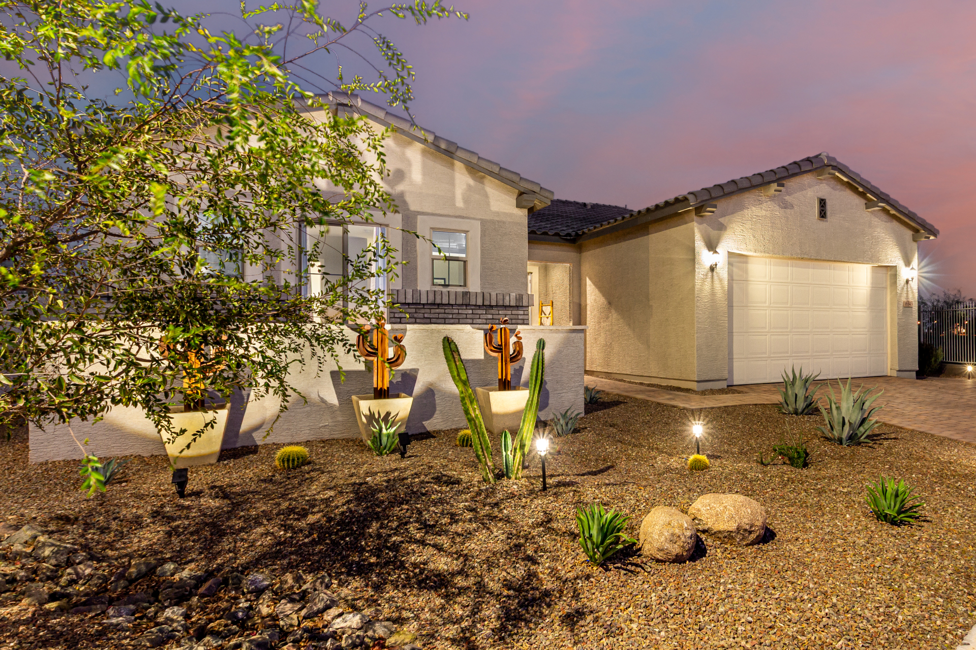 Find your ideal retirement haven in the 55+ gated Community of CantaMia! This gorgeous waterfront home sits on a corner lot, adjacent to a common area - no direct neighbors behind & on one side. It offers 3 beds, 3 baths, desert landscape, & a 2-car garage w/paver driveway. The interior exudes elegance with 10 ft ceilings, tons of natural light, neutral palette, & wood-look tile floors t/out. Excellent floor plan featuring a formal living room and a desirable great room with surround sound & sliding doors to the back. The gourmet kitchen boasts SS appliances w/cooktop gas, granite counters & backsplash, a walk-in pantry, recessed lighting, ample cabinetry w/crown molding, and an island w/breakfast bar. The main bedroom has outdoor access and an ensuite with two vanities & a walk-in closet
