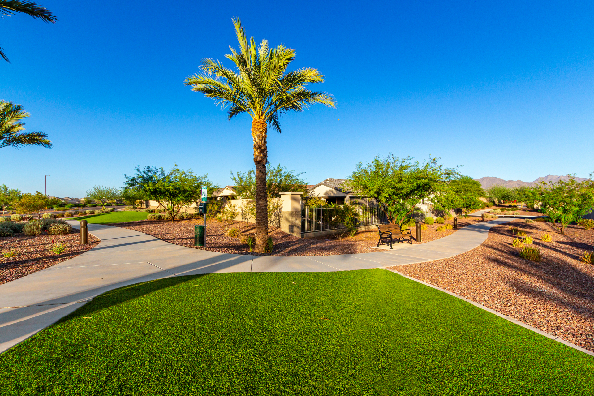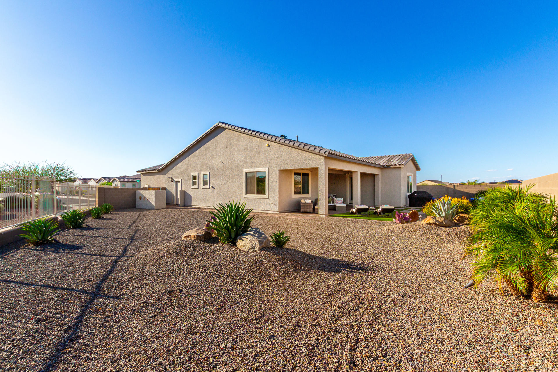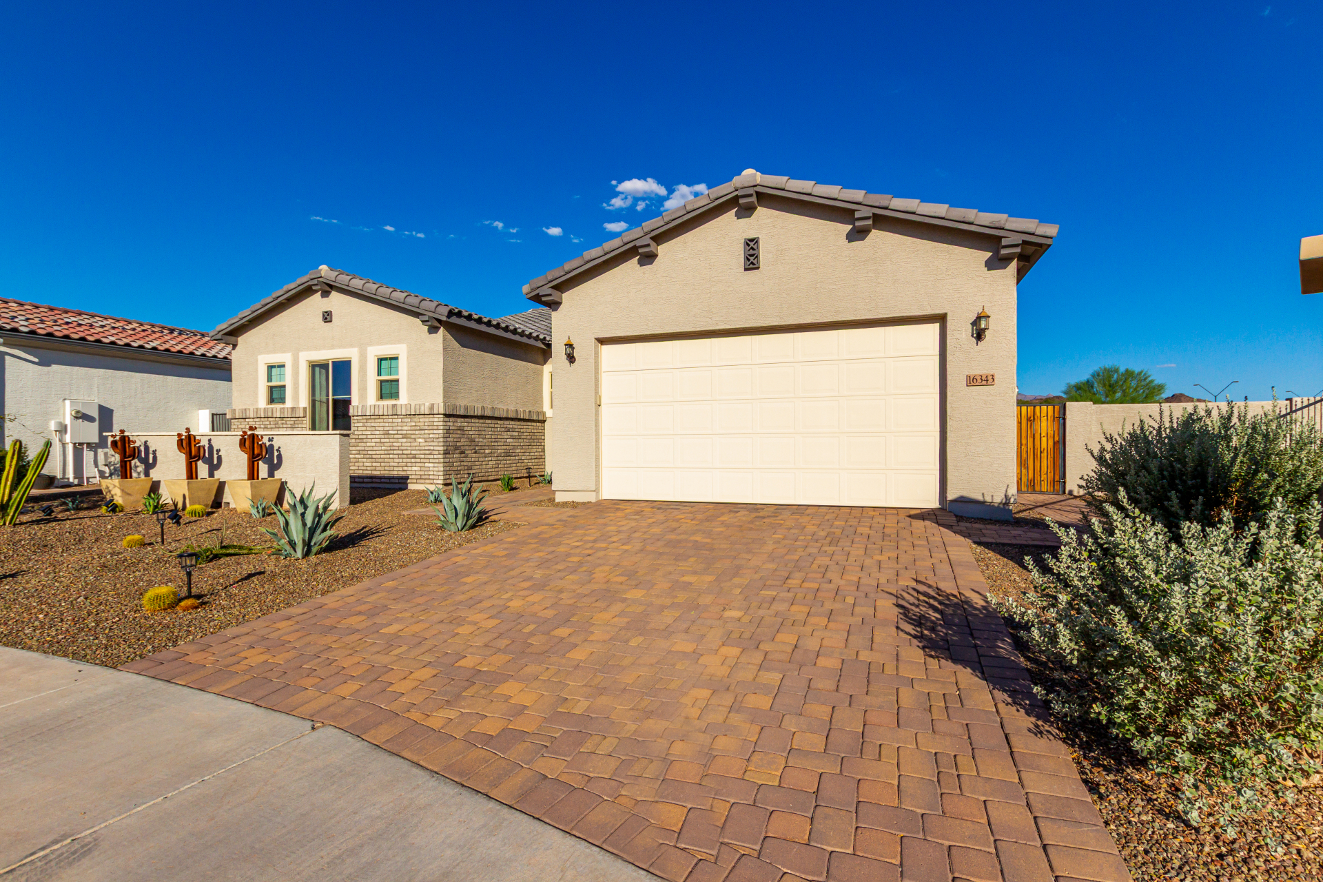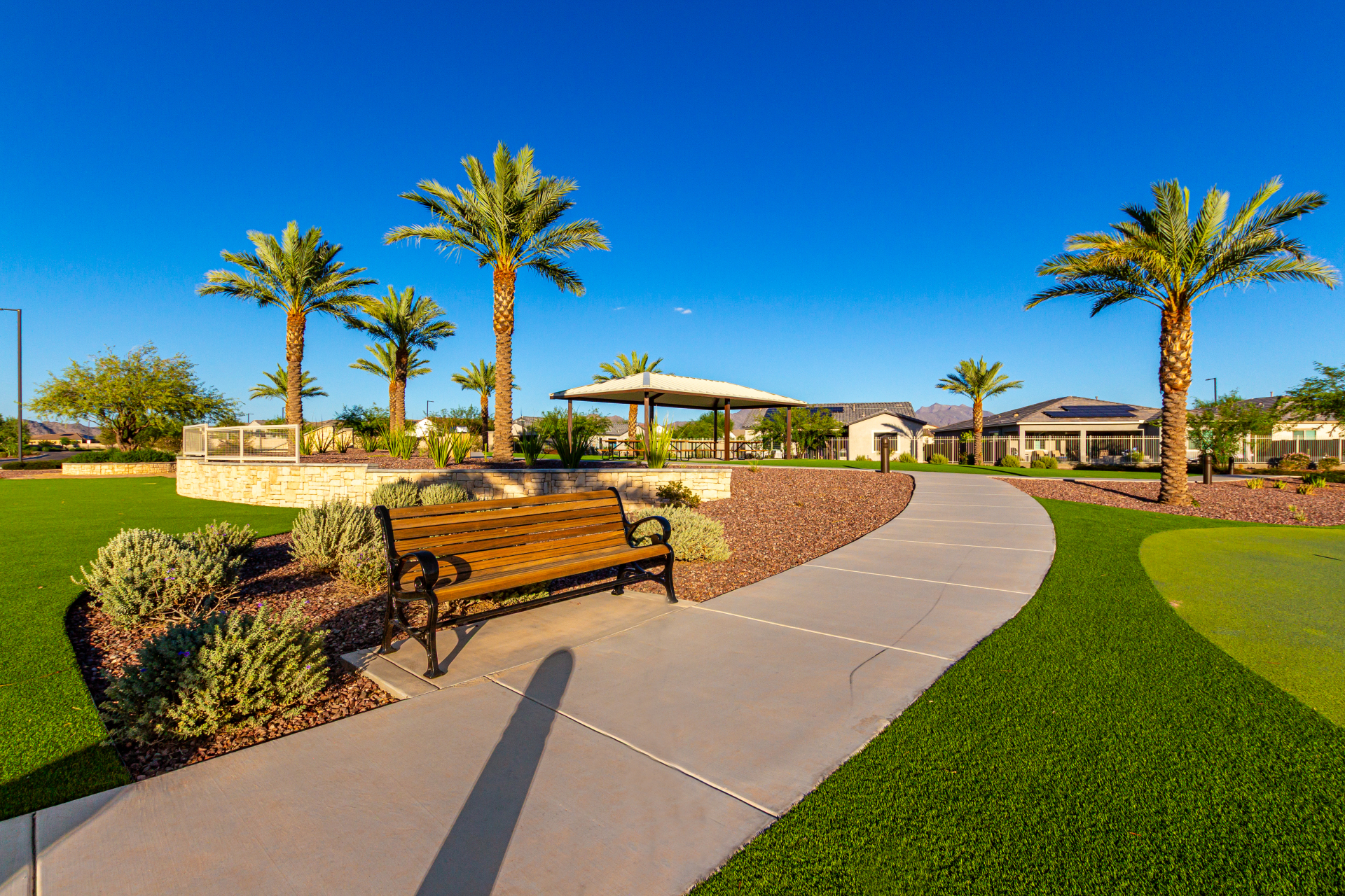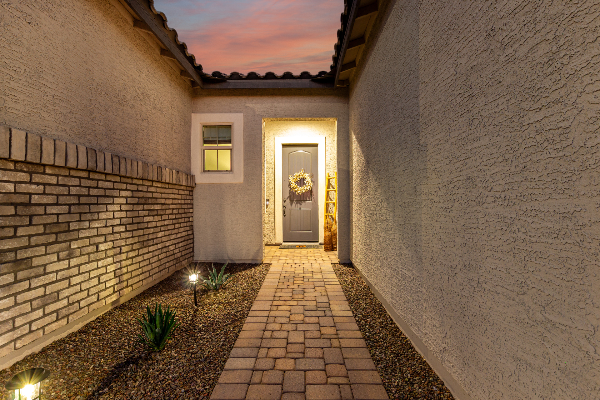 Find your ideal retirement haven in the 55+ gated Community of CantaMia! This gorgeous waterfront home sits on a corner lot, adjacent to a common area - no direct neighbors behind & on one side. It offers 3 beds, 3 baths, desert landscape, & a 2-car garage w/paver driveway. The interior exudes elegance with 10 ft ceilings, tons of natural light, neutral palette, & wood-look tile floors t/out. Excellent floor plan featuring a formal living room and a desirable great room with surround sound & sliding doors to the back. The gourmet kitchen boasts SS appliances w/cooktop gas, granite counters & backsplash, a walk-in pantry, recessed lighting, ample cabinetry w/crown molding, and an island w/breakfast bar. The main bedroom has outdoor access and an ensuite with two vanities & a walk-in closet