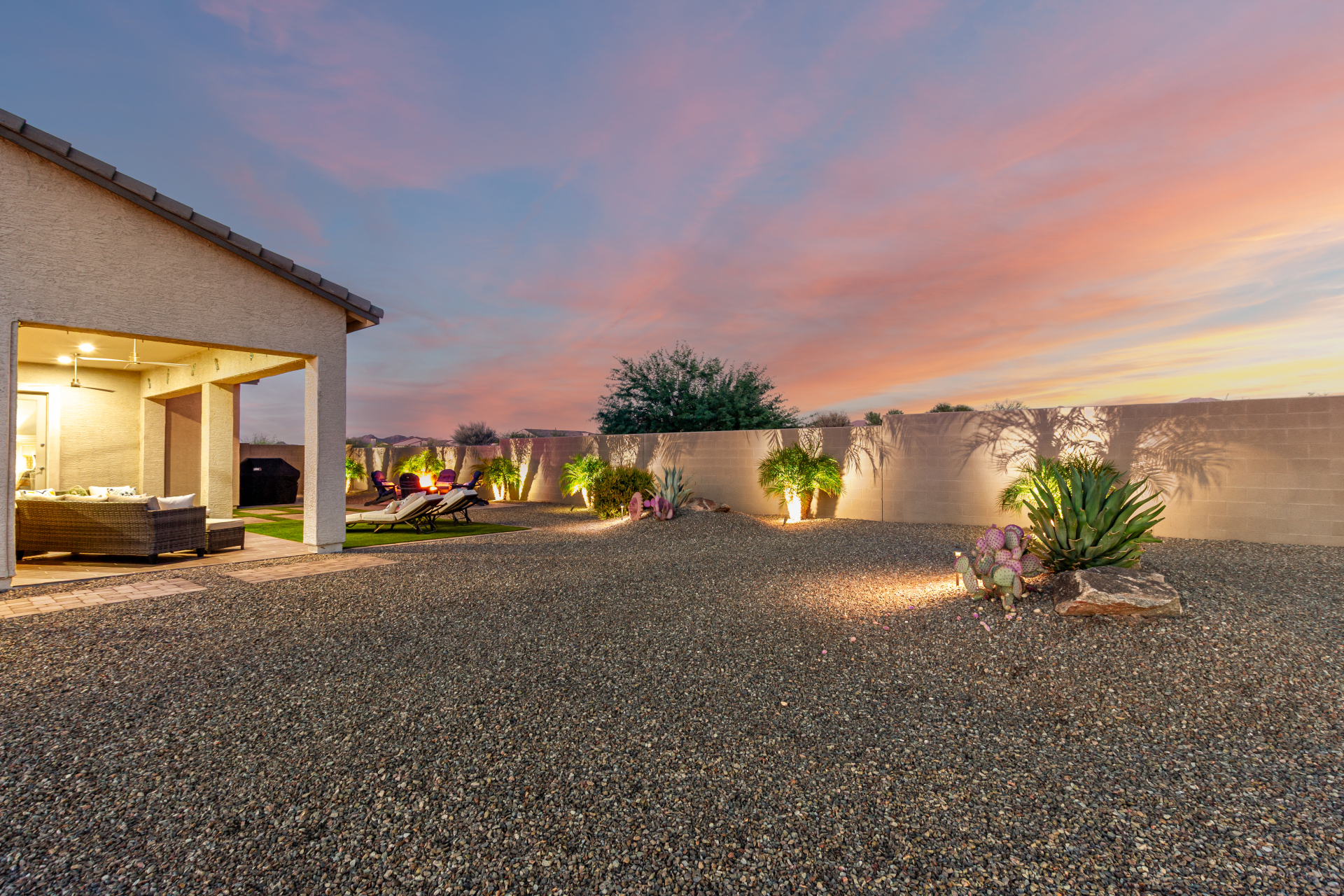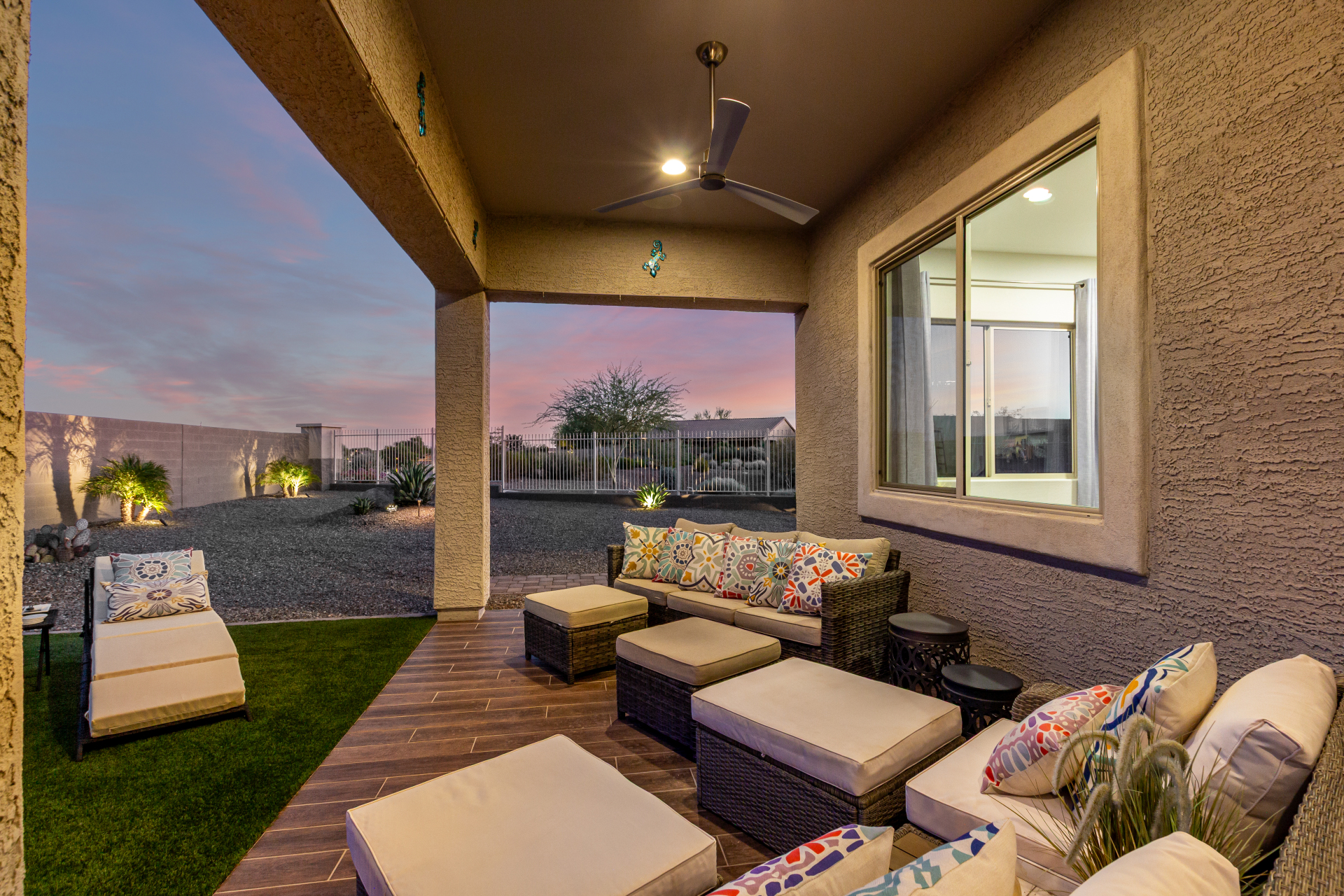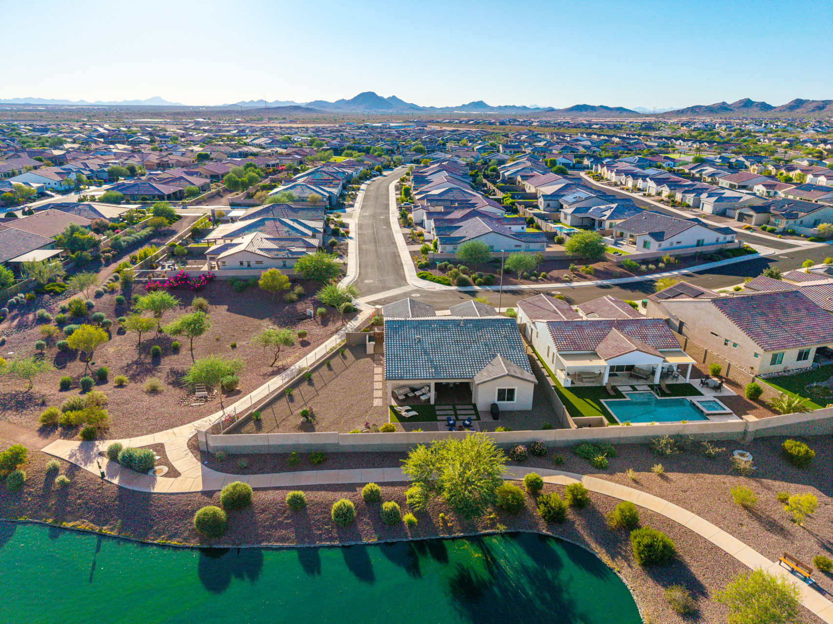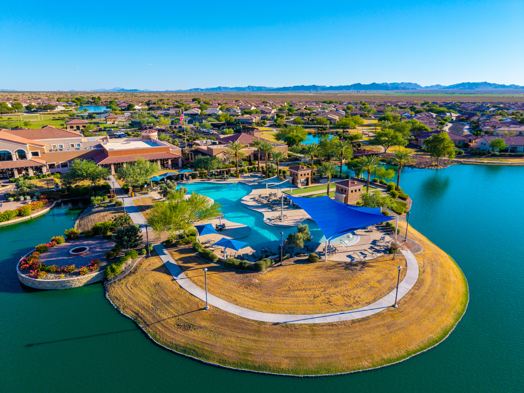Find your ideal retirement haven in the 55+ gated Community of CantaMia! This gorgeous waterfront home sits on a corner lot, adjacent to a common area - no direct neighbors behind & on one side. It offers 3 beds, 3 baths, desert landscape, & a 2-car garage w/paver driveway. The interior exudes elegance with 10 ft ceilings, tons of natural light, neutral palette, & wood-look tile floors t/out. Excellent floor plan featuring a formal living room and a desirable great room with surround sound & sliding doors to the back. The gourmet kitchen boasts SS appliances w/cooktop gas, granite counters & backsplash, a walk-in pantry, recessed lighting, ample cabinetry w/crown molding, and an island w/breakfast bar. The main bedroom has outdoor access and an ensuite with two vanities & a walk-in closet