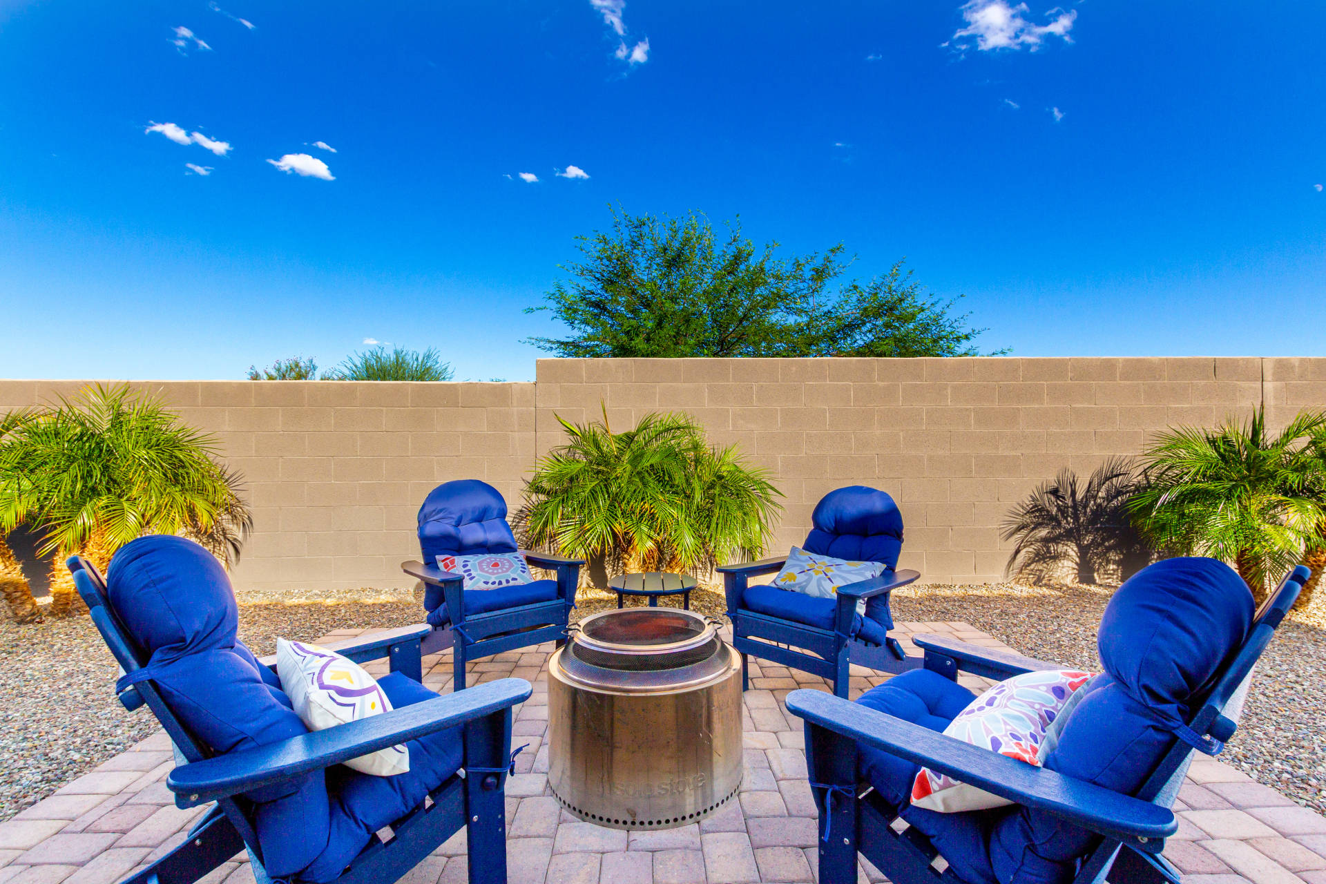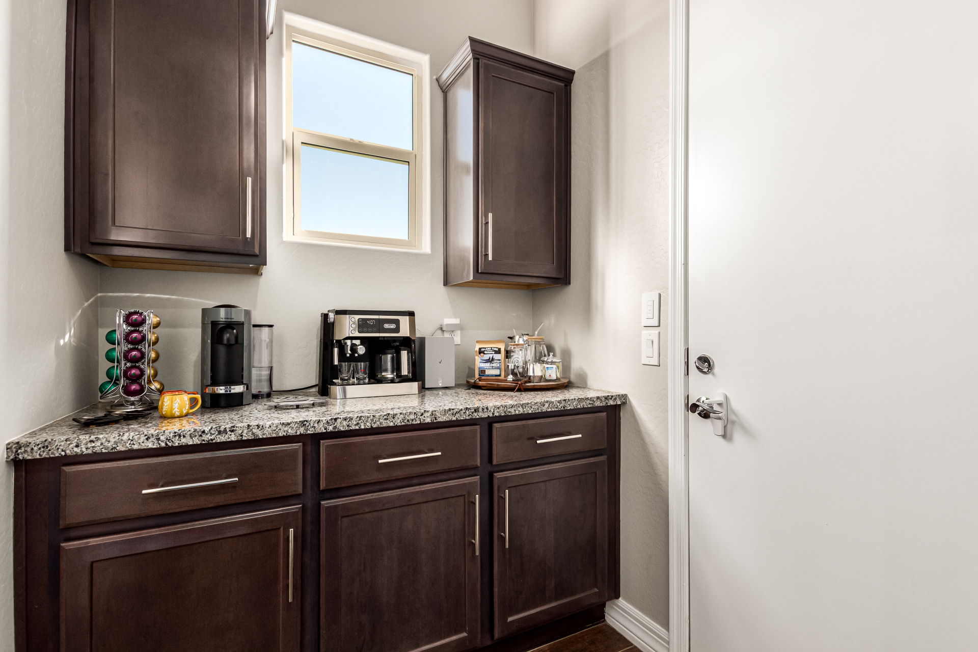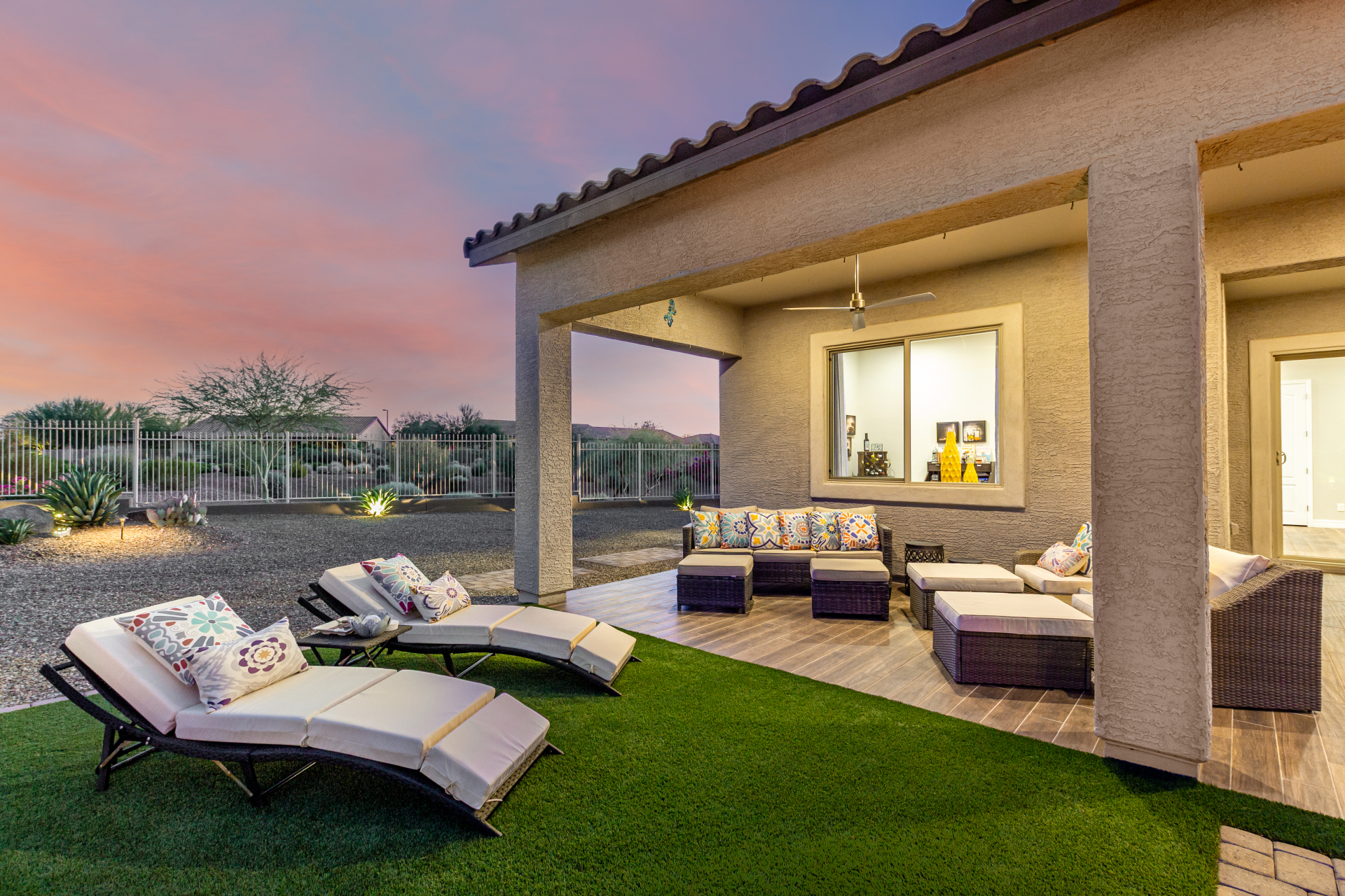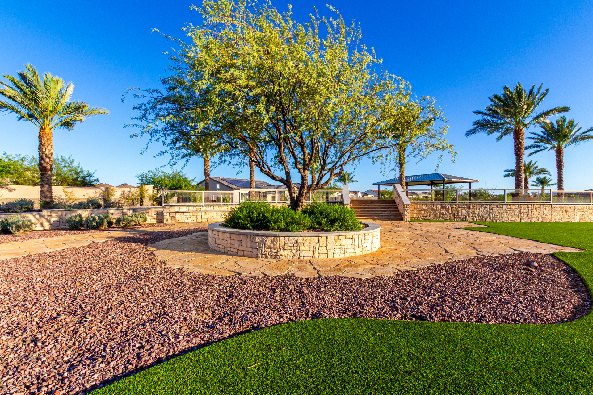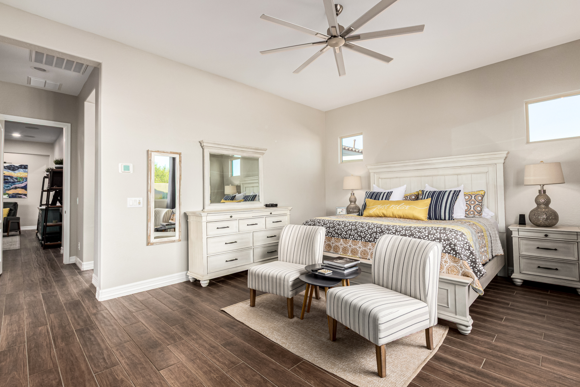 Find your ideal retirement haven in the 55+ gated Community of CantaMia! This gorgeous waterfront home sits on a corner lot, adjacent to a common area - no direct neighbors behind & on one side. It offers 3 beds, 3 baths, desert landscape, & a 2-car garage w/paver driveway. The interior exudes elegance with 10 ft ceilings, tons of natural light, neutral palette, & wood-look tile floors t/out. Excellent floor plan featuring a formal living room and a desirable great room with surround sound & sliding doors to the back. The gourmet kitchen boasts SS appliances w/cooktop gas, granite counters & backsplash, a walk-in pantry, recessed lighting, ample cabinetry w/crown molding, and an island w/breakfast bar. The main bedroom has outdoor access and an ensuite with two vanities & a walk-in closet