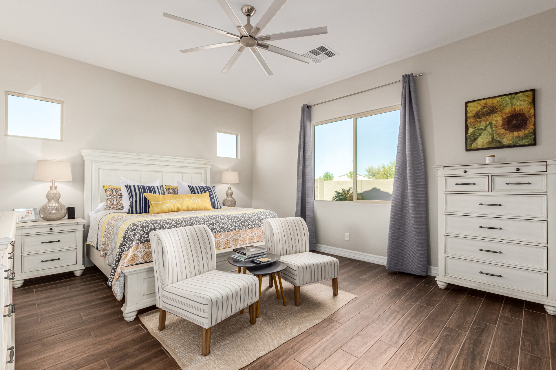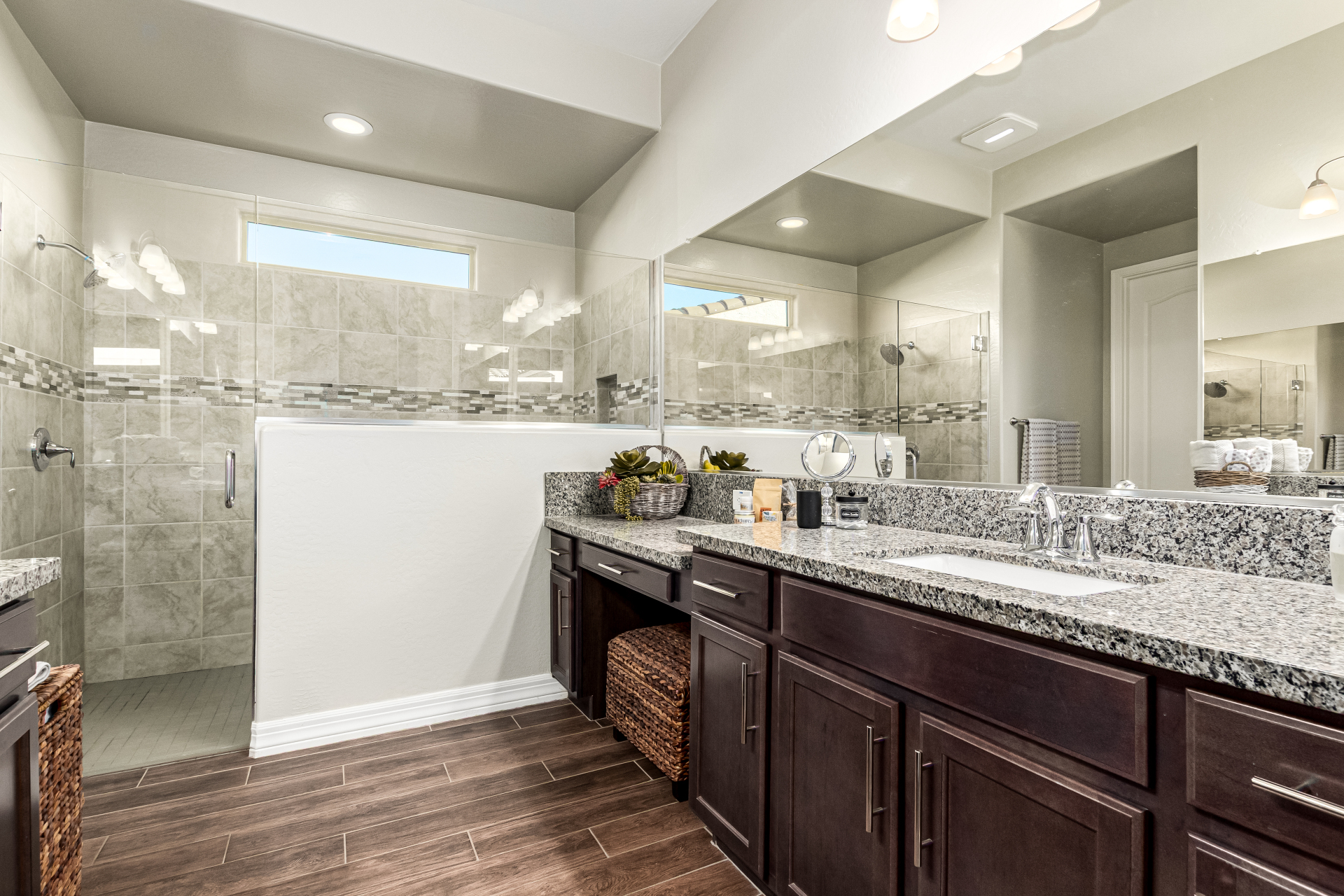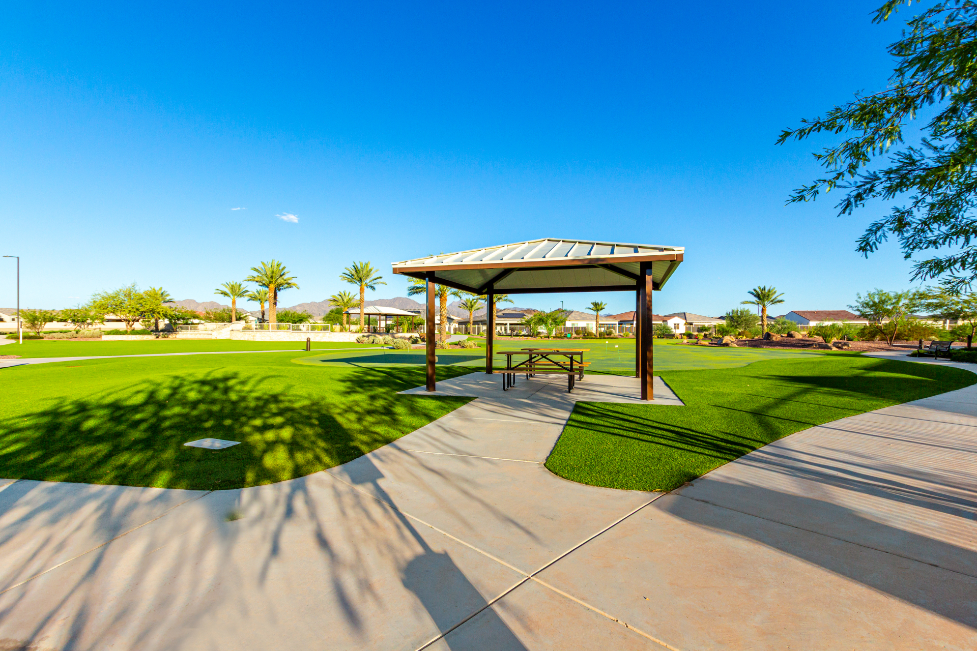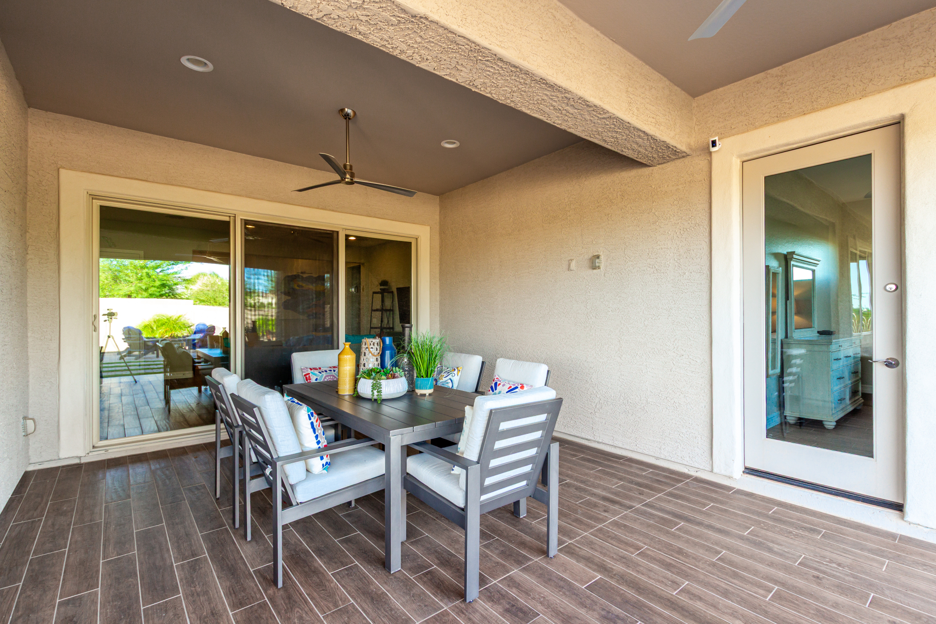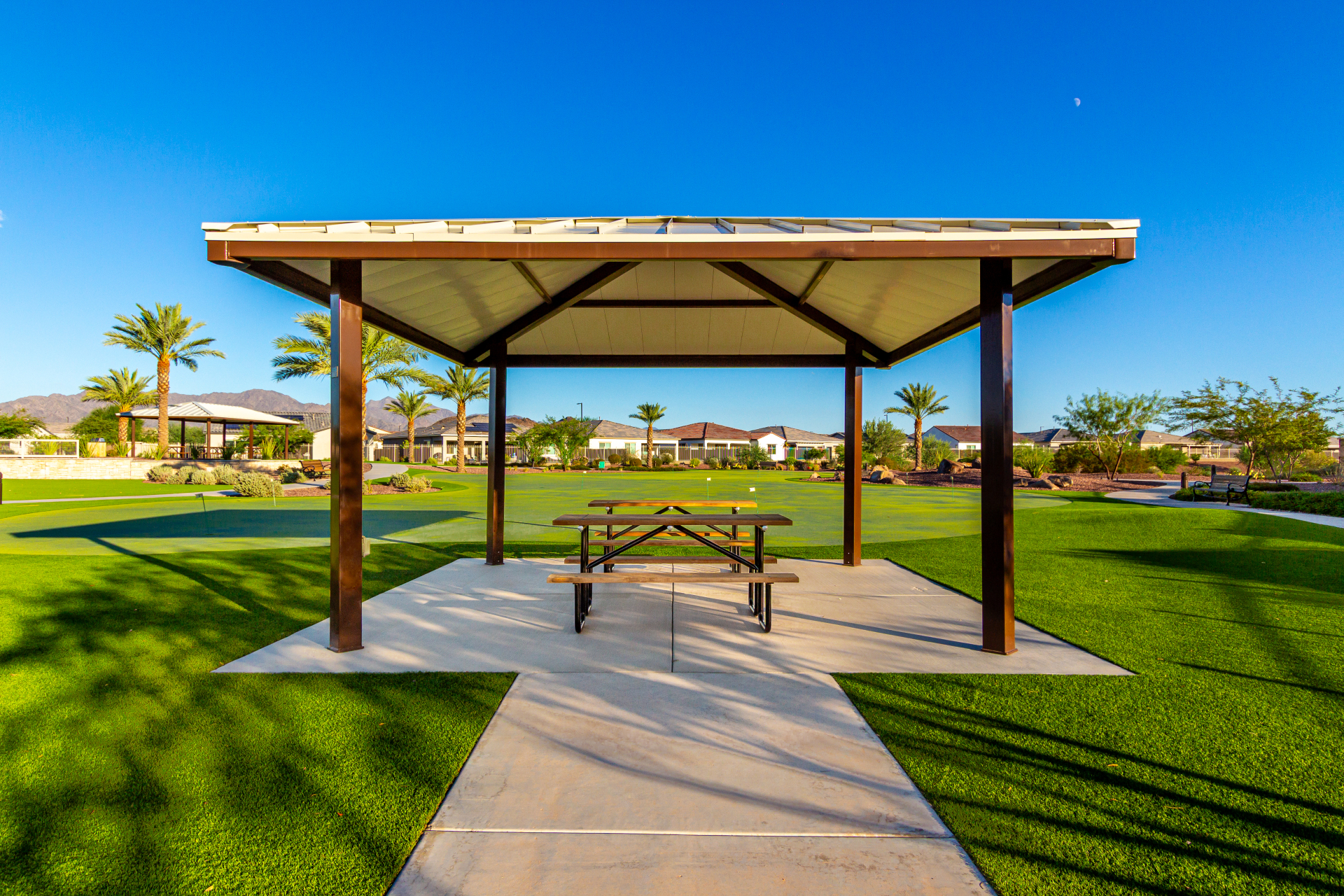 Find your ideal retirement haven in the 55+ gated Community of CantaMia! This gorgeous waterfront home sits on a corner lot, adjacent to a common area - no direct neighbors behind & on one side. It offers 3 beds, 3 baths, desert landscape, & a 2-car garage w/paver driveway. The interior exudes elegance with 10 ft ceilings, tons of natural light, neutral palette, & wood-look tile floors t/out. Excellent floor plan featuring a formal living room and a desirable great room with surround sound & sliding doors to the back. The gourmet kitchen boasts SS appliances w/cooktop gas, granite counters & backsplash, a walk-in pantry, recessed lighting, ample cabinetry w/crown molding, and an island w/breakfast bar. The main bedroom has outdoor access and an ensuite with two vanities & a walk-in closet