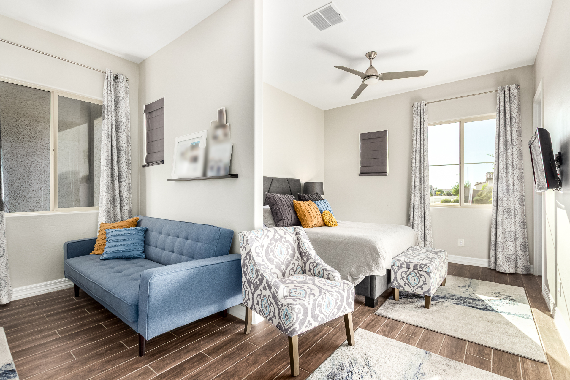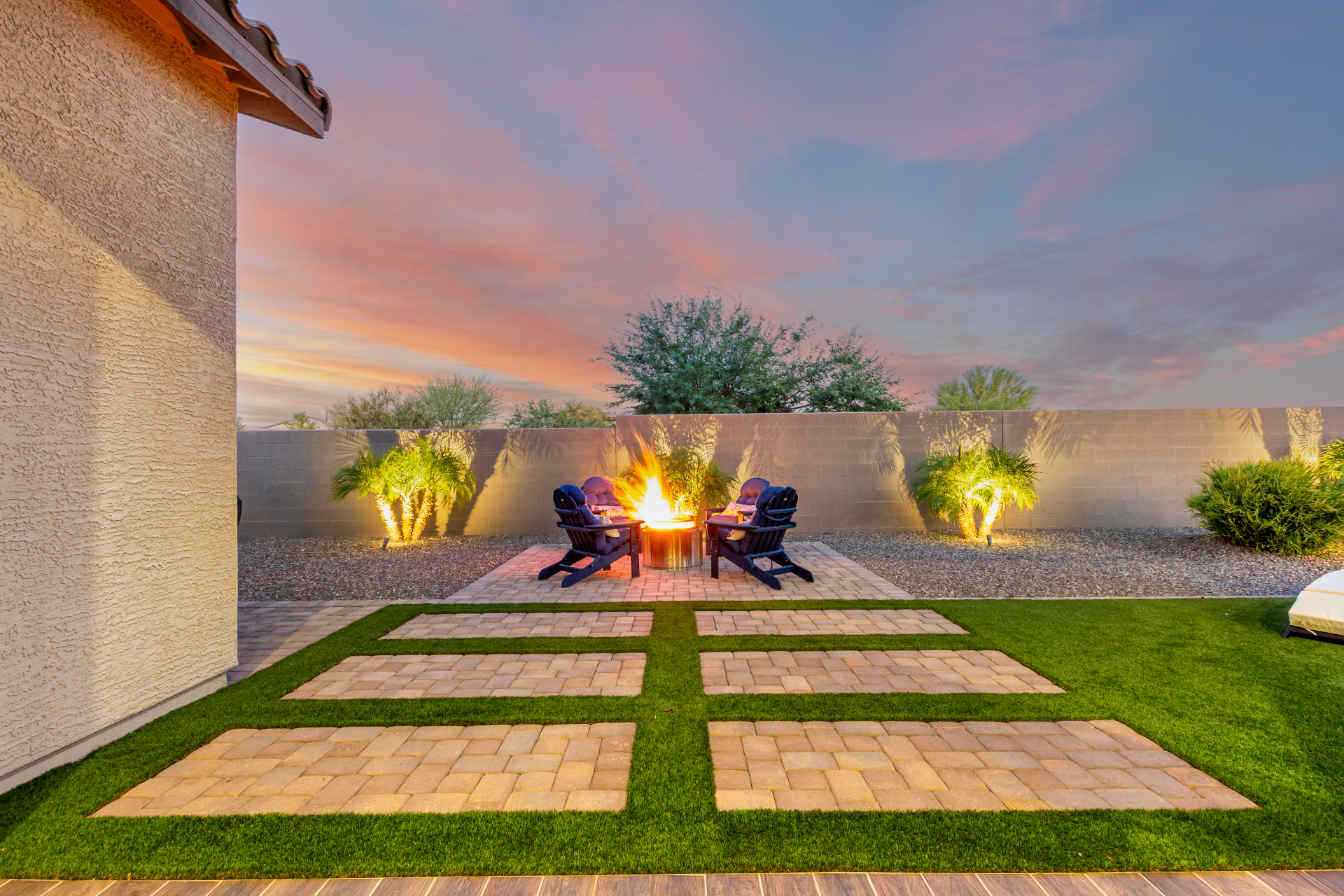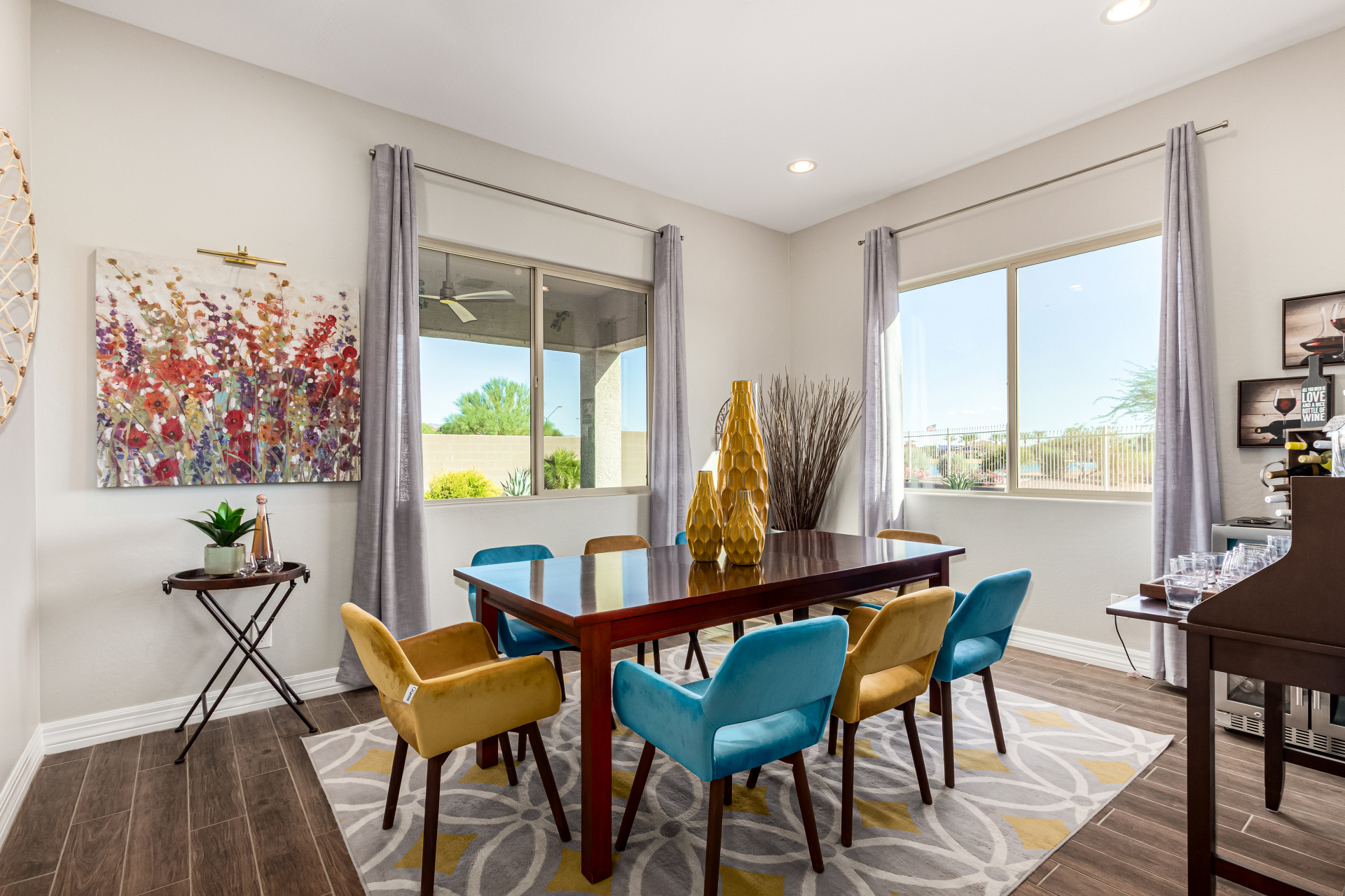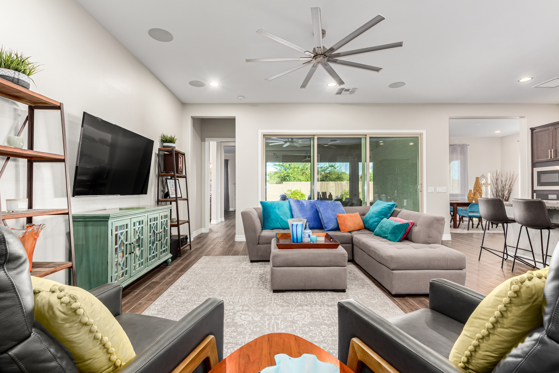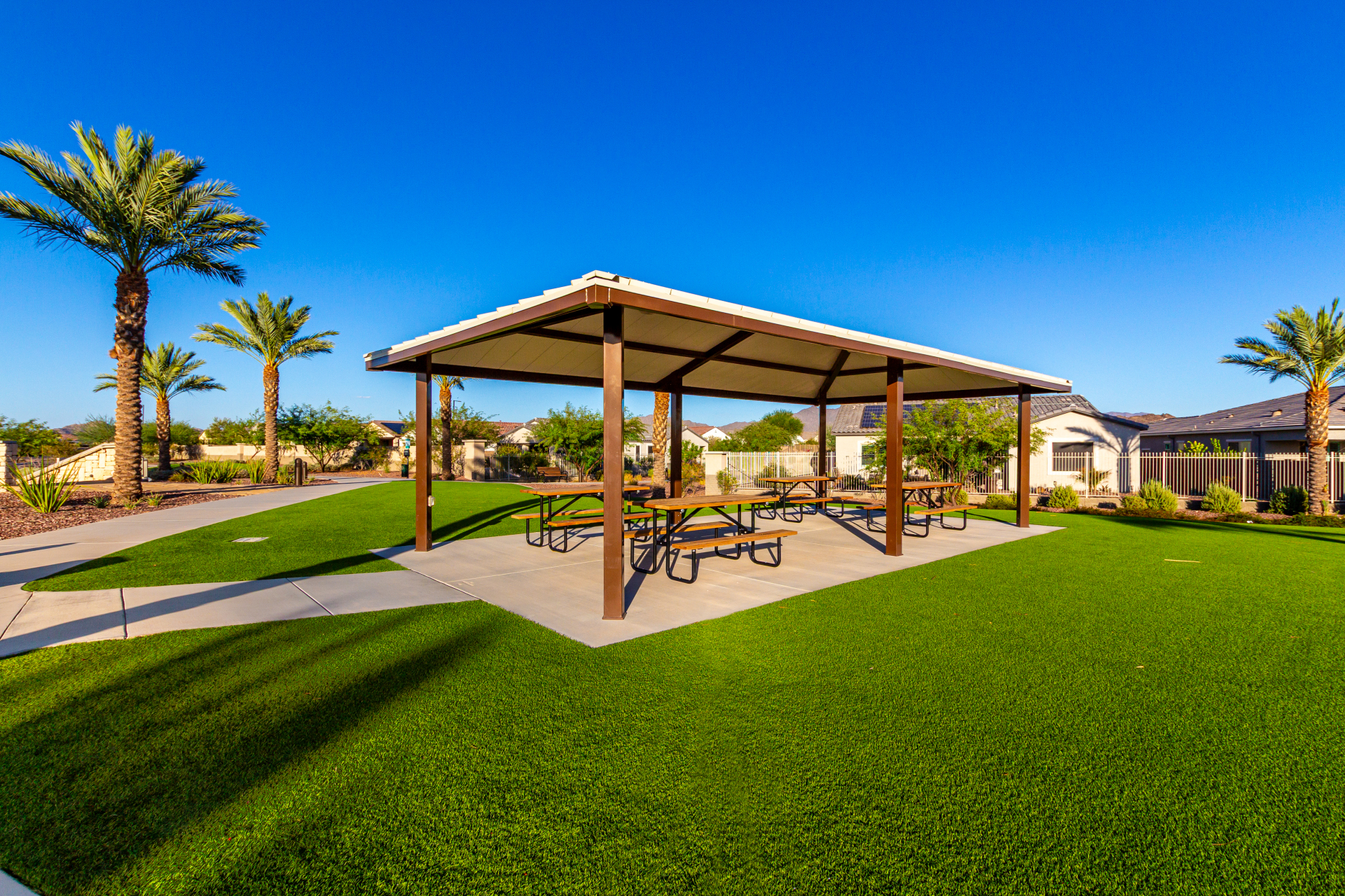 Find your ideal retirement haven in the 55+ gated Community of CantaMia! This gorgeous waterfront home sits on a corner lot, adjacent to a common area - no direct neighbors behind & on one side. It offers 3 beds, 3 baths, desert landscape, & a 2-car garage w/paver driveway. The interior exudes elegance with 10 ft ceilings, tons of natural light, neutral palette, & wood-look tile floors t/out. Excellent floor plan featuring a formal living room and a desirable great room with surround sound & sliding doors to the back. The gourmet kitchen boasts SS appliances w/cooktop gas, granite counters & backsplash, a walk-in pantry, recessed lighting, ample cabinetry w/crown molding, and an island w/breakfast bar. The main bedroom has outdoor access and an ensuite with two vanities & a walk-in closet