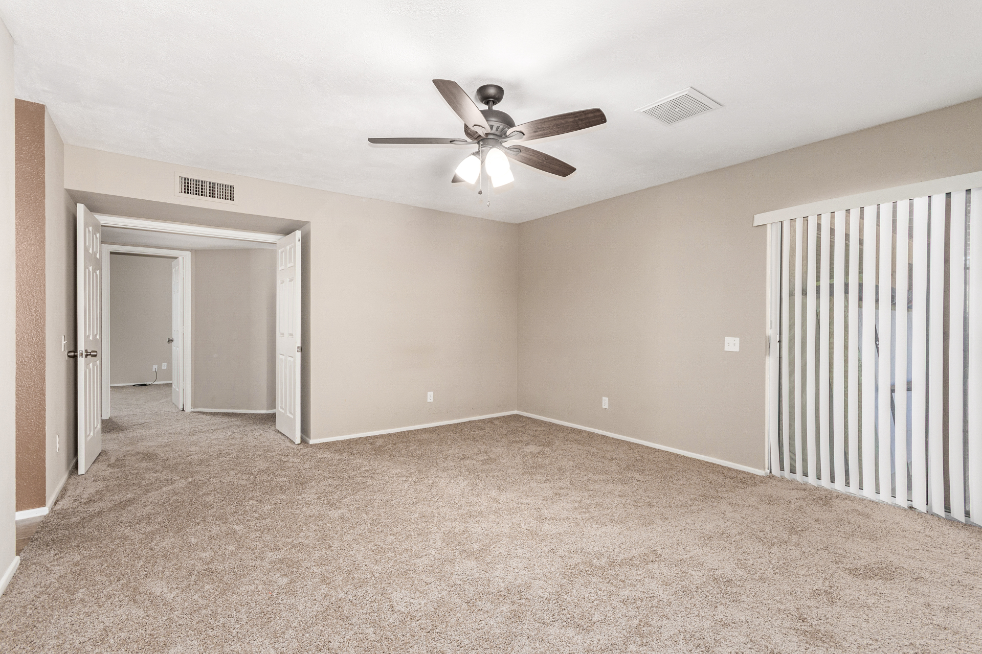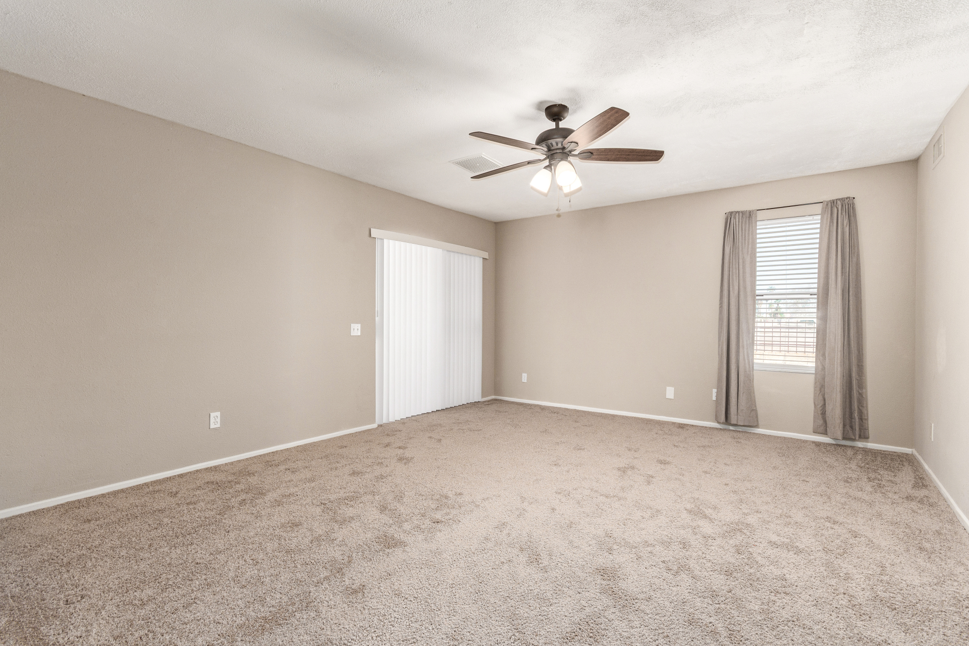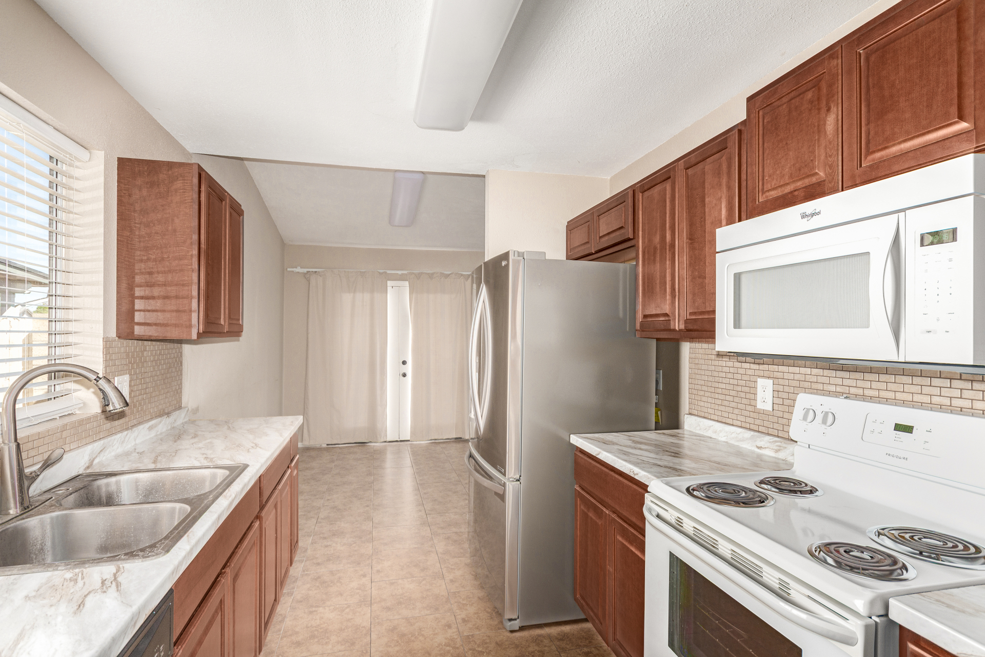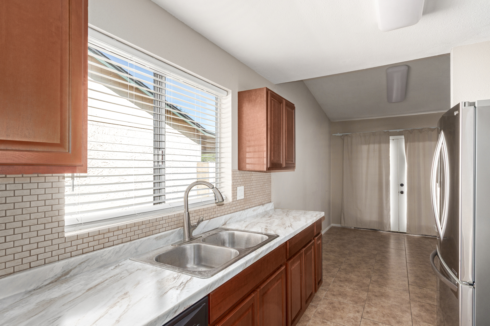Look NO further! Comfort meets convenience in this delightful 3-bedroom home with a 2-car garage! Inside, you will find an inviting living room filled with lots of natural light and features vaulted ceilings, plush carpet, and neutral paint throughout. Adjacent to it is the dining area where French doors open to the back patio for easy indoor-outdoor living. Spotless kitchen comes with tile backsplash, plenty of cabinet space, and built-in appliances, making meal prep a breeze. Double doors reveal the large primary bedroom, offering direct outdoor access, a mirrored door closet, and a private bathroom with dual sinks. Enjoy relaxing under the covered patio with your favorite beverage. Hurry! A deal like this won't last long!