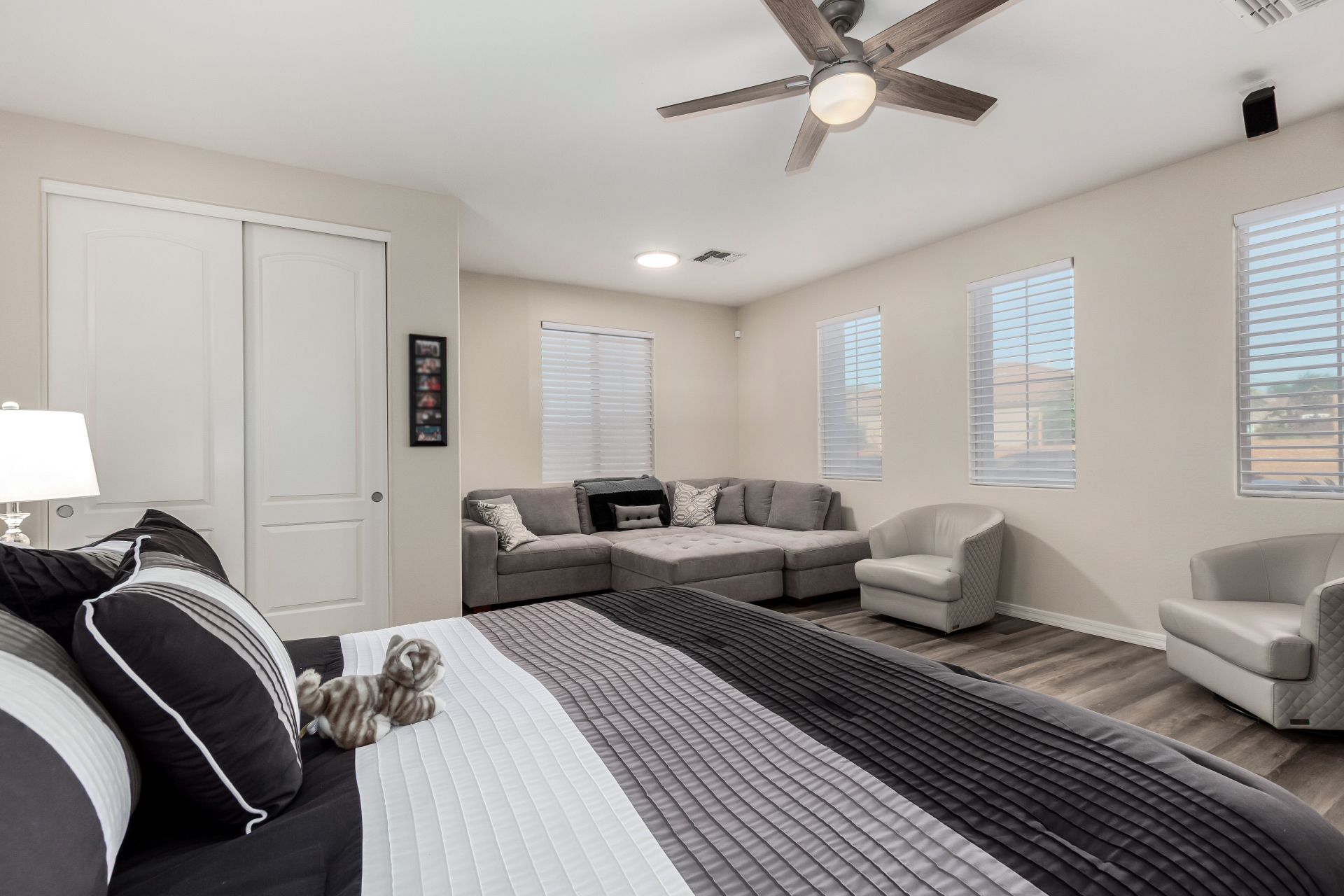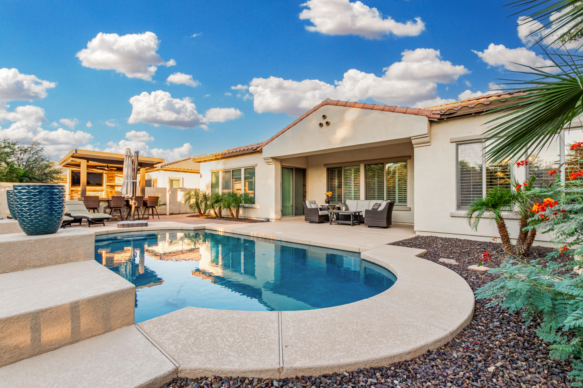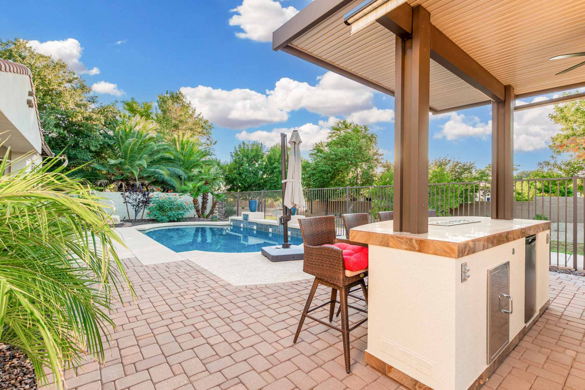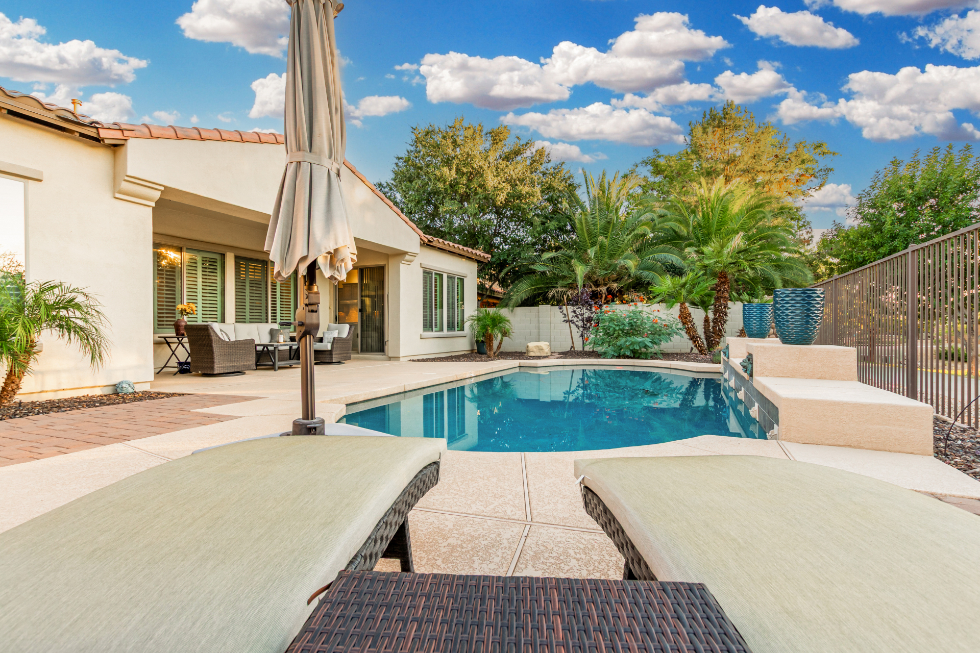 Welcome to Old Stone Ranch, South Chandler's premier lake community, where timeless design and refined Arizona living come together. This exceptional Shea Homes 'Loyola' floor plan is highly sought-after for its functionality, beauty, and rare feature of two master suites, offering flexibility for multi-generational living, private guest accommodations, or an ideal work-from-home retreat. Inside, the home exudes Santa Barbara-inspired architecture with a model-like interior showcasing upgraded finishes throughout. The open great room and chef's kitchen complete with granite countertops, stainless steel appliances, and an oversized island create the perfect space for entertaining. Both master suites include spacious walk-in closets and spa-like ensuite bathrooms, while additional bedrooms and living spaces ensure comfort for all.