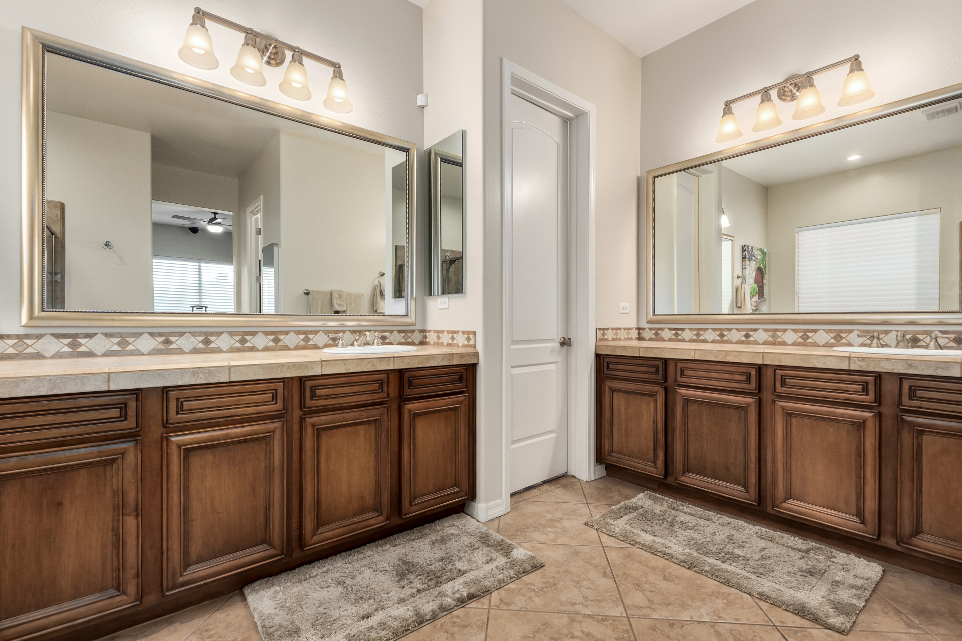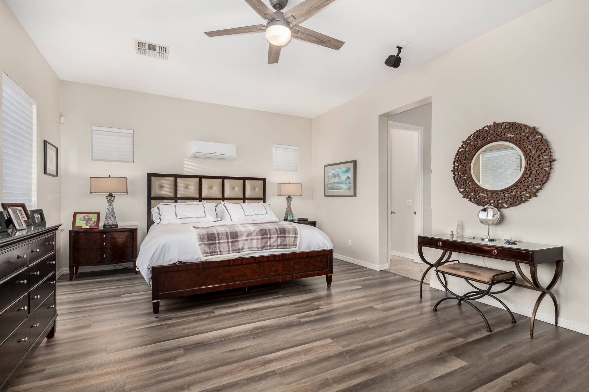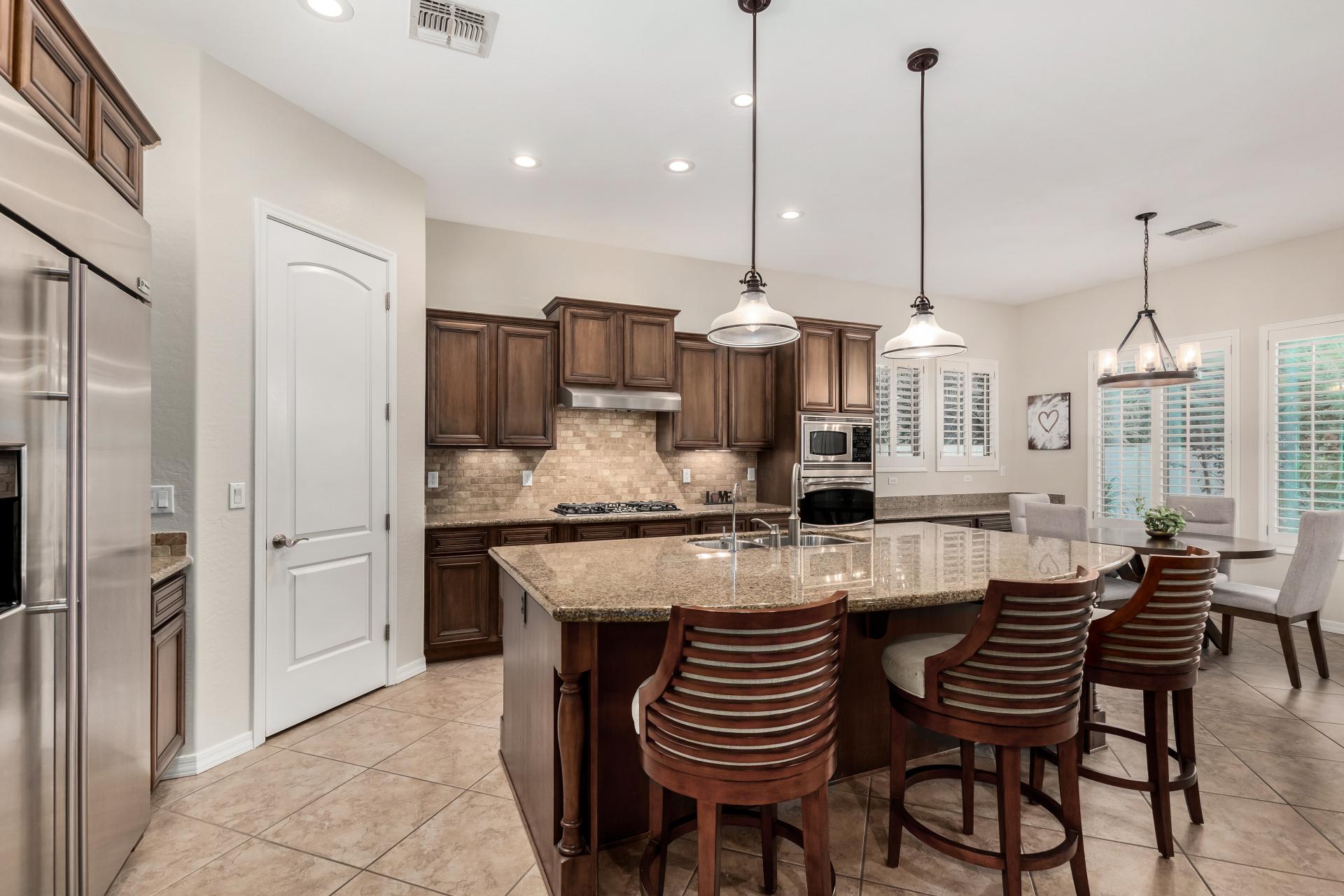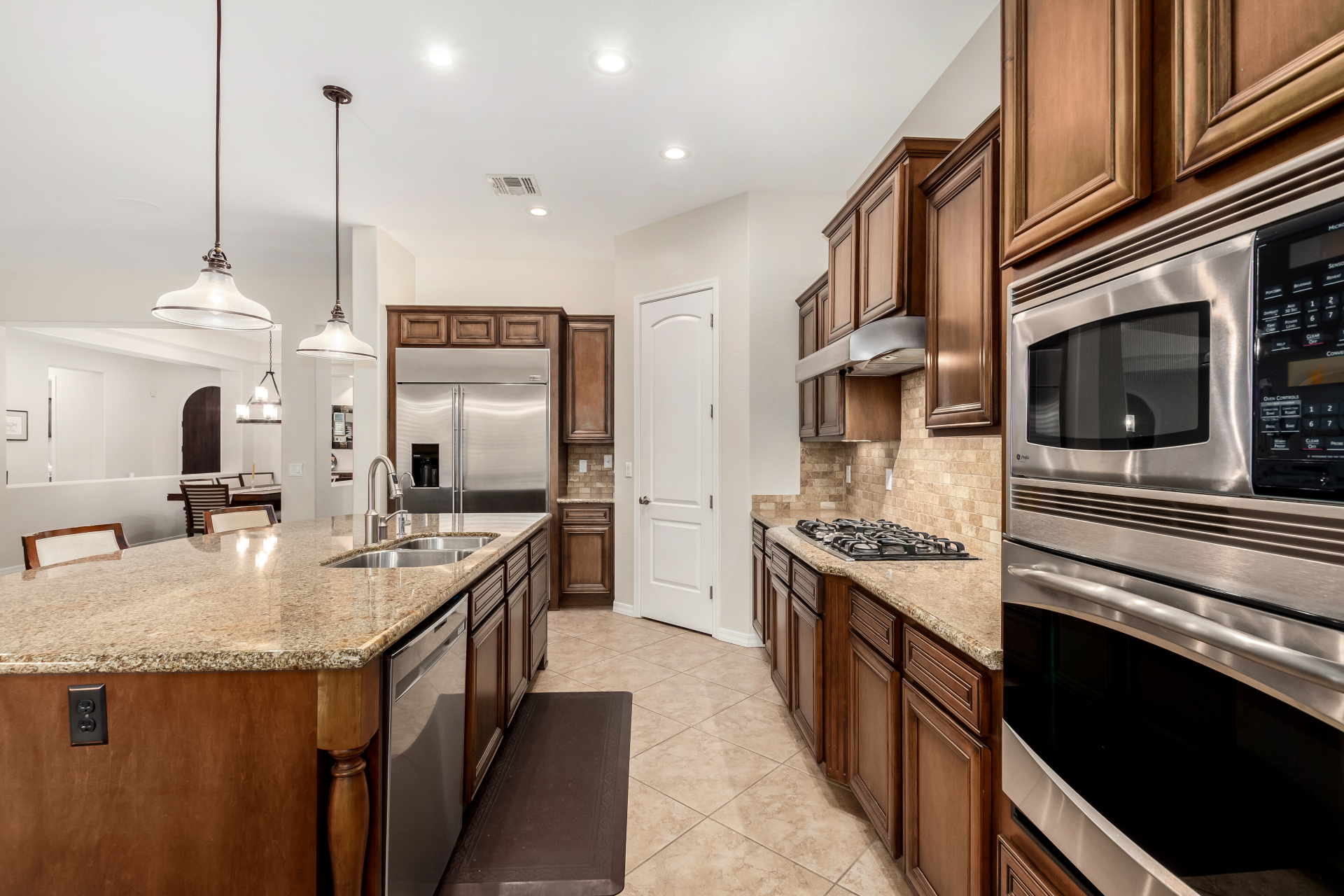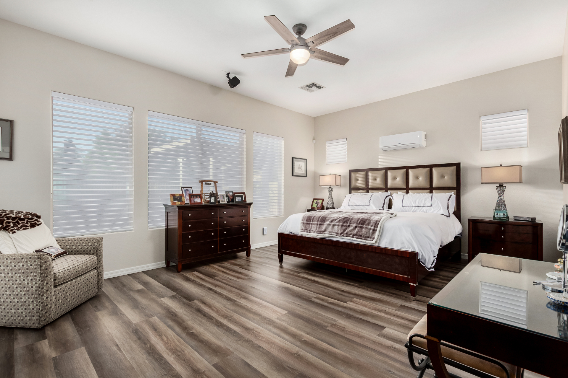Welcome to Old Stone Ranch, South Chandler's premier lake community, where timeless design and refined Arizona living come together. This exceptional Shea Homes 'Loyola' floor plan is highly sought-after for its functionality, beauty, and rare feature of two master suites, offering flexibility for multi-generational living, private guest accommodations, or an ideal work-from-home retreat. Inside, the home exudes Santa Barbara-inspired architecture with a model-like interior showcasing upgraded finishes throughout. The open great room and chef's kitchen complete with granite countertops, stainless steel appliances, and an oversized island create the perfect space for entertaining. Both master suites include spacious walk-in closets and spa-like ensuite bathrooms, while additional bedrooms and living spaces ensure comfort for all.