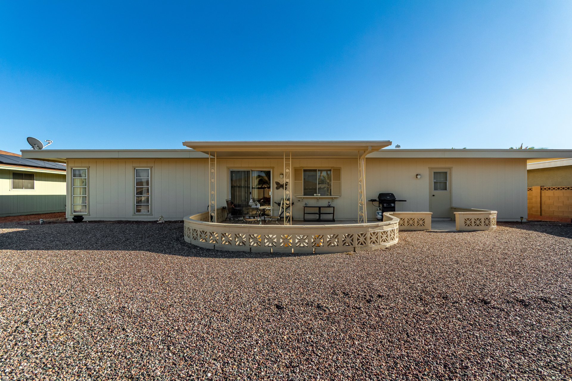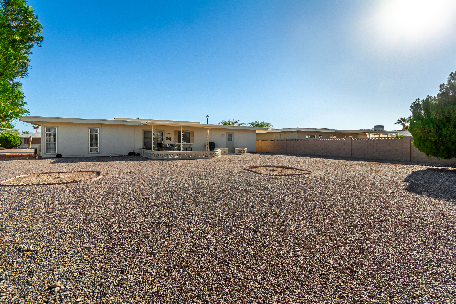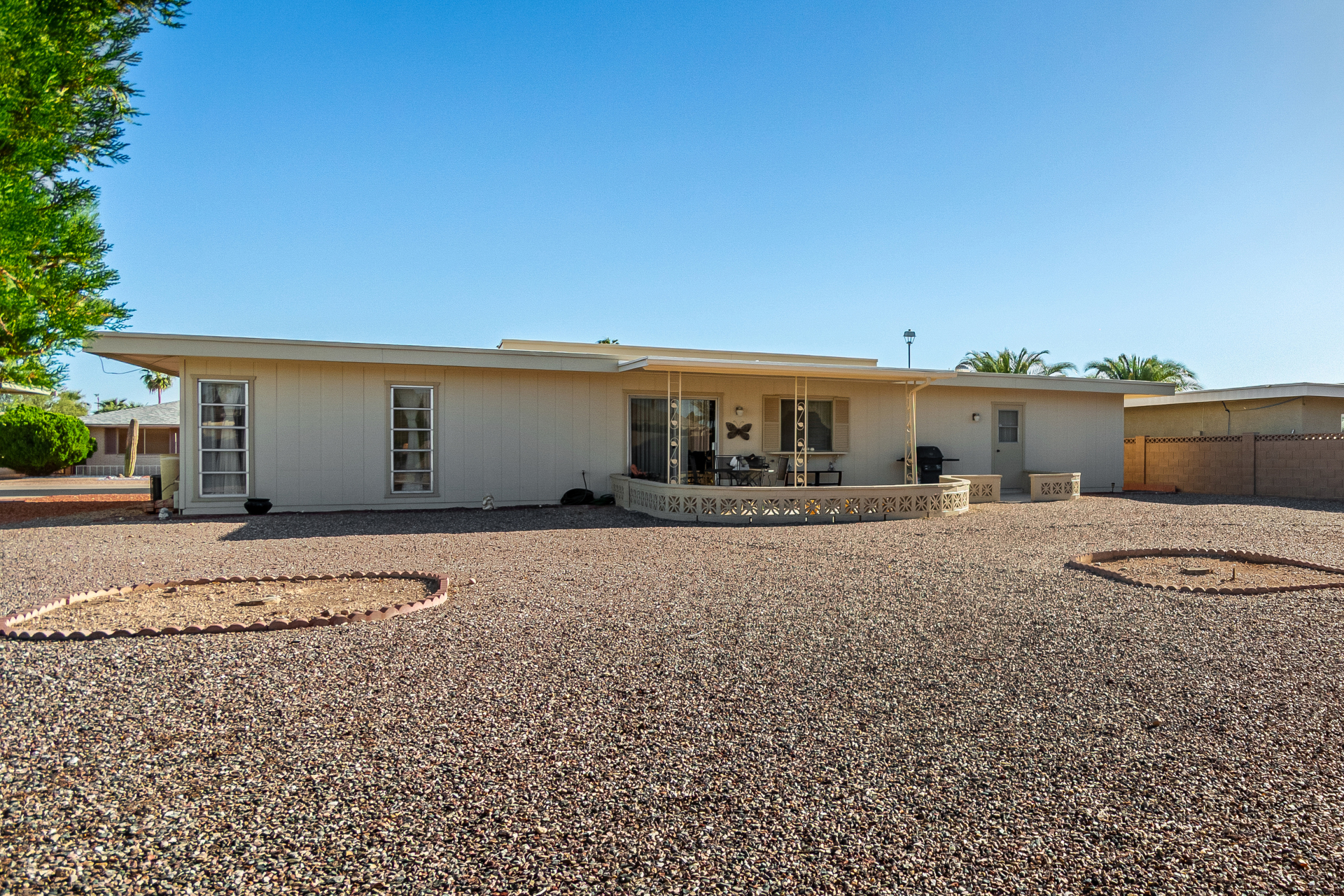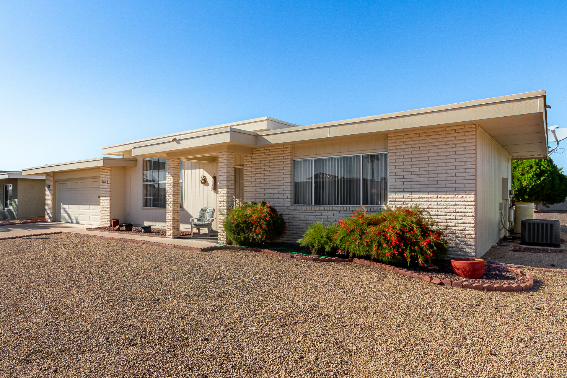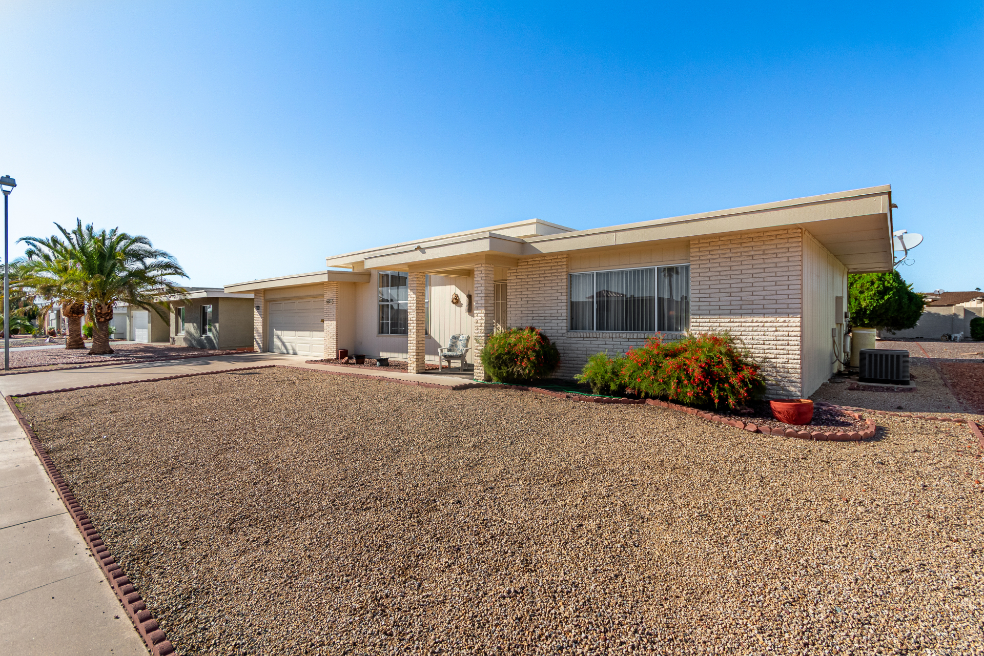 This lovely Sun City home is light & bright with an open concept feel living room & dining area. Cozy kitchen includes built-in appliances, frig, pantry & two nice oversized bedrooms. Attractive desert landscape front & back for low maintenance upkeep. Large private backyard w/covered patio & mature trees. 2 car garage is extended with storage cabinets, washer/dryer hook up & service door leading to back yard. Enjoy the vibrant Sun City 55+ lifestyle for year round living or winter retreat. Amenities include multiple recreation centers for swimming, tennis, fitness rooms and golf courses. Great location to Hwy Loop 101, various shopping, restaurants, entertainment & sports venues, near to hospitals & clinics. Low property taxes are a bonus!