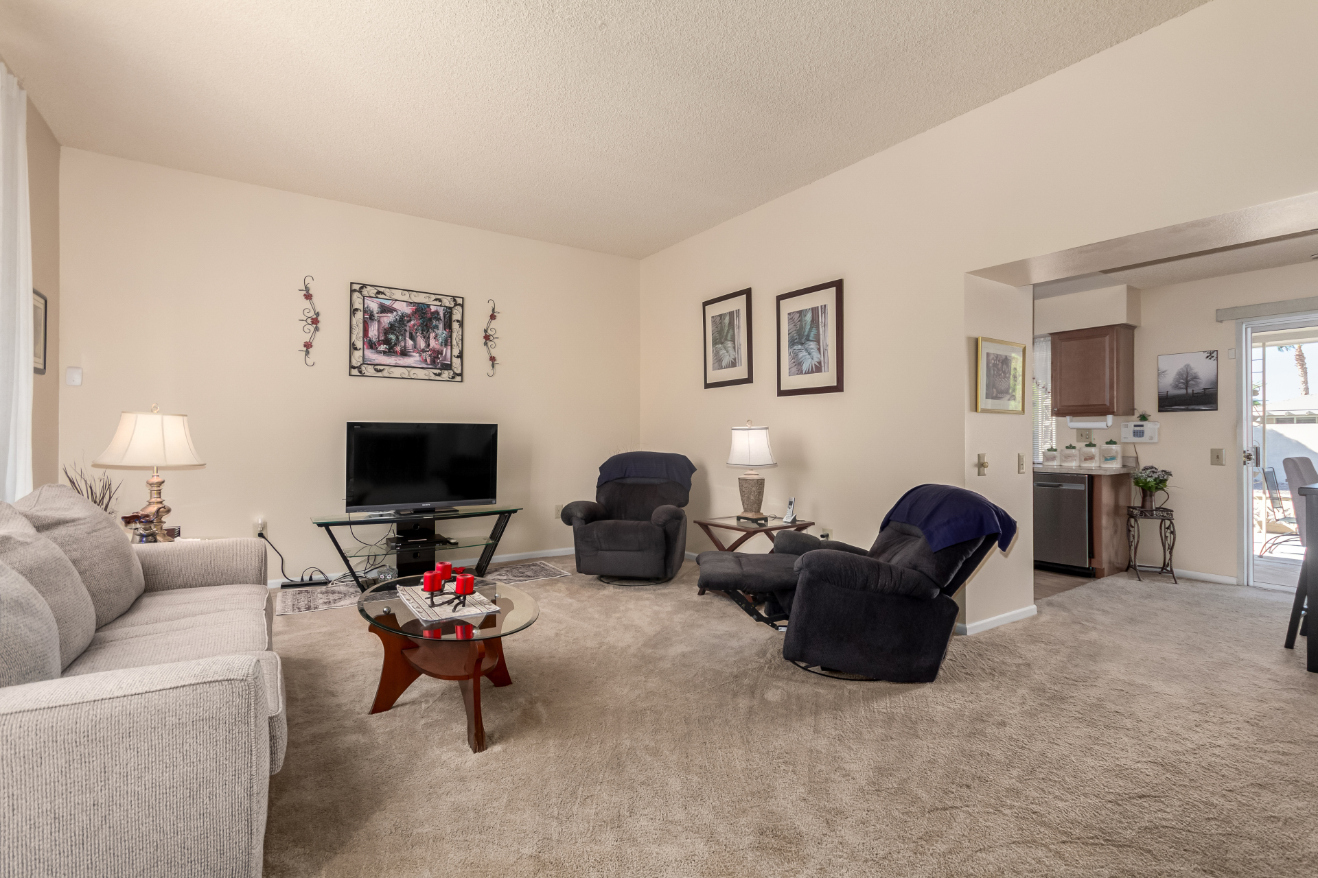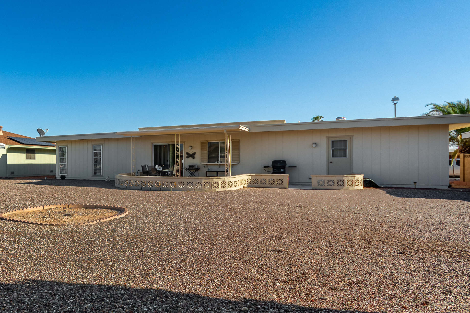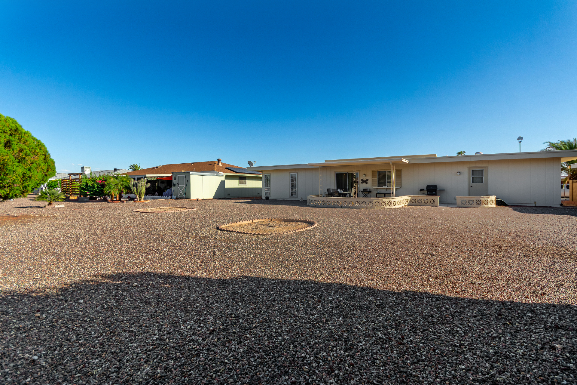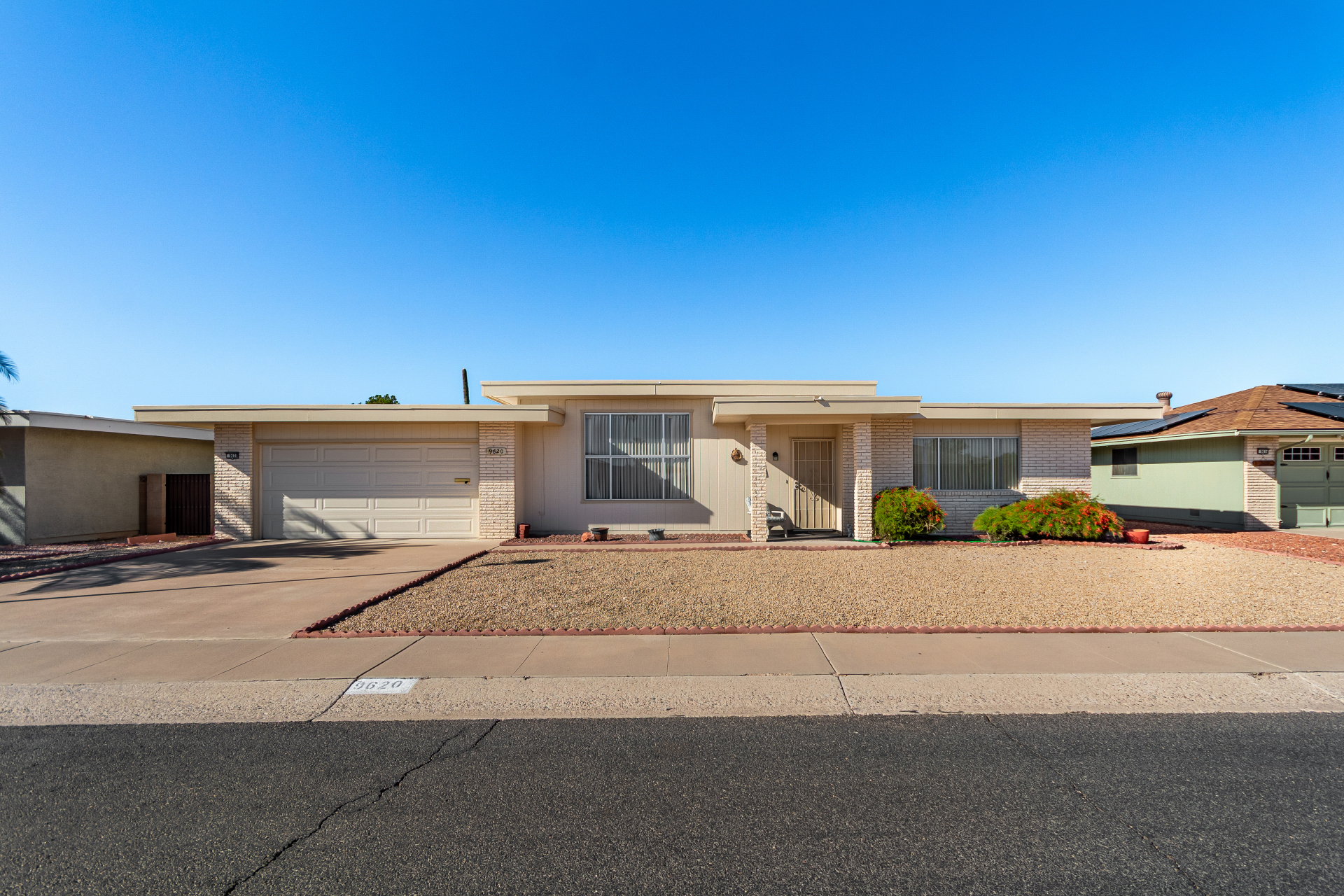 This lovely Sun City home is light & bright with an open concept feel living room & dining area. Cozy kitchen includes built-in appliances, frig, pantry & two nice oversized bedrooms. Attractive desert landscape front & back for low maintenance upkeep. Large private backyard w/covered patio & mature trees. 2 car garage is extended with storage cabinets, washer/dryer hook up & service door leading to back yard. Enjoy the vibrant Sun City 55+ lifestyle for year round living or winter retreat. Amenities include multiple recreation centers for swimming, tennis, fitness rooms and golf courses. Great location to Hwy Loop 101, various shopping, restaurants, entertainment & sports venues, near to hospitals & clinics. Low property taxes are a bonus!