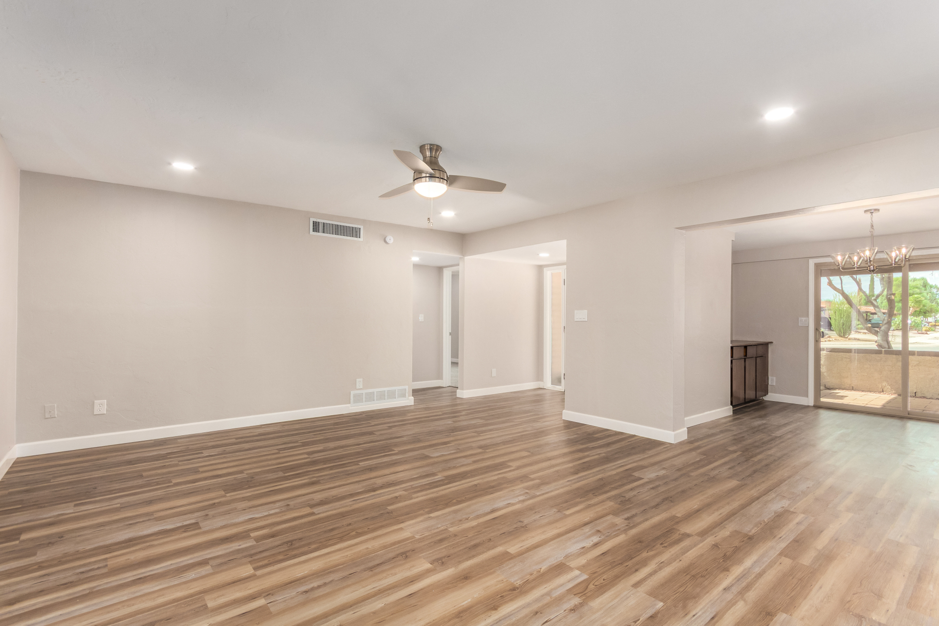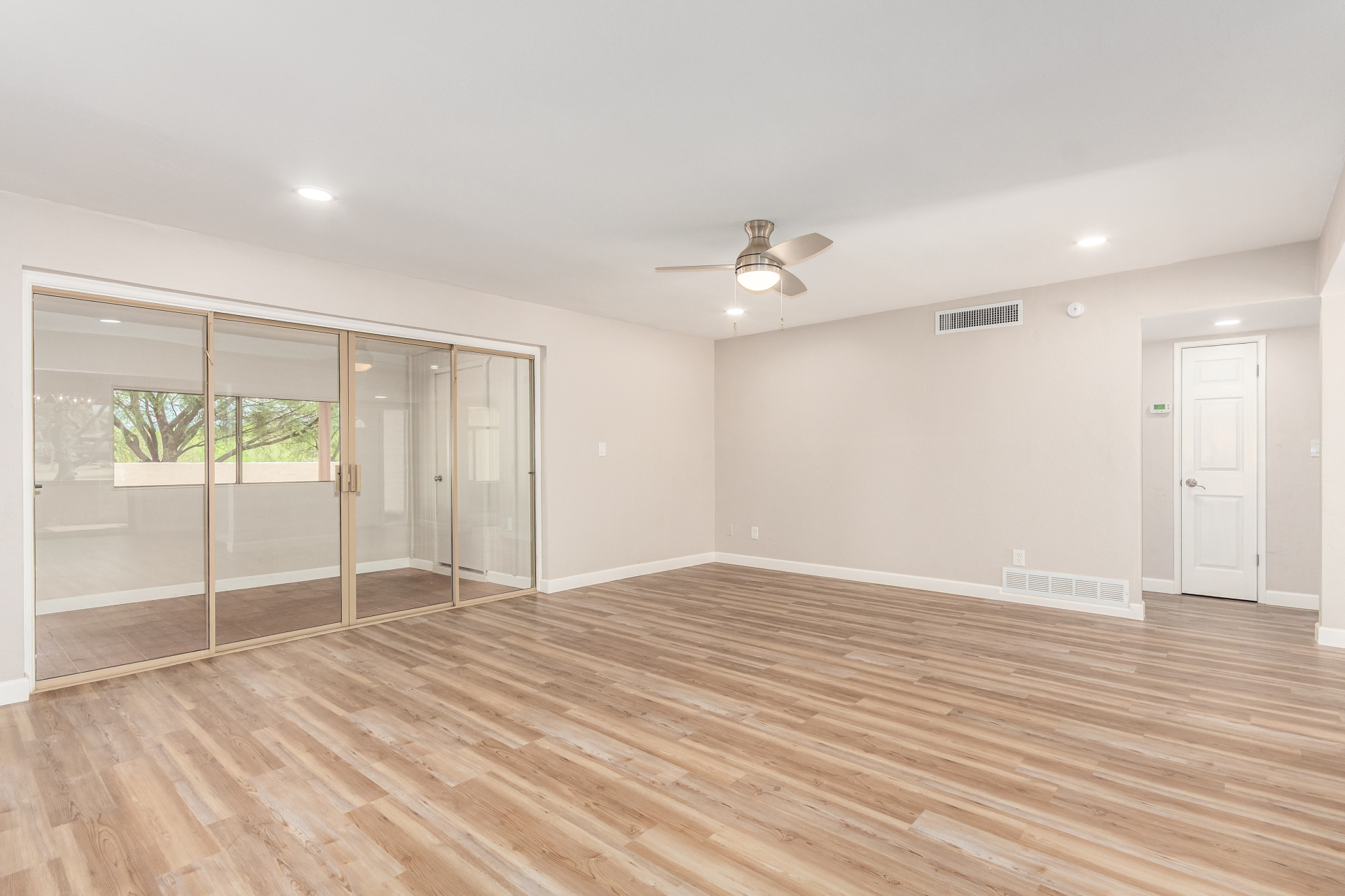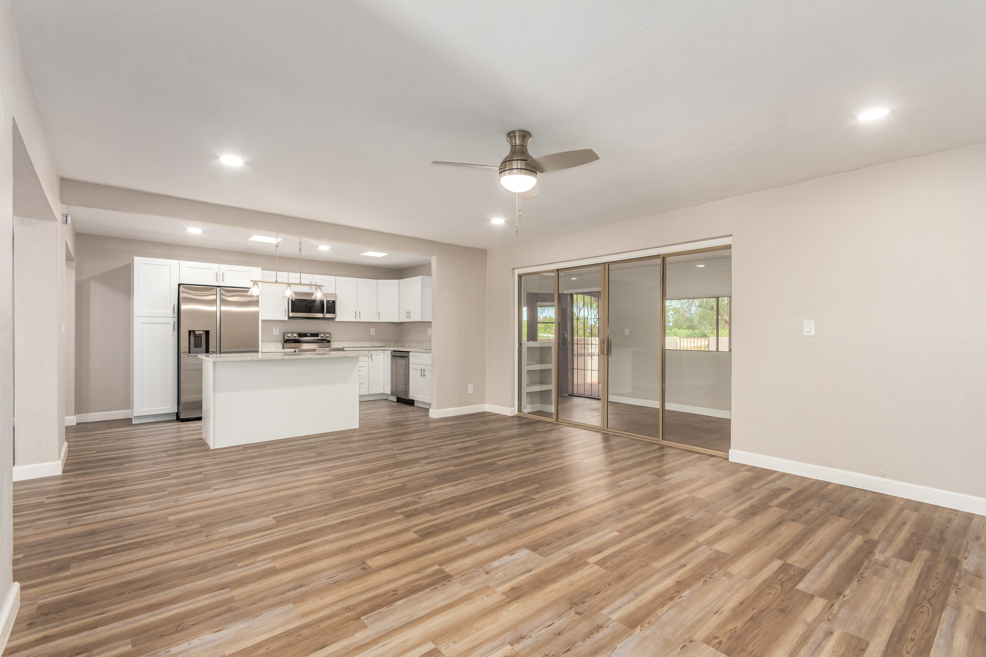 Enjoy practical and low-maintenance living in this gorgeous 2-bedroom/2-bathroom condo! Let the charming courtyard invite you to take a look inside, where you'll find a bright & open layout perfect for entertaining and relaxation, featuring wood-look flooring, recessed lighting, and neutral paint that complements any decor. Whip up your favorite dishes in the pristine kitchen, equipped with shaker cabinets, granite countertops, stainless steel appliances & an island with a breakfast bar, perfect for quick meals. The serene main bedroom hosts a bathroom & a closet. The sizable laundry room provides extra storage space. The backyard is complete with a cozy covered patio perfect for morning coffee and a nice space for weekend grills and peaceful evenings! What's not to love? Make it yours!