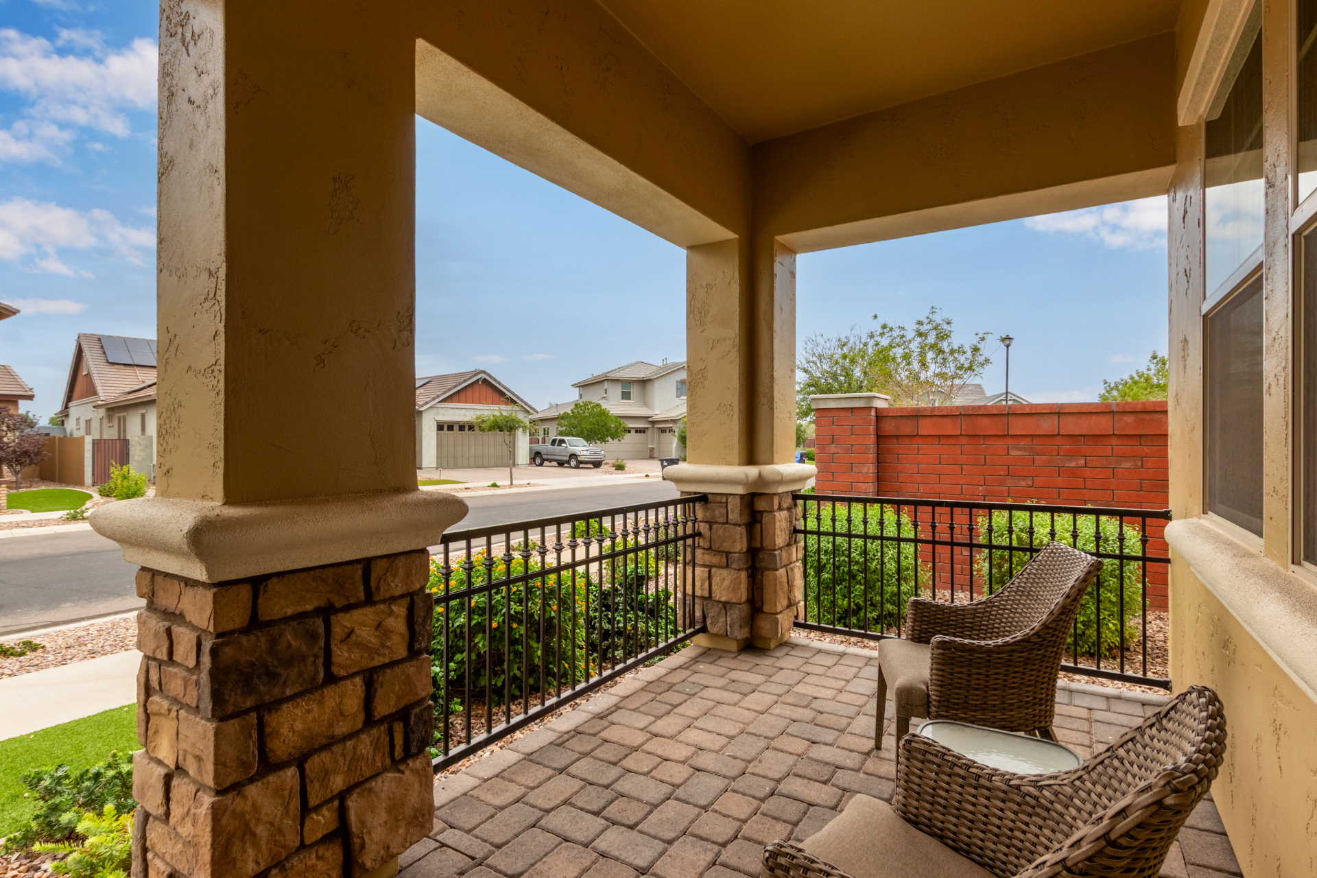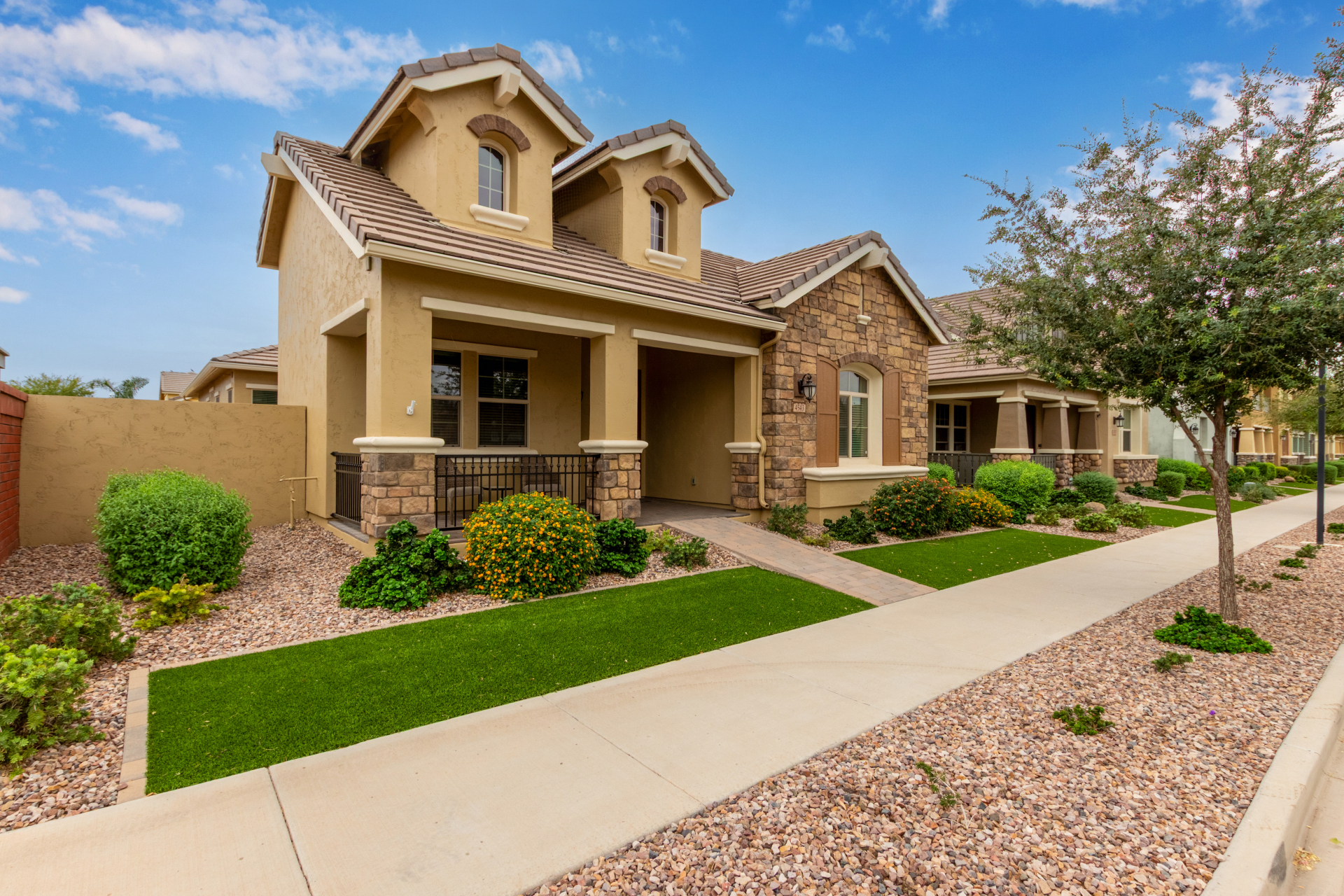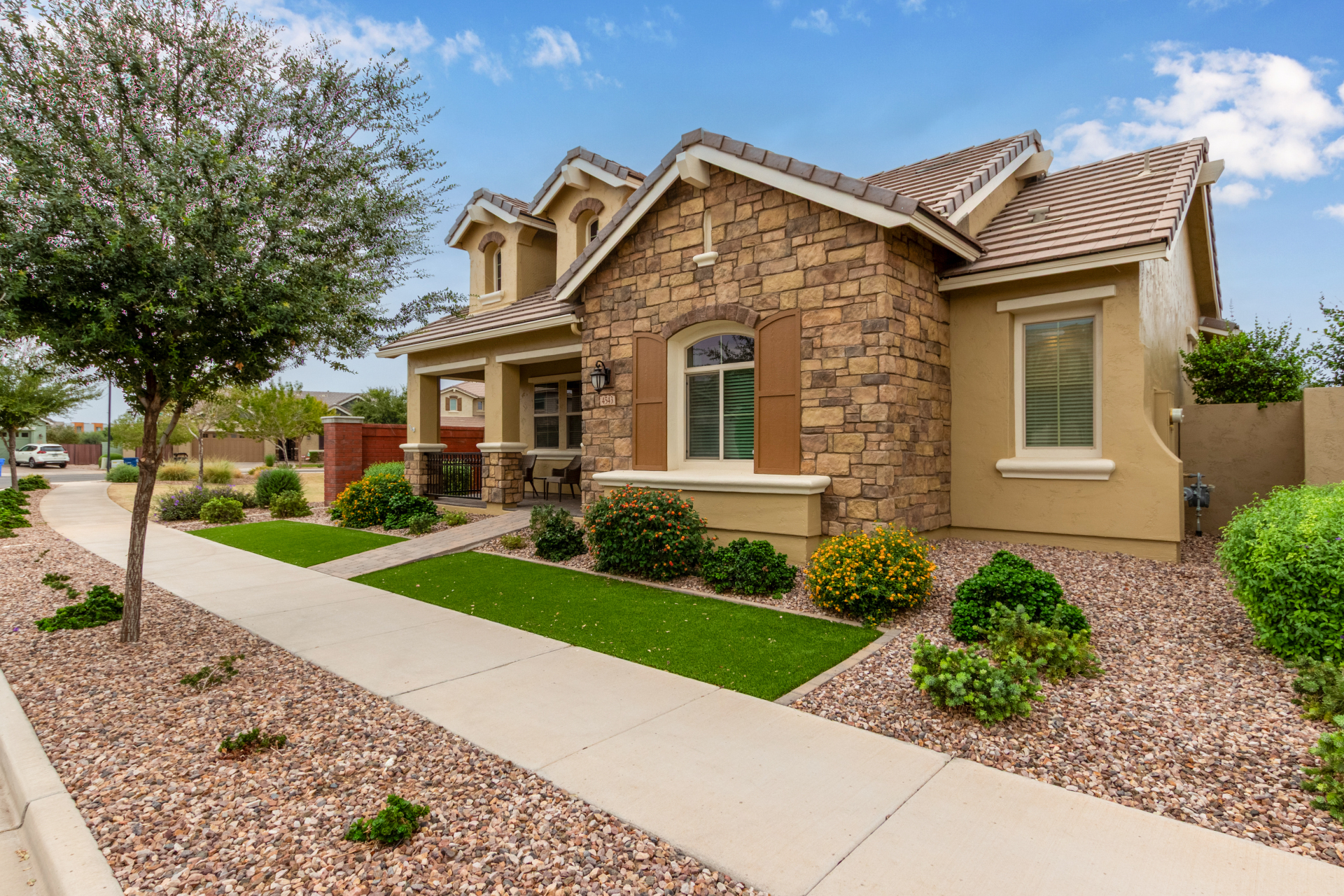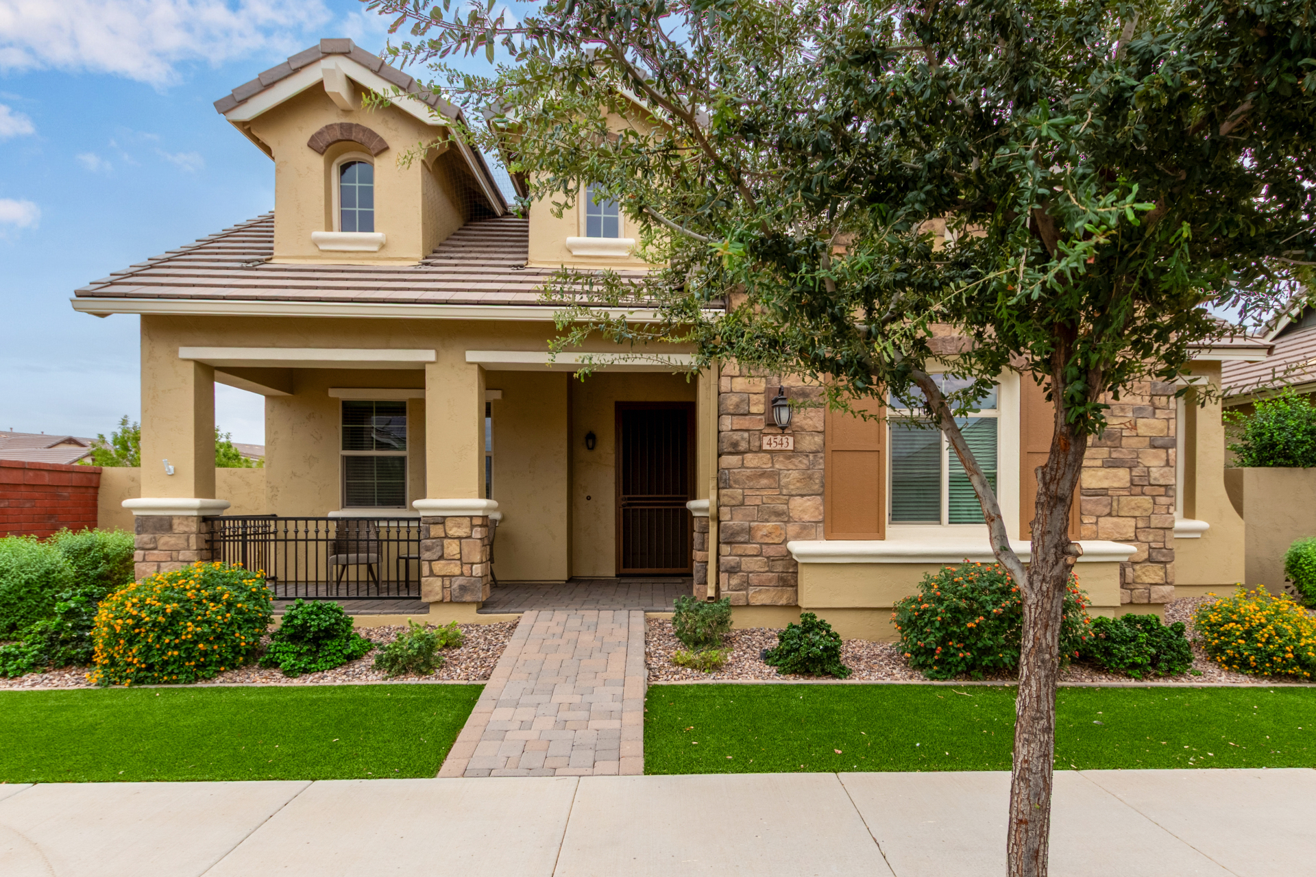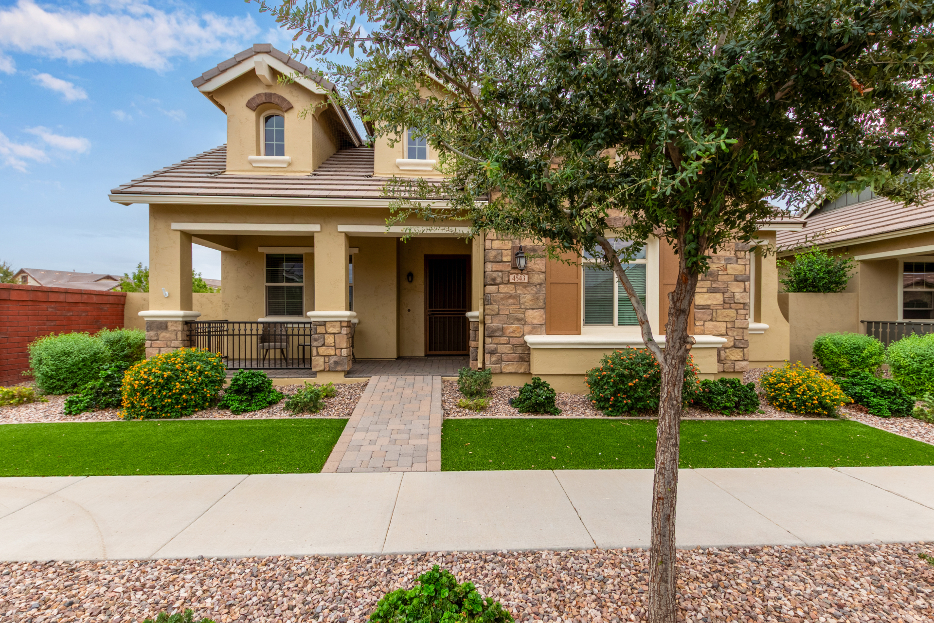 Welcome home to this move-in-ready home in one of Gilberts most desirable communities. This 3 bedroom 2 bathroom 2 car garage home with a den offers upgrades galore. From the 10ft ceilings and upgraded wood plank tiles to the granite counter tops and stainless steel appliances in the gourmet kitchen this home leaves you wanting for nothing. Other upgrades include r/o system, water softner, automated sun screens on the large covered patio, large kitchen island, subway tile kitchen backsplash, plenty of cabinets, artificial turf in the frontyard is maintained by the hoa, backyard has artificial turf and pavers. The communities amenities include pools, playgrounds, basketball courts, bocce ball courts and a cornhole court.