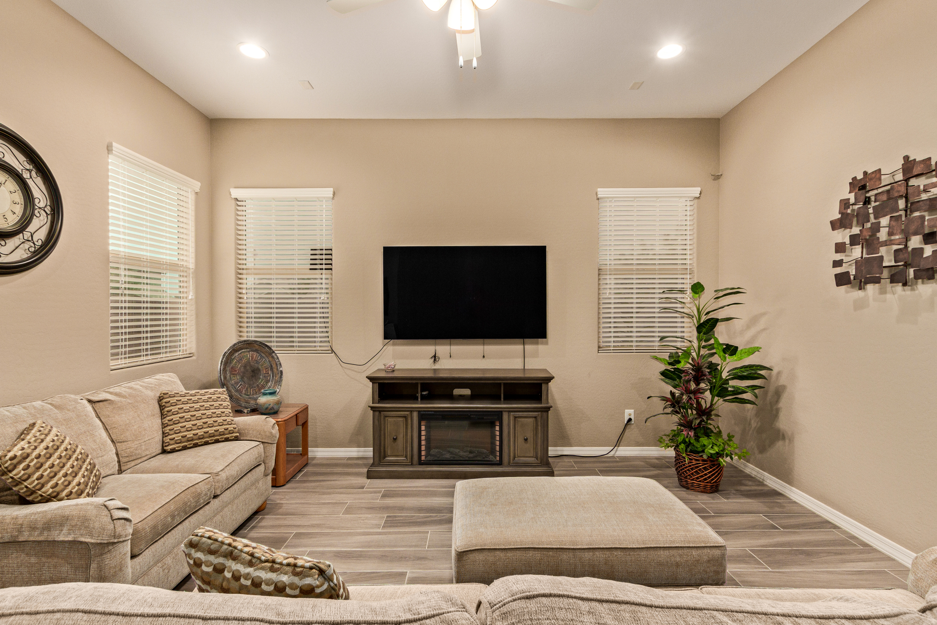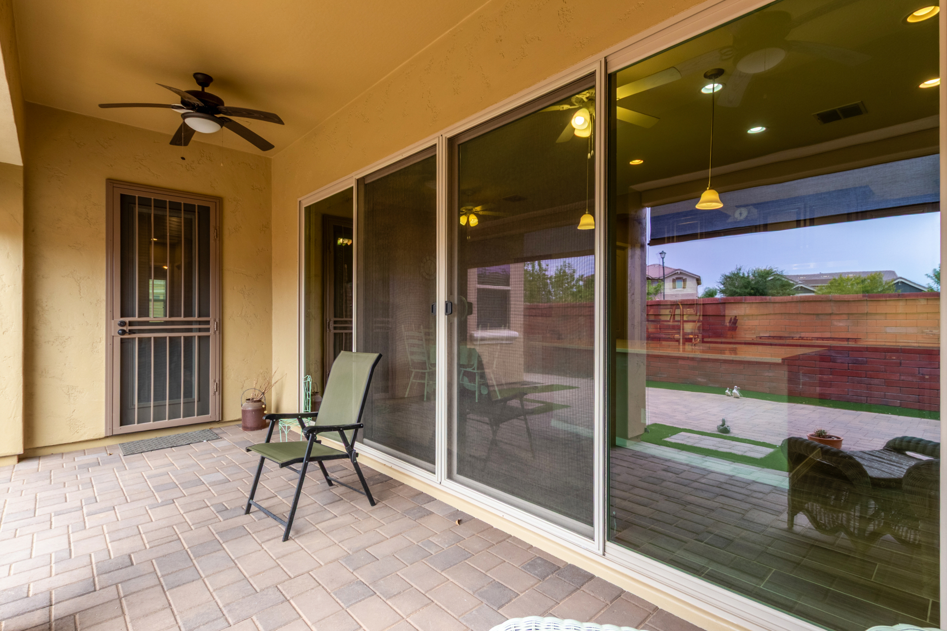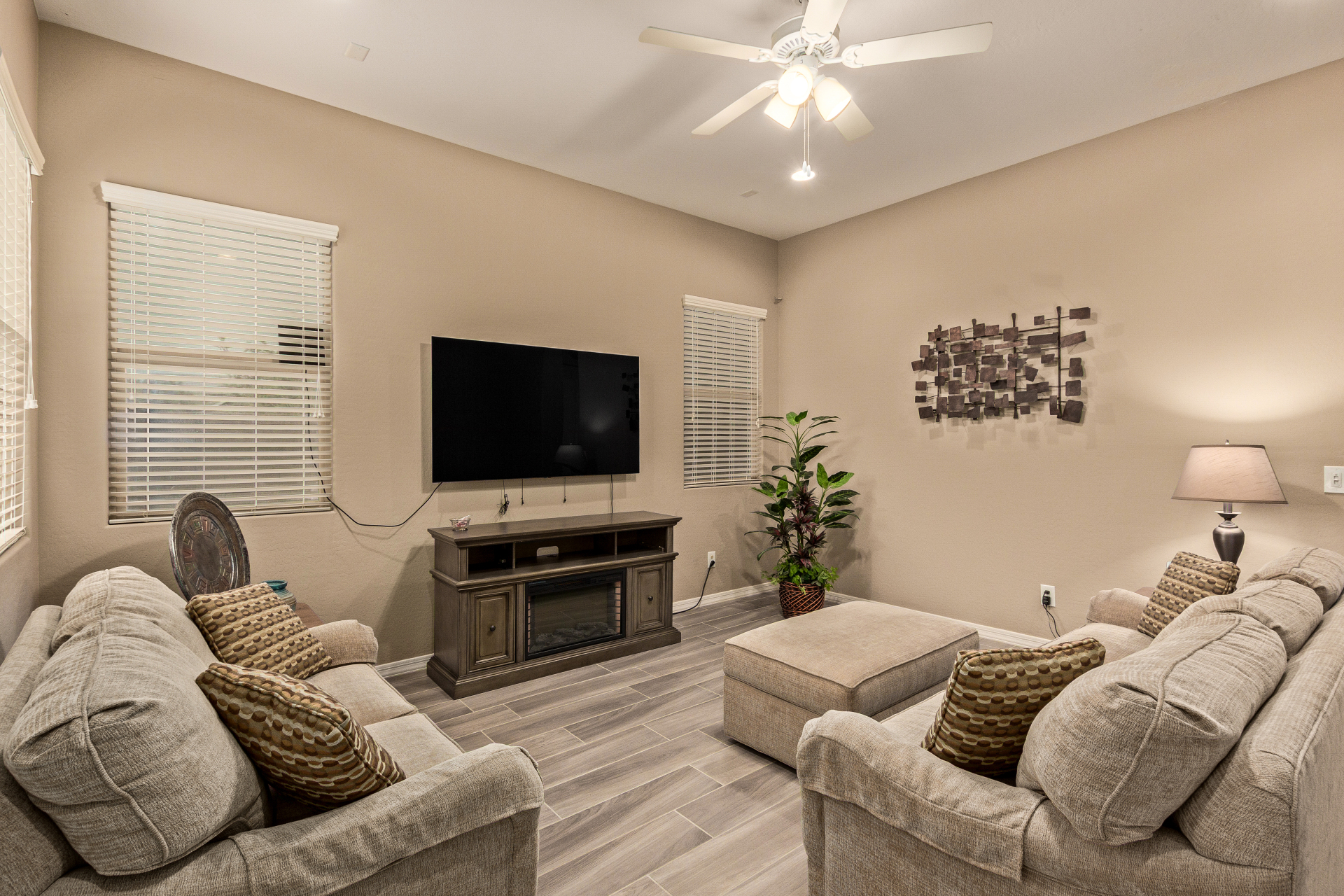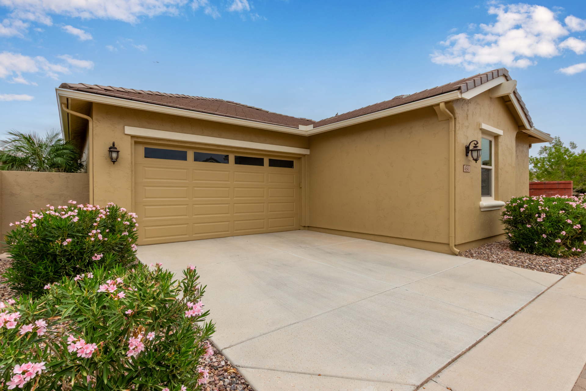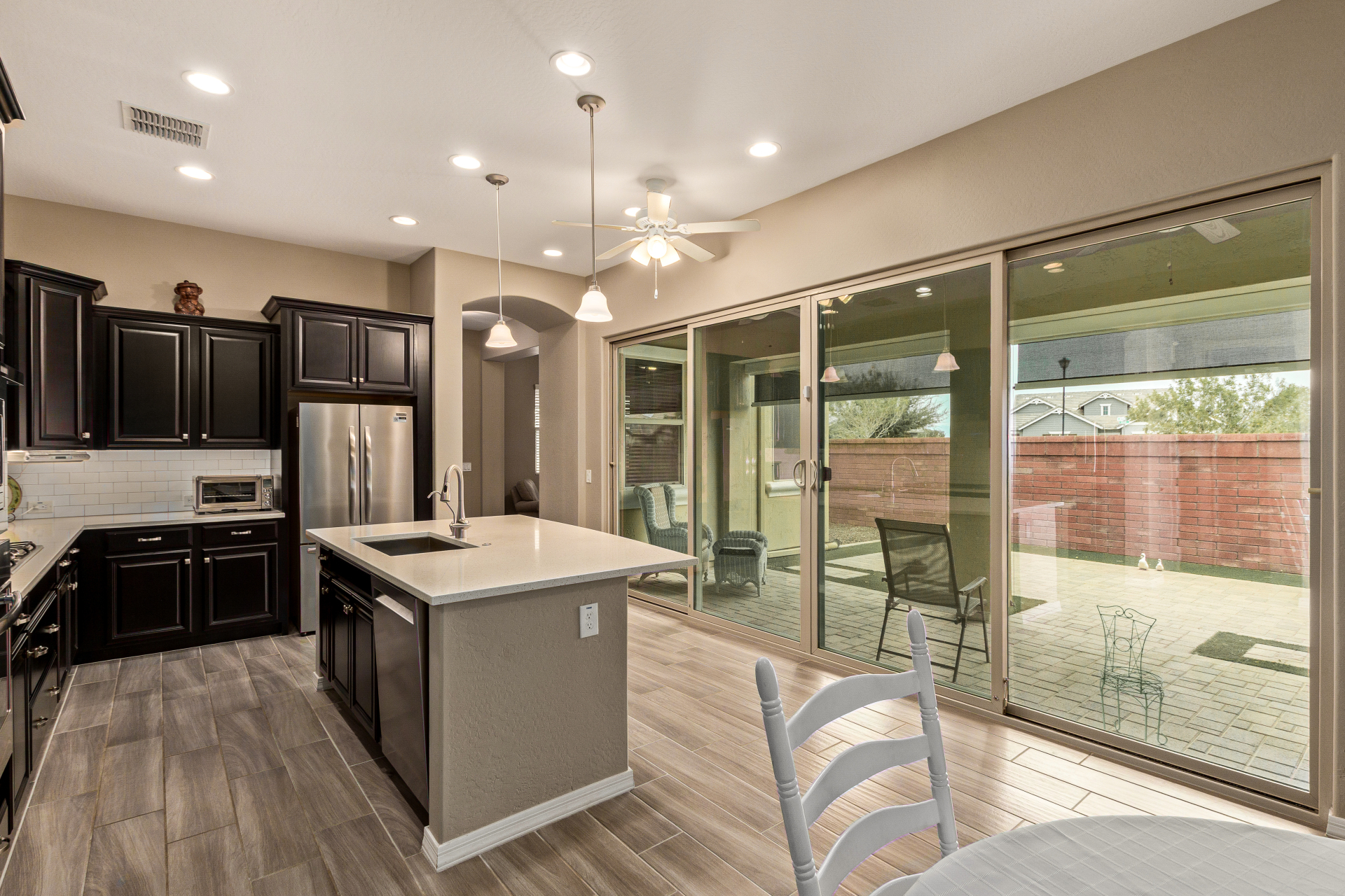 Welcome home to this move-in-ready home in one of Gilberts most desirable communities. This 3 bedroom 2 bathroom 2 car garage home with a den offers upgrades galore. From the 10ft ceilings and upgraded wood plank tiles to the granite counter tops and stainless steel appliances in the gourmet kitchen this home leaves you wanting for nothing. Other upgrades include r/o system, water softner, automated sun screens on the large covered patio, large kitchen island, subway tile kitchen backsplash, plenty of cabinets, artificial turf in the frontyard is maintained by the hoa, backyard has artificial turf and pavers. The communities amenities include pools, playgrounds, basketball courts, bocce ball courts and a cornhole court.
