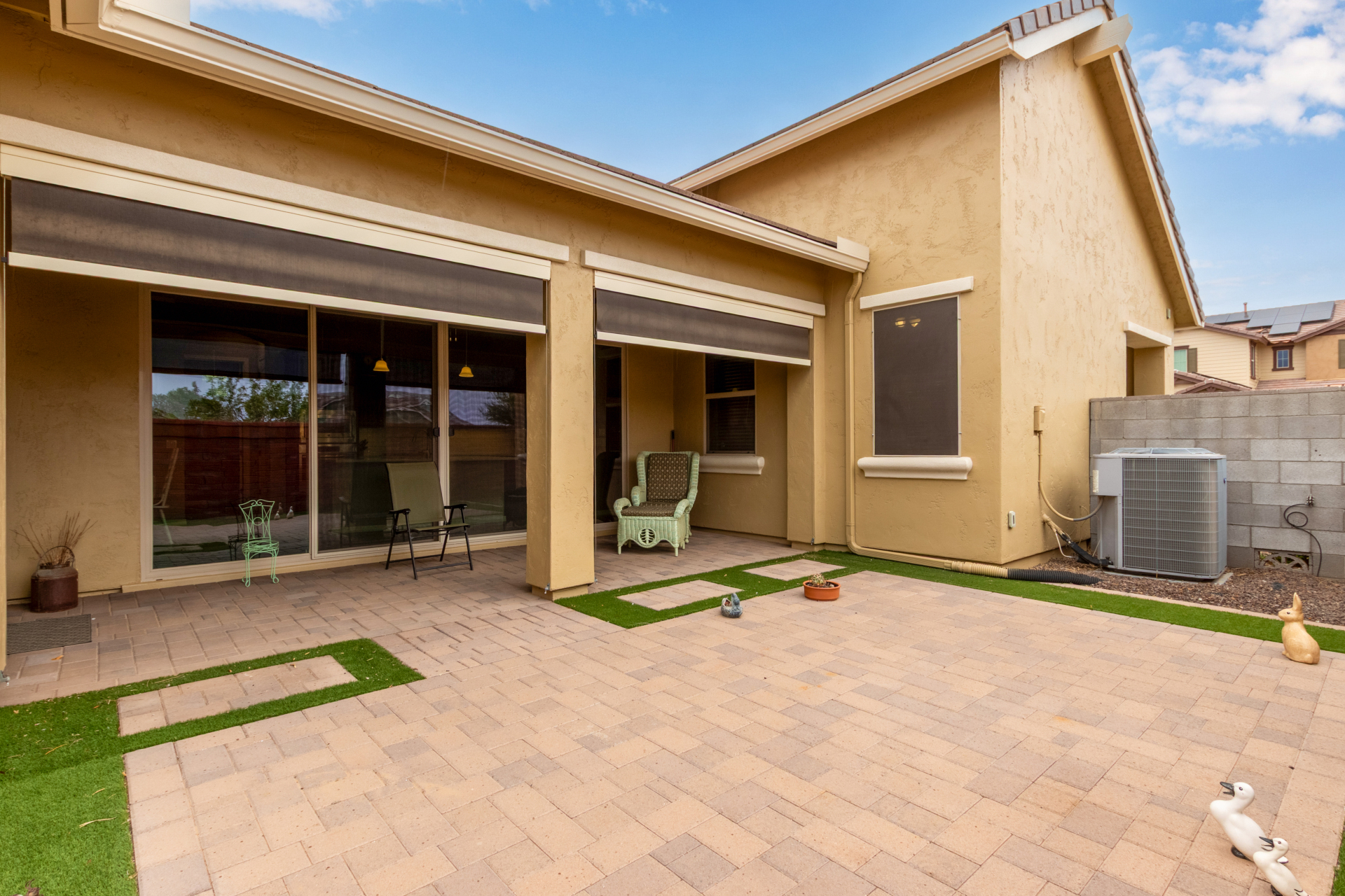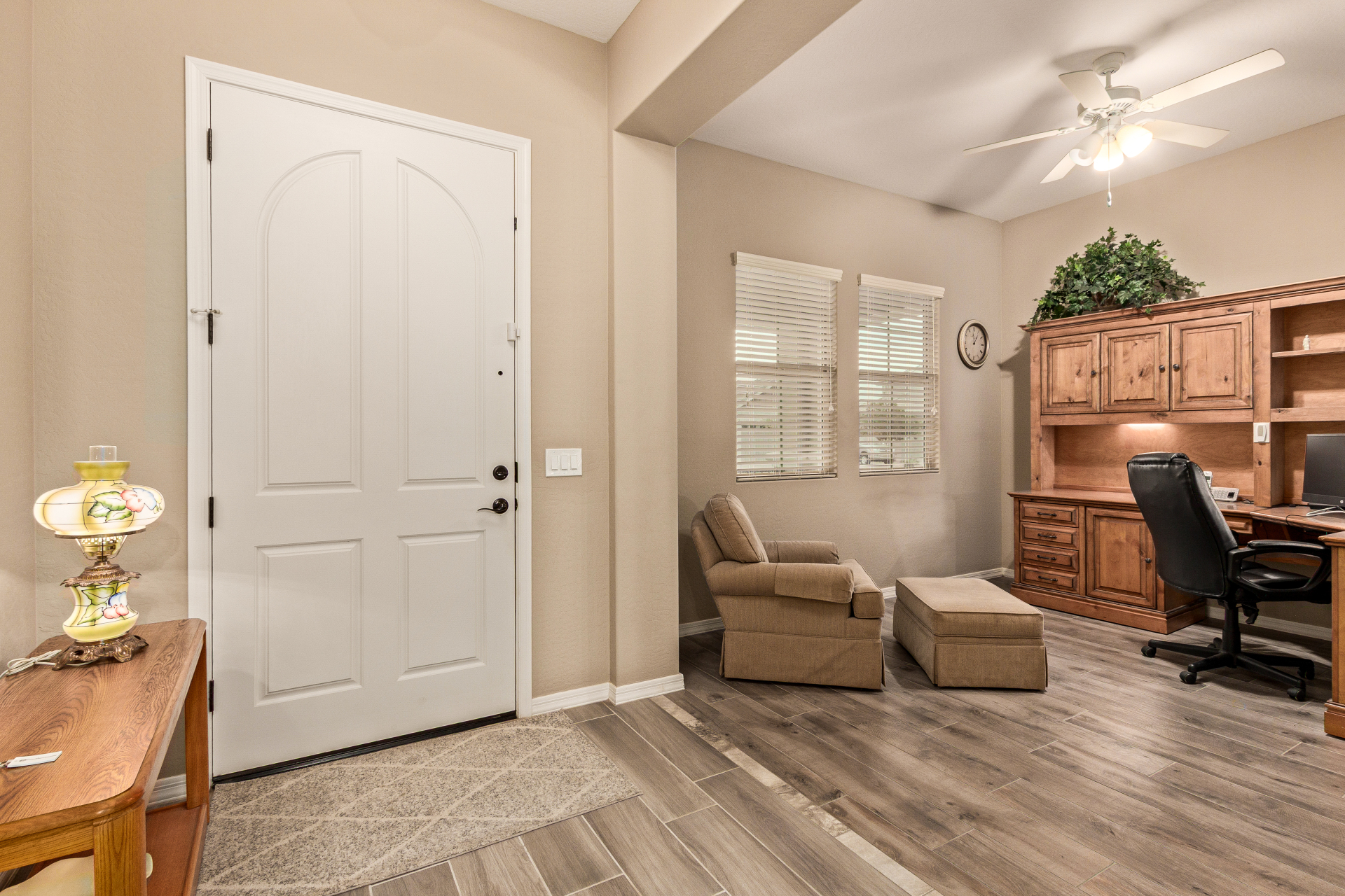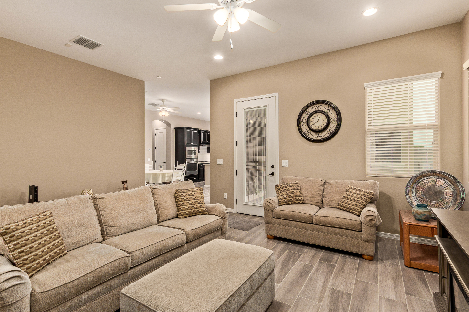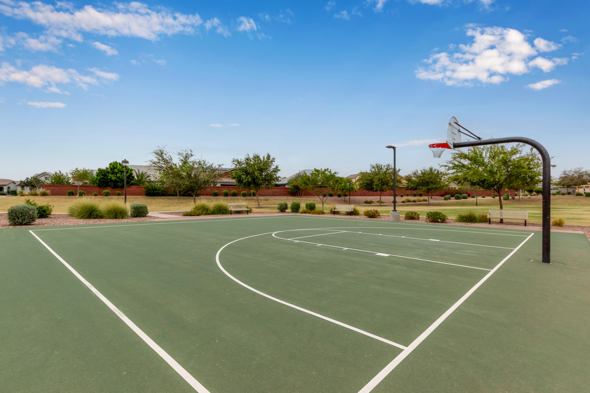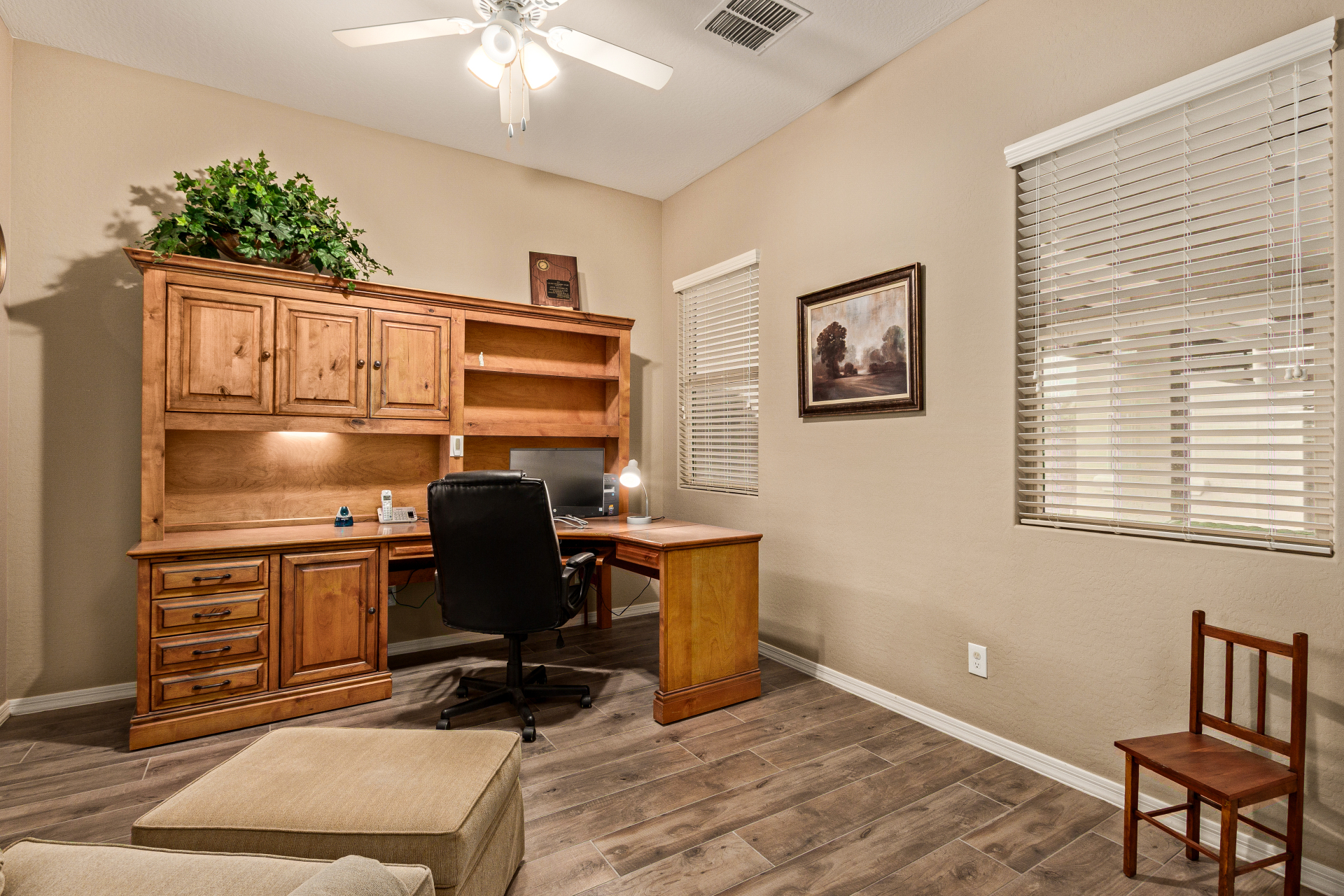 Welcome home to this move-in-ready home in one of Gilberts most desirable communities. This 3 bedroom 2 bathroom 2 car garage home with a den offers upgrades galore. From the 10ft ceilings and upgraded wood plank tiles to the granite counter tops and stainless steel appliances in the gourmet kitchen this home leaves you wanting for nothing. Other upgrades include r/o system, water softner, automated sun screens on the large covered patio, large kitchen island, subway tile kitchen backsplash, plenty of cabinets, artificial turf in the frontyard is maintained by the hoa, backyard has artificial turf and pavers. The communities amenities include pools, playgrounds, basketball courts, bocce ball courts and a cornhole court.