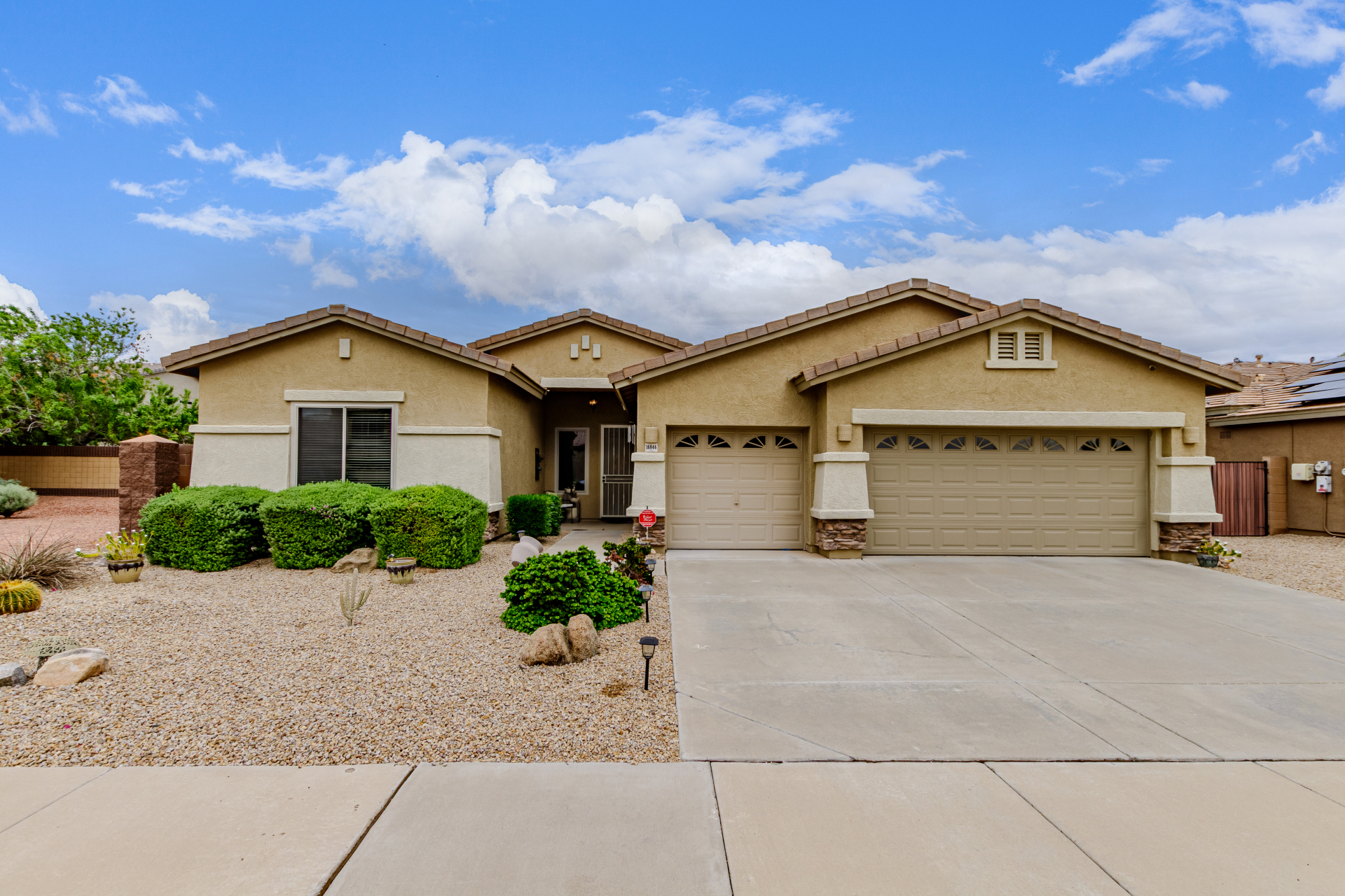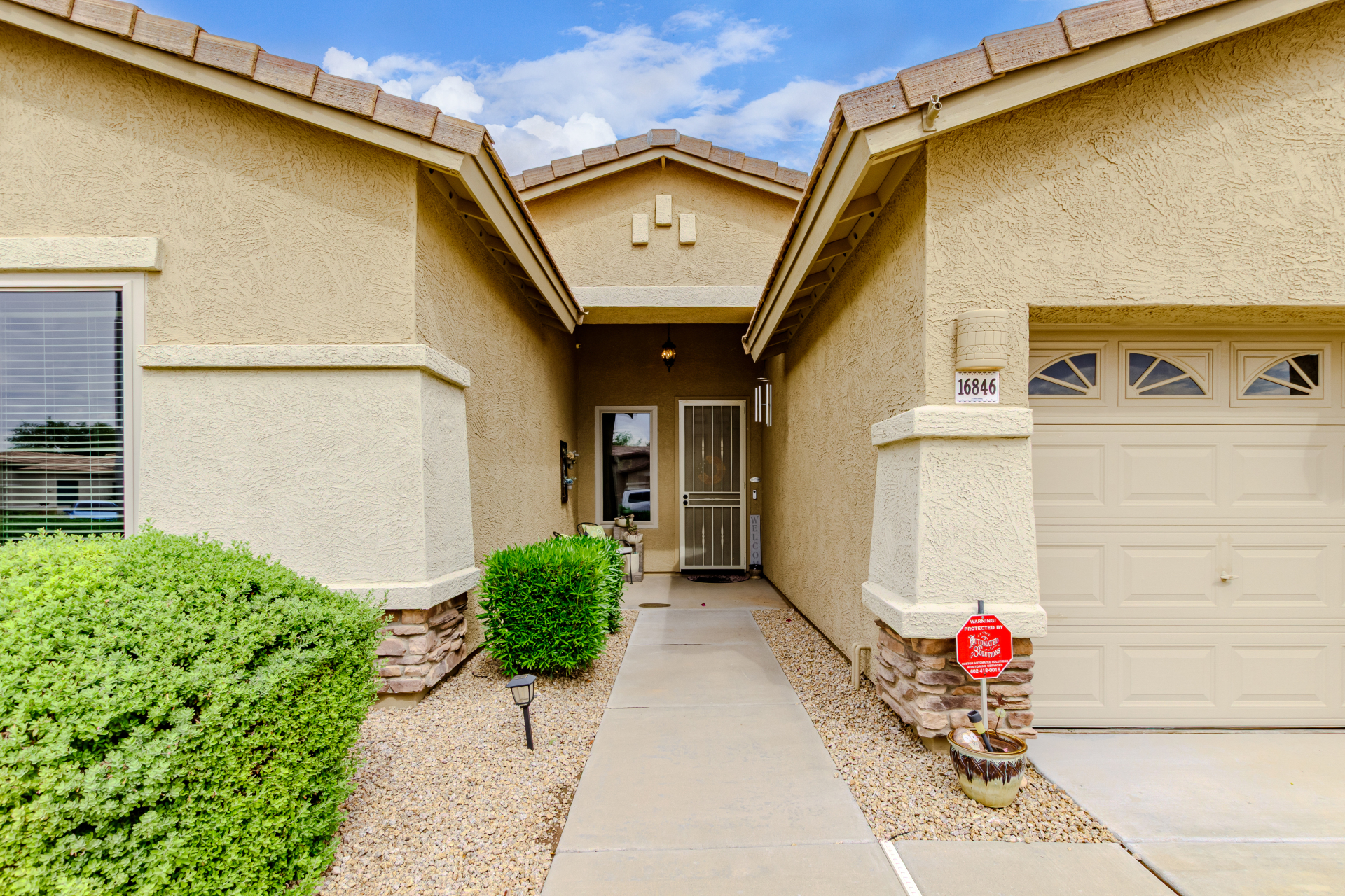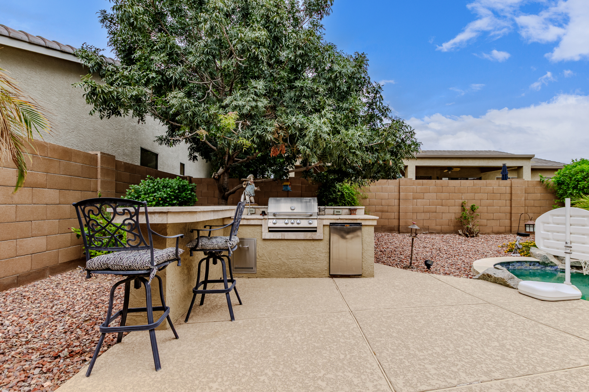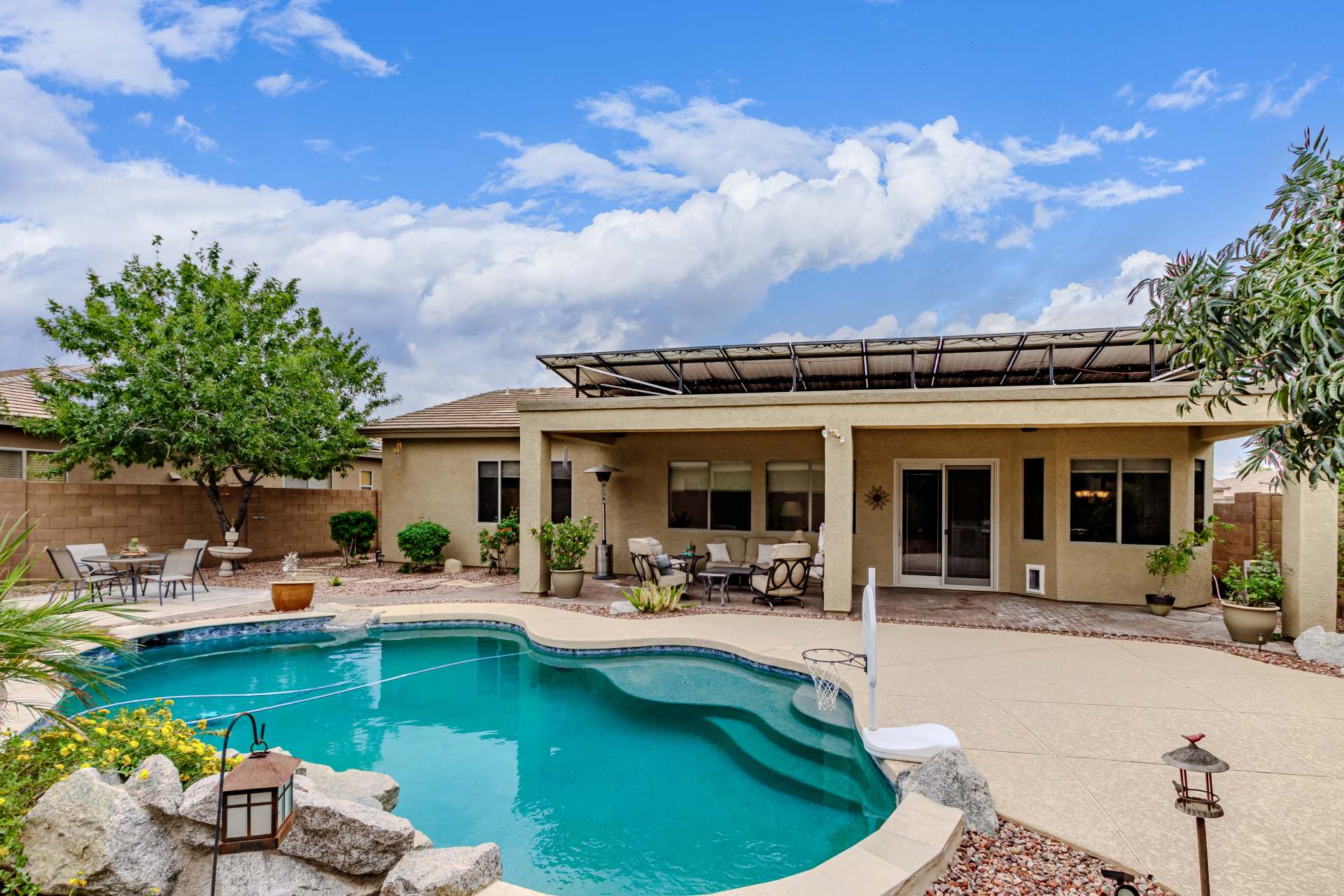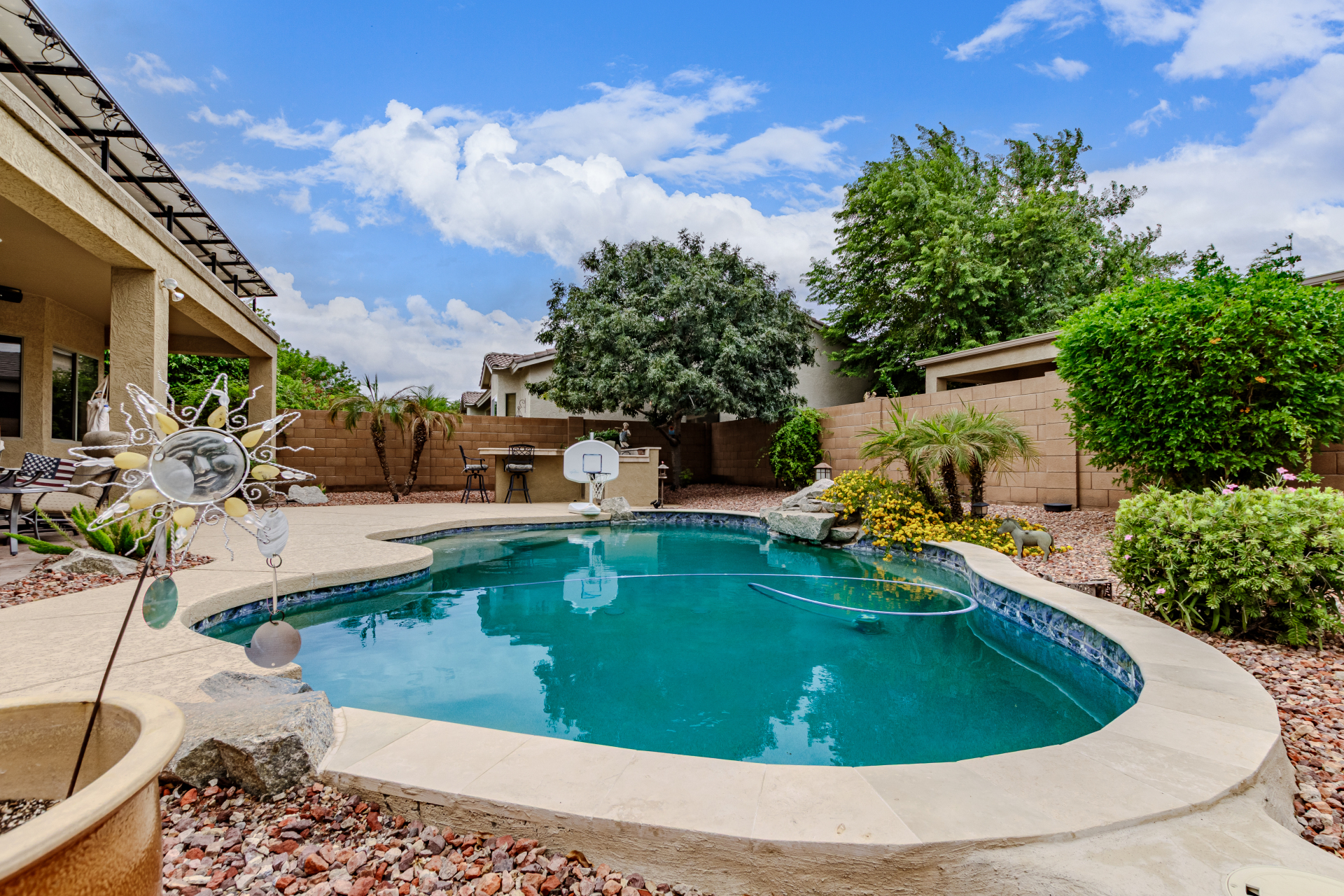 Beautiful 3-bed, 2-bath with POOL in Bell West Ranch! Sits on a cul-de-sac, adjacent to a common area. A manicured desert landscape & a 3-car garage w/cabinetry are just the beginning. The fabulous interior features designer paint, layered crown molding, tons of natural light, wood & tile flooring in common areas, and carpet in bedrooms. You'll love the seamlessly flowing open layout paired with a media center & sliding doors to the back! The impressive kitchen boasts SS appliances, Corian counters, ample wood cabinetry, mosaic tile backsplash, & a breakfast bar. The large main bedroom has an ensuite with dual vessel sinks, separate tub/shower, & a walk-in closet. Enjoy the backyard oasis with a paver-covered patio, built-in BBQ, & a sparkling pool! Solar Panels are added perks. Just WOW!