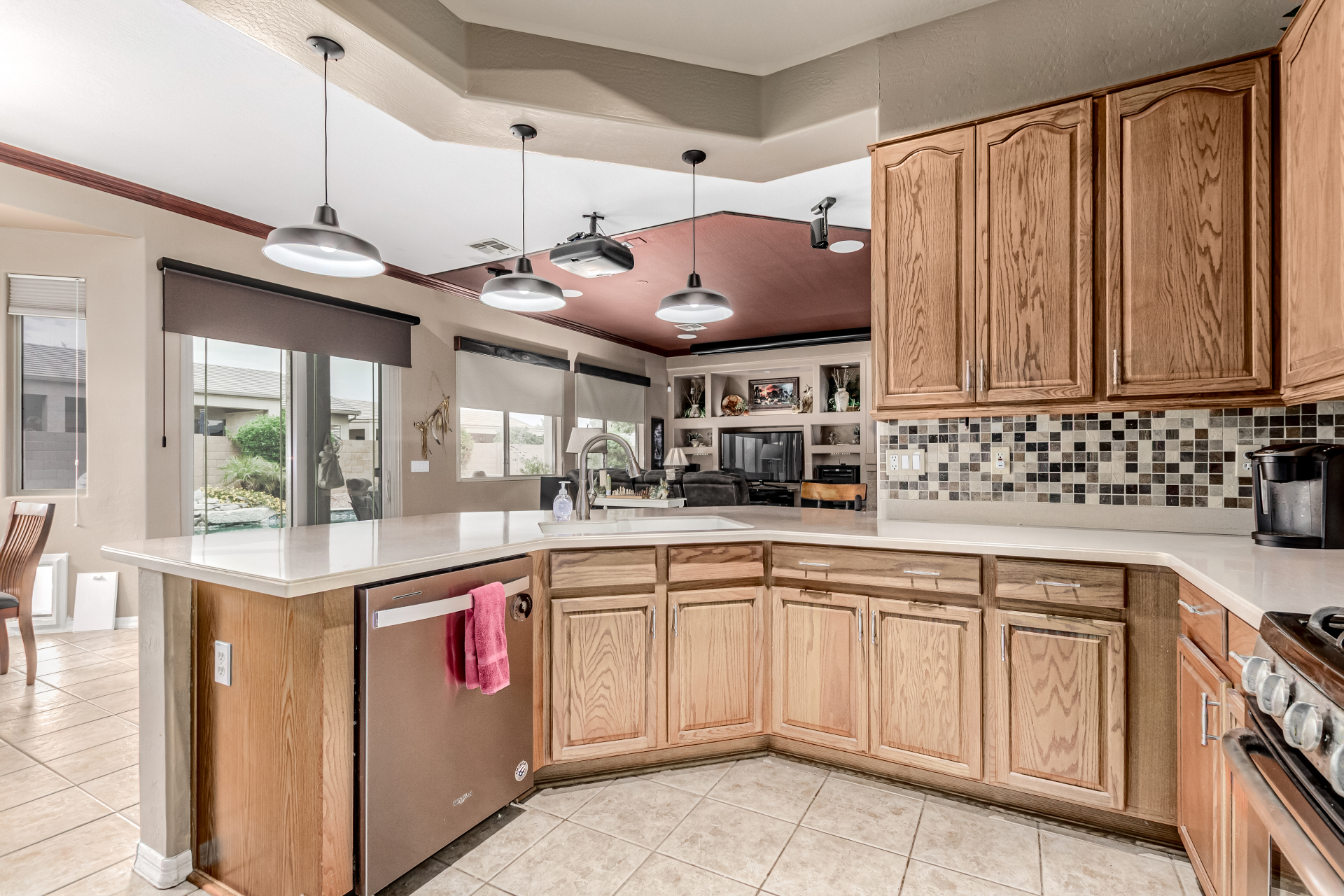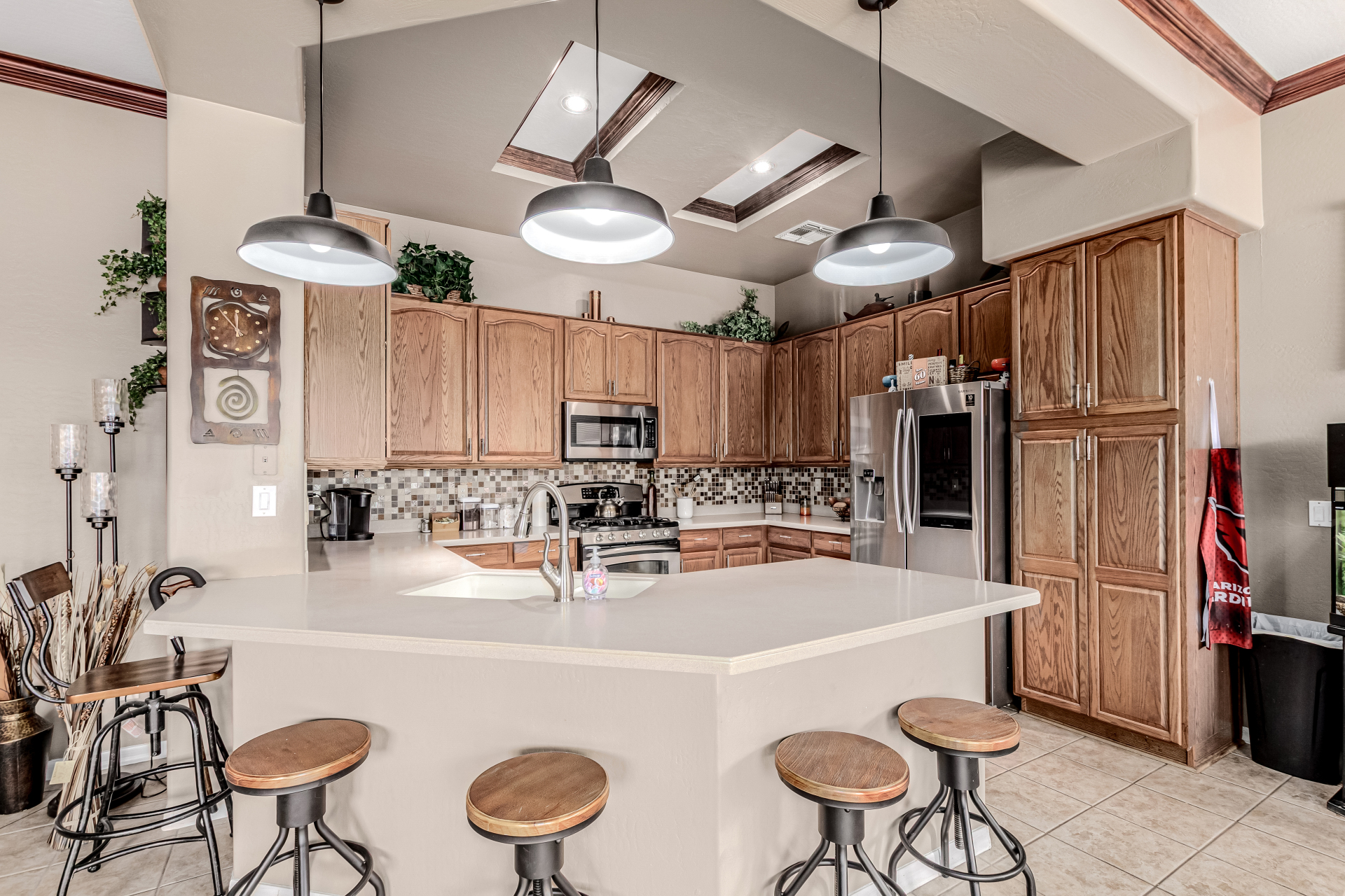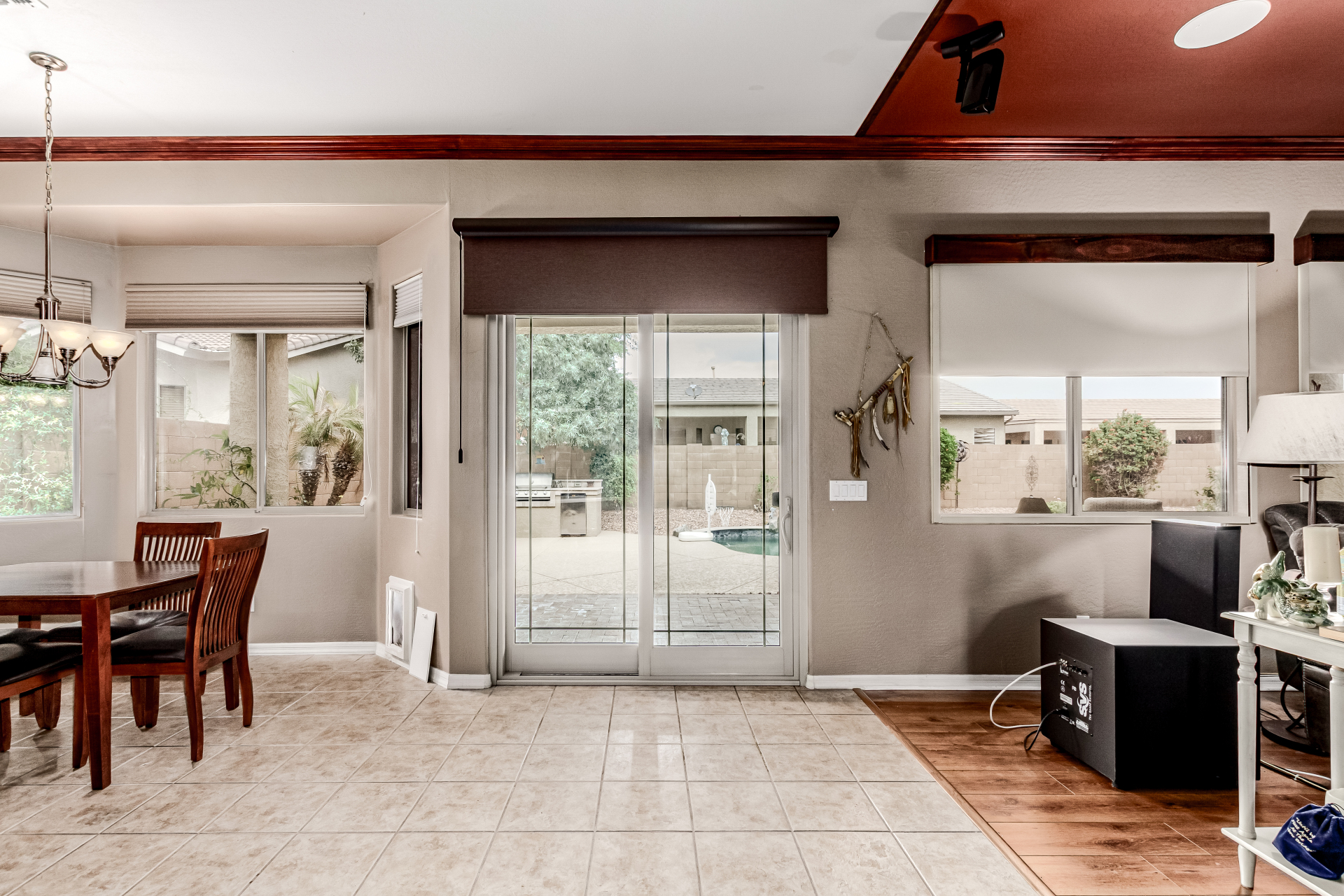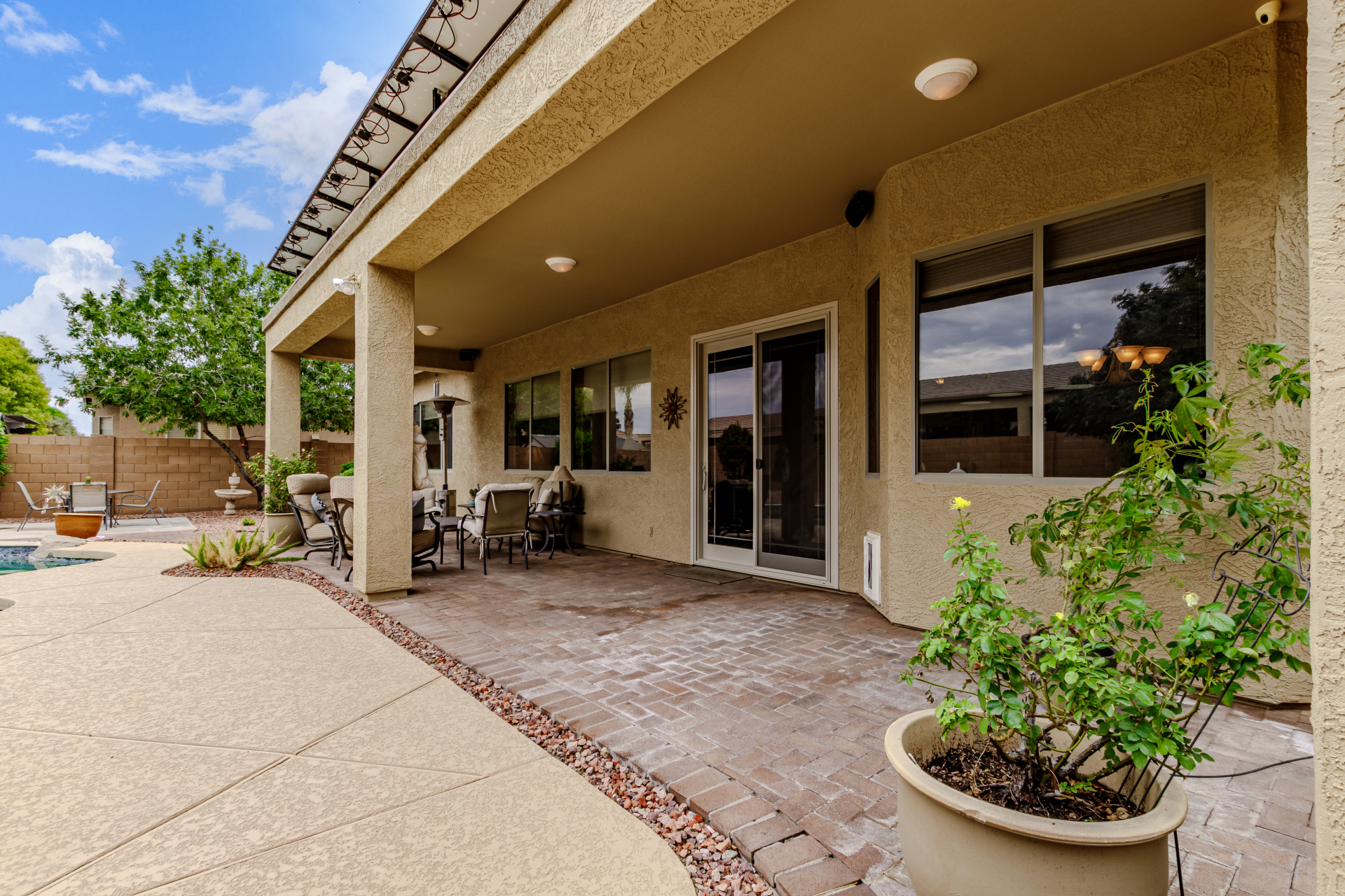 Beautiful 3-bed, 2-bath with POOL in Bell West Ranch! Sits on a cul-de-sac, adjacent to a common area. A manicured desert landscape & a 3-car garage w/cabinetry are just the beginning. The fabulous interior features designer paint, layered crown molding, tons of natural light, wood & tile flooring in common areas, and carpet in bedrooms. You'll love the seamlessly flowing open layout paired with a media center & sliding doors to the back! The impressive kitchen boasts SS appliances, Corian counters, ample wood cabinetry, mosaic tile backsplash, & a breakfast bar. The large main bedroom has an ensuite with dual vessel sinks, separate tub/shower, & a walk-in closet. Enjoy the backyard oasis with a paver-covered patio, built-in BBQ, & a sparkling pool! Solar Panels are added perks. Just WOW!