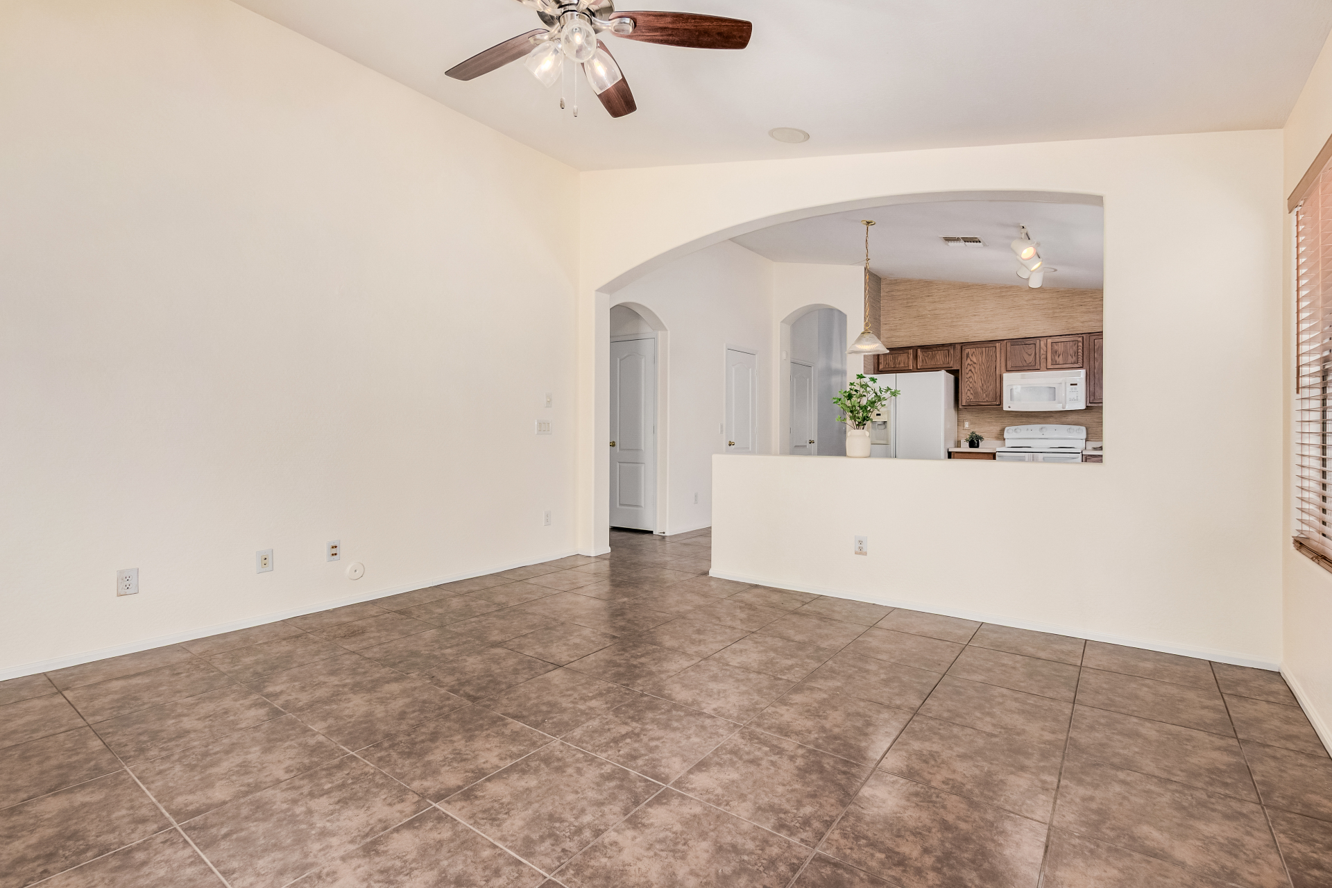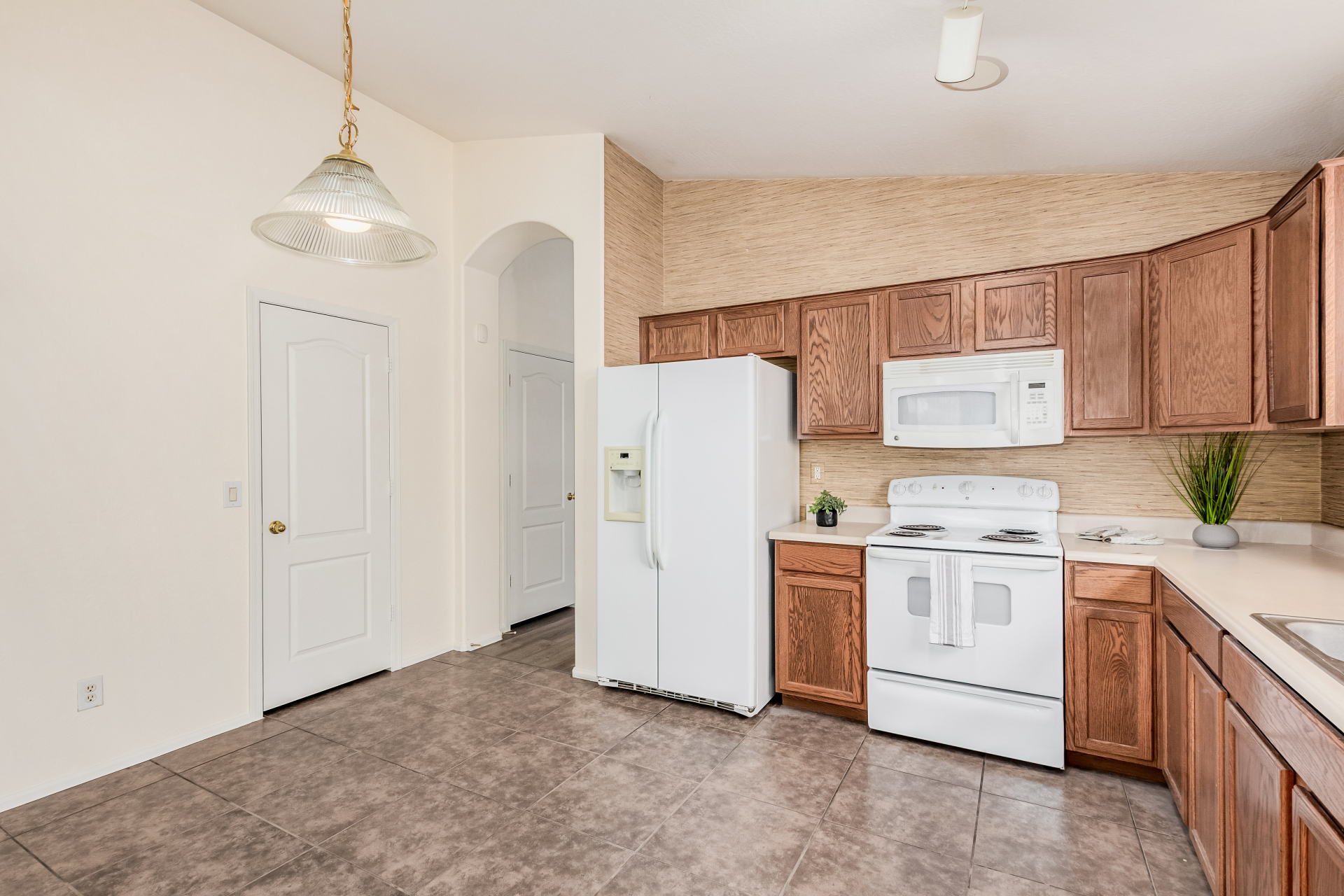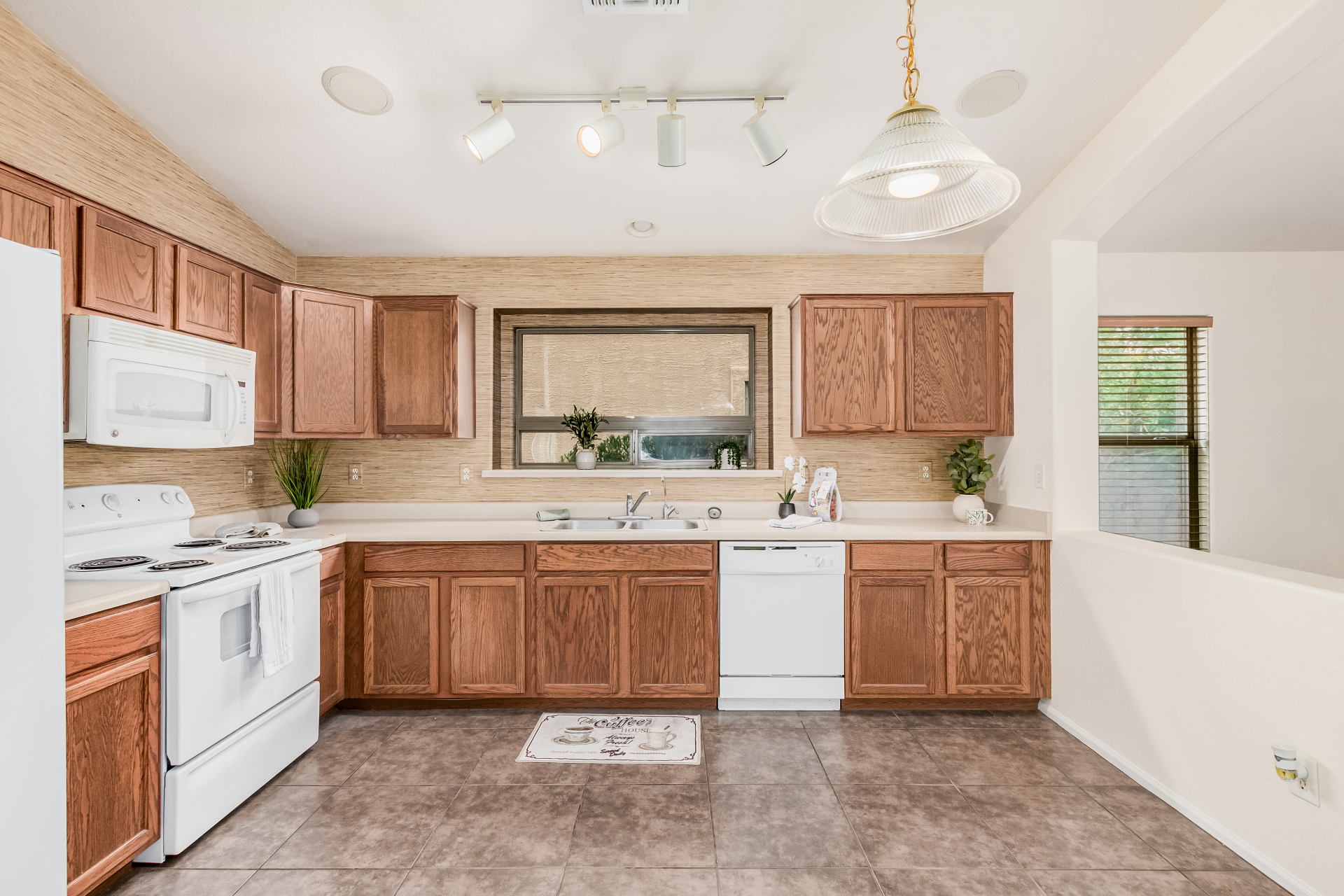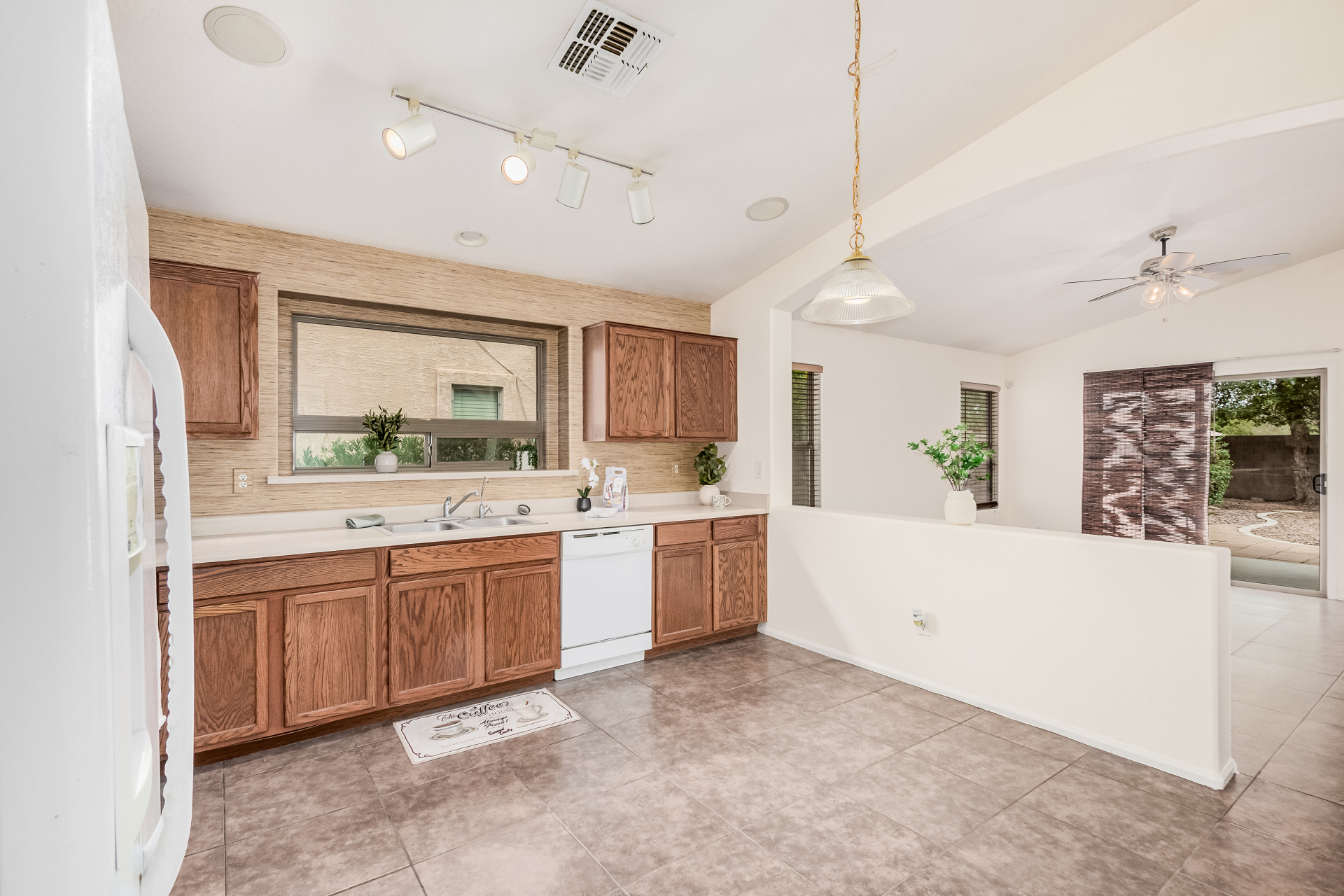 Welcome to Homestead North, where this charming single-level home awaits you! Providing 3 beds, 2 baths, 2-car garage, & a low-care landscape. inviting interior showcases vaulted ceilings, neutral palette, tons of natural light, tile & wood-look floors in common areas, and soft carpet in bedrooms. Featuring a formal living & dining room and a separate family room, this gem offers versatile spaces for gatherings. With surround sound, this gem is ready to elevate your entertainment experience. The kitchen has white matching appliances, track lighting, a pantry, ample wood cabinetry, and a breakfast nook. Enter the main bedroom to find a walk-in closet and an ensuite with dual sinks. The spacious backyard boasts shade trees and a covered patio for relaxing or enjoying BBQ.