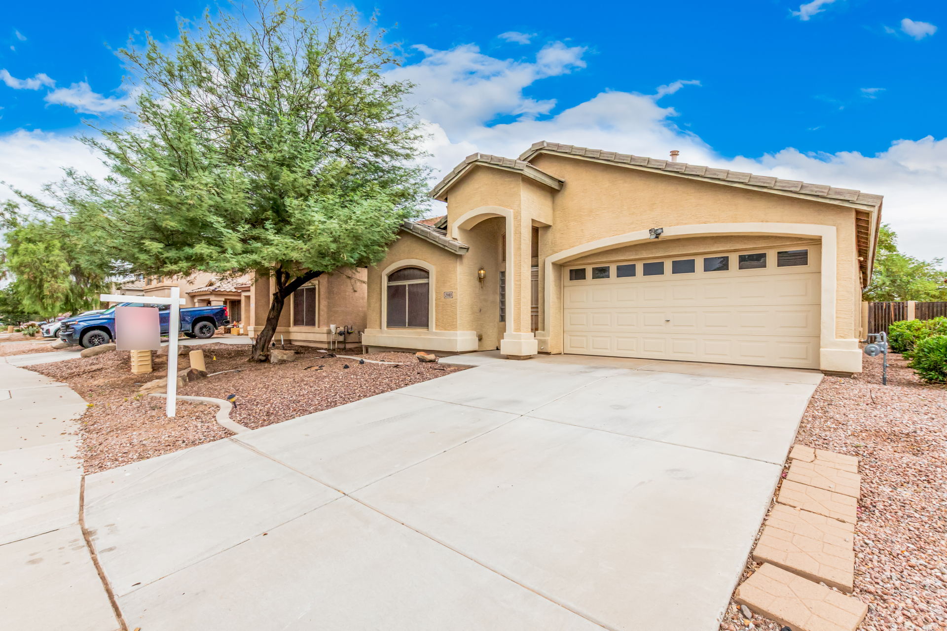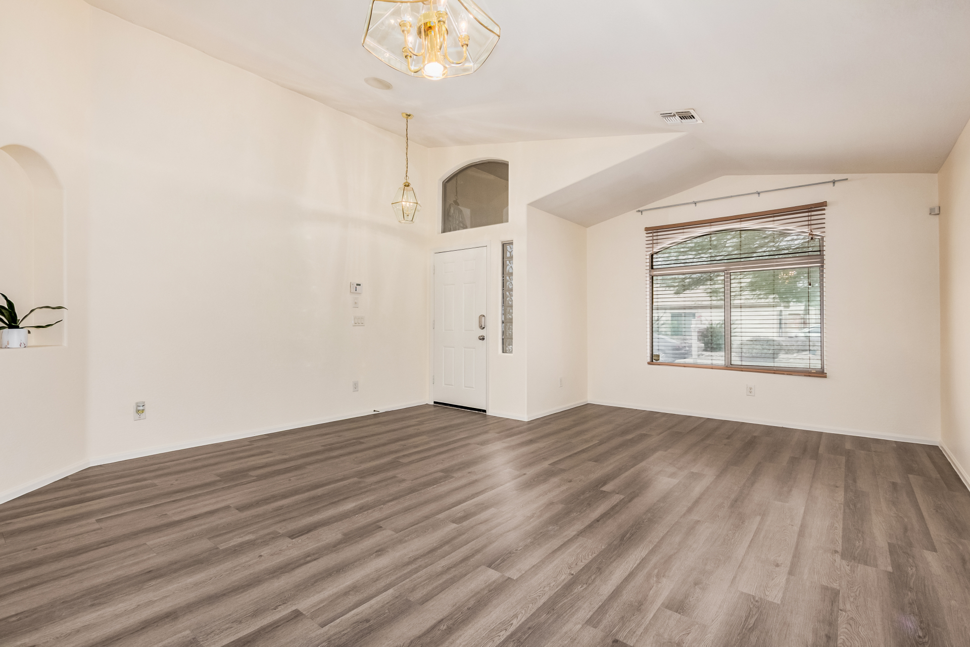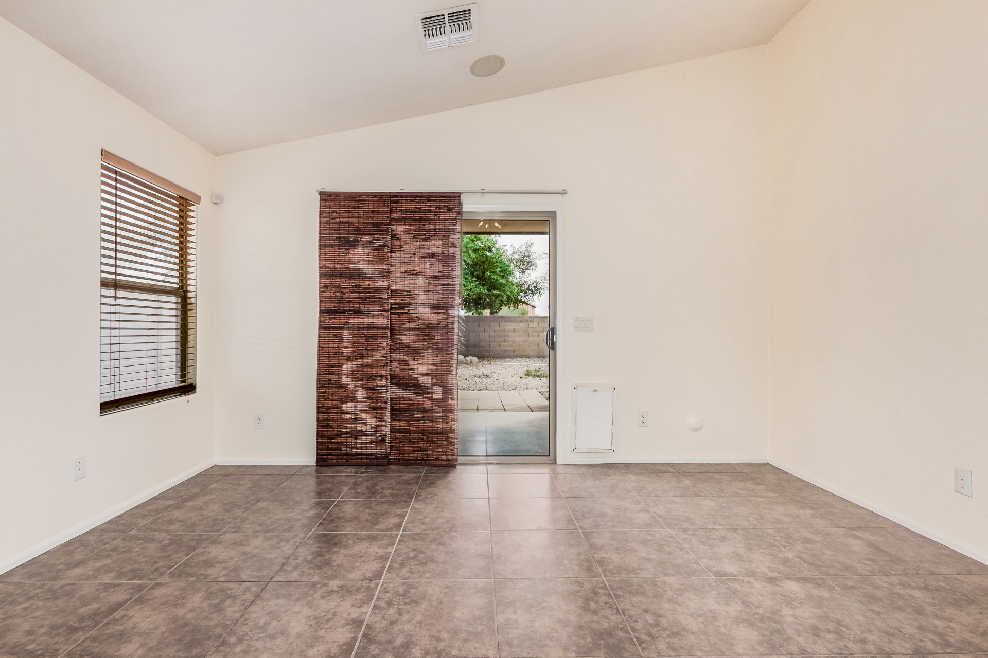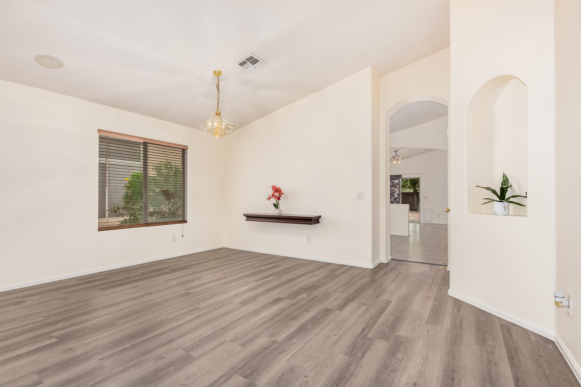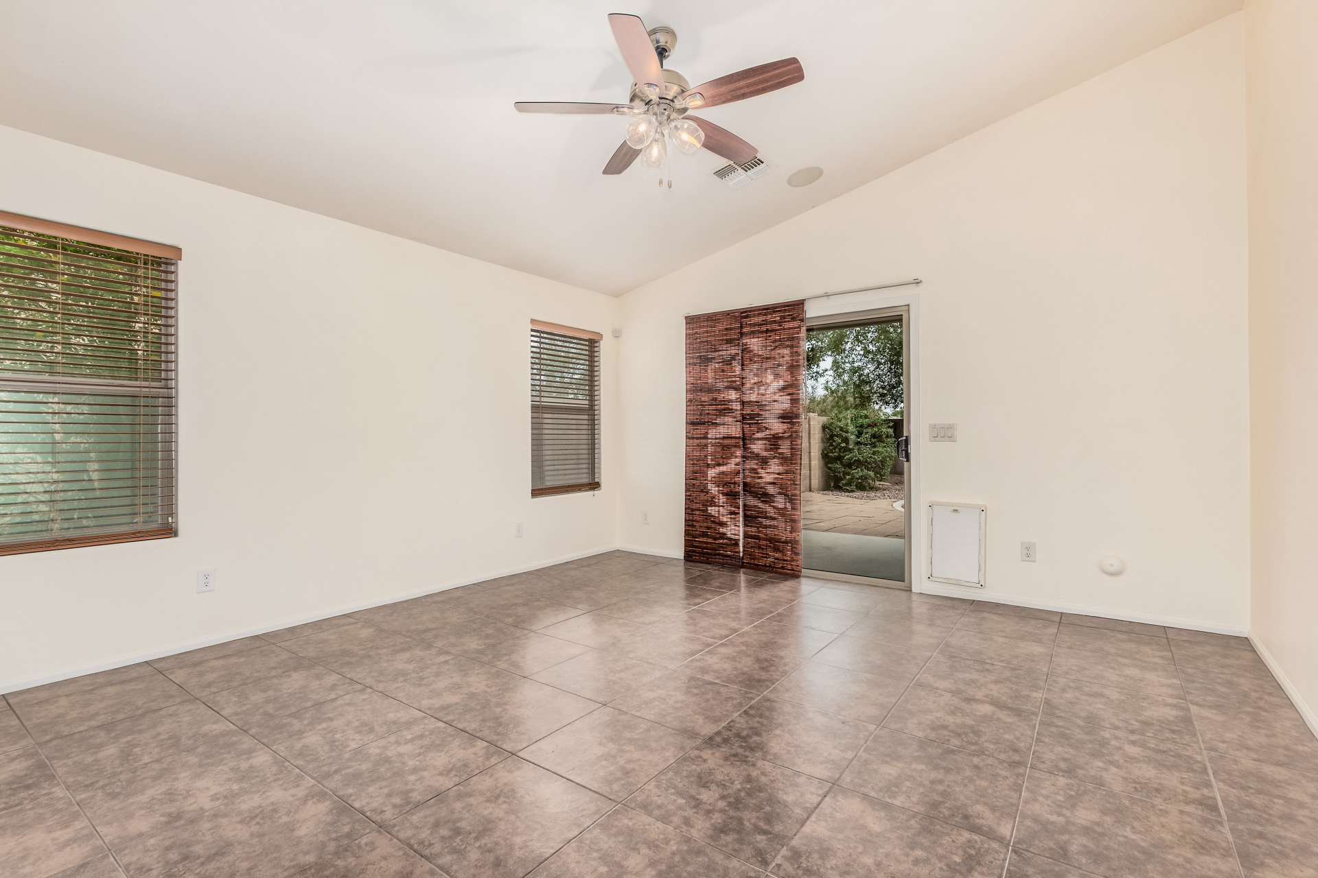 Welcome to Homestead North, where this charming single-level home awaits you! Providing 3 beds, 2 baths, 2-car garage, & a low-care landscape. inviting interior showcases vaulted ceilings, neutral palette, tons of natural light, tile & wood-look floors in common areas, and soft carpet in bedrooms. Featuring a formal living & dining room and a separate family room, this gem offers versatile spaces for gatherings. With surround sound, this gem is ready to elevate your entertainment experience. The kitchen has white matching appliances, track lighting, a pantry, ample wood cabinetry, and a breakfast nook. Enter the main bedroom to find a walk-in closet and an ensuite with dual sinks. The spacious backyard boasts shade trees and a covered patio for relaxing or enjoying BBQ.