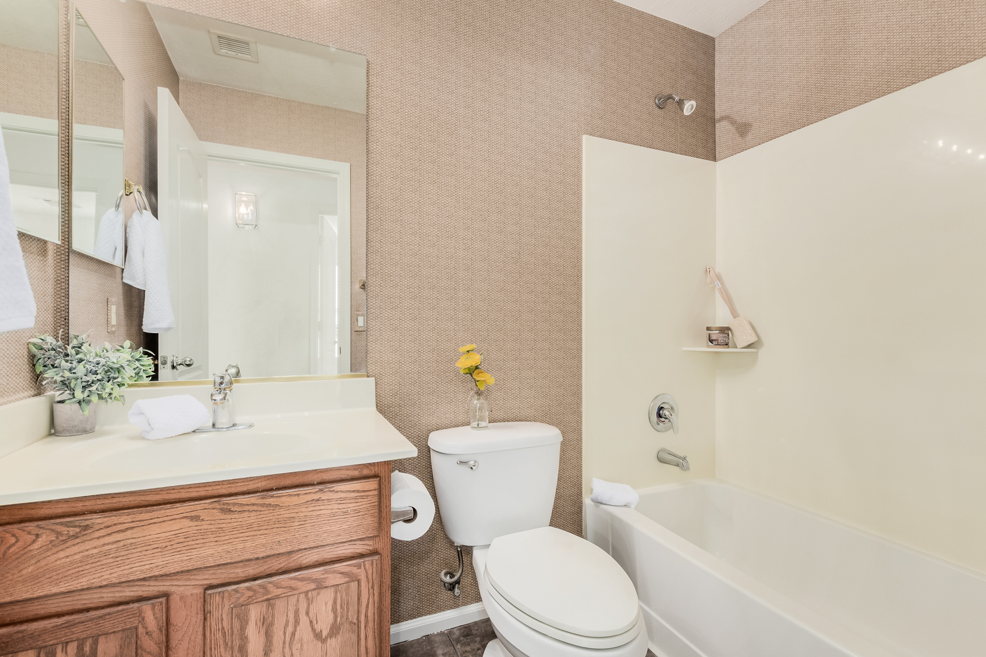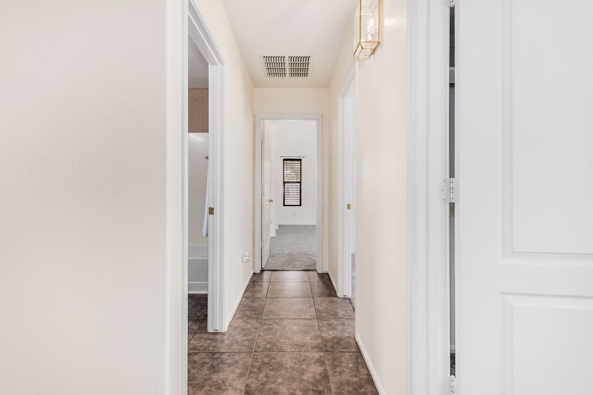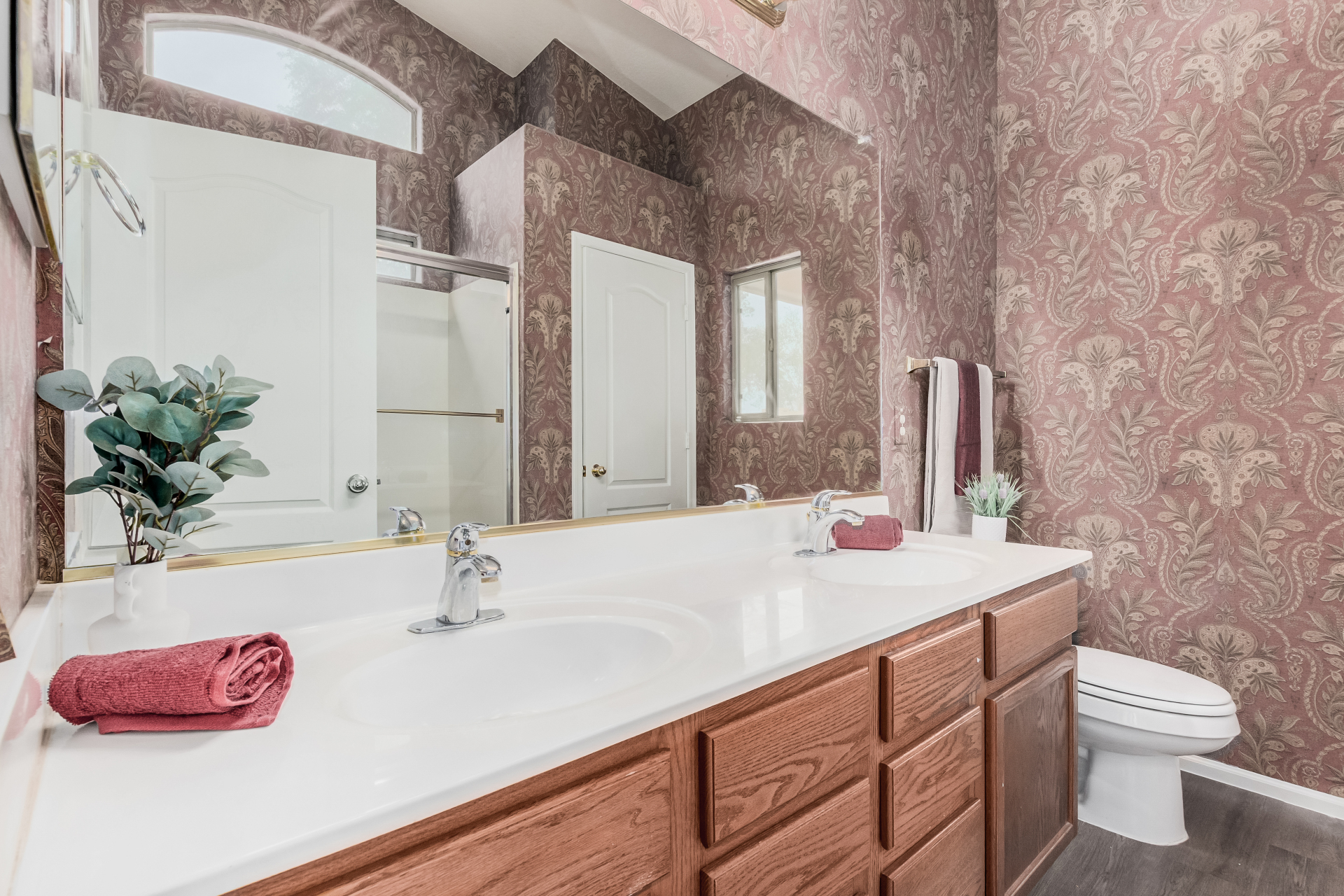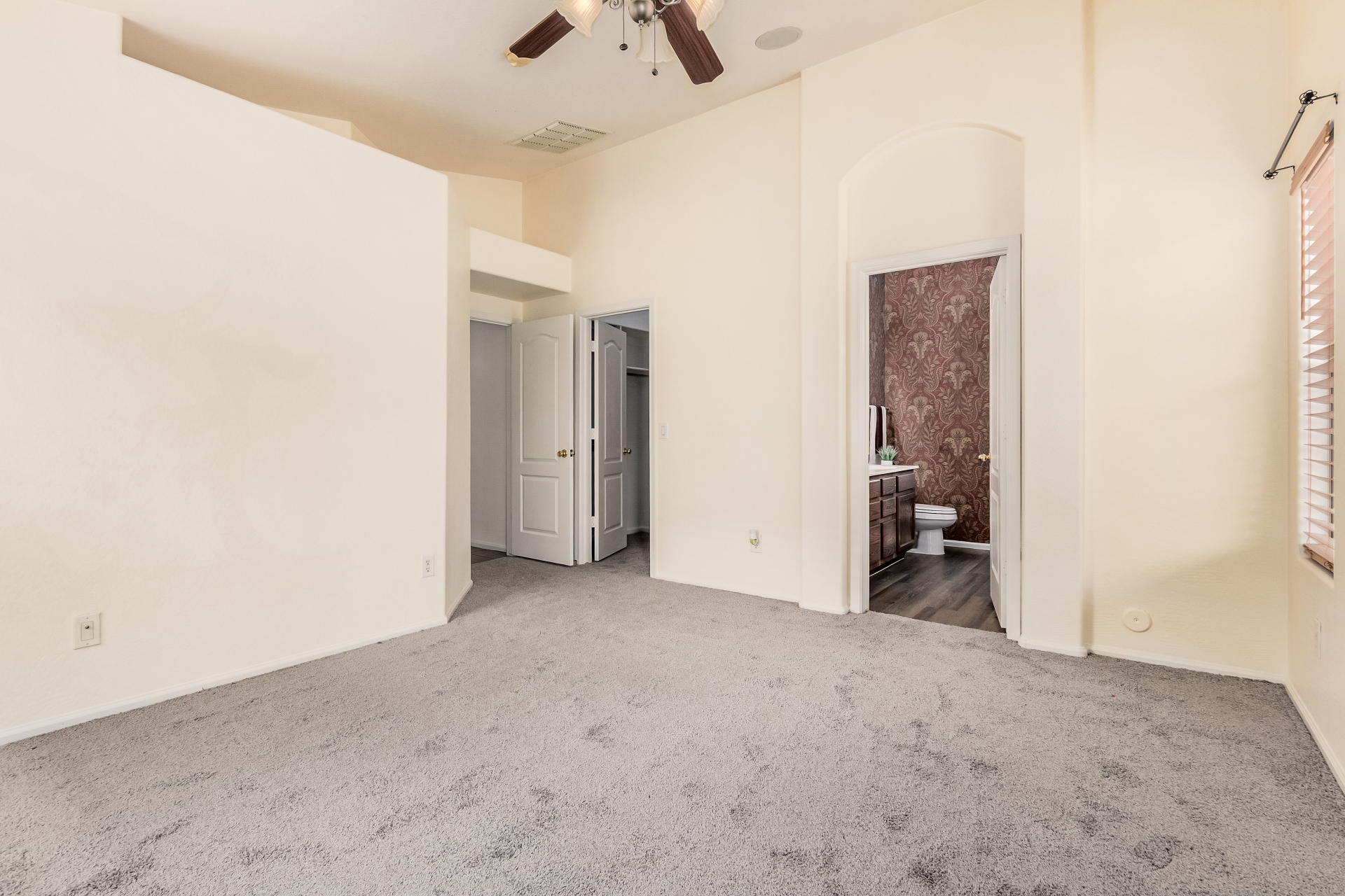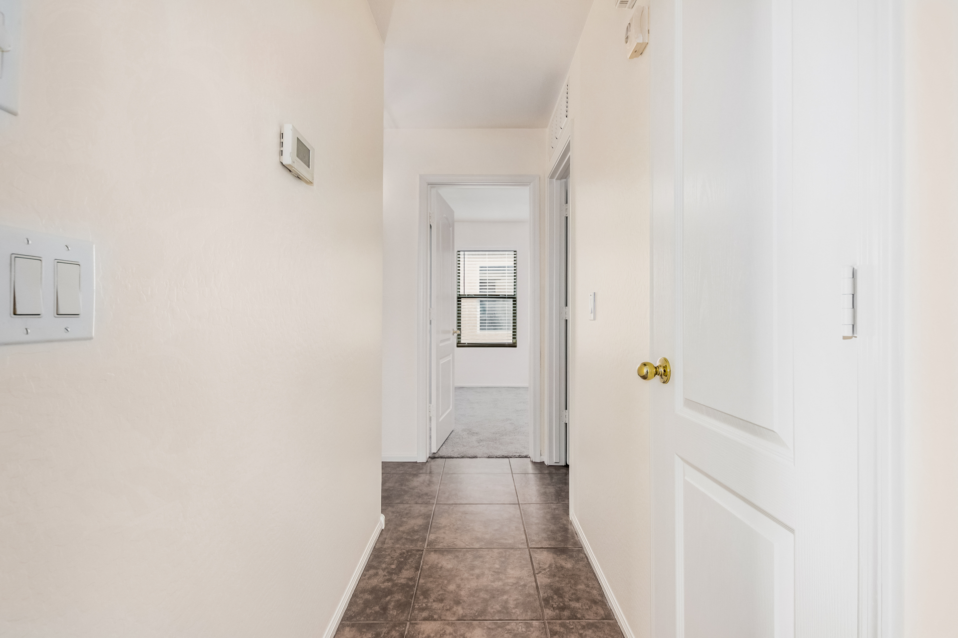 Welcome to Homestead North, where this charming single-level home awaits you! Providing 3 beds, 2 baths, 2-car garage, & a low-care landscape. inviting interior showcases vaulted ceilings, neutral palette, tons of natural light, tile & wood-look floors in common areas, and soft carpet in bedrooms. Featuring a formal living & dining room and a separate family room, this gem offers versatile spaces for gatherings. With surround sound, this gem is ready to elevate your entertainment experience. The kitchen has white matching appliances, track lighting, a pantry, ample wood cabinetry, and a breakfast nook. Enter the main bedroom to find a walk-in closet and an ensuite with dual sinks. The spacious backyard boasts shade trees and a covered patio for relaxing or enjoying BBQ.