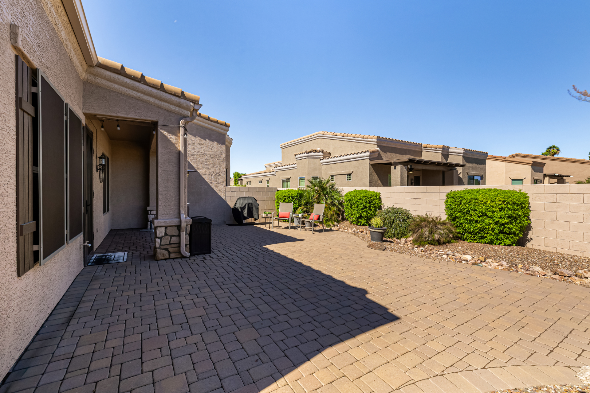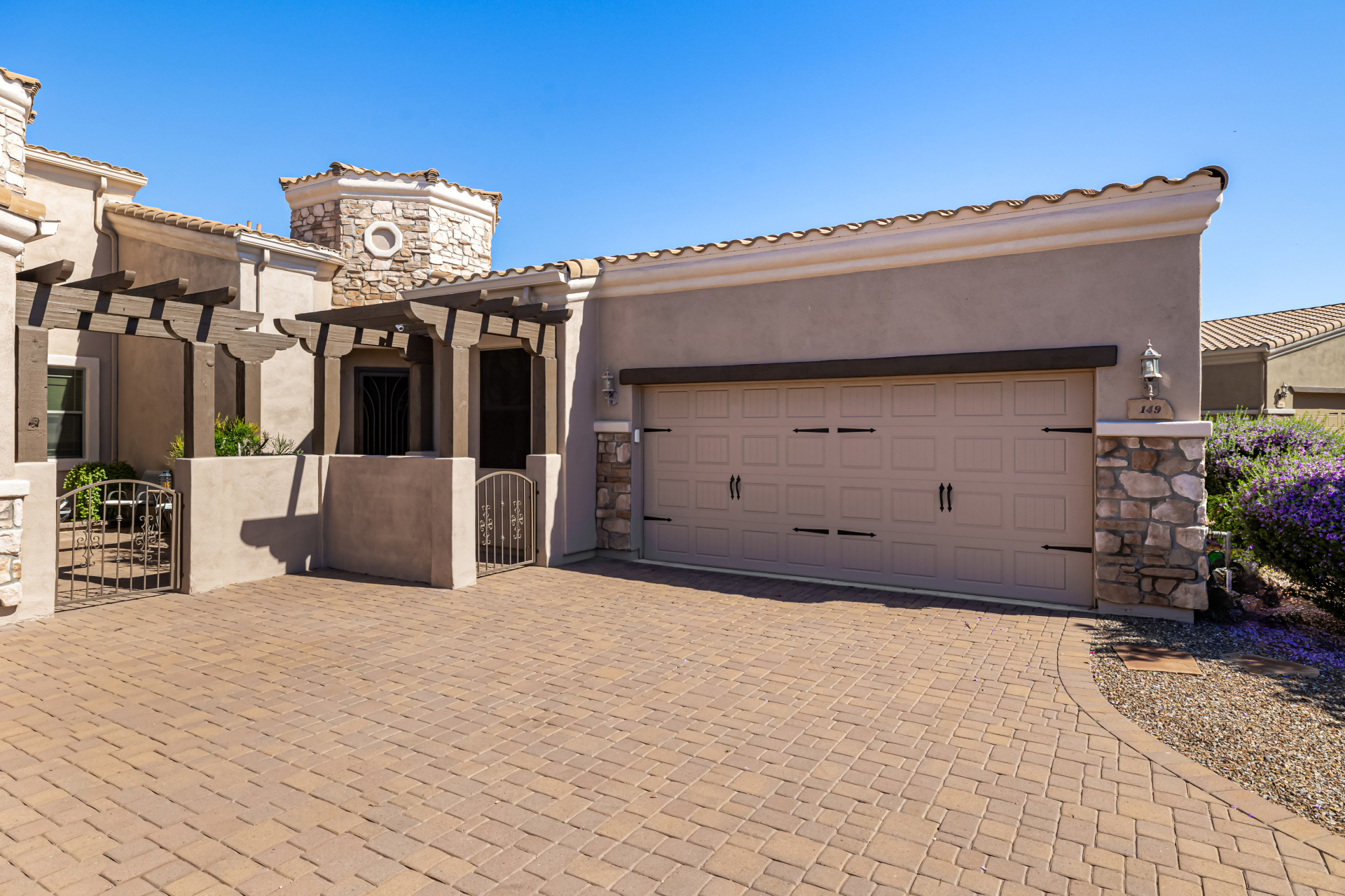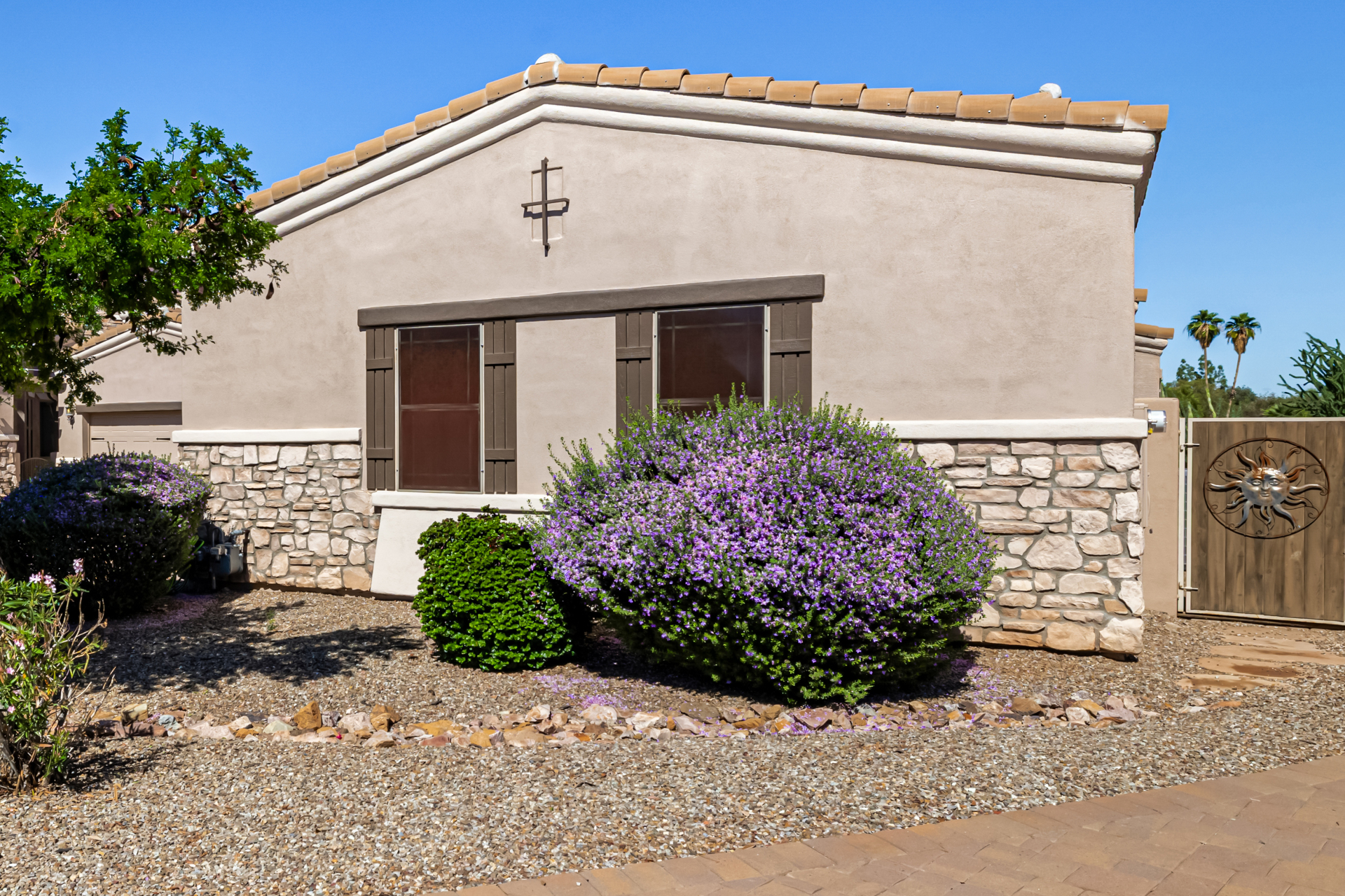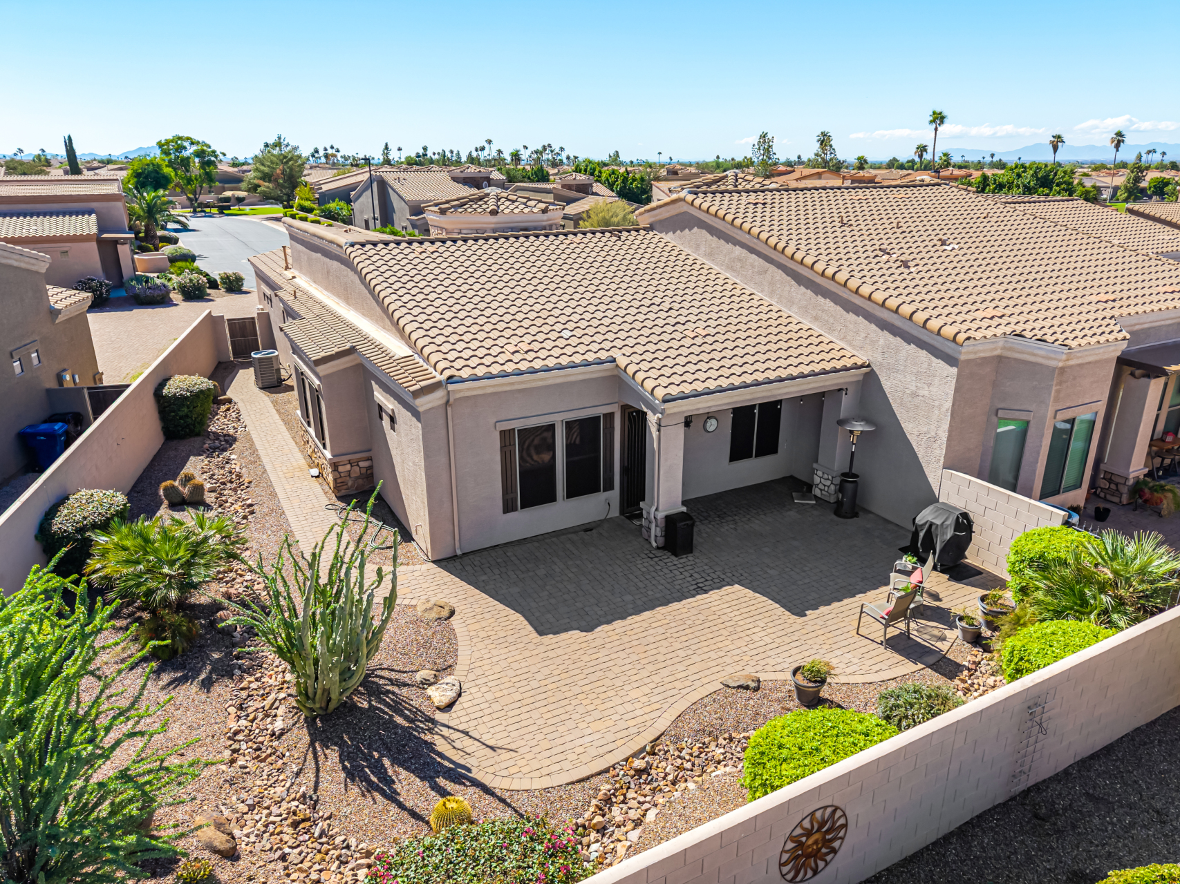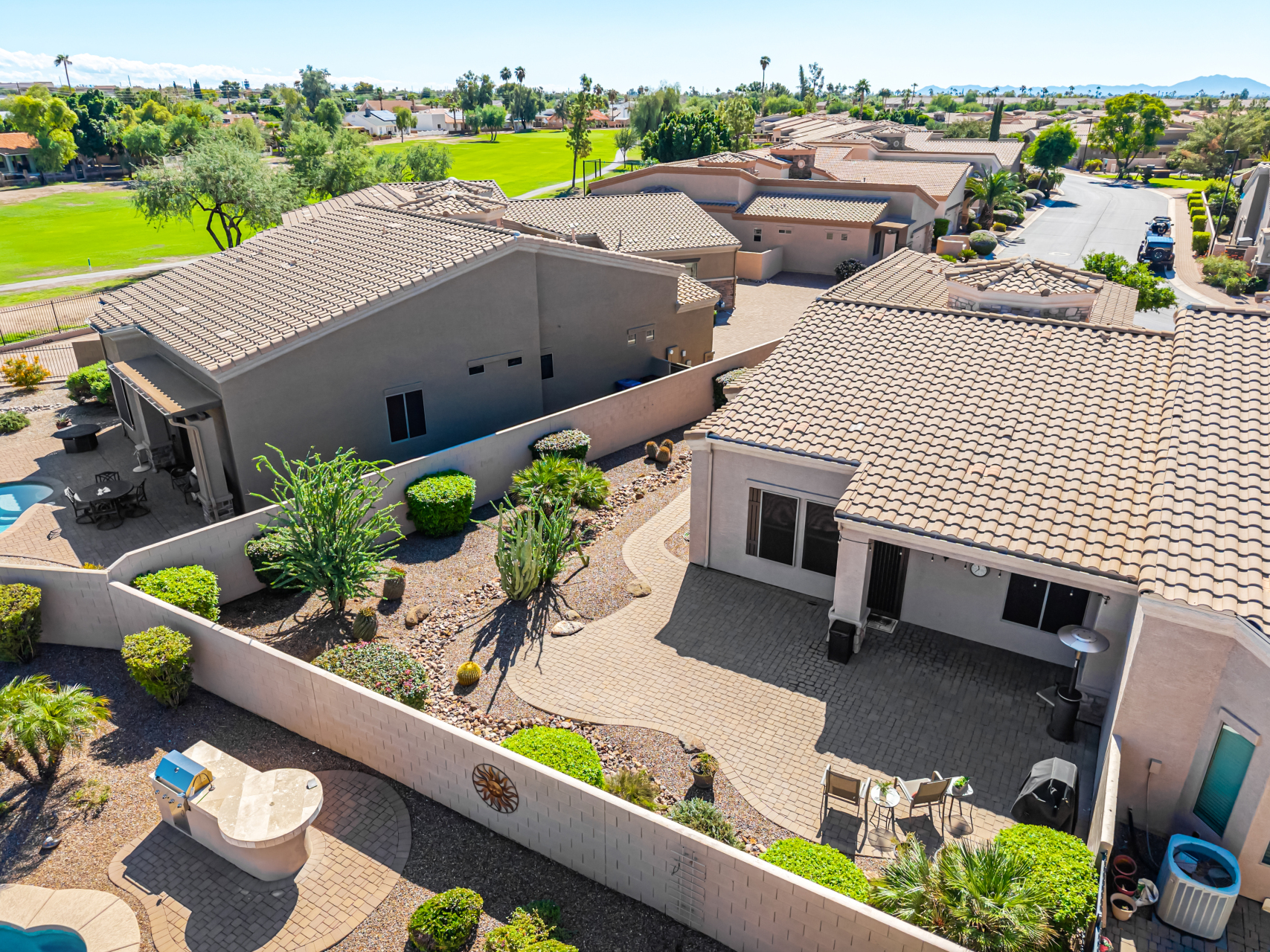 Welcome to Tuscany Villas a carefree gated golf course community perfectly situated in NE Mesa's prime location. This exceptional 1,633 sq. ft. villa offers desirable north/south exposure and is available turn-key for a truly effortless move-in experience. This 2-bedroom, 2-bath home showcases pride of ownership throughout. Enter through a private courtyard with custom metal security doors on both front and back. Inside, enjoy an abundance of natural light and an open, flowing floor plan. The kitchen features maple cabinetry, granite countertops, and a prep island, opening to both an informal dining area and a formal dining space.The spacious great room is ideal for relaxing evenings or entertaining guests. Designer upgrades include updated light fixtures and ceiling fans custom window treatments and interior paint.