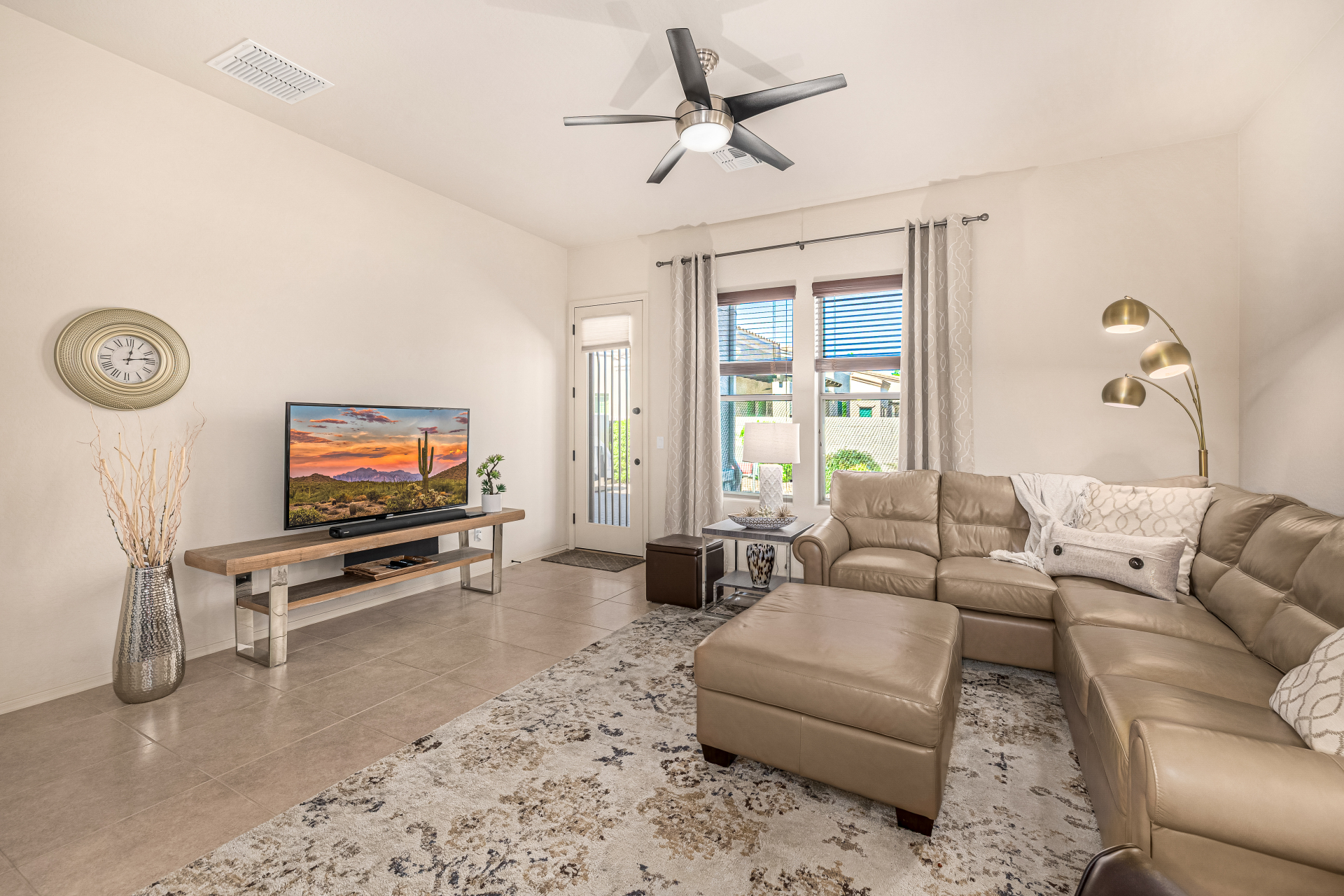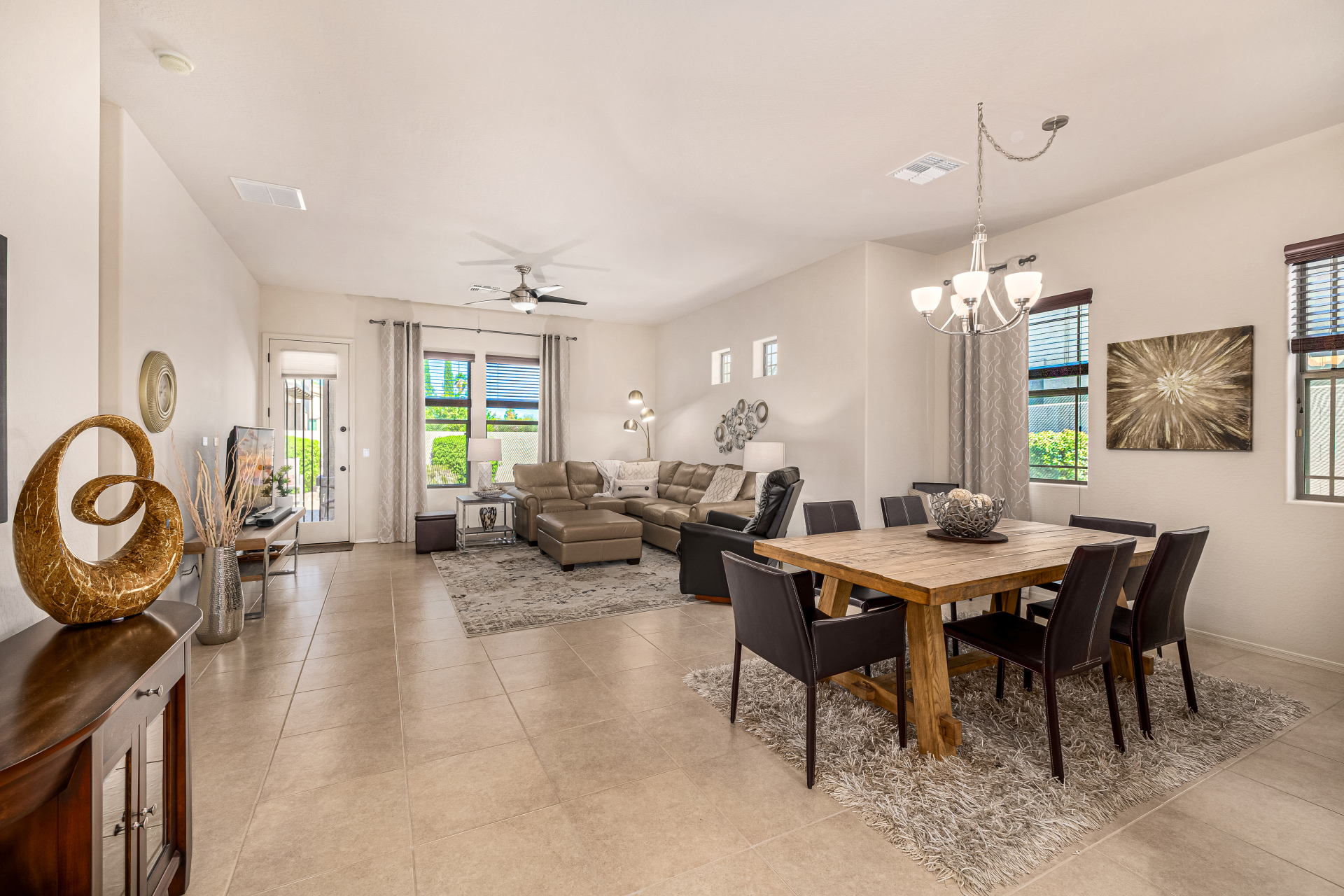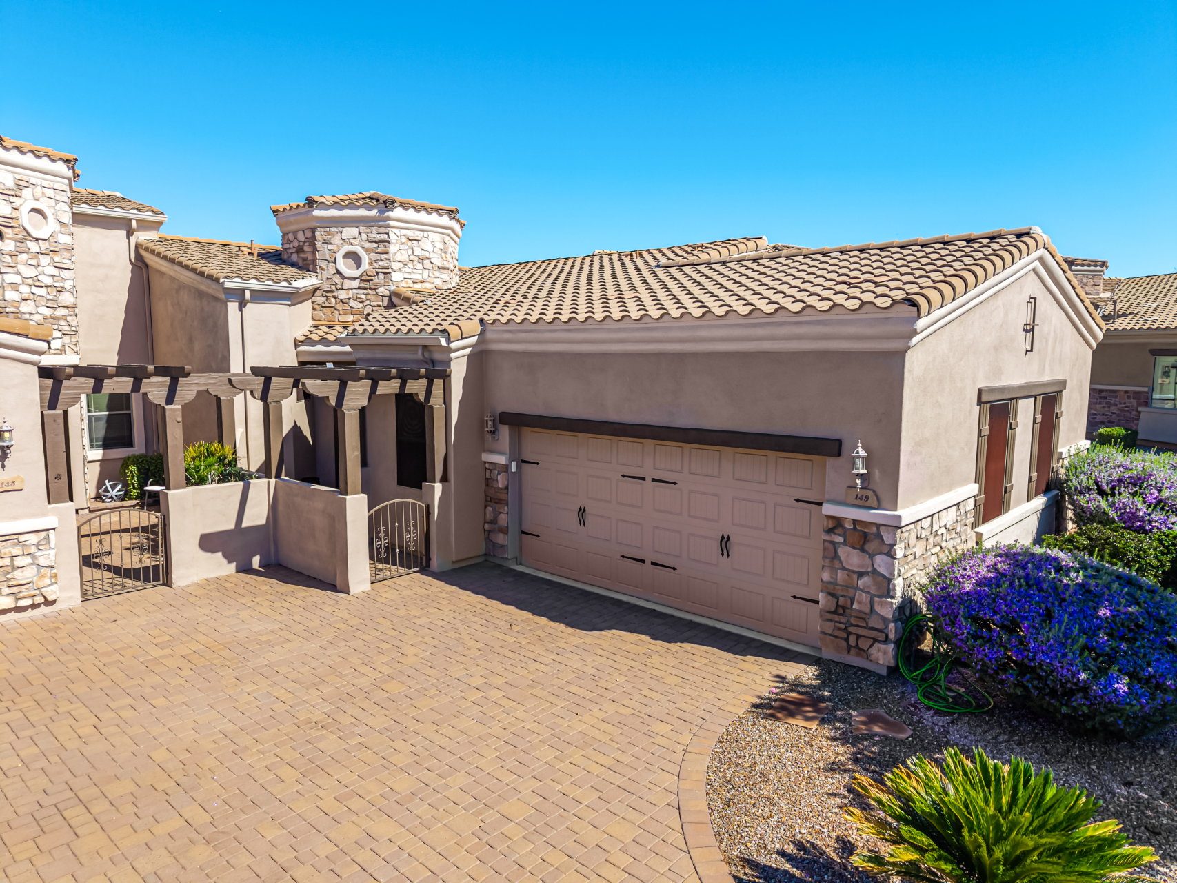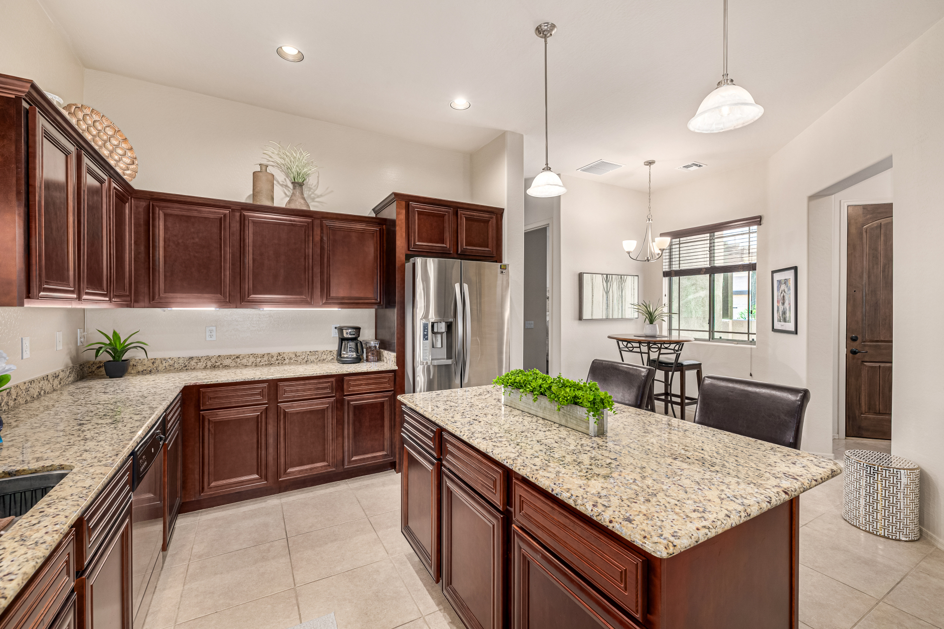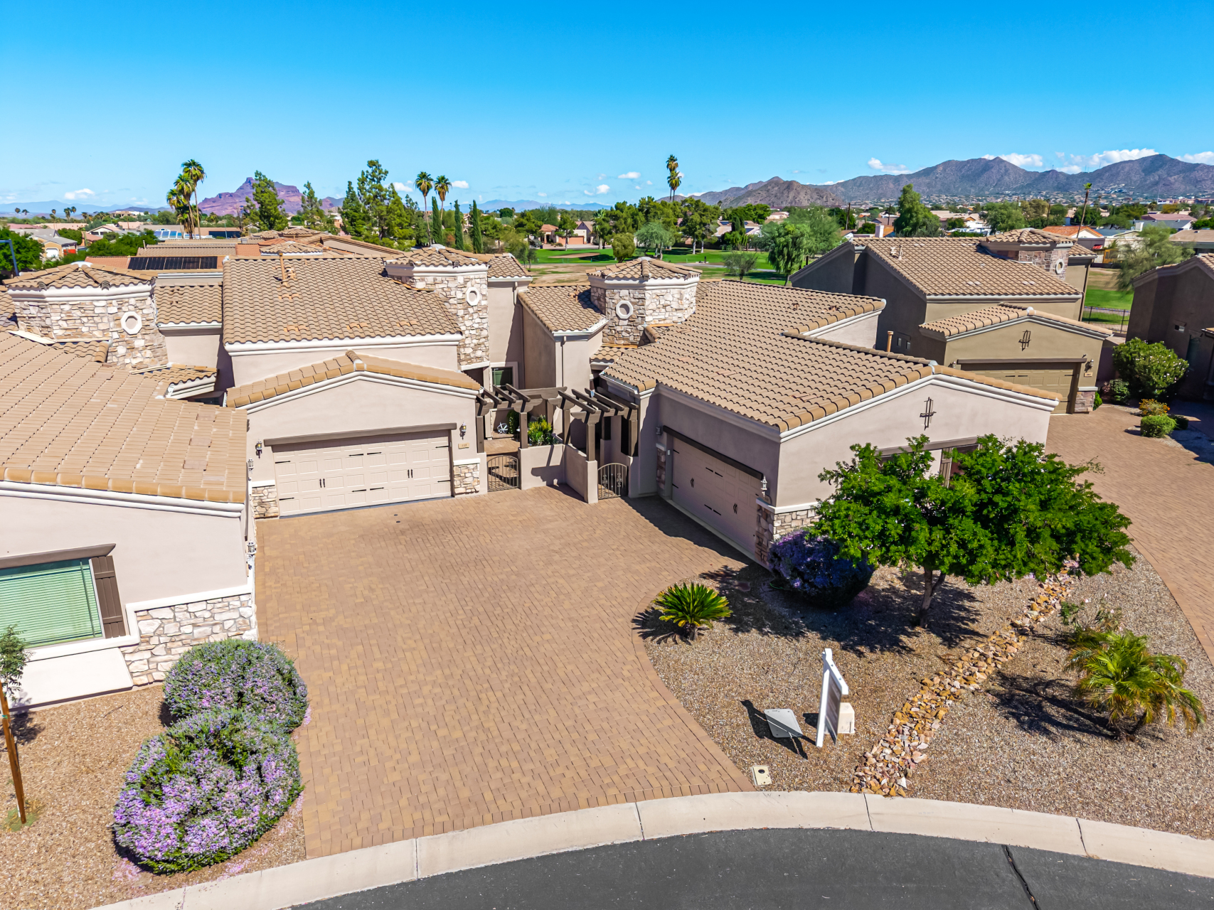Welcome to Tuscany Villas a carefree gated golf course community perfectly situated in NE Mesa's prime location. This exceptional 1,633 sq. ft. villa offers desirable north/south exposure and is available turn-key for a truly effortless move-in experience. This 2-bedroom, 2-bath home showcases pride of ownership throughout. Enter through a private courtyard with custom metal security doors on both front and back. Inside, enjoy an abundance of natural light and an open, flowing floor plan. The kitchen features maple cabinetry, granite countertops, and a prep island, opening to both an informal dining area and a formal dining space.The spacious great room is ideal for relaxing evenings or entertaining guests. Designer upgrades include updated light fixtures and ceiling fans custom window treatments and interior paint.