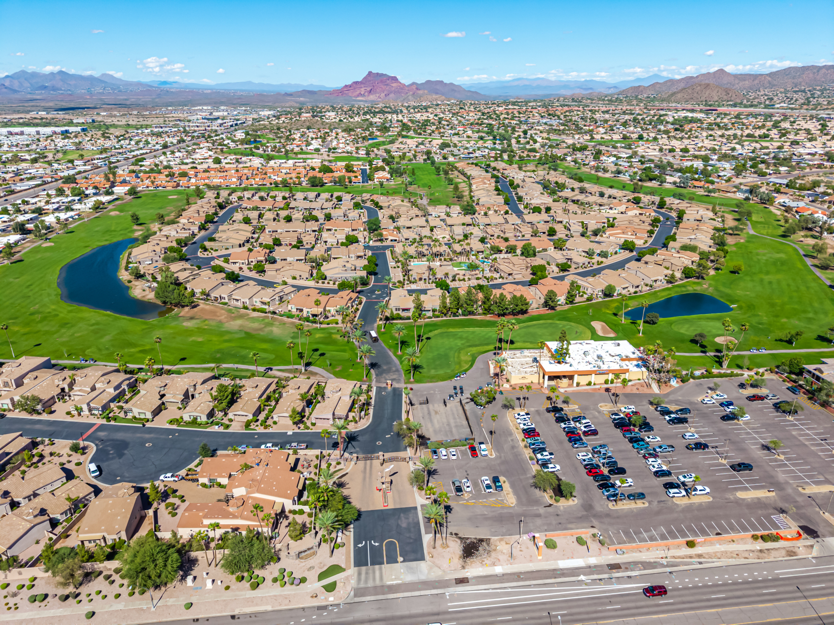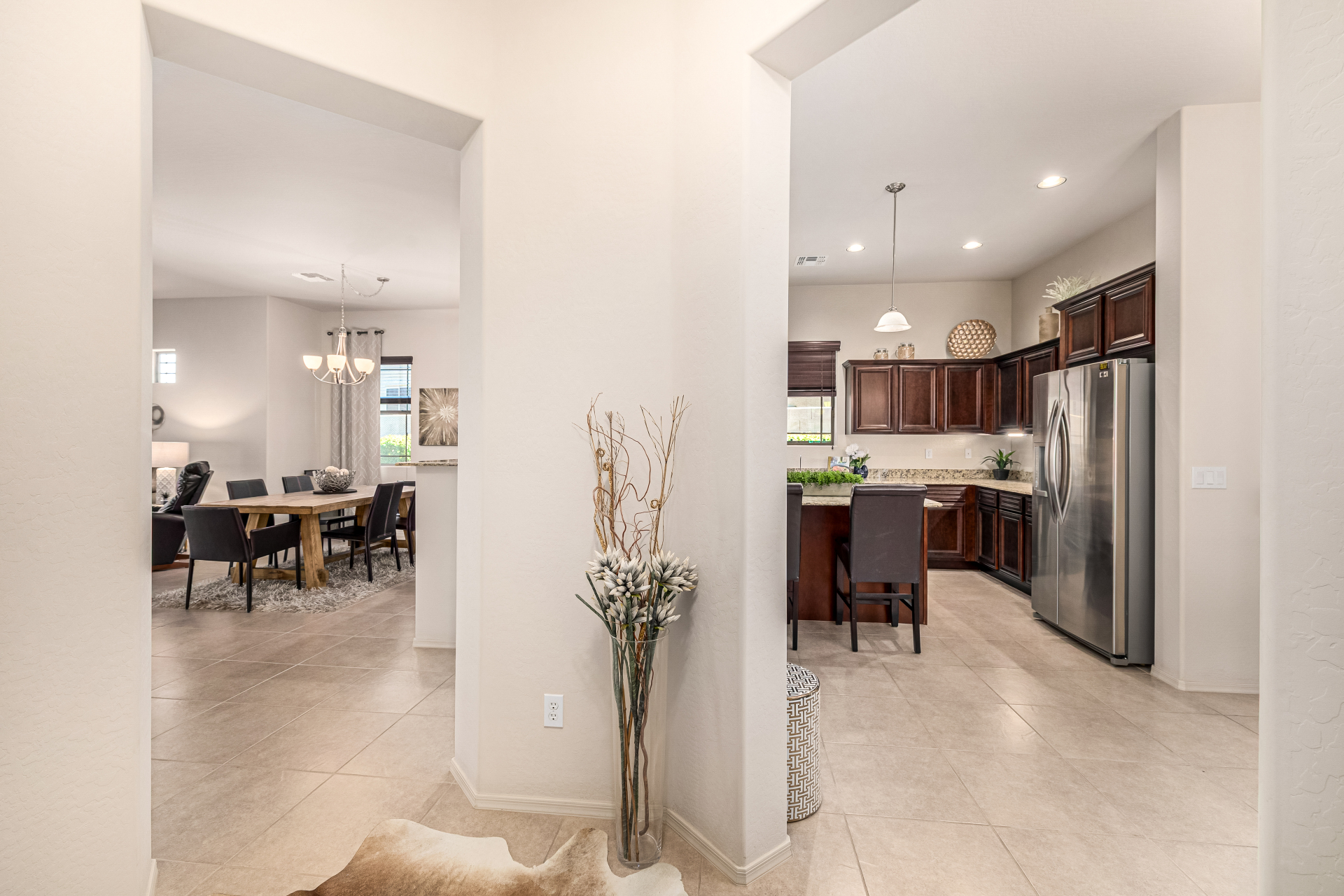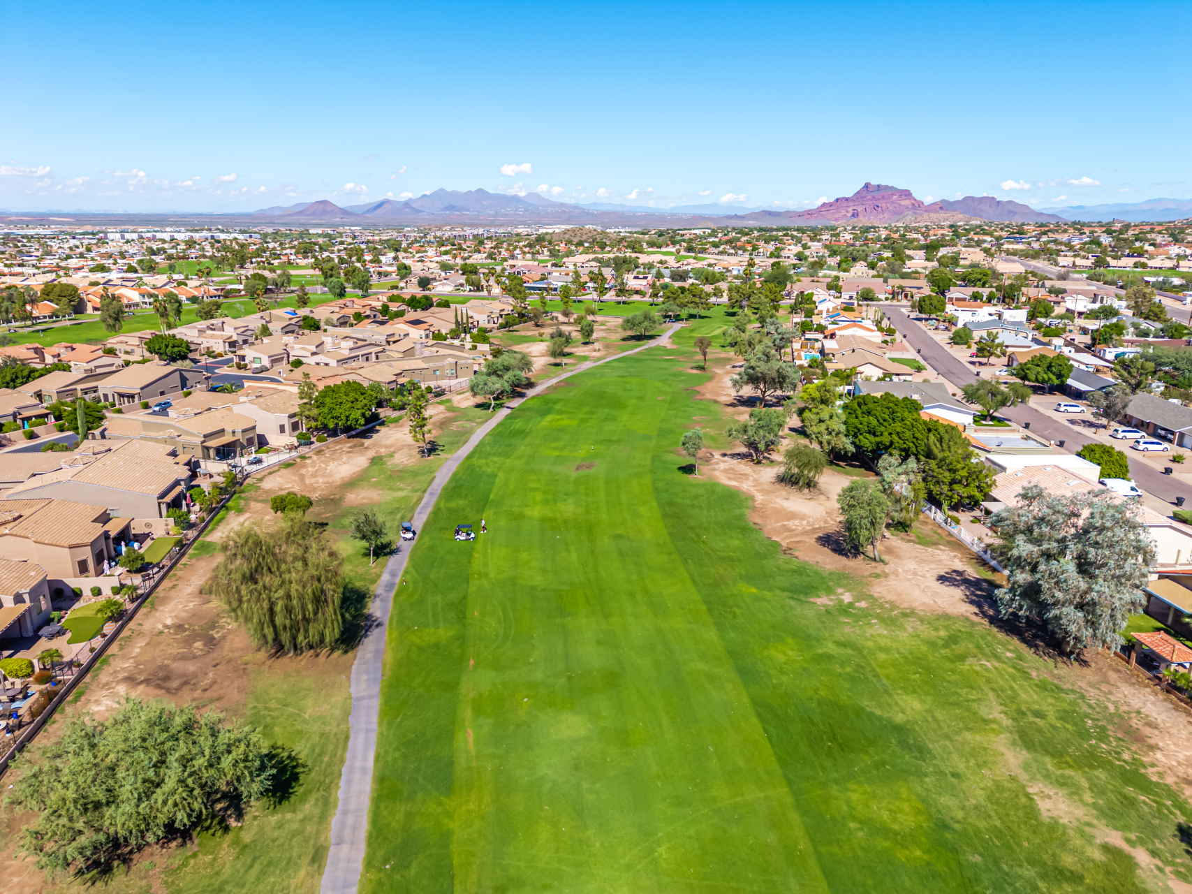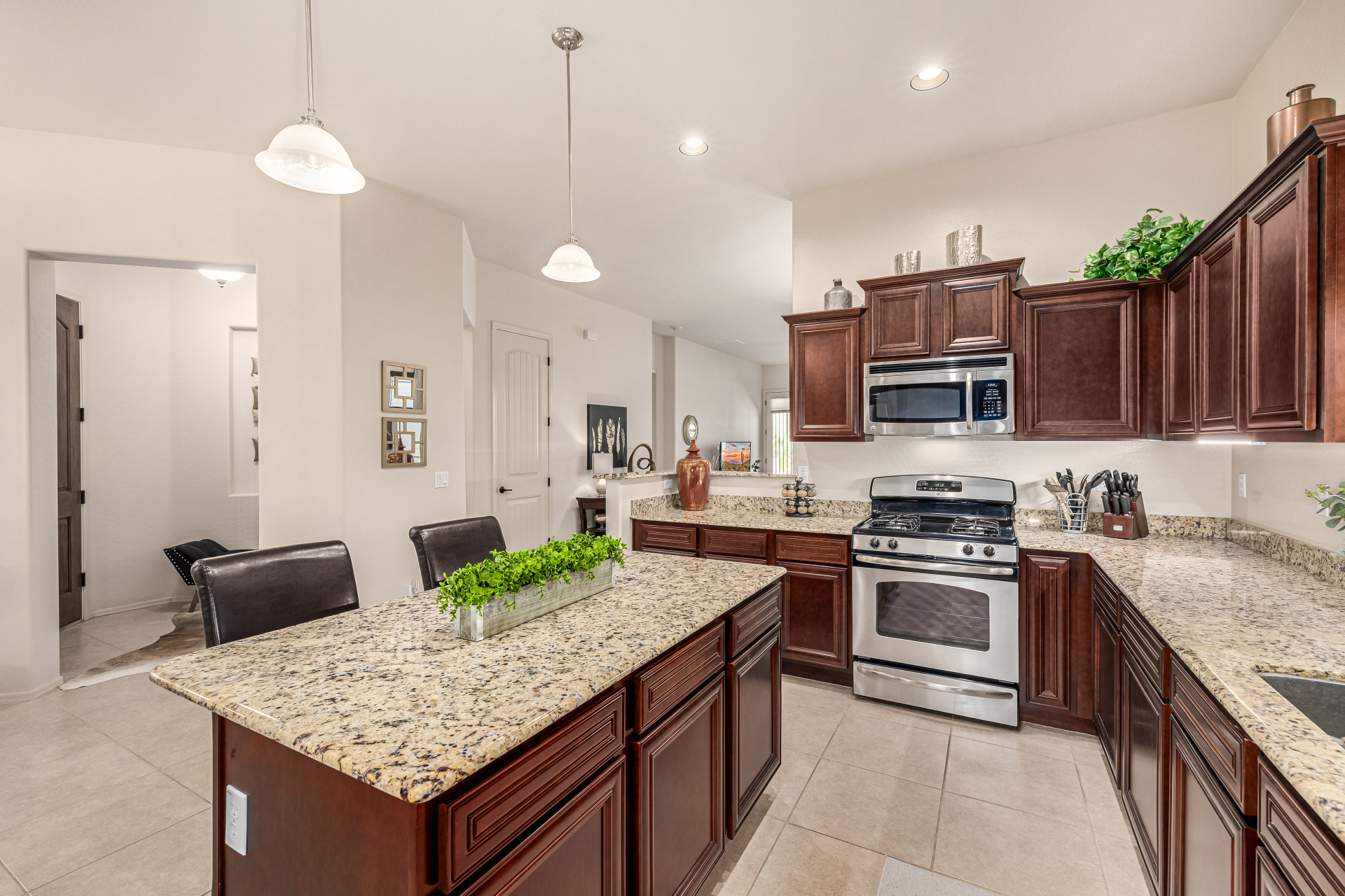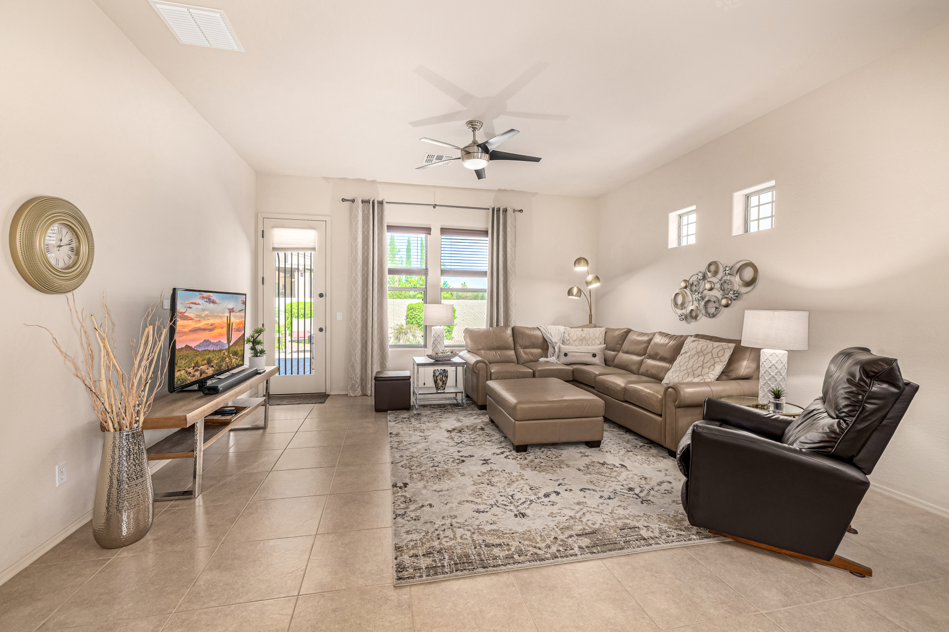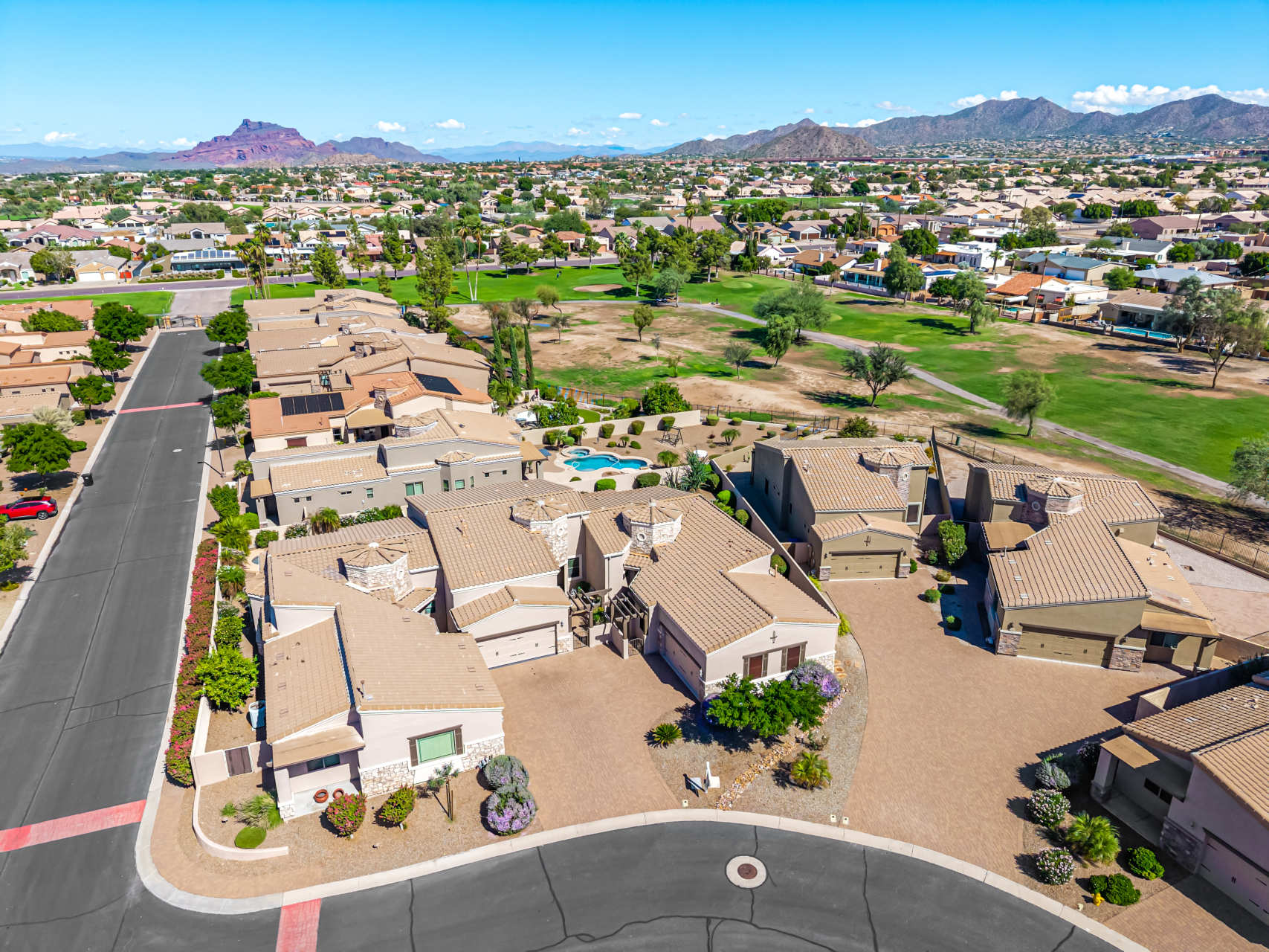 Welcome to Tuscany Villas a carefree gated golf course community perfectly situated in NE Mesa's prime location. This exceptional 1,633 sq. ft. villa offers desirable north/south exposure and is available turn-key for a truly effortless move-in experience. This 2-bedroom, 2-bath home showcases pride of ownership throughout. Enter through a private courtyard with custom metal security doors on both front and back. Inside, enjoy an abundance of natural light and an open, flowing floor plan. The kitchen features maple cabinetry, granite countertops, and a prep island, opening to both an informal dining area and a formal dining space.The spacious great room is ideal for relaxing evenings or entertaining guests. Designer upgrades include updated light fixtures and ceiling fans custom window treatments and interior paint.