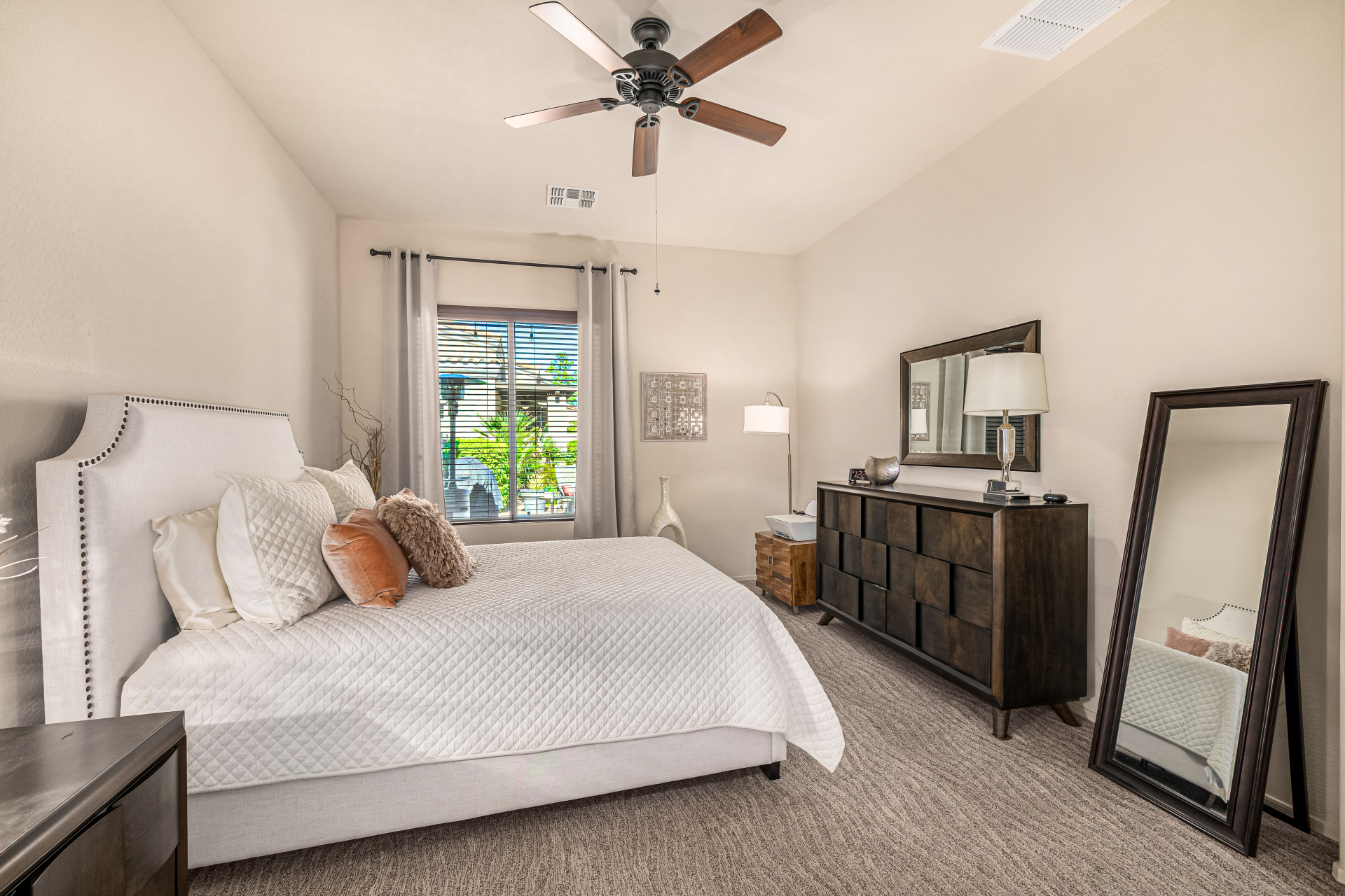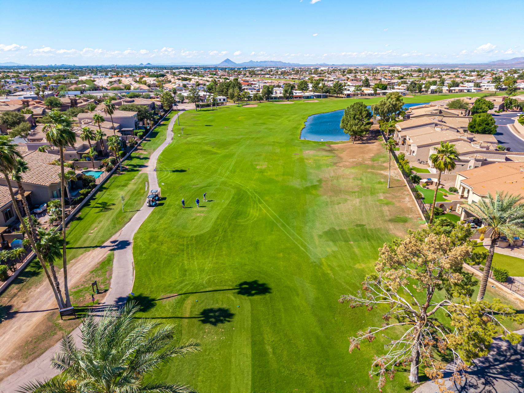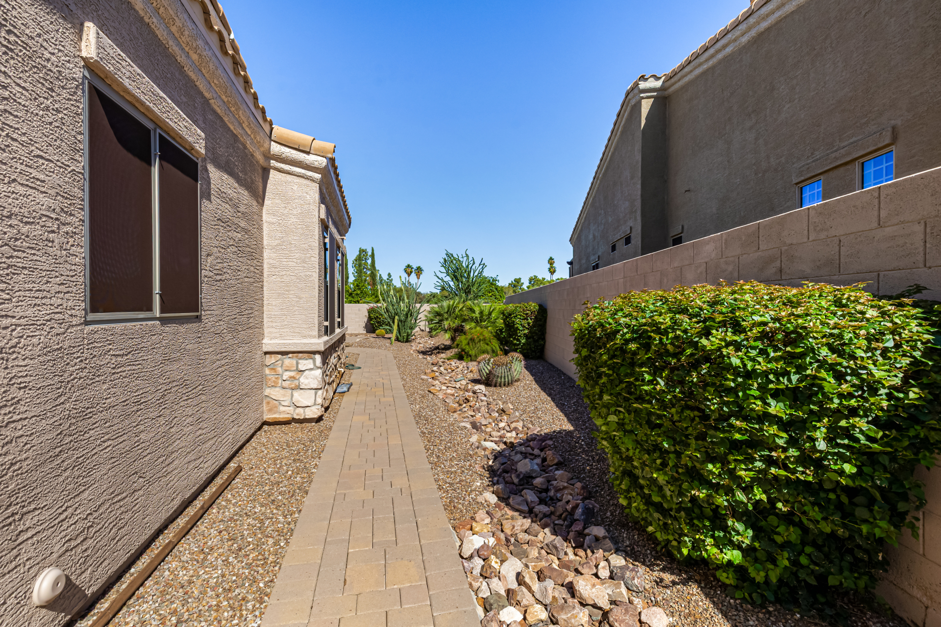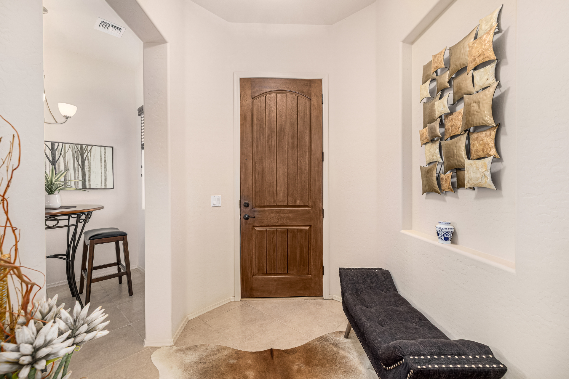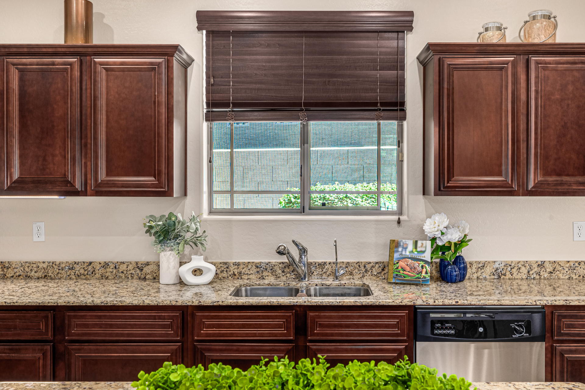 Welcome to Tuscany Villas a carefree gated golf course community perfectly situated in NE Mesa's prime location. This exceptional 1,633 sq. ft. villa offers desirable north/south exposure and is available turn-key for a truly effortless move-in experience. This 2-bedroom, 2-bath home showcases pride of ownership throughout. Enter through a private courtyard with custom metal security doors on both front and back. Inside, enjoy an abundance of natural light and an open, flowing floor plan. The kitchen features maple cabinetry, granite countertops, and a prep island, opening to both an informal dining area and a formal dining space.The spacious great room is ideal for relaxing evenings or entertaining guests. Designer upgrades include updated light fixtures and ceiling fans custom window treatments and interior paint.