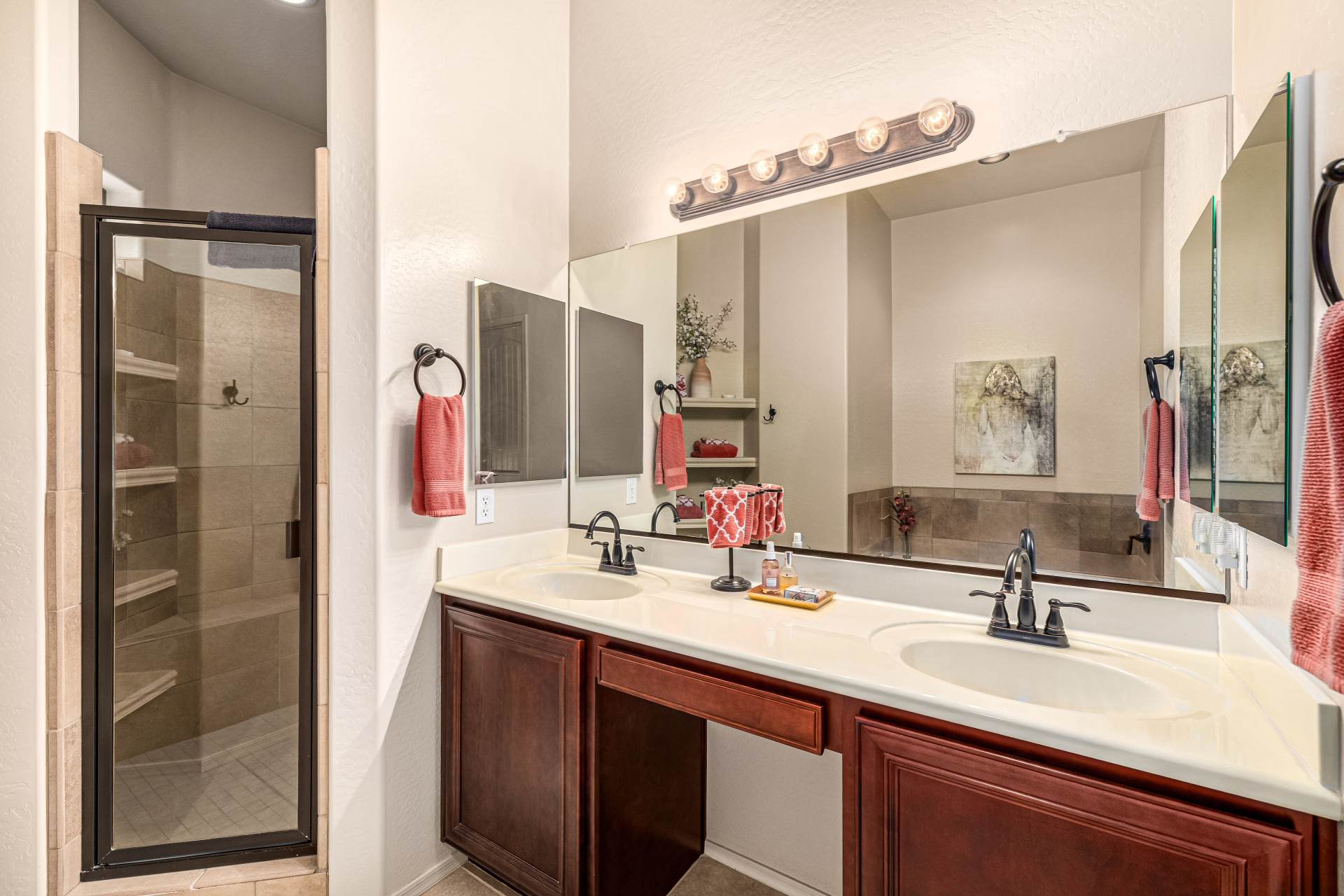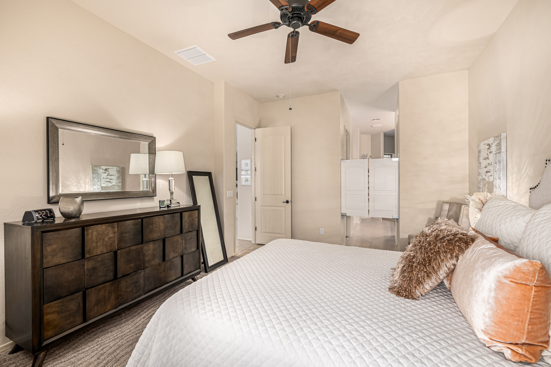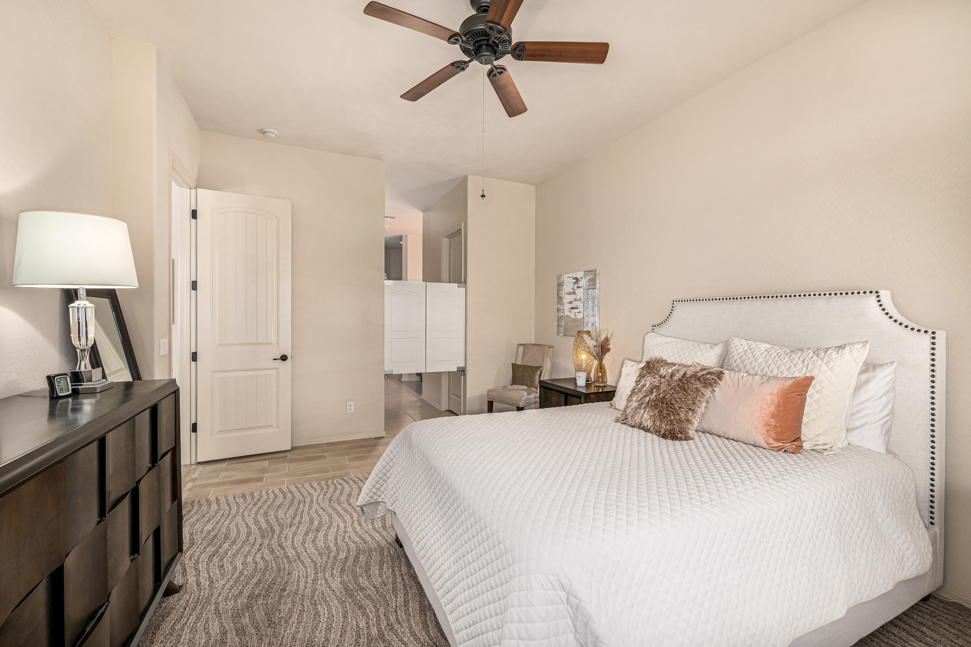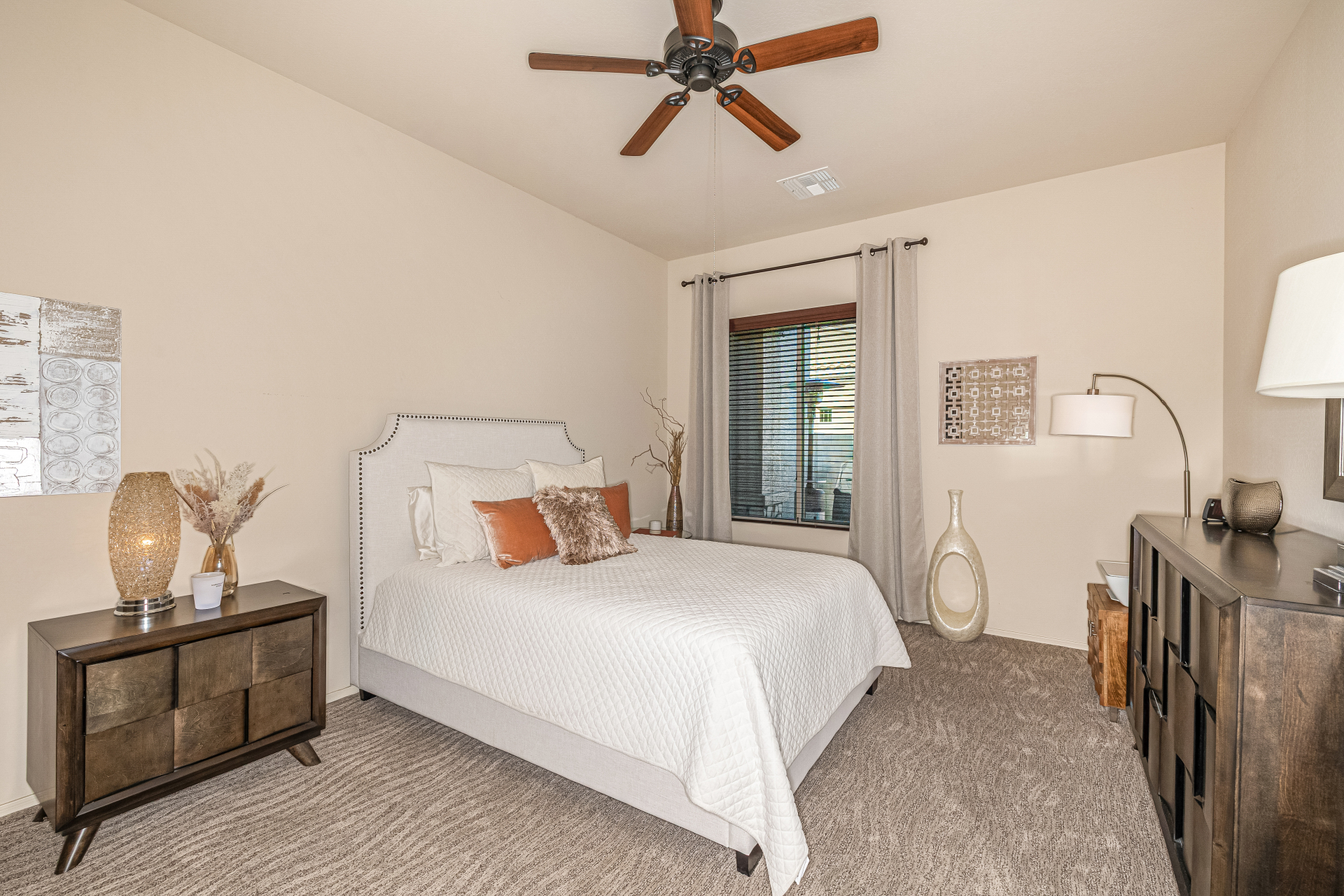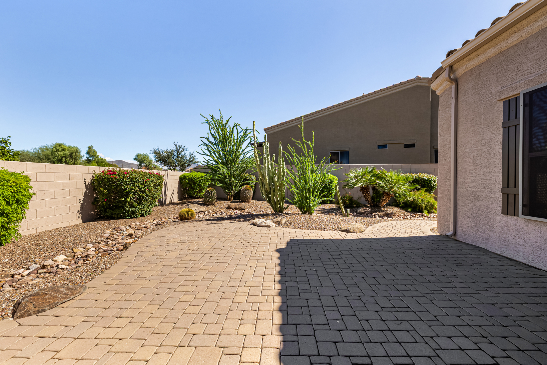 Welcome to Tuscany Villas a carefree gated golf course community perfectly situated in NE Mesa's prime location. This exceptional 1,633 sq. ft. villa offers desirable north/south exposure and is available turn-key for a truly effortless move-in experience. This 2-bedroom, 2-bath home showcases pride of ownership throughout. Enter through a private courtyard with custom metal security doors on both front and back. Inside, enjoy an abundance of natural light and an open, flowing floor plan. The kitchen features maple cabinetry, granite countertops, and a prep island, opening to both an informal dining area and a formal dining space.The spacious great room is ideal for relaxing evenings or entertaining guests. Designer upgrades include updated light fixtures and ceiling fans custom window treatments and interior paint.