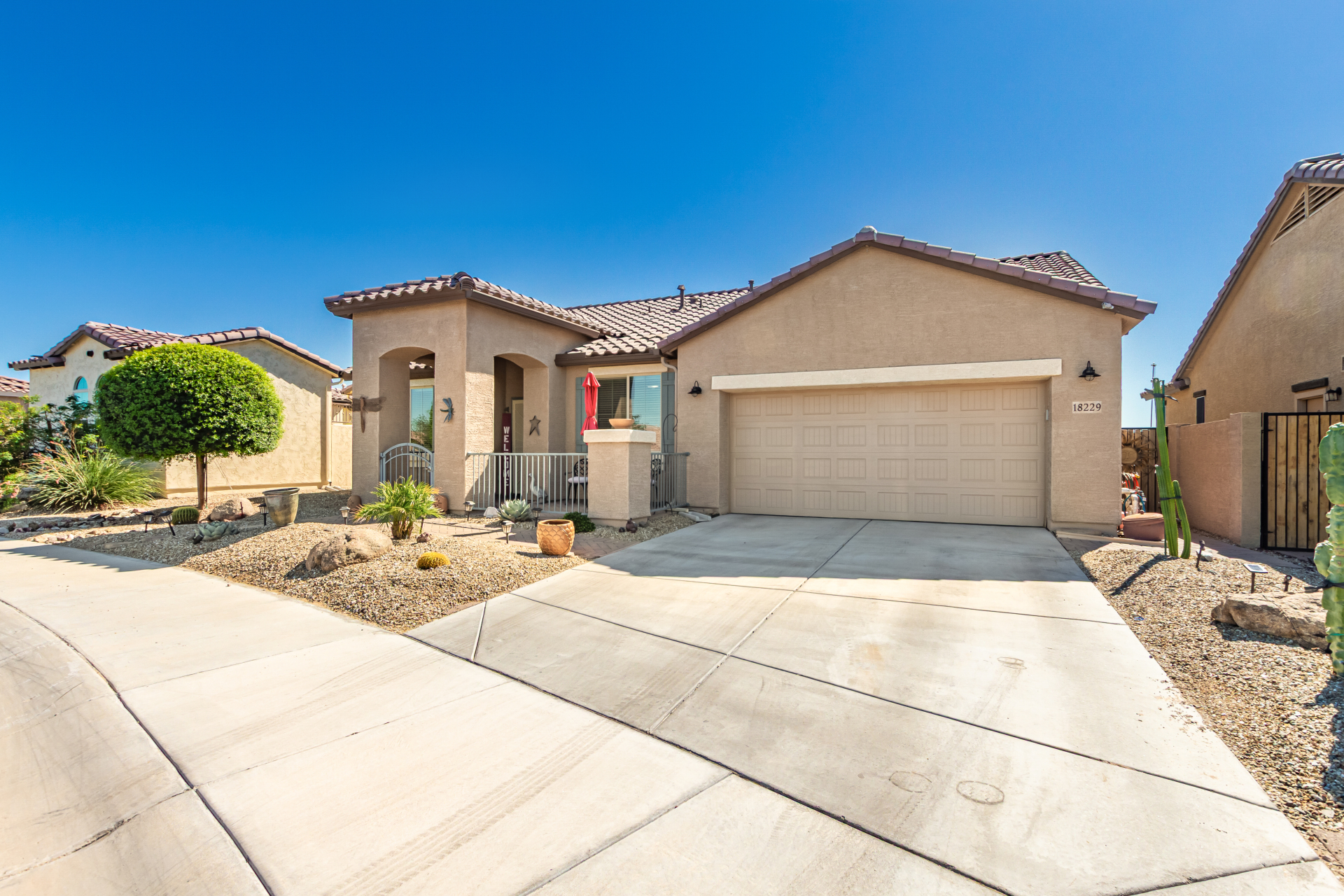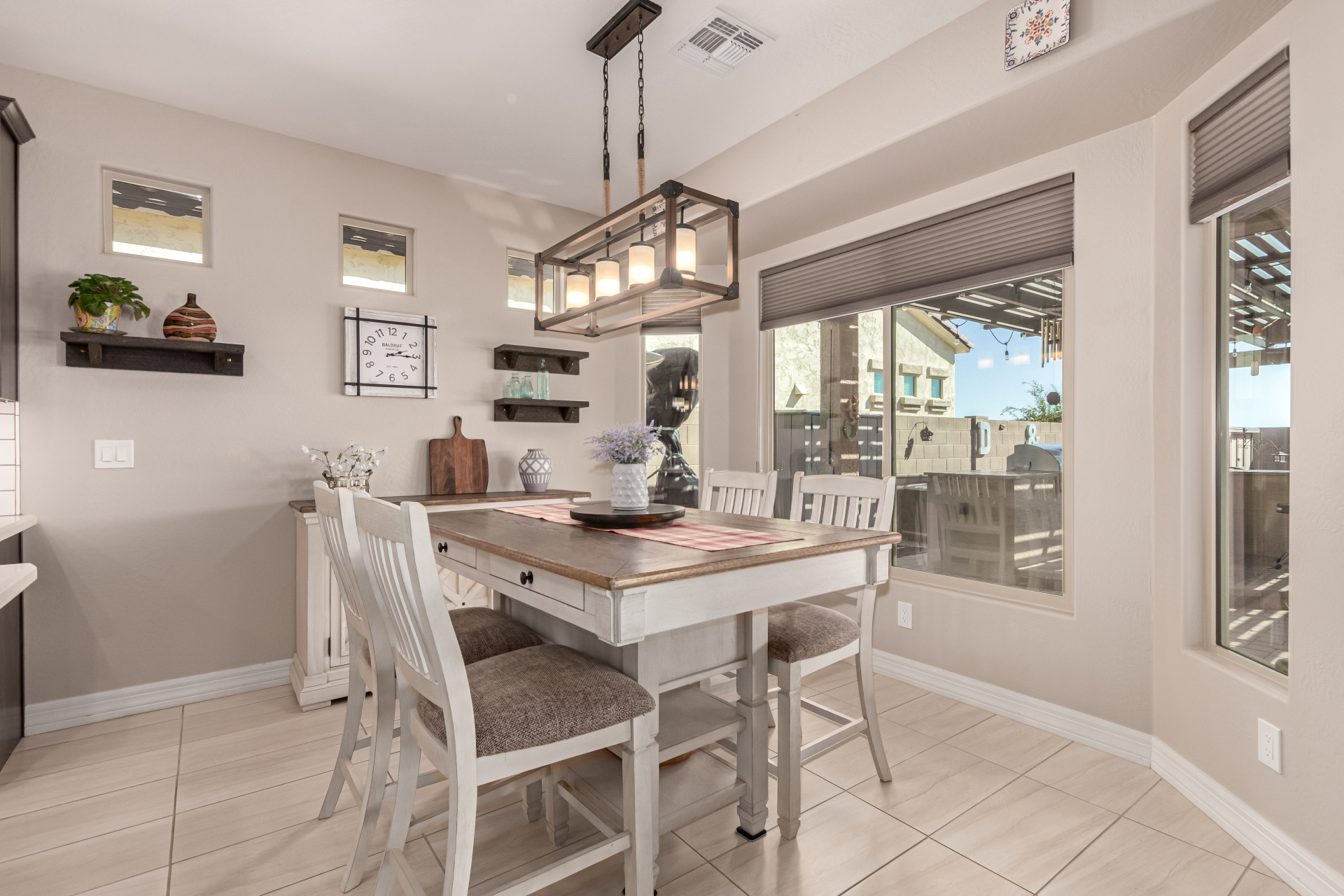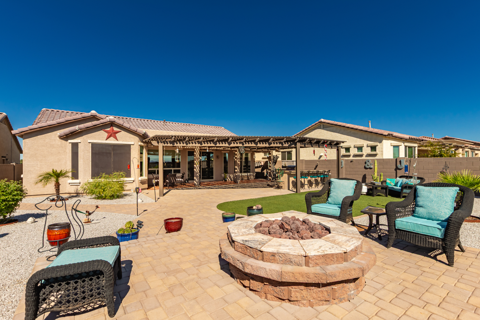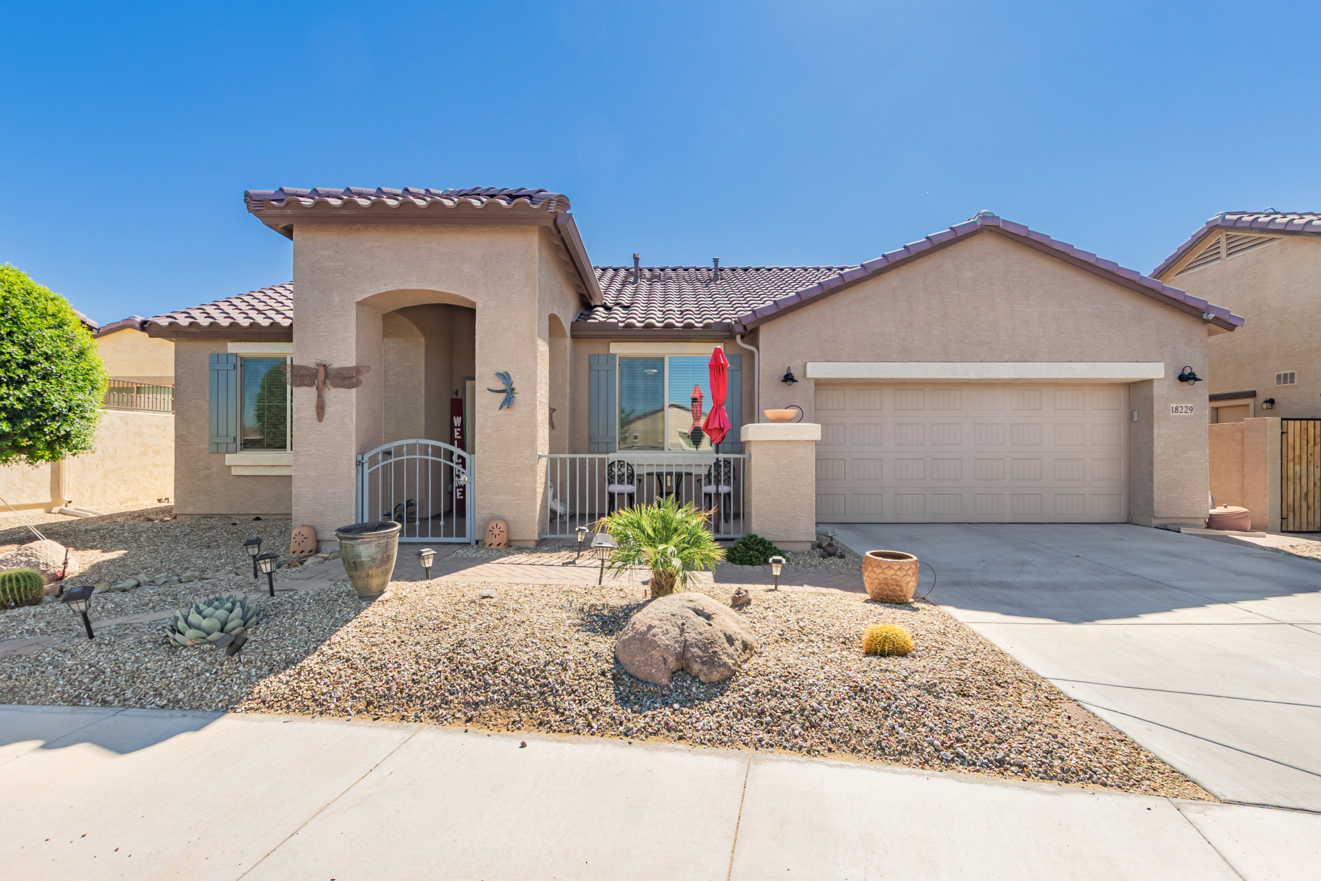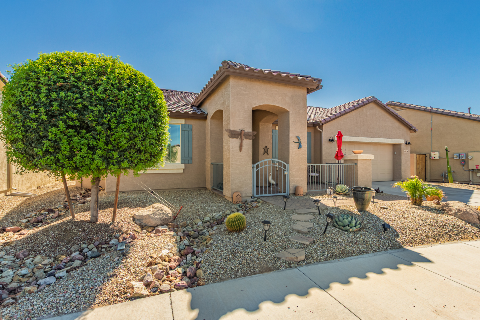 This adorable single-story home awaits you in the desirable adult community of CantaMia! A cozy front porch and a 2-car garage lead you to take a look inside. The interior showcases open and inviting living spaces with tile flooring, large windows for abundant natural light, sliding doors overlooking the patio, and neutral tones. The impeccable kitchen awaits your culinary adventures, complete with ample cabinetry, granite countertops, tile backsplash, stainless steel appliances, and an island with a breakfast bar perfect for entertaining. The main suite promises a good night's sleep and hosts a bathroom with double sinks and a walk-in closet for easy organization. Enjoy outdoor living in the backyard, including an attached pergola, well-laid pavers, a built-in BBQ, a grassy area.