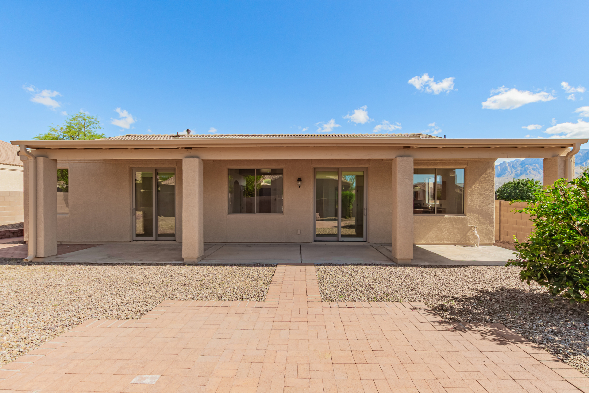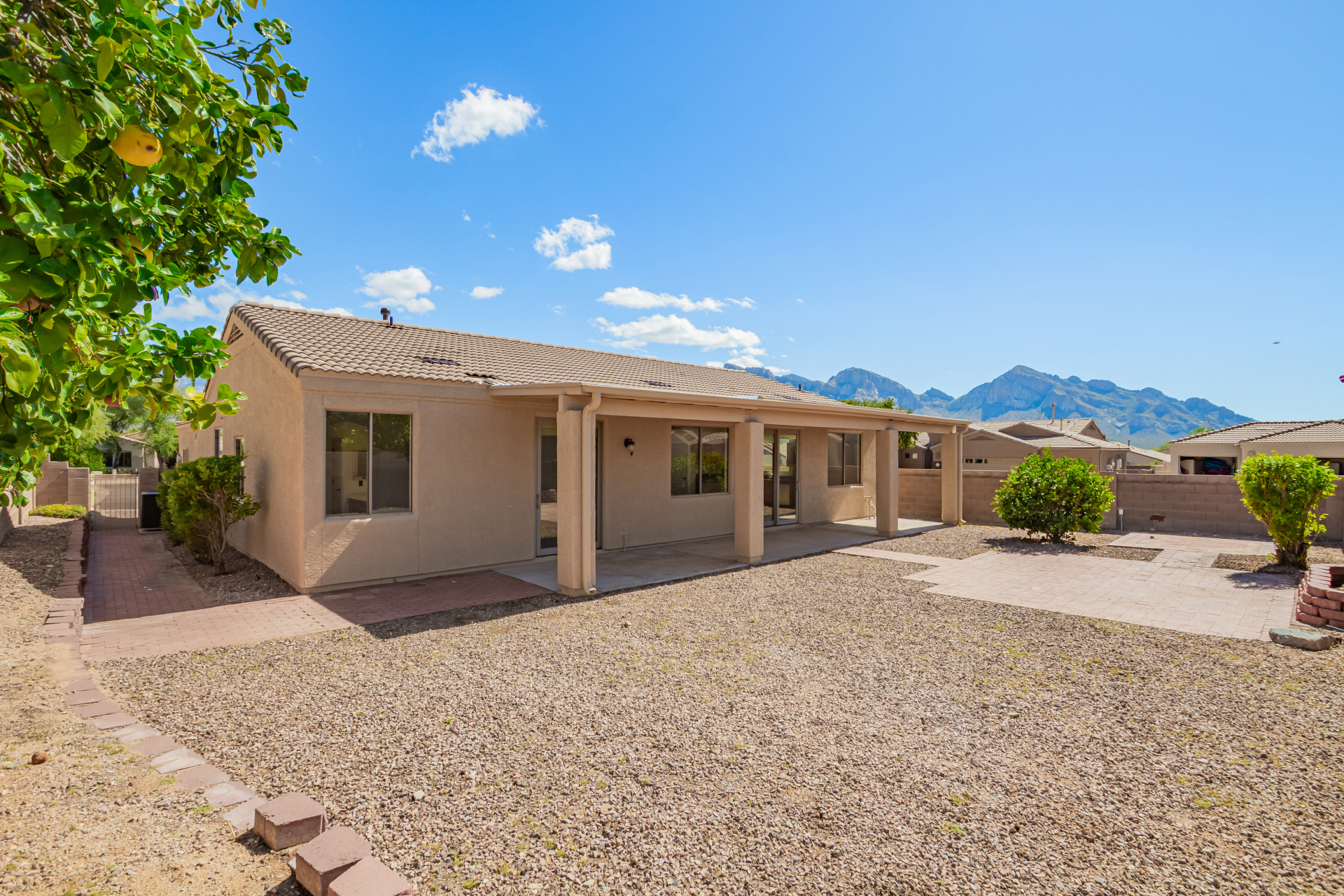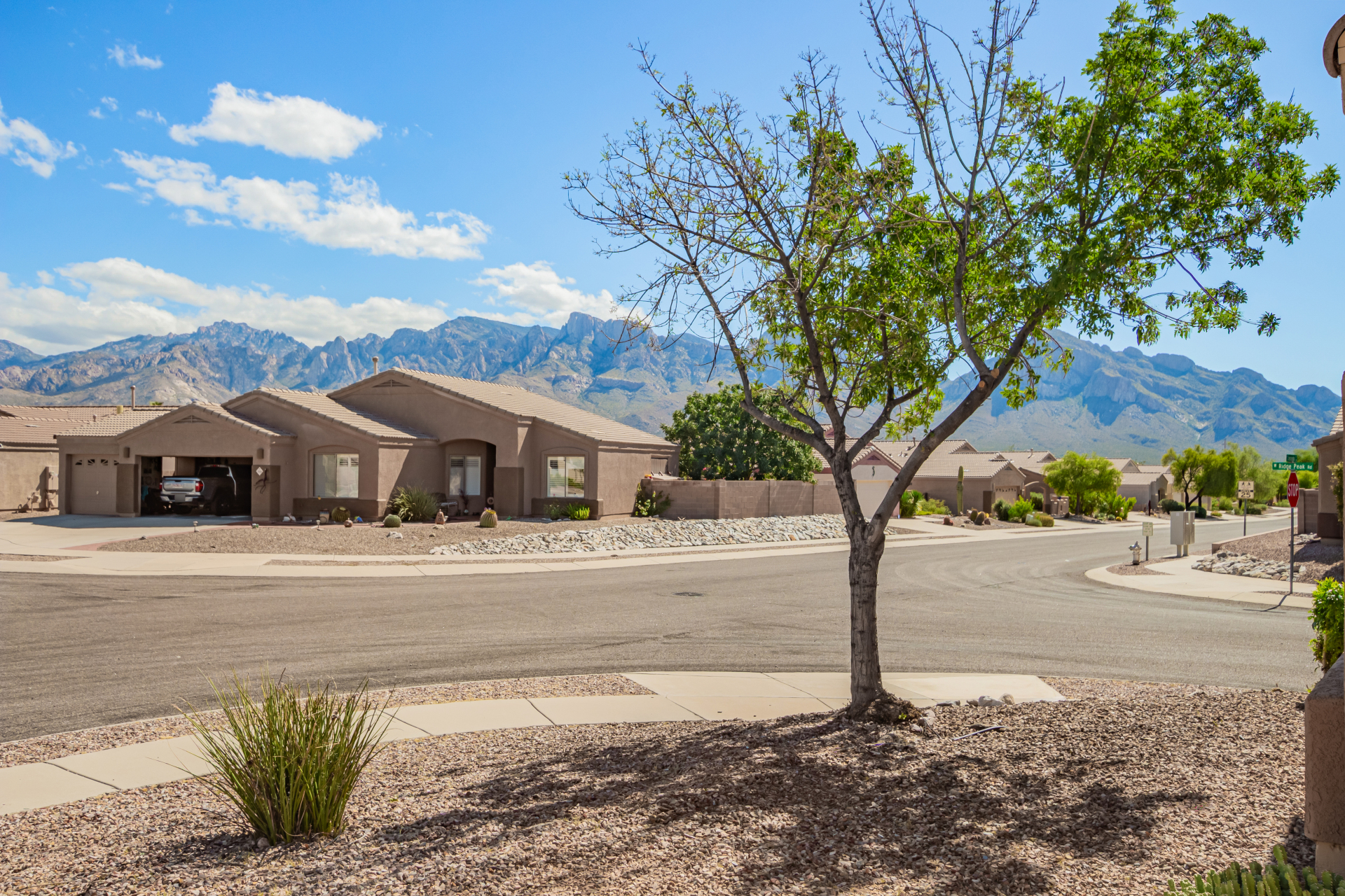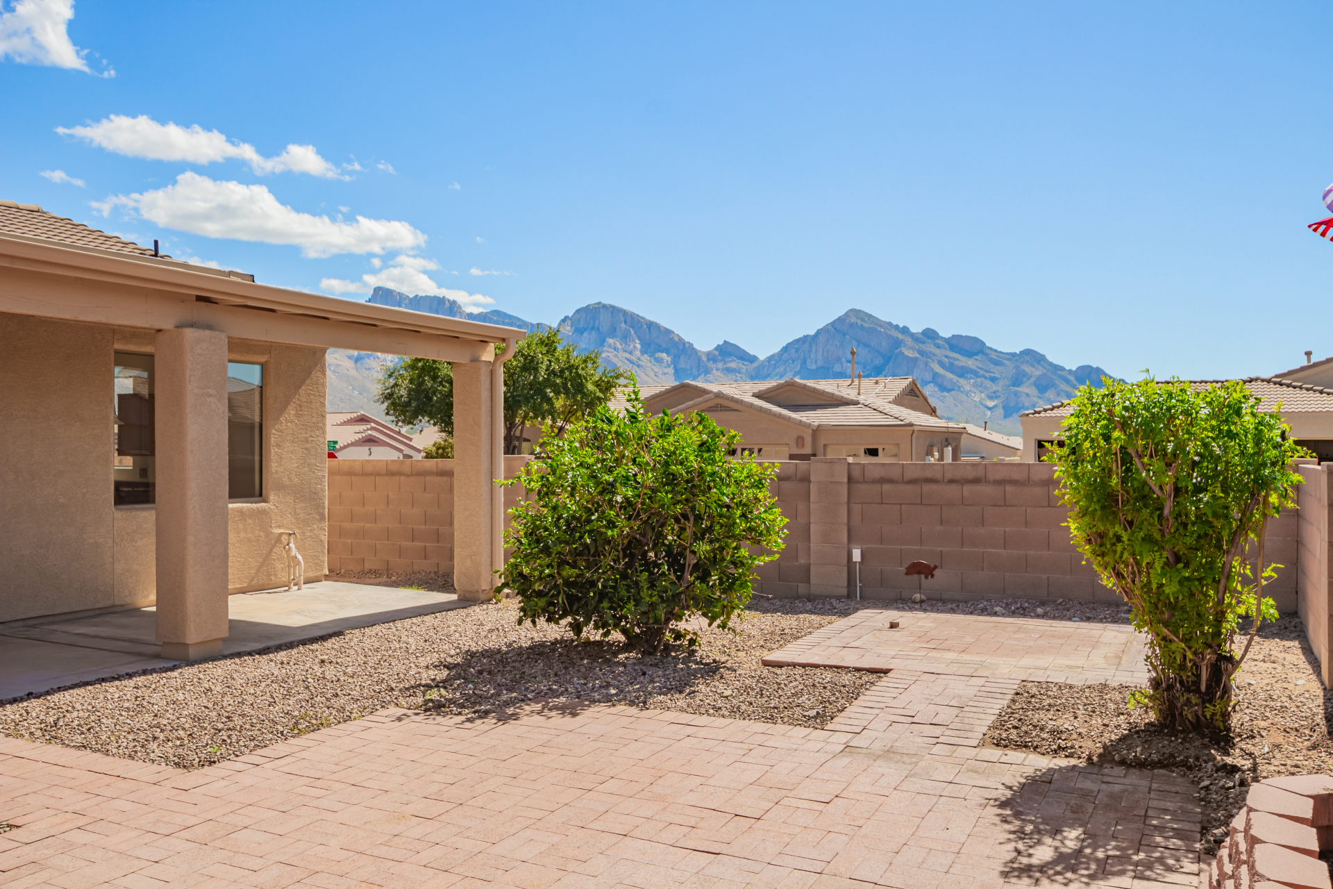 Gorgeous single-story home with spectacular Pusch Ridge Mountain Views! Sitting on a desirable corner lot, this gem features 4 bedrooms, 2 bathrooms & a 2-car garage w/ new epoxy flooring. Inside, discover a generous living areas w/tile flooring, soaring vaulted ceilings, archways, & neutral tones. The impeccable kitchen awaits your culinary adventures, equipped w/ cabinetry, countertops, built-in pantry, SS appliances, an island w/breakfast bar, & breakfast nook. The airy main bedroom boasts carpet for added comfort, backyard access, full ensuite w/ dual sinks, walk-in closet, garden tub, & walk-in shower. The backyard hosts a cozy covered patio ideal for unwinding after a long day, well-laid pavers, & low-maintenance landscape, great for entertaining & relaxing! A MUST see! Agent/Owner