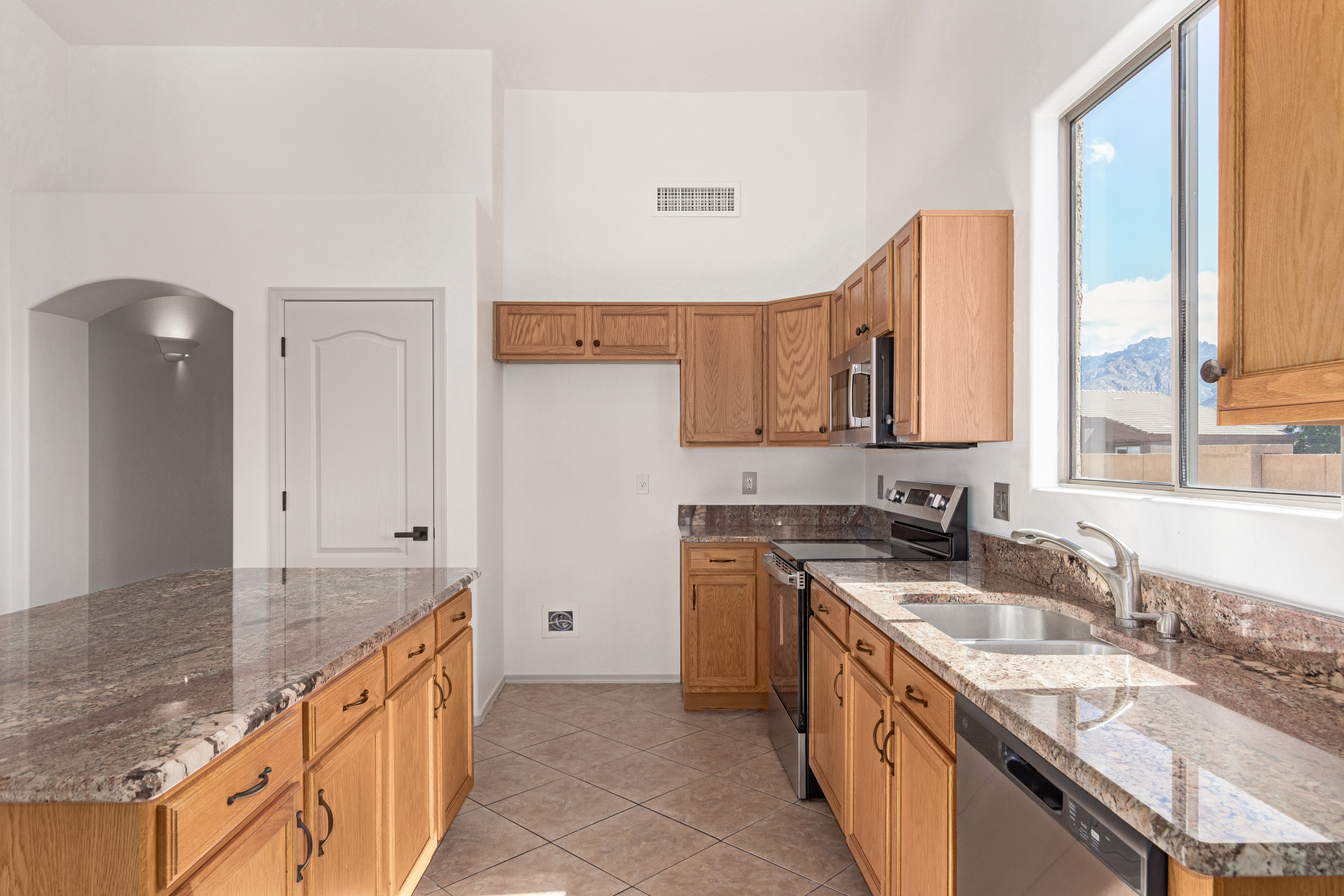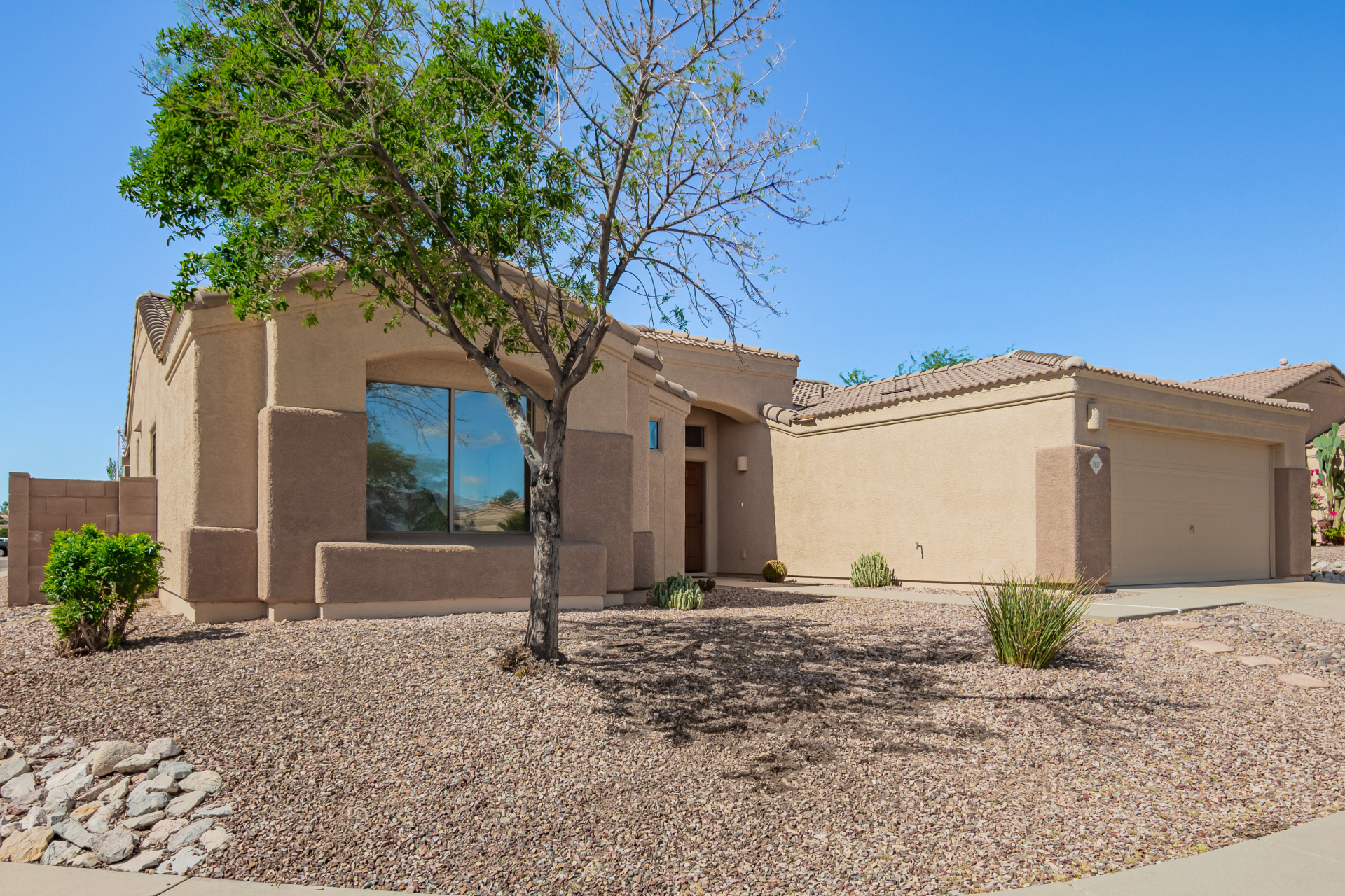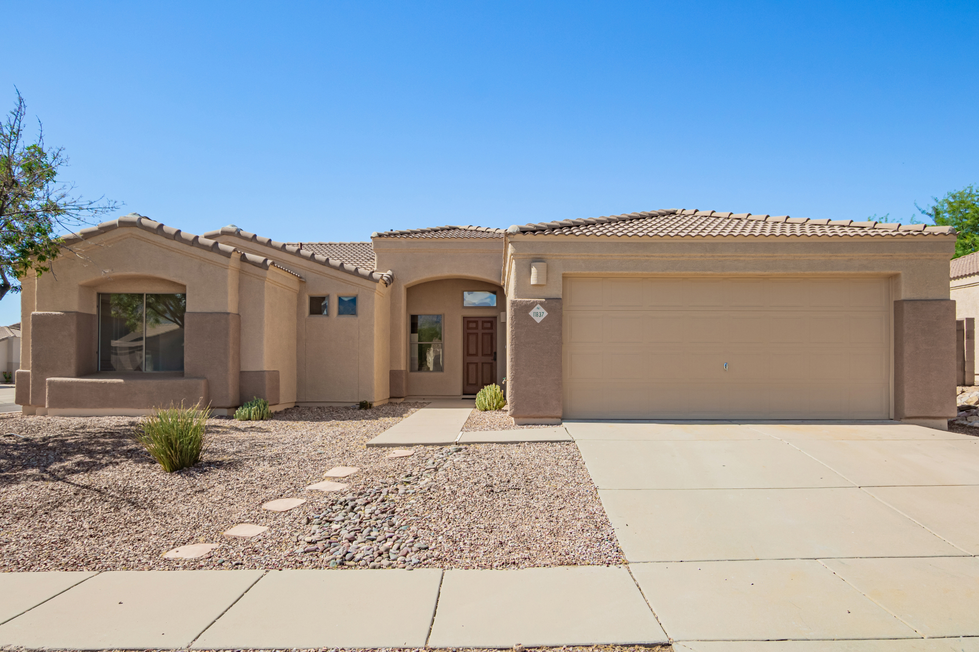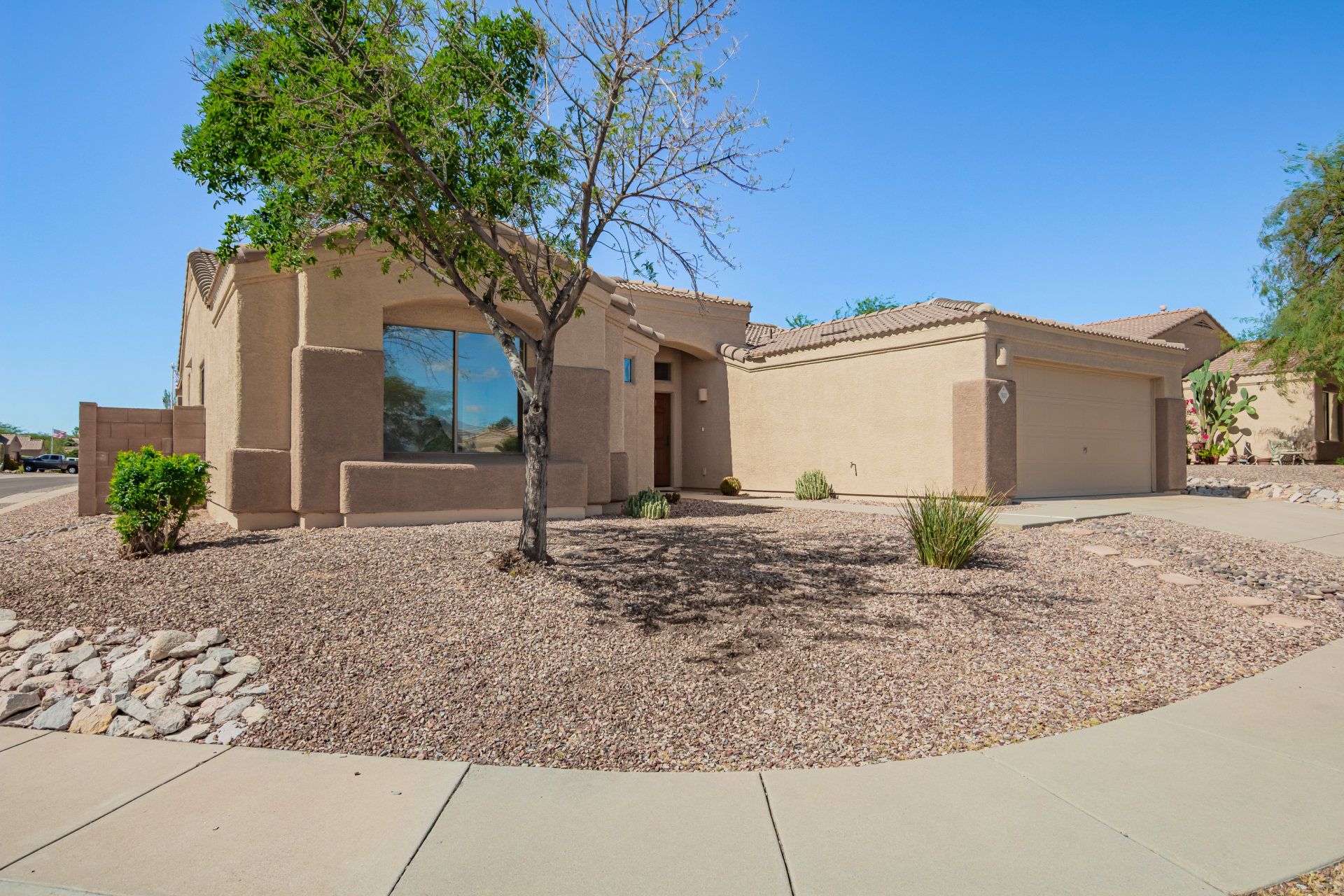 Gorgeous single-story home with spectacular Pusch Ridge Mountain Views! Sitting on a desirable corner lot, this gem features 4 bedrooms, 2 bathrooms & a 2-car garage w/ new epoxy flooring. Inside, discover a generous living areas w/tile flooring, soaring vaulted ceilings, archways, & neutral tones. The impeccable kitchen awaits your culinary adventures, equipped w/ cabinetry, countertops, built-in pantry, SS appliances, an island w/breakfast bar, & breakfast nook. The airy main bedroom boasts carpet for added comfort, backyard access, full ensuite w/ dual sinks, walk-in closet, garden tub, & walk-in shower. The backyard hosts a cozy covered patio ideal for unwinding after a long day, well-laid pavers, & low-maintenance landscape, great for entertaining & relaxing! A MUST see! Agent/Owner