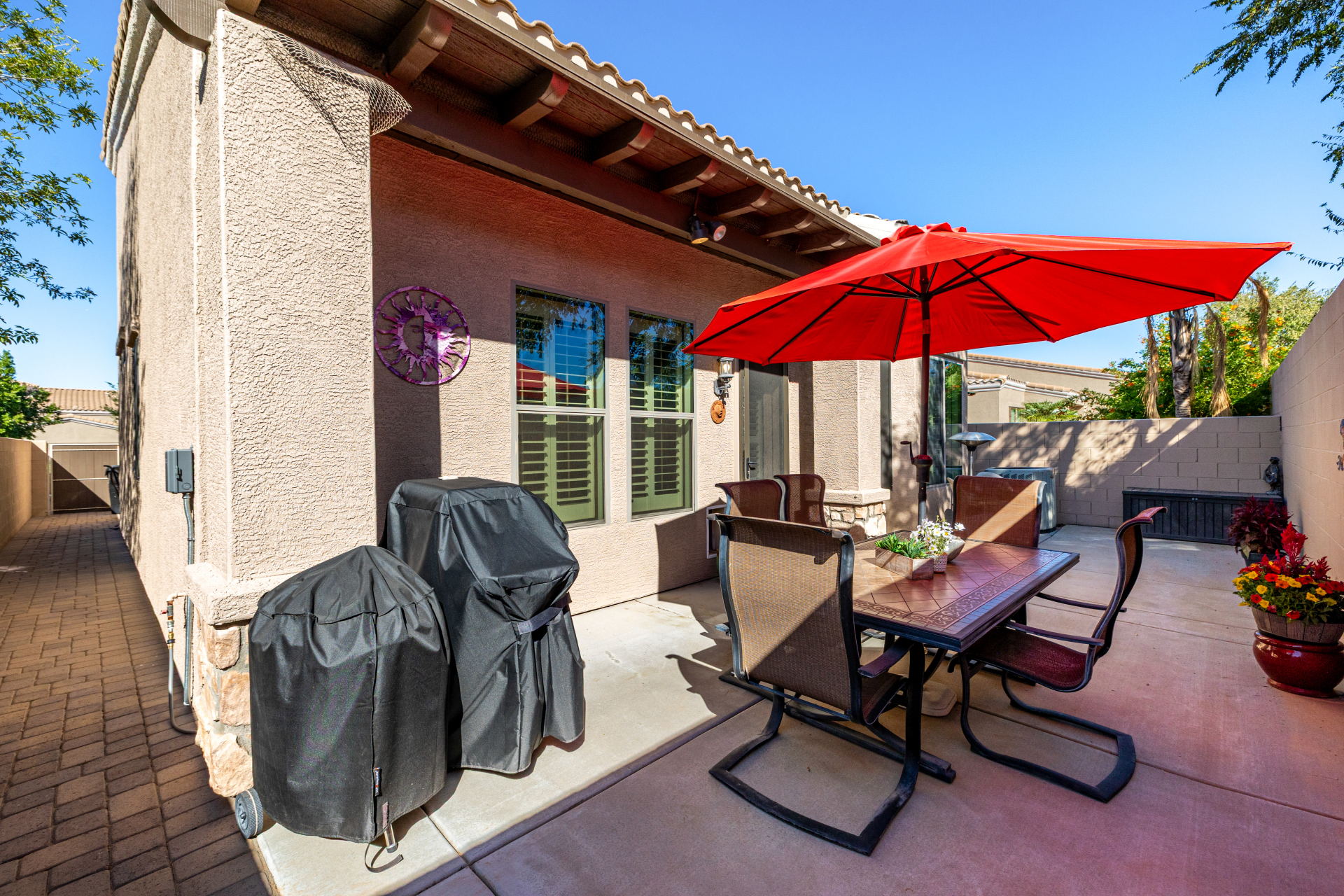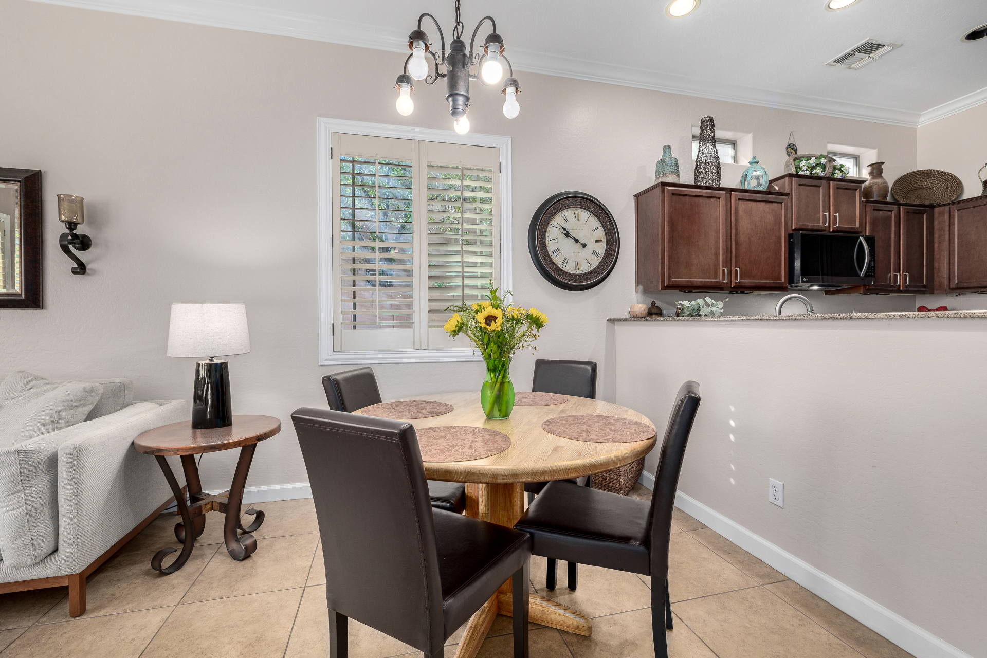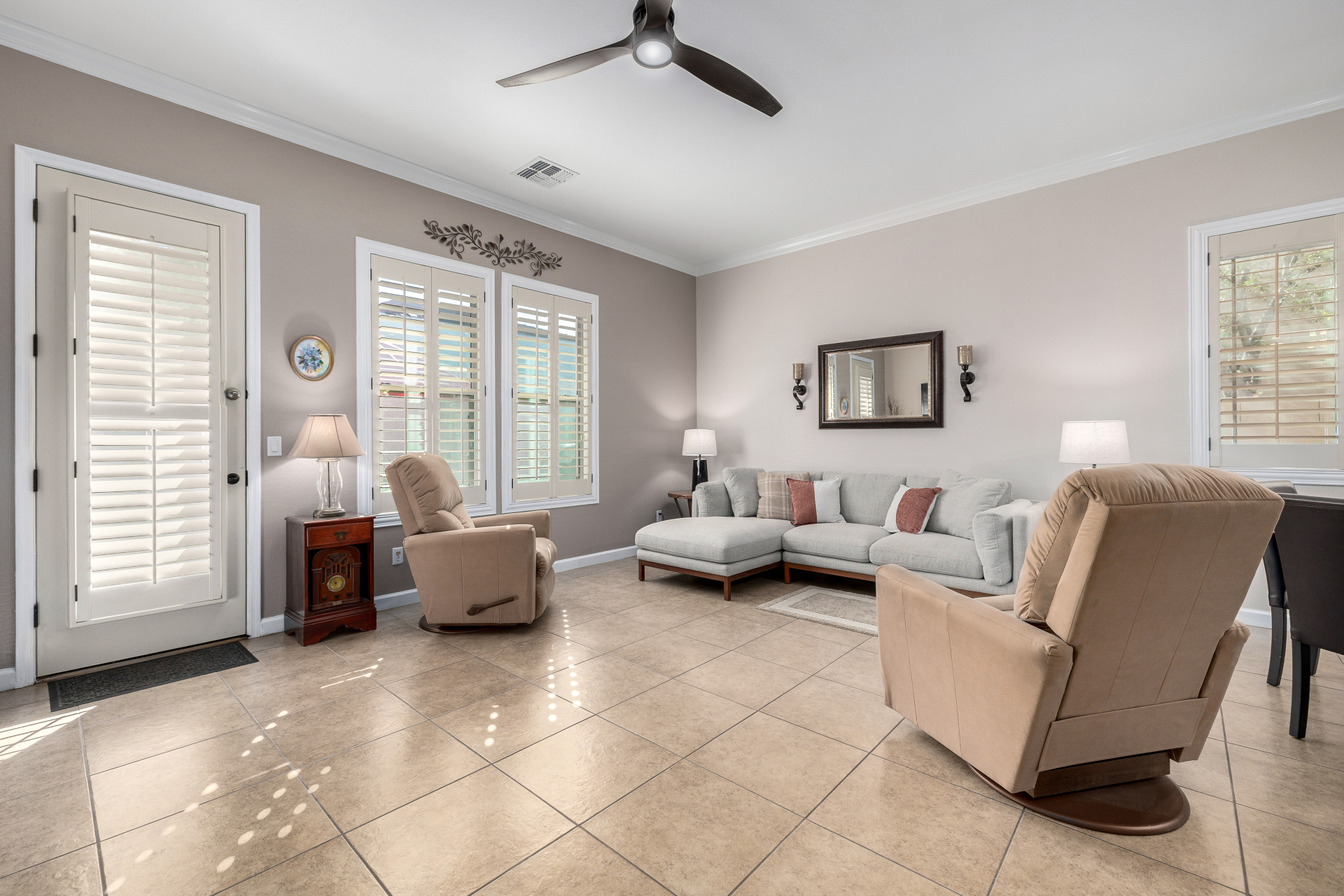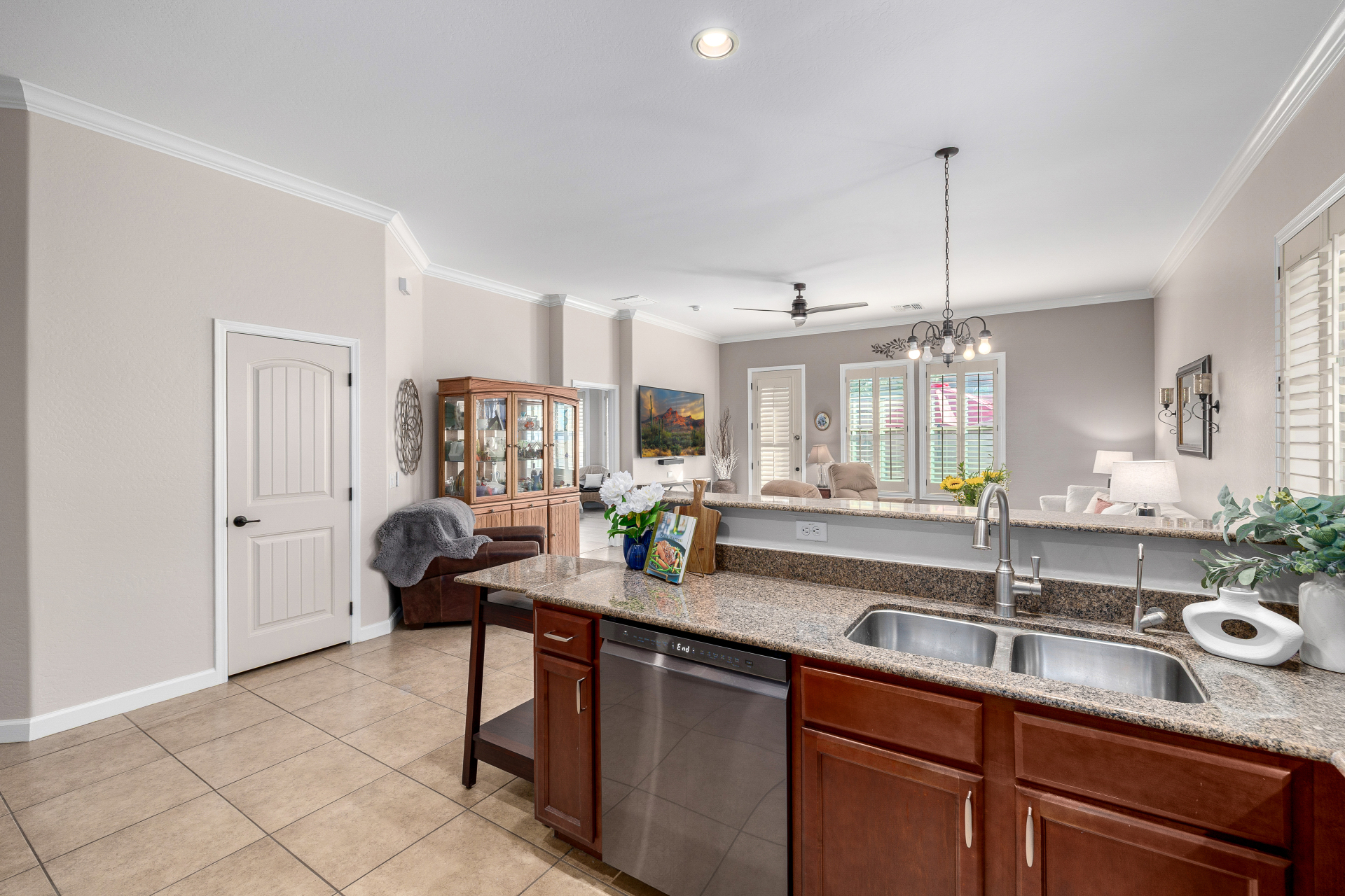 Welcome to Tuscany Villas at Painted Mountain Golf Resort! NE Mesa's premier gated golf course community where every day feels like a getaway. These stylish villas are perfect for full-time living or a carefree lock-and-leave lifestyle. This sought-after Roma model invites you in through a gated courtyard entry. Ideal spot for morning coffee or sunset happy hour. Step inside to an open, upgraded floor plan filled with natural light and charm. The kitchen shines with granite countertops, newer appliances, and plenty of cabinet space, opening seamlessly to the formal dining area and spacious great room. A clever built-in office space adds function without sacrificing style. You'll love the designer touches throughout — plantation shutters, crown molding and beautiful tile and laminate flooring. The owner's suite is private and relaxing with a full bath and walk-in closet, while the guest suite has its own private bath perfect for visitors.