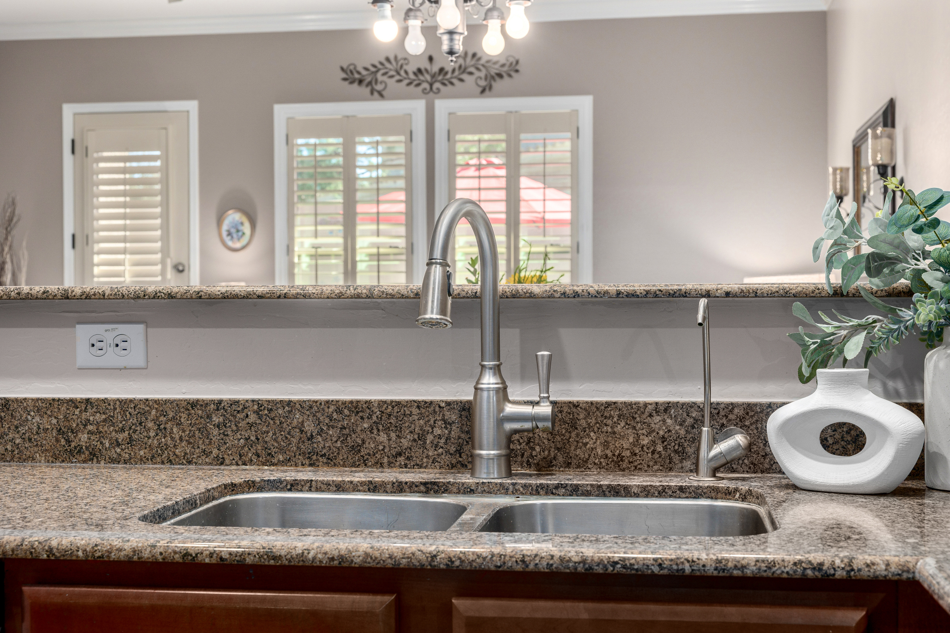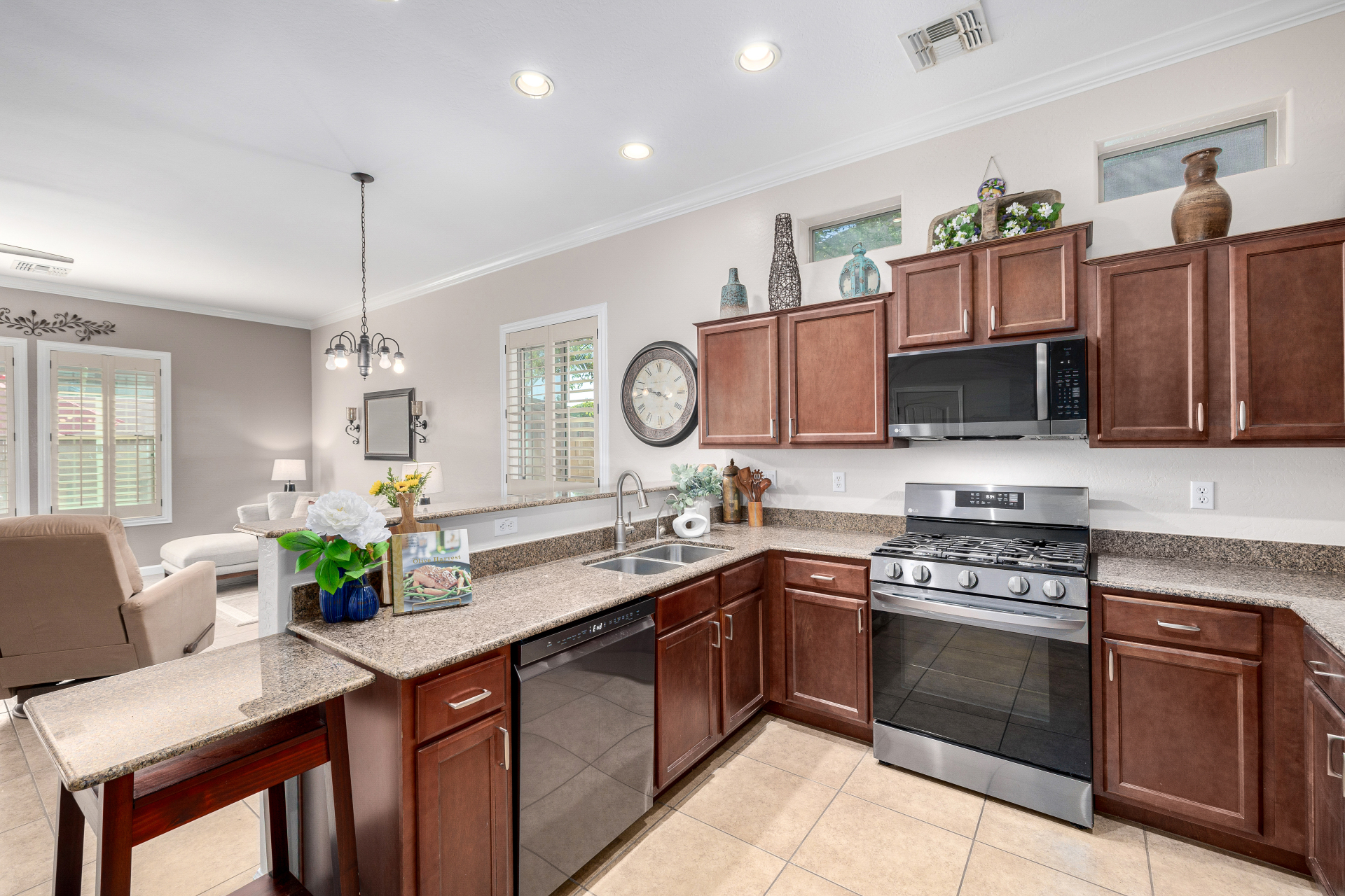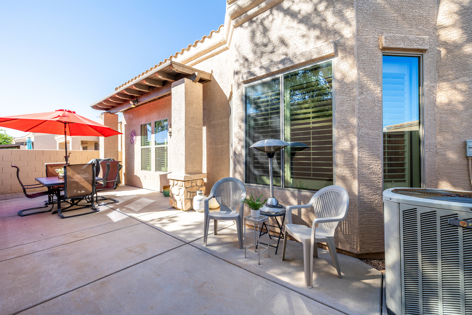 Welcome to Tuscany Villas at Painted Mountain Golf Resort! NE Mesa's premier gated golf course community where every day feels like a getaway. These stylish villas are perfect for full-time living or a carefree lock-and-leave lifestyle. This sought-after Roma model invites you in through a gated courtyard entry. Ideal spot for morning coffee or sunset happy hour. Step inside to an open, upgraded floor plan filled with natural light and charm. The kitchen shines with granite countertops, newer appliances, and plenty of cabinet space, opening seamlessly to the formal dining area and spacious great room. A clever built-in office space adds function without sacrificing style. You'll love the designer touches throughout — plantation shutters, crown molding and beautiful tile and laminate flooring. The owner's suite is private and relaxing with a full bath and walk-in closet, while the guest suite has its own private bath perfect for visitors.
