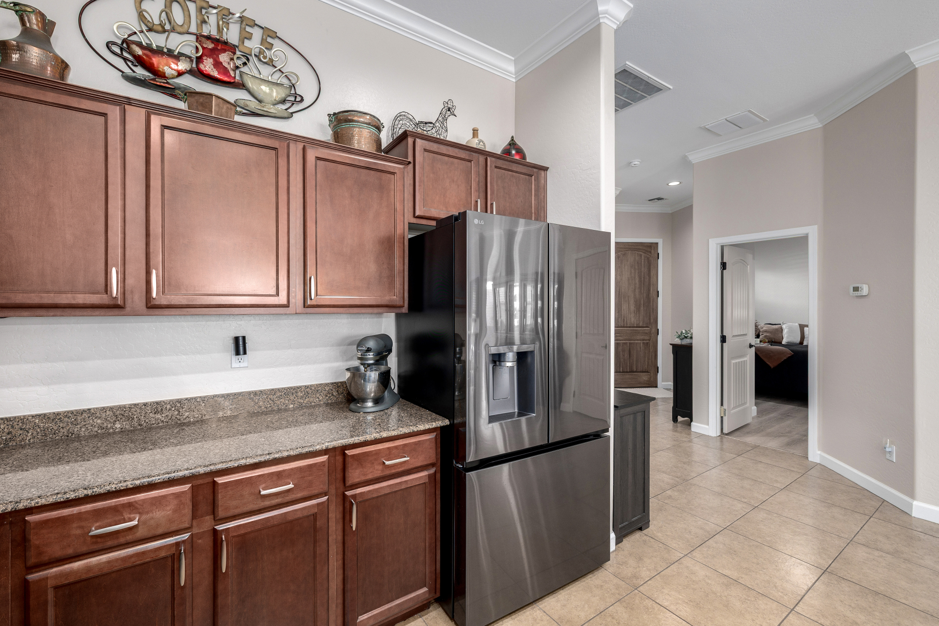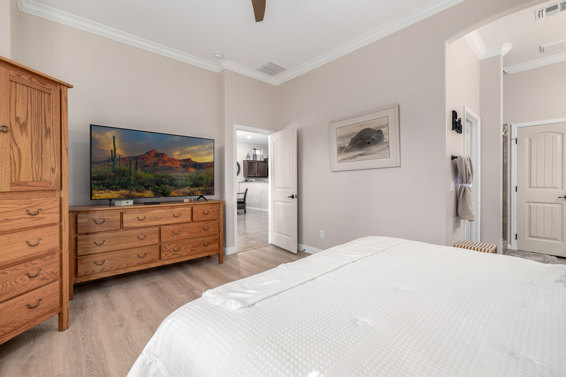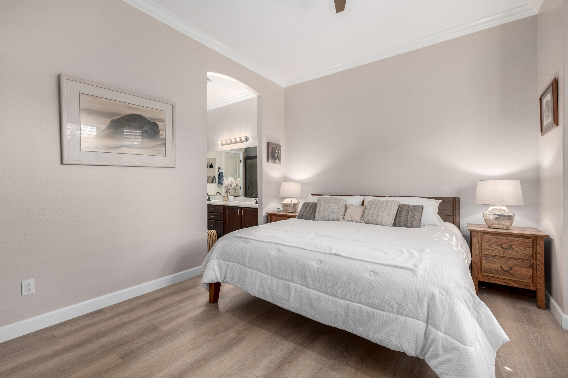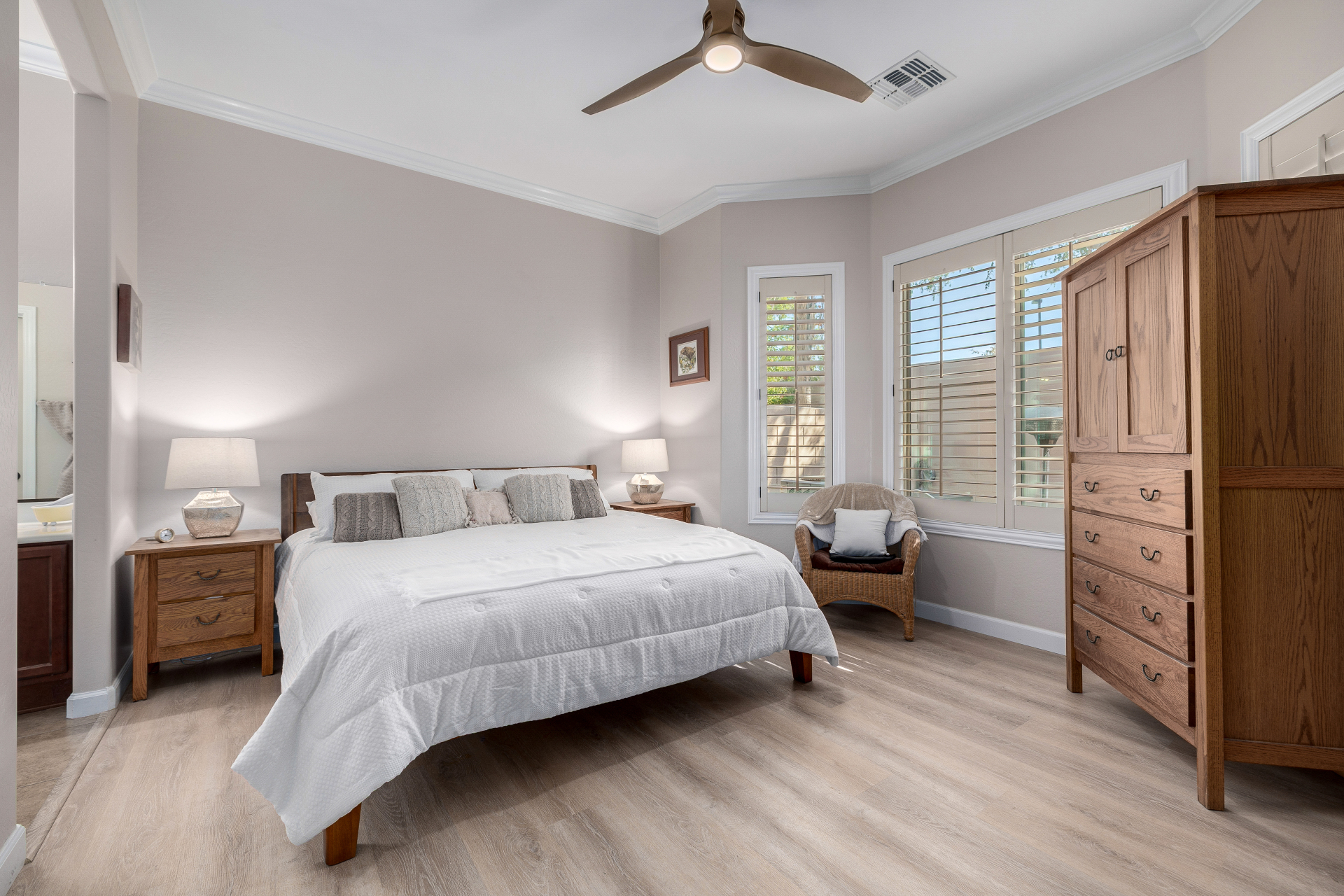 Welcome to Tuscany Villas at Painted Mountain Golf Resort! NE Mesa's premier gated golf course community where every day feels like a getaway. These stylish villas are perfect for full-time living or a carefree lock-and-leave lifestyle. This sought-after Roma model invites you in through a gated courtyard entry. Ideal spot for morning coffee or sunset happy hour. Step inside to an open, upgraded floor plan filled with natural light and charm. The kitchen shines with granite countertops, newer appliances, and plenty of cabinet space, opening seamlessly to the formal dining area and spacious great room. A clever built-in office space adds function without sacrificing style. You'll love the designer touches throughout — plantation shutters, crown molding and beautiful tile and laminate flooring. The owner's suite is private and relaxing with a full bath and walk-in closet, while the guest suite has its own private bath perfect for visitors.