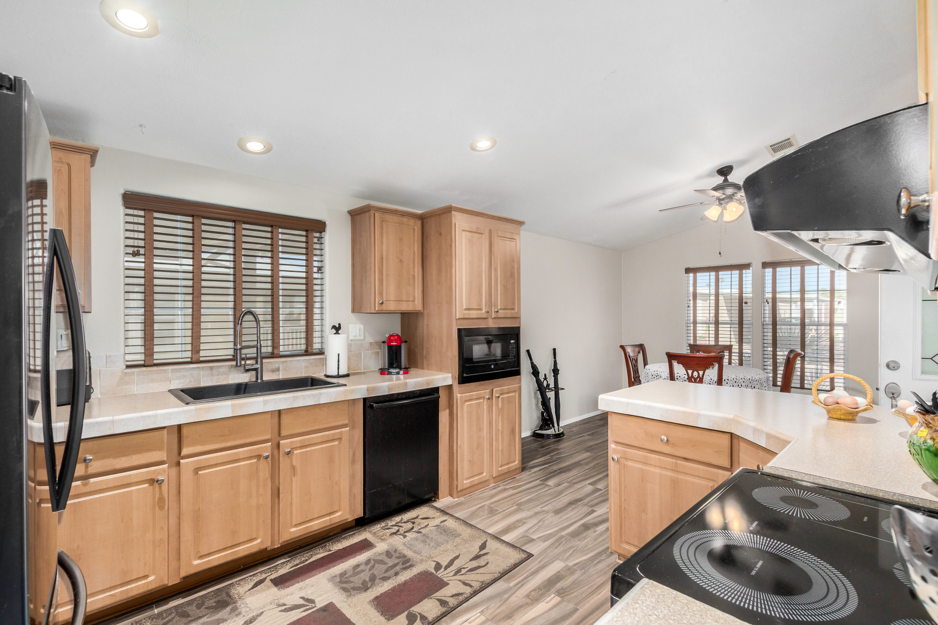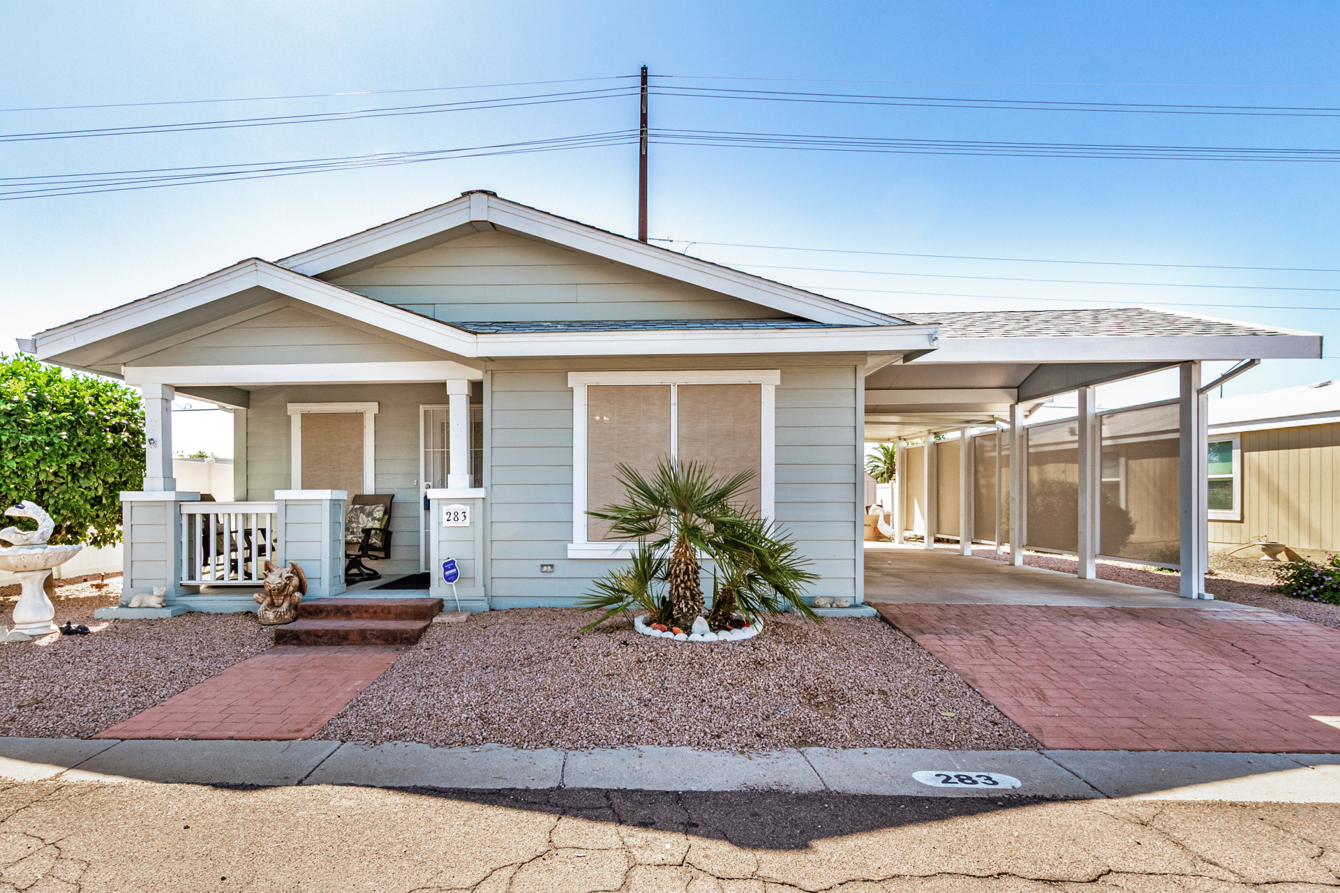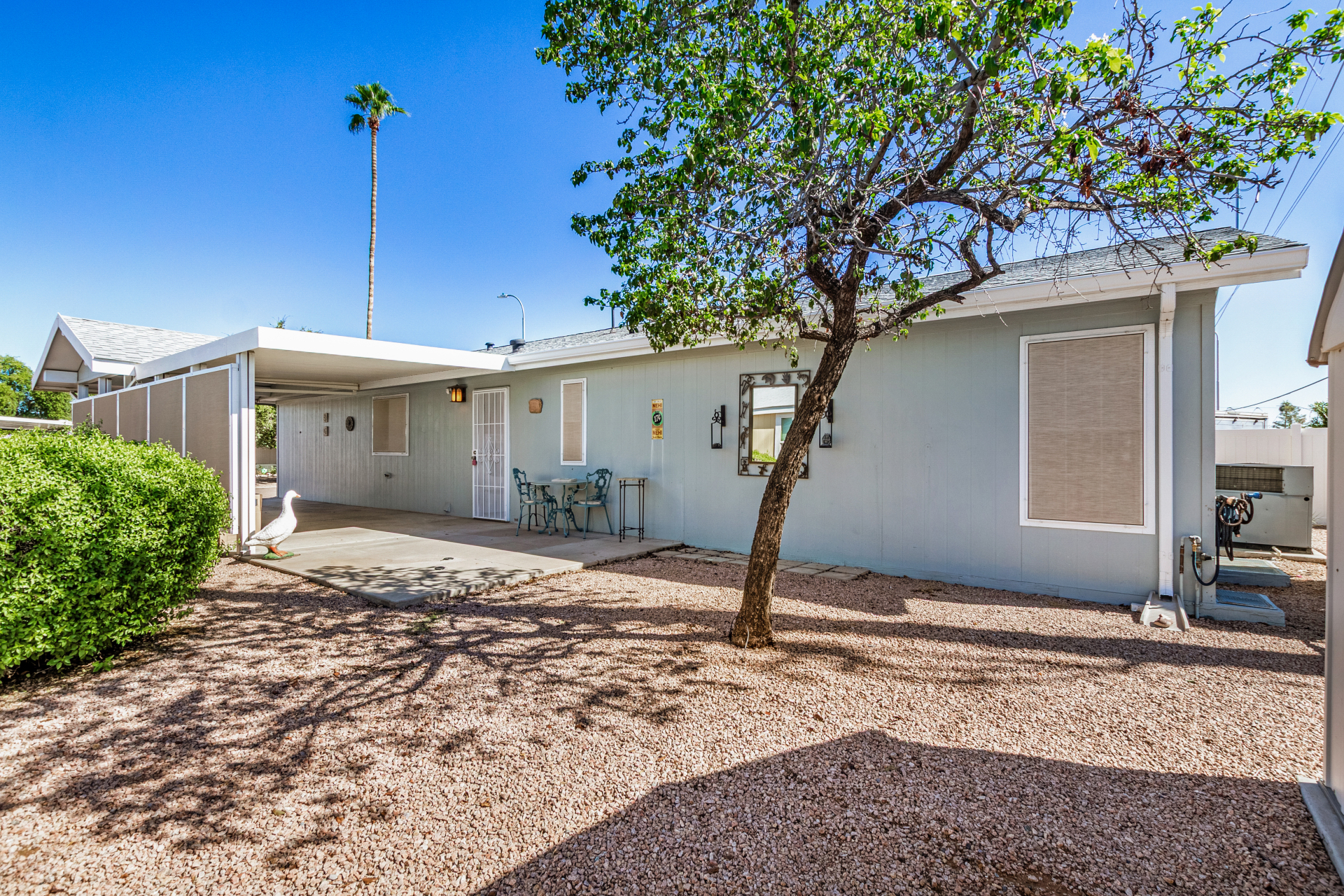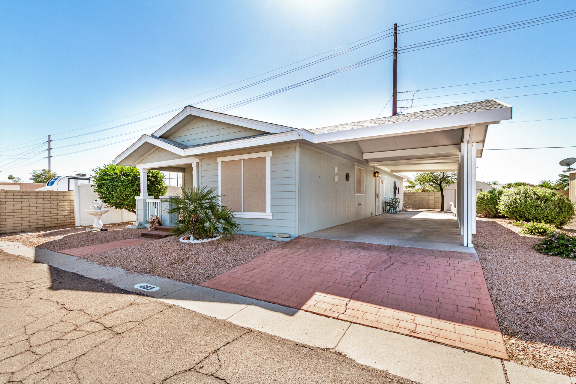 Gorgeous and meticulously cared for 2 bed, 2 bath + DEN with doors, all NEW interior paint, NEW carpet in all the bedrooms, LVP & tile flooring, separate breakfast room, faux wood blinds throughout, kitchen recessed lighting, NEWER privacy fencing with only 1 neighbor, rain gutters & mature trees. Sunshades throughout including the carport. Storage shed. Separate RV storage available. 1 year Old Republic Warranty provided. Kitchen table, hutch, silverware and glassware to remain with home. Water & trash included in lot rent. Community pool, clubhouse and laundry.