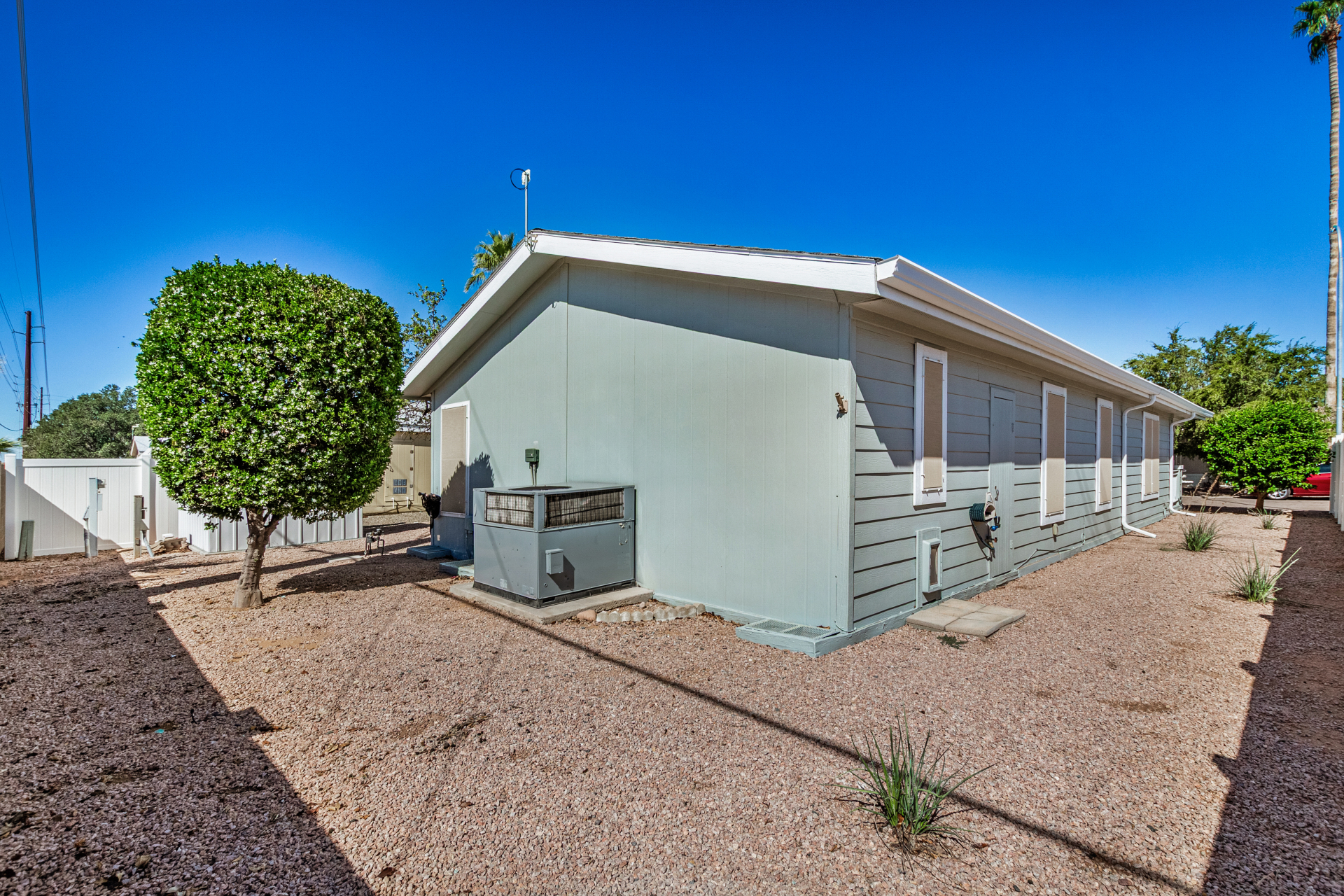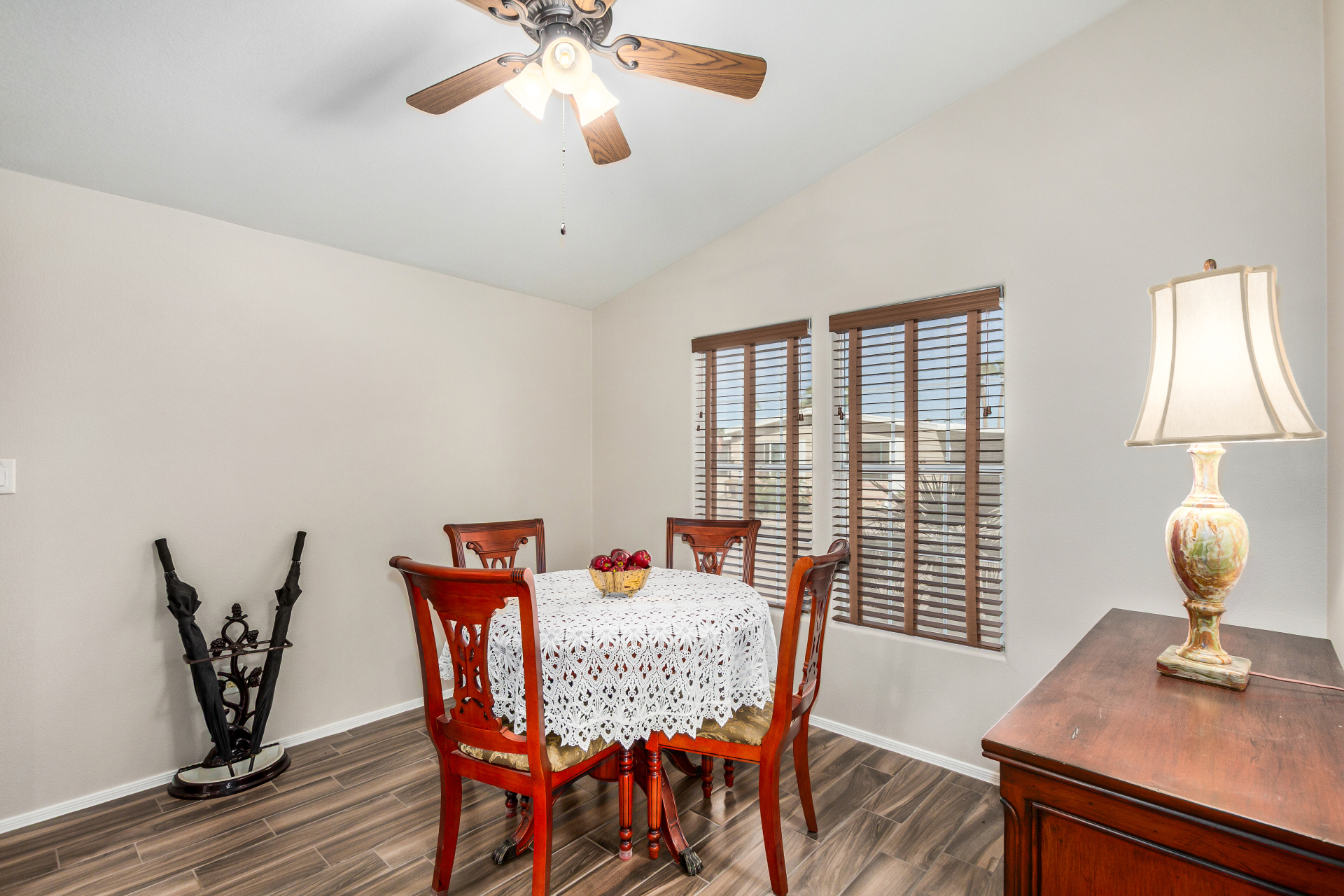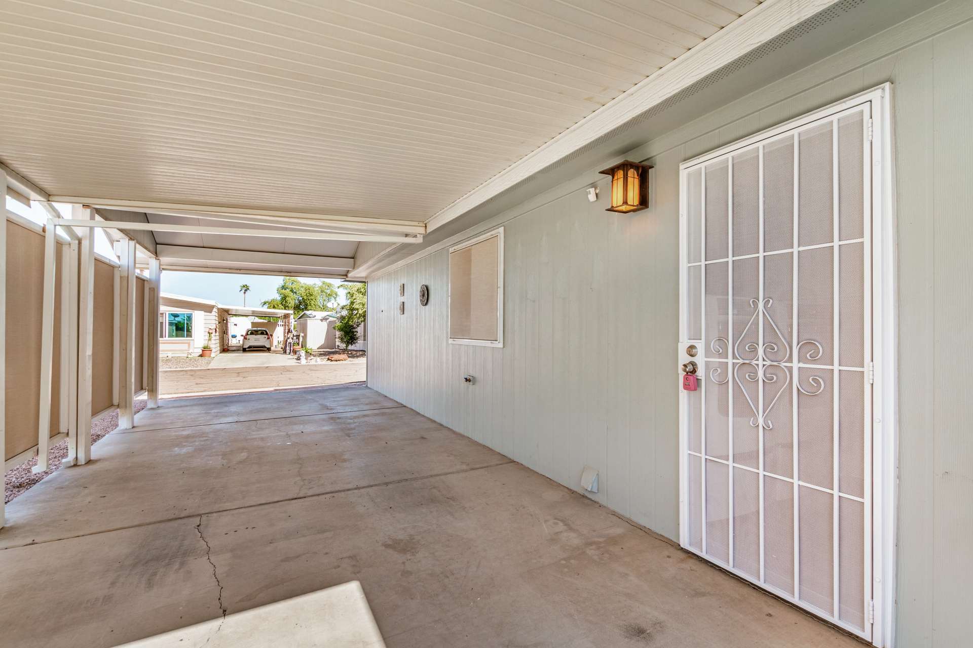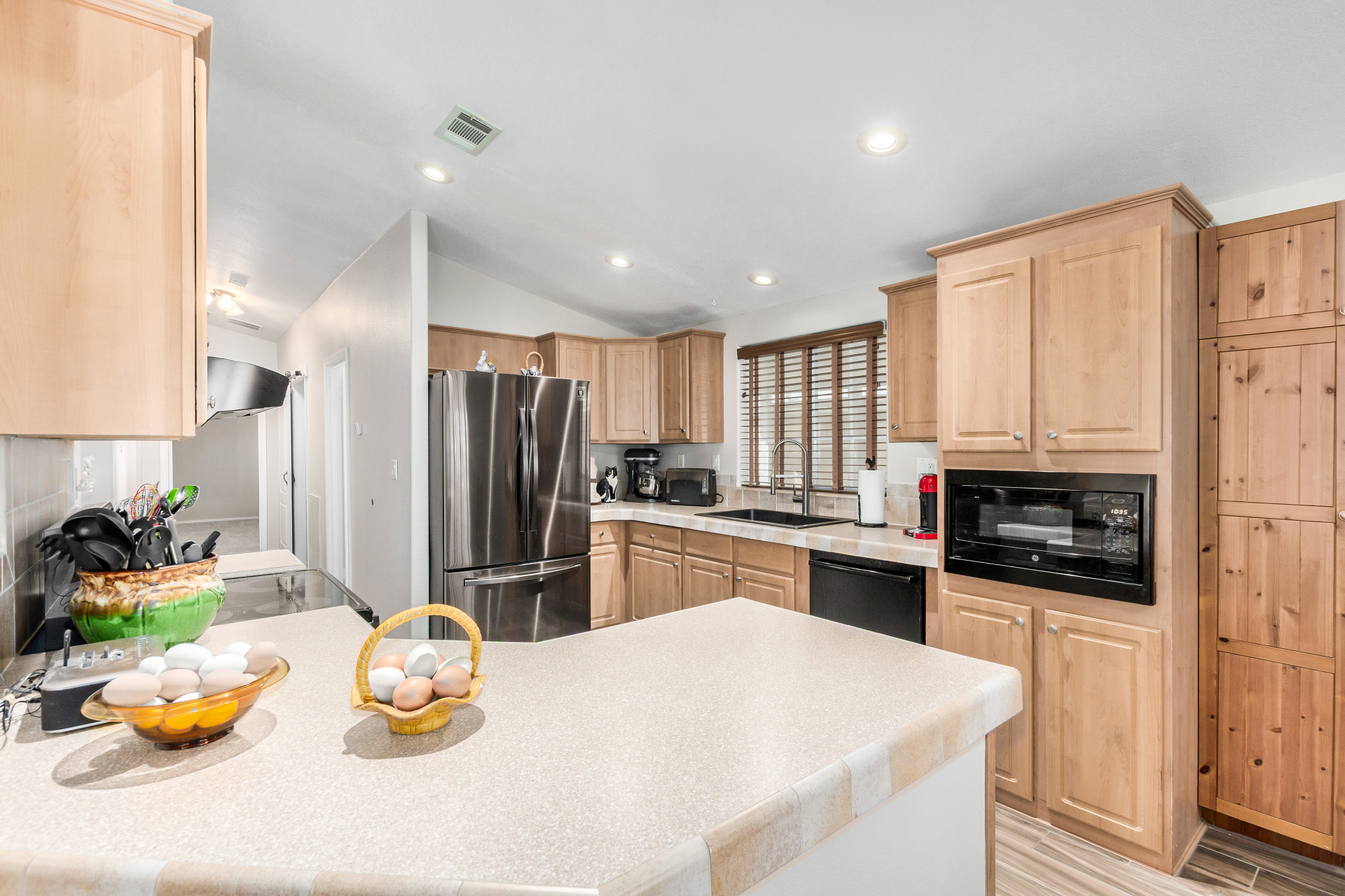 Gorgeous and meticulously cared for 2 bed, 2 bath + DEN with doors, all NEW interior paint, NEW carpet in all the bedrooms, LVP & tile flooring, separate breakfast room, faux wood blinds throughout, kitchen recessed lighting, NEWER privacy fencing with only 1 neighbor, rain gutters & mature trees. Sunshades throughout including the carport. Storage shed. Separate RV storage available. 1 year Old Republic Warranty provided. Kitchen table, hutch, silverware and glassware to remain with home. Water & trash included in lot rent. Community pool, clubhouse and laundry.