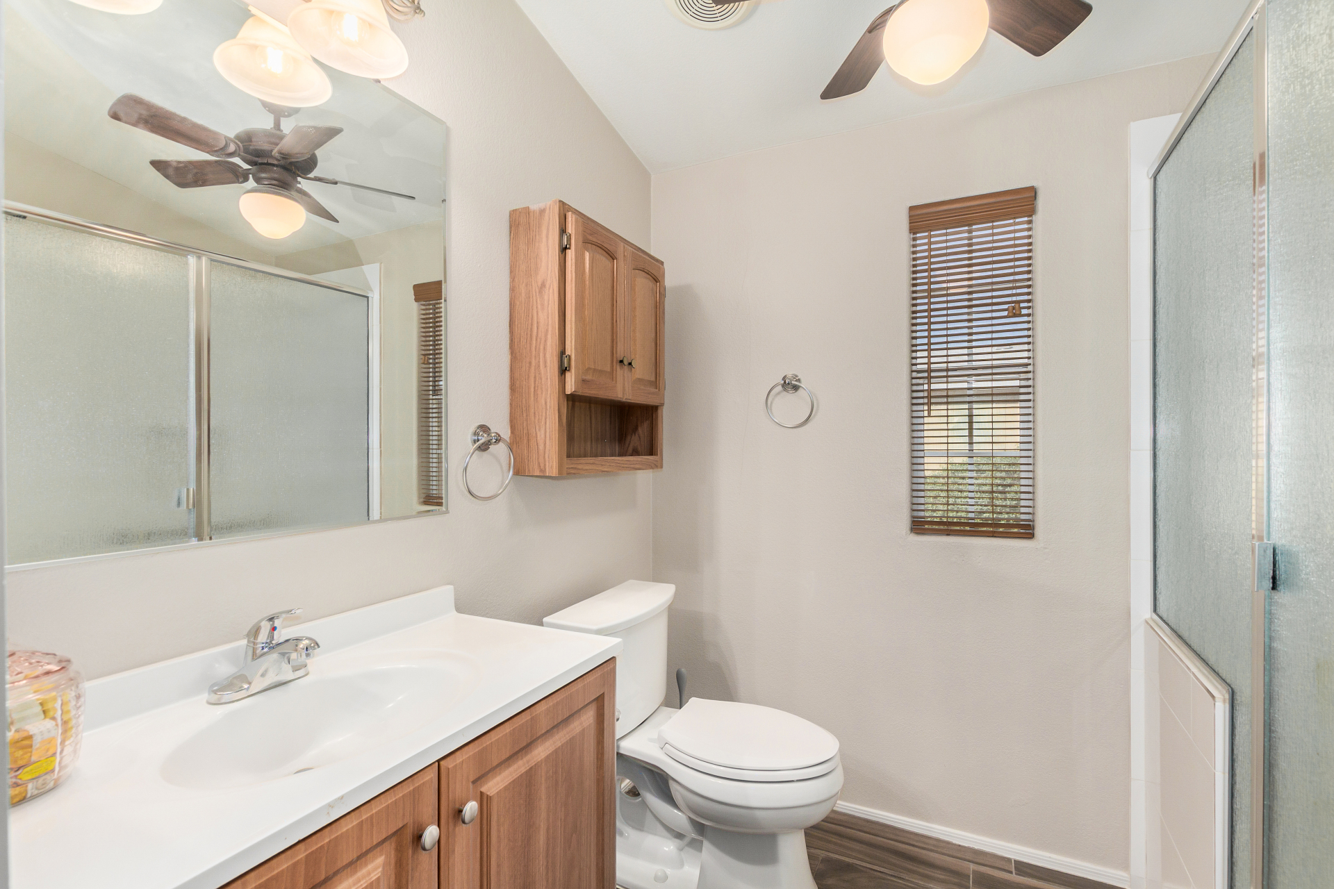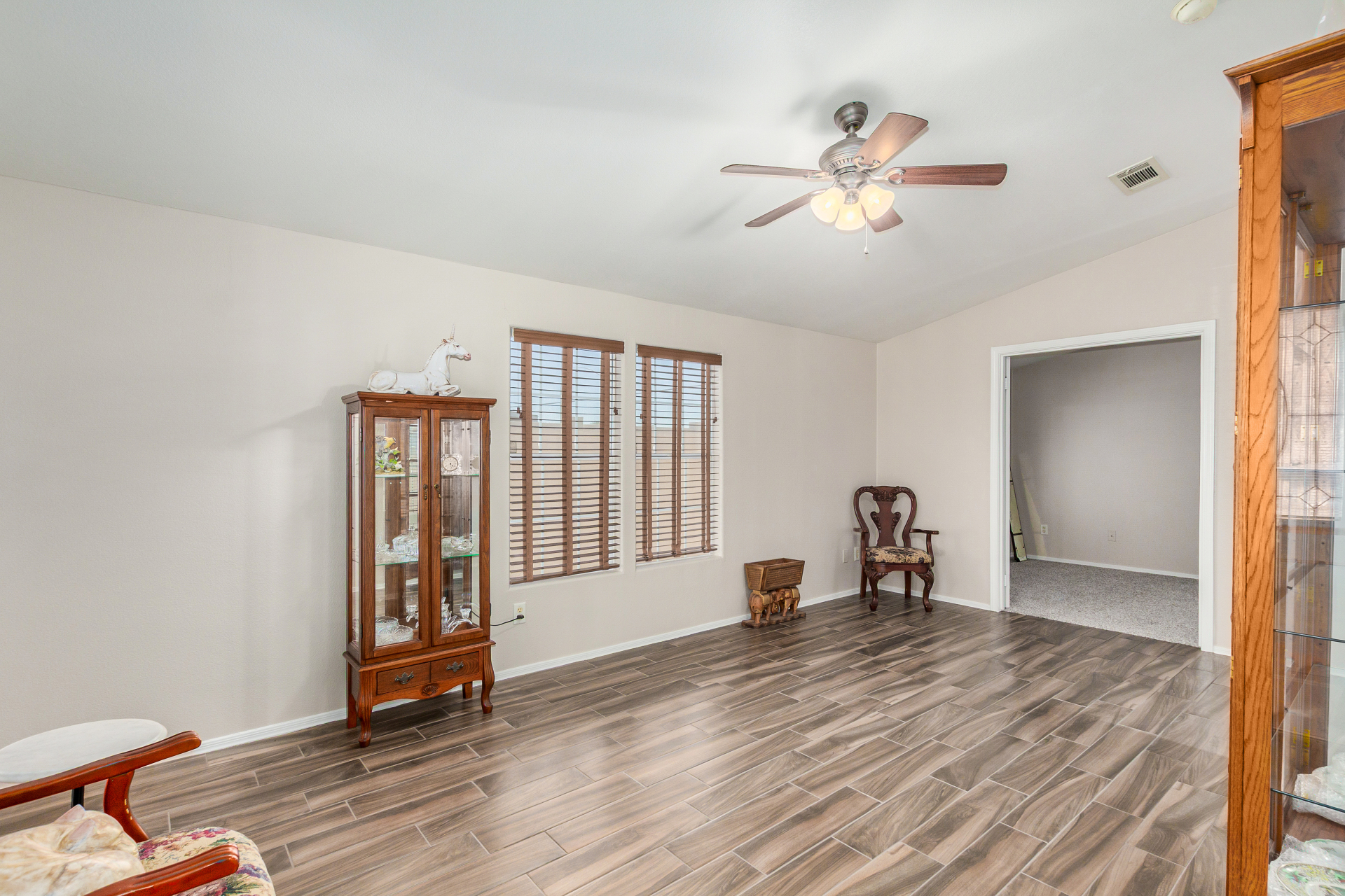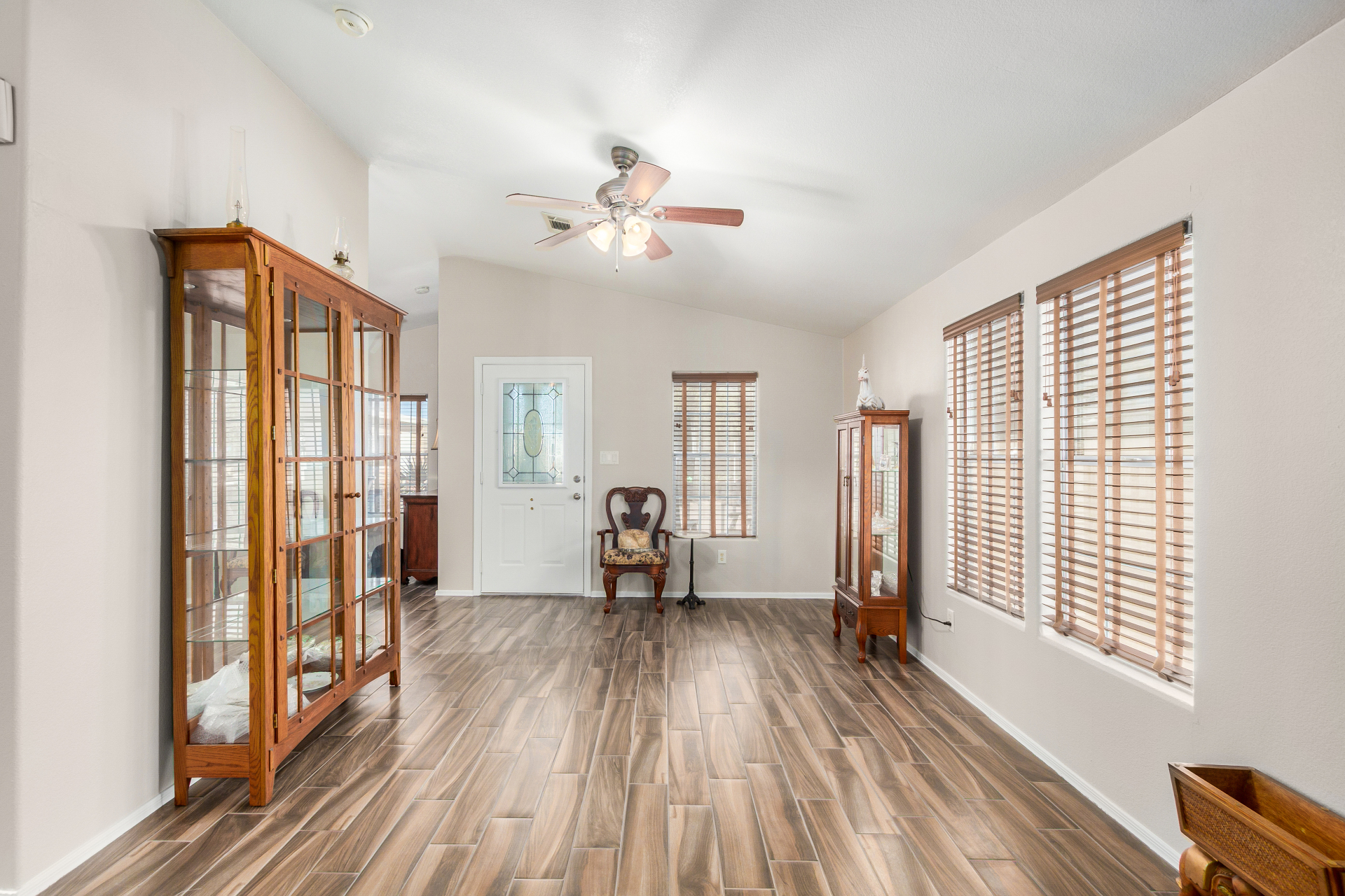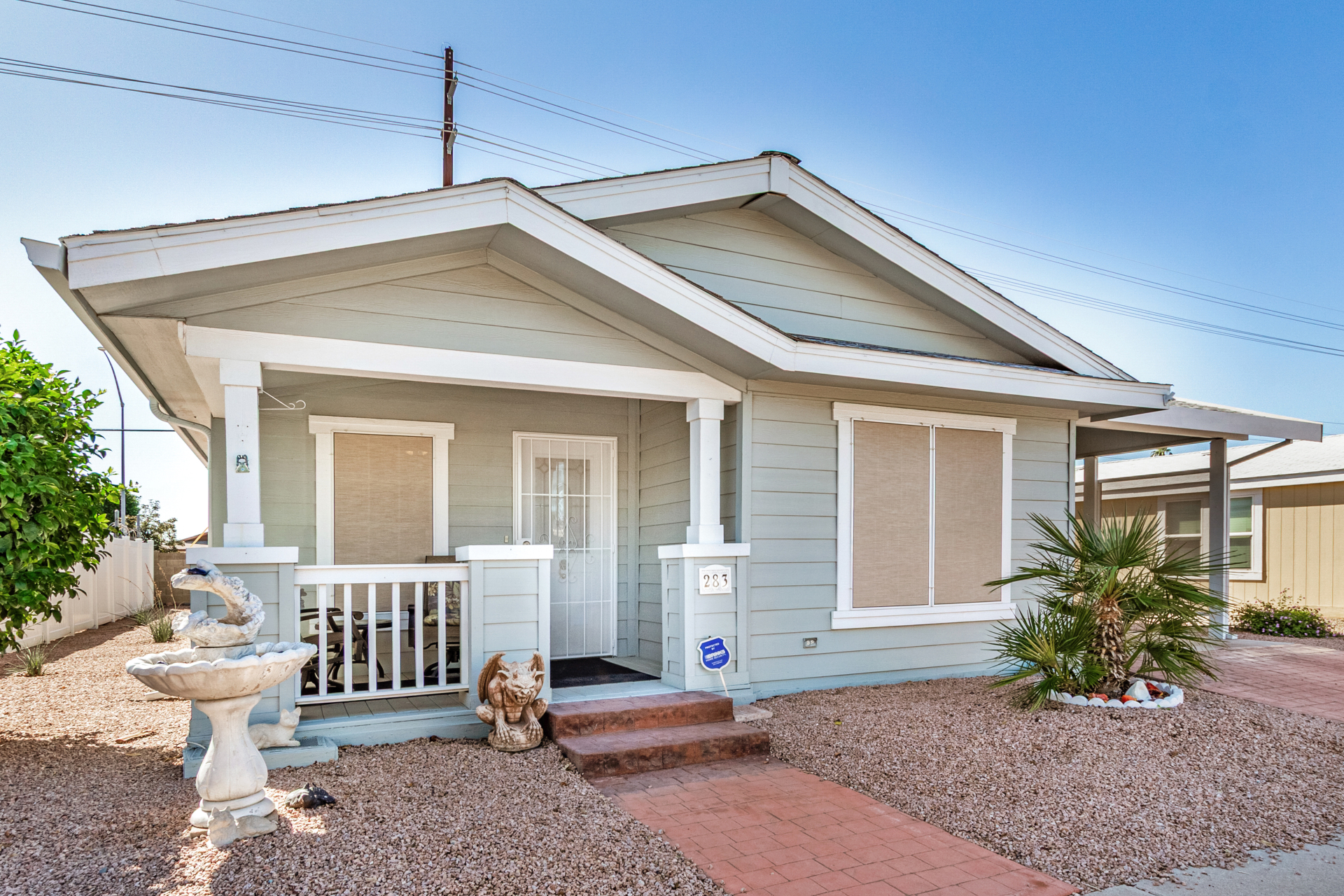 Gorgeous and meticulously cared for 2 bed, 2 bath + DEN with doors, all NEW interior paint, NEW carpet in all the bedrooms, LVP & tile flooring, separate breakfast room, faux wood blinds throughout, kitchen recessed lighting, NEWER privacy fencing with only 1 neighbor, rain gutters & mature trees. Sunshades throughout including the carport. Storage shed. Separate RV storage available. 1 year Old Republic Warranty provided. Kitchen table, hutch, silverware and glassware to remain with home. Water & trash included in lot rent. Community pool, clubhouse and laundry.