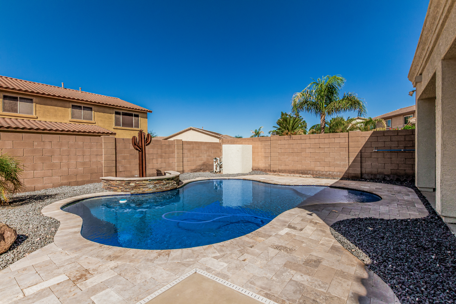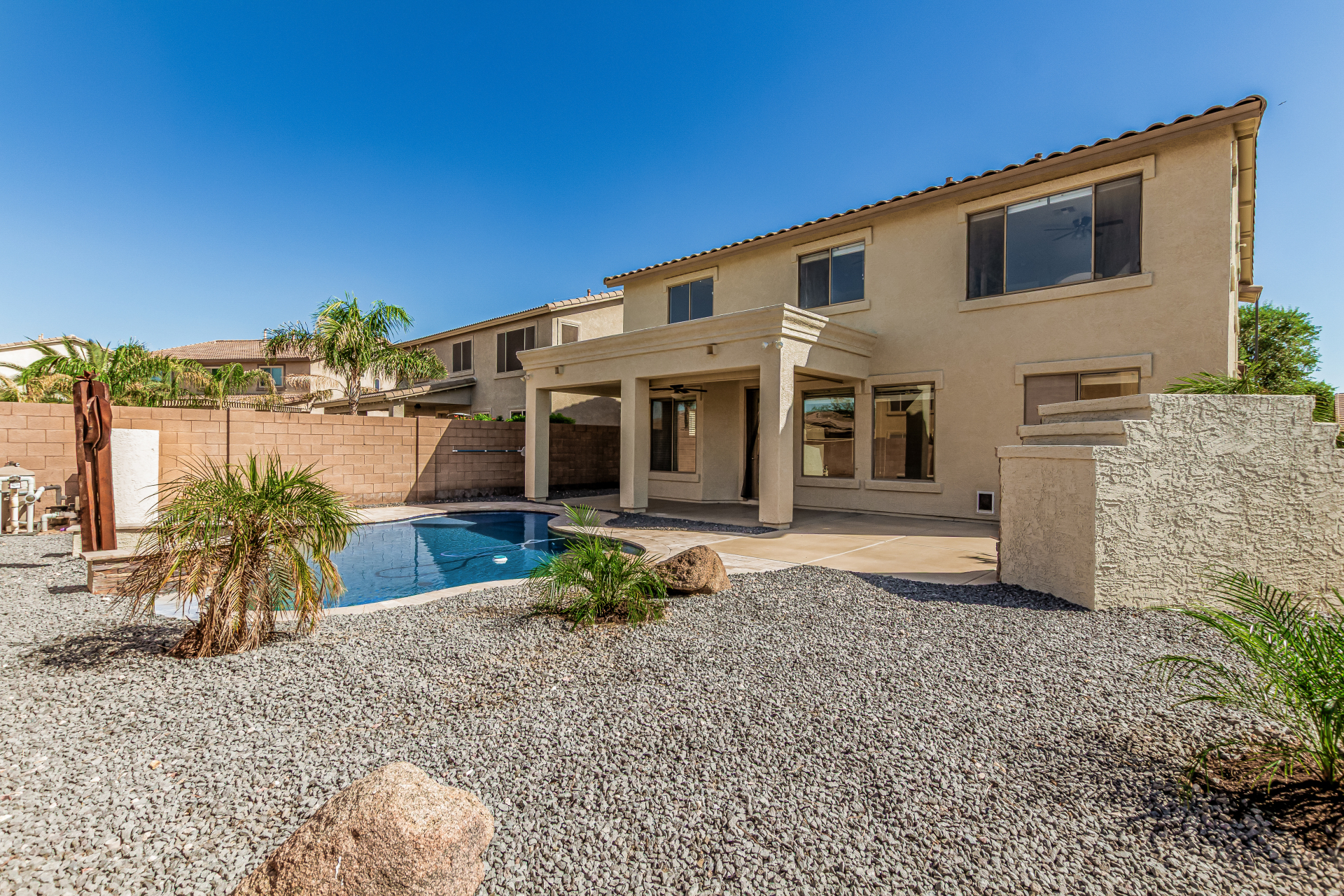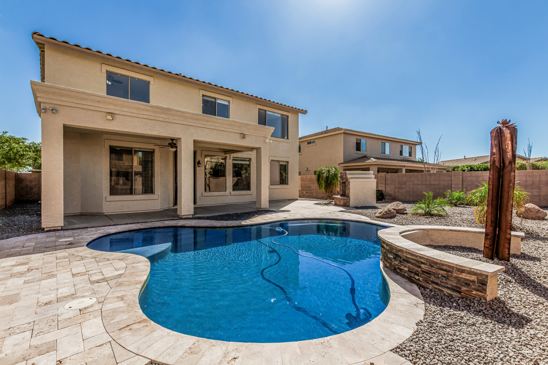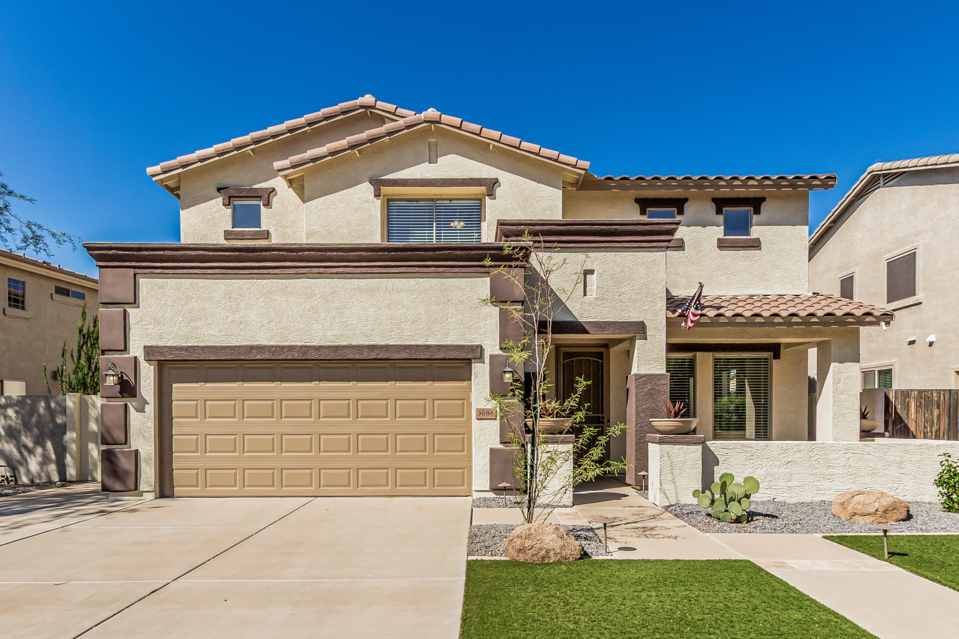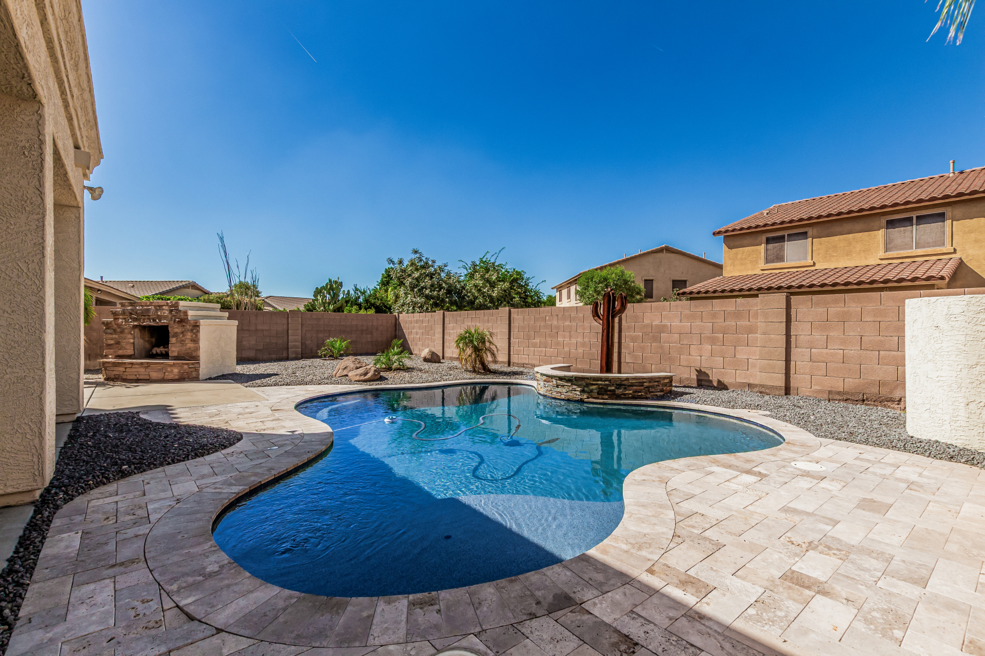 This stunning two-story pool home blends style and comfort just the way you need it! You'll first notice the beautifully manicured landscape, lovely front porch, and 3-car garage, inviting you to take a look inside. The interior shows generous living spaces with upgraded carpet, wood-look flooring, soaring ceilings, large windows, and arched passageways, providing abundant space for entertaining and relaxation. The pristine kitchen is a chef's delight, equipped with shaker cabinets, tile backsplash, granite countertops, SS appliances, and an island perfect for quick meals and casual conversations. The den and loft are ideal for a home office or a gaming area. You'll love the airy main retreat, complete with a walk-in closet for easy organization and a spa-like bathroom with double sinks and a separate shower & tub.