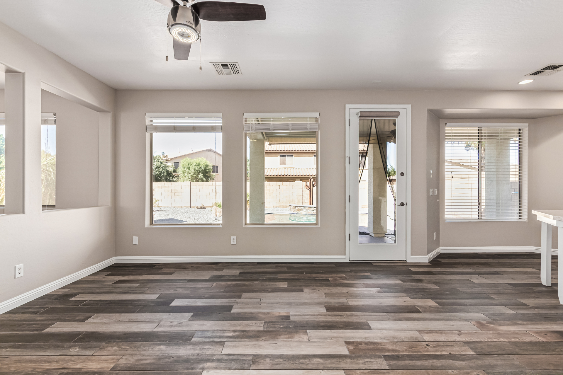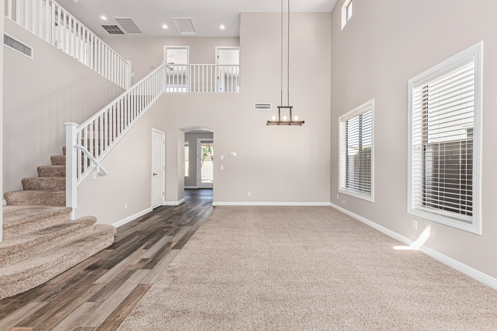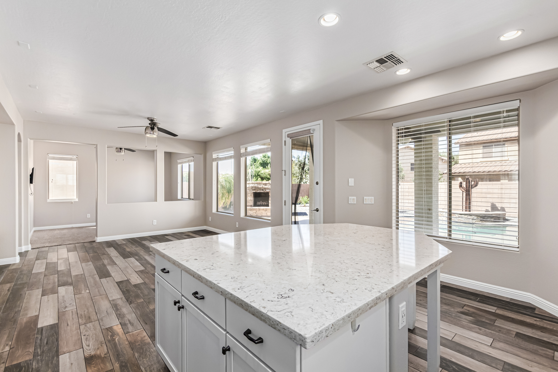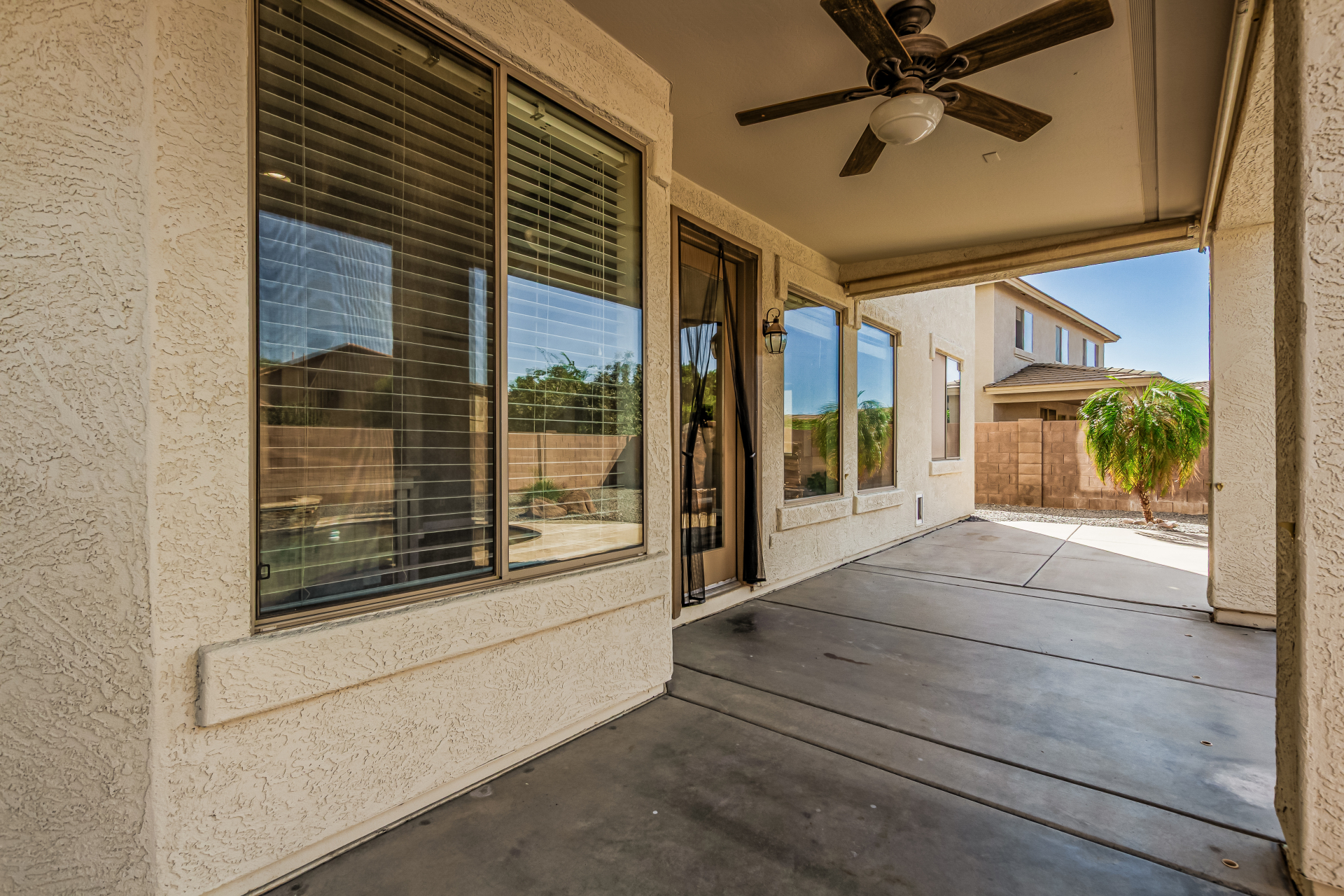 This stunning two-story pool home blends style and comfort just the way you need it! You'll first notice the beautifully manicured landscape, lovely front porch, and 3-car garage, inviting you to take a look inside. The interior shows generous living spaces with upgraded carpet, wood-look flooring, soaring ceilings, large windows, and arched passageways, providing abundant space for entertaining and relaxation. The pristine kitchen is a chef's delight, equipped with shaker cabinets, tile backsplash, granite countertops, SS appliances, and an island perfect for quick meals and casual conversations. The den and loft are ideal for a home office or a gaming area. You'll love the airy main retreat, complete with a walk-in closet for easy organization and a spa-like bathroom with double sinks and a separate shower & tub.