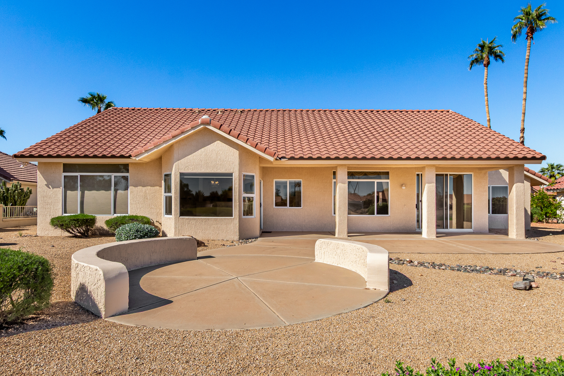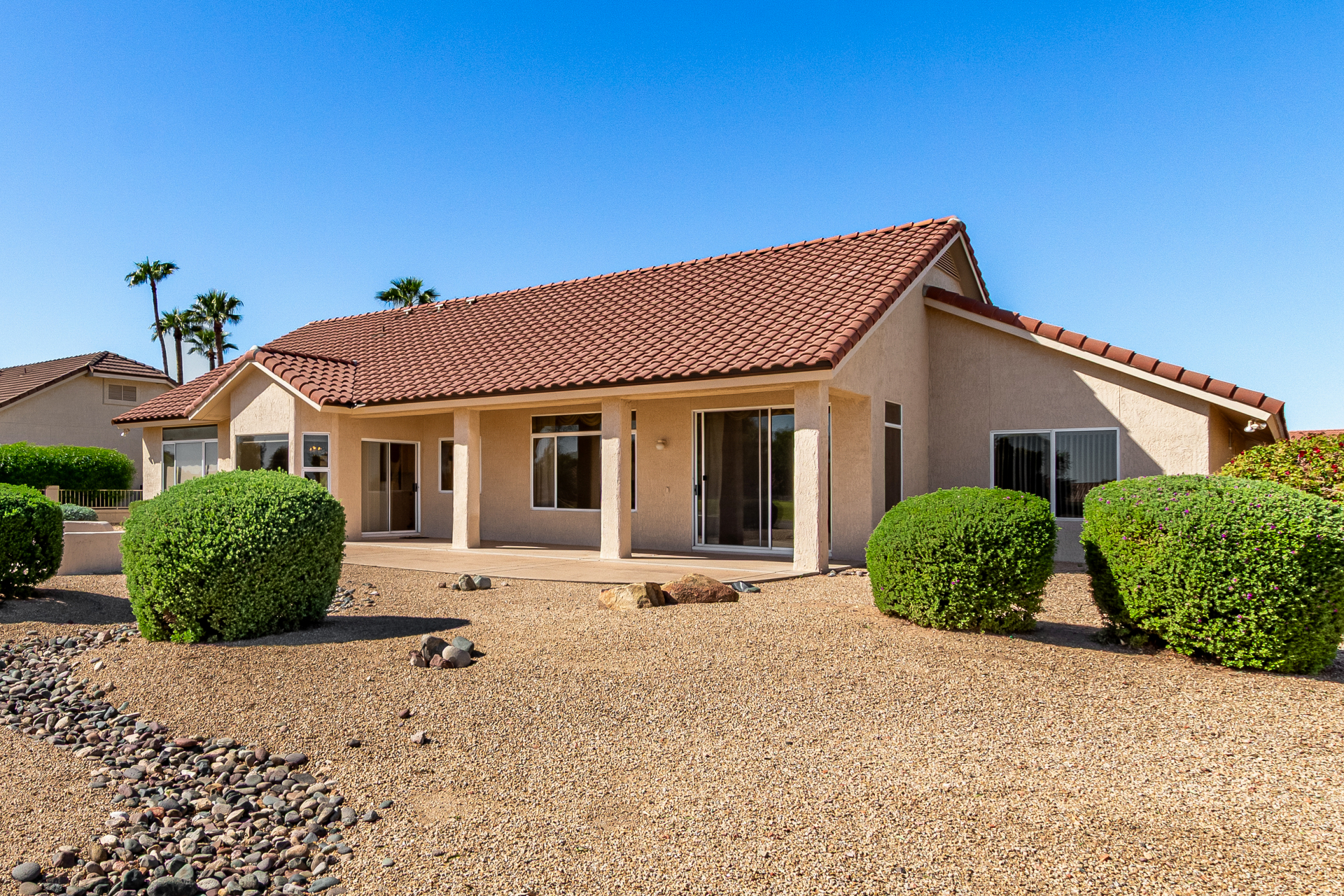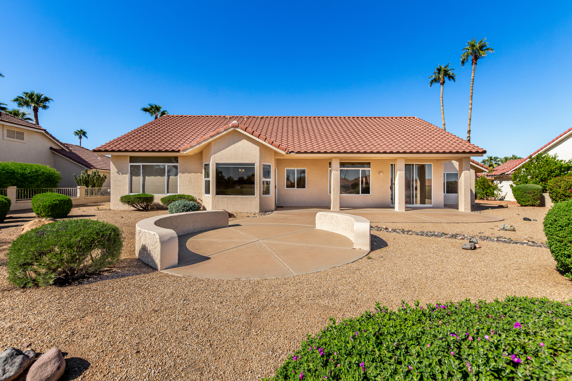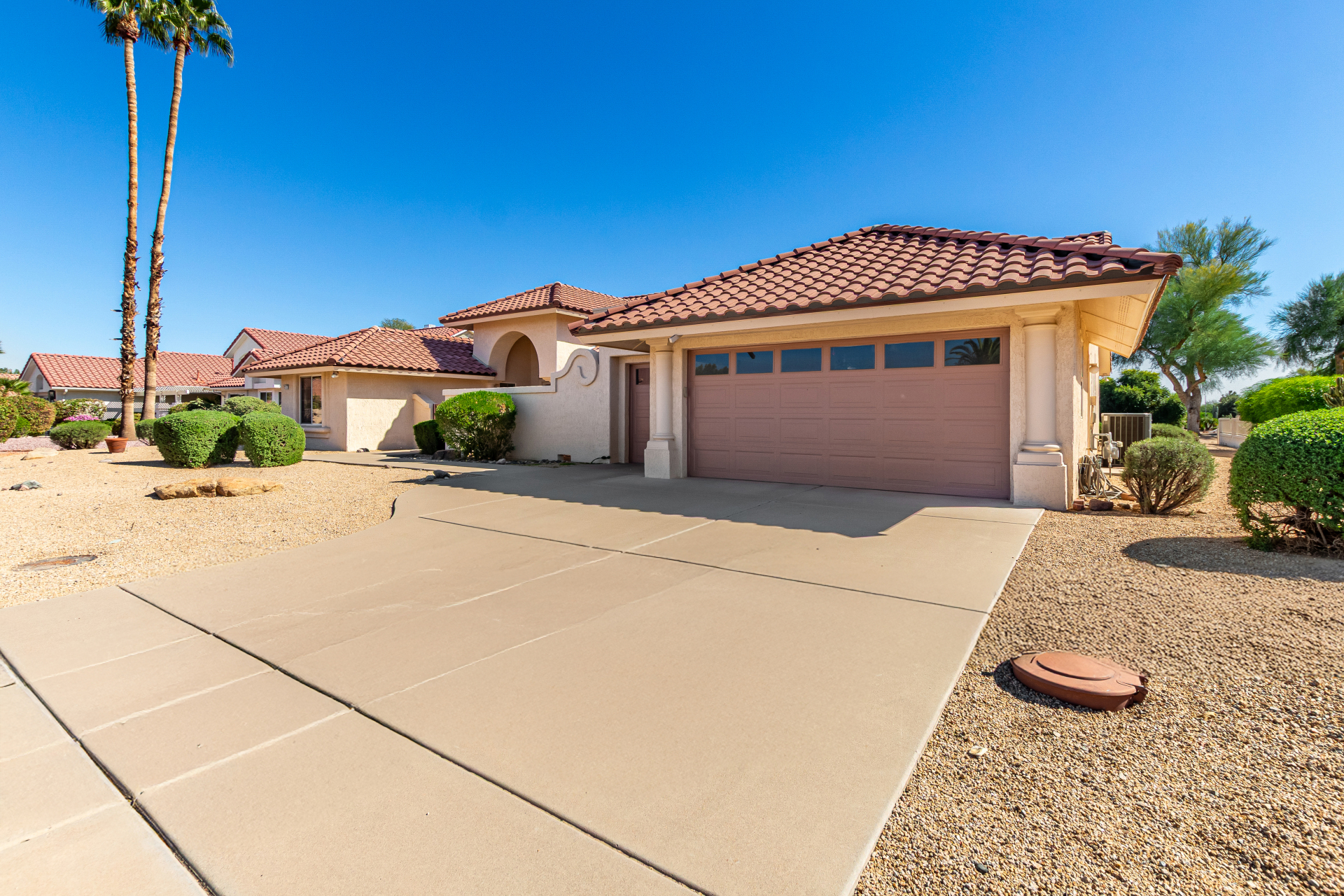 Golf course home in Sun City West with breathtaking lake views! This Montecito model charms with fantastic views of the course, fountain, and lake from nearly every room. Enjoy great curb appeal, low-maintenance landscaping, a 2-car garage, golf cart garage, and gated entryway. Inside, a spacious living/dining area flows effortlessly to the back patio, while the bright family room offers a semi-open layout filled with natural light. The kitchen boasts abundant cabinetry, ample counters, and built-in appliances. The main suite features a dual vanity, jetted tub, and walk-in closet. The laundry room with utility sink adds convenience. Relax on the patio and enjoy tranquil sunsets over the lush fairways!