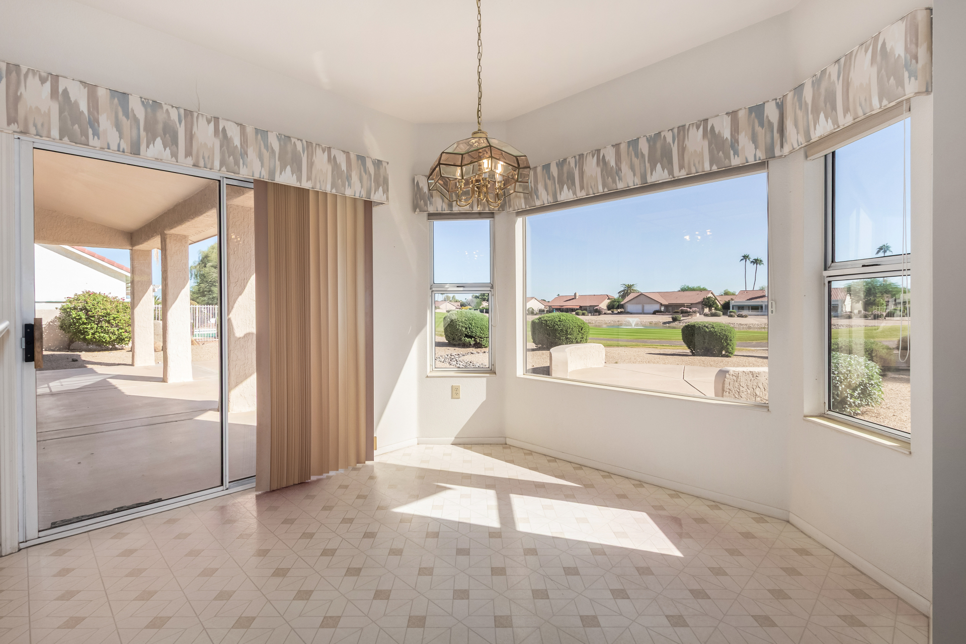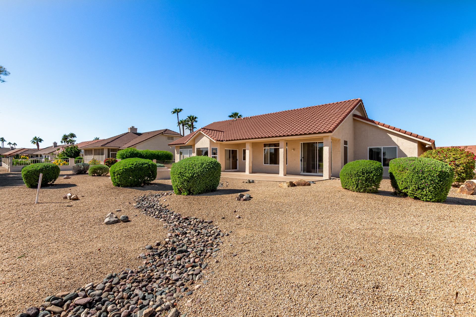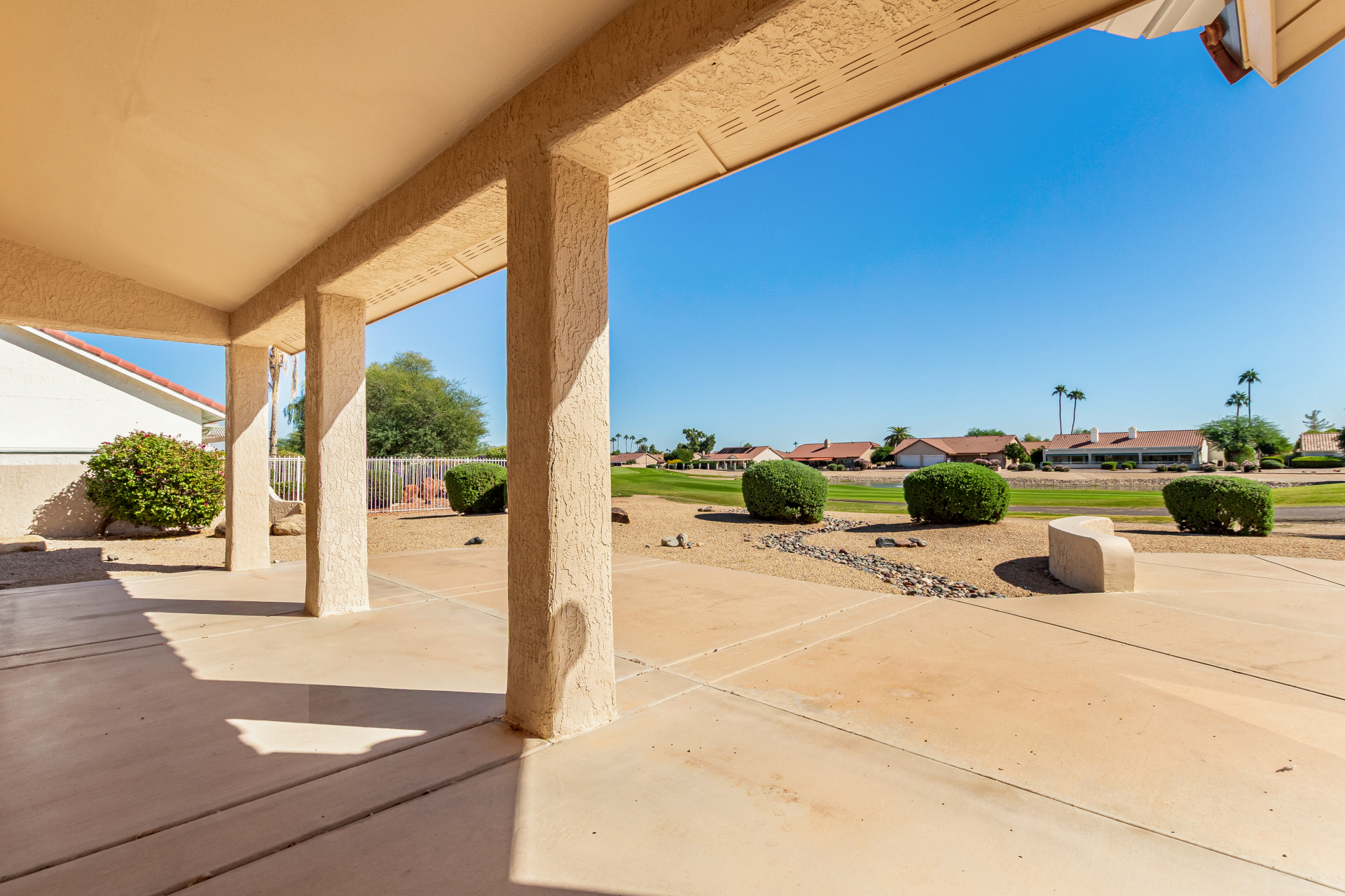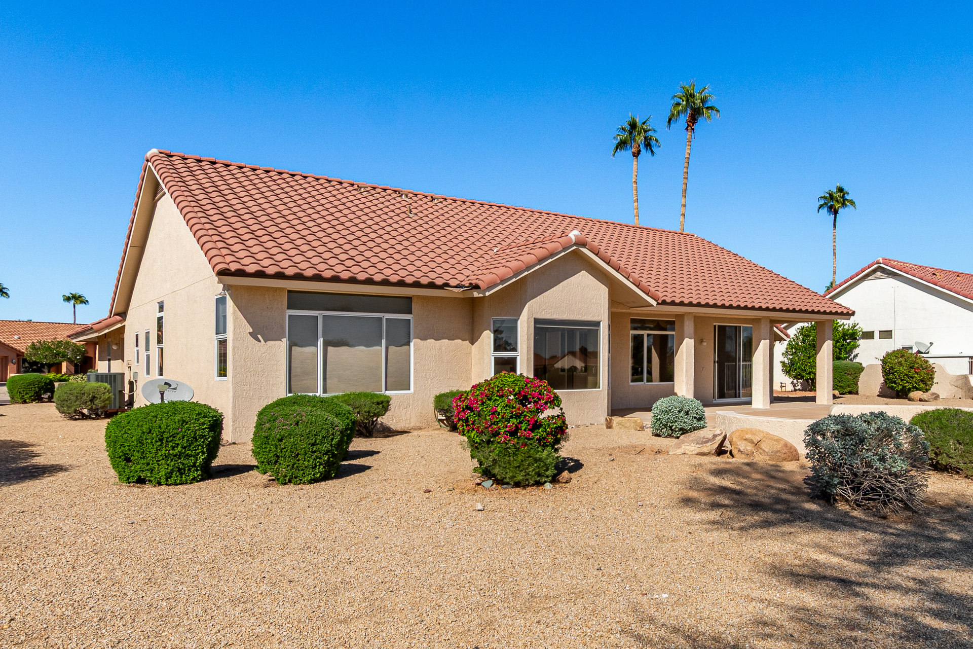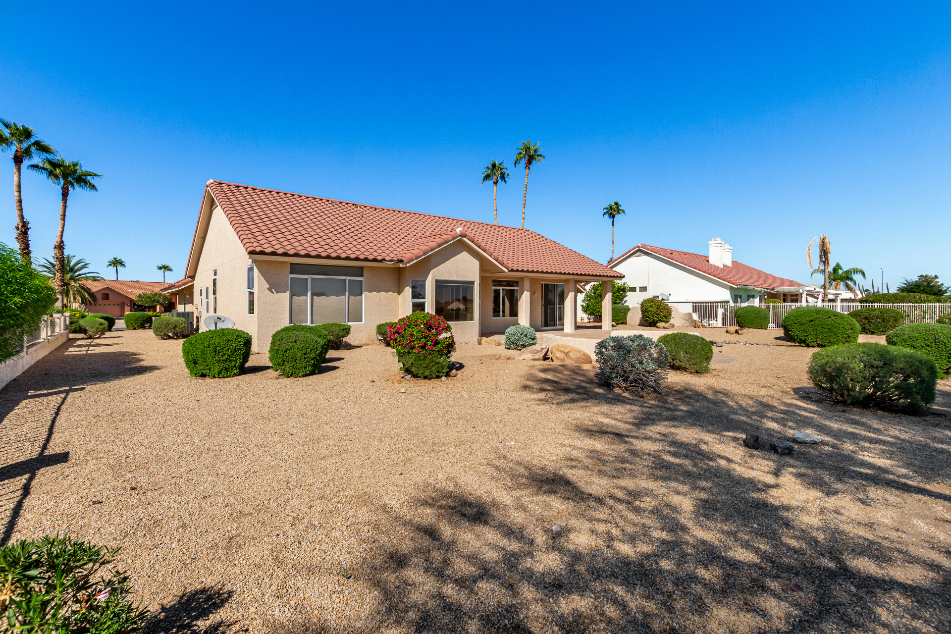 Golf course home in Sun City West with breathtaking lake views! This Montecito model charms with fantastic views of the course, fountain, and lake from nearly every room. Enjoy great curb appeal, low-maintenance landscaping, a 2-car garage, golf cart garage, and gated entryway. Inside, a spacious living/dining area flows effortlessly to the back patio, while the bright family room offers a semi-open layout filled with natural light. The kitchen boasts abundant cabinetry, ample counters, and built-in appliances. The main suite features a dual vanity, jetted tub, and walk-in closet. The laundry room with utility sink adds convenience. Relax on the patio and enjoy tranquil sunsets over the lush fairways!
