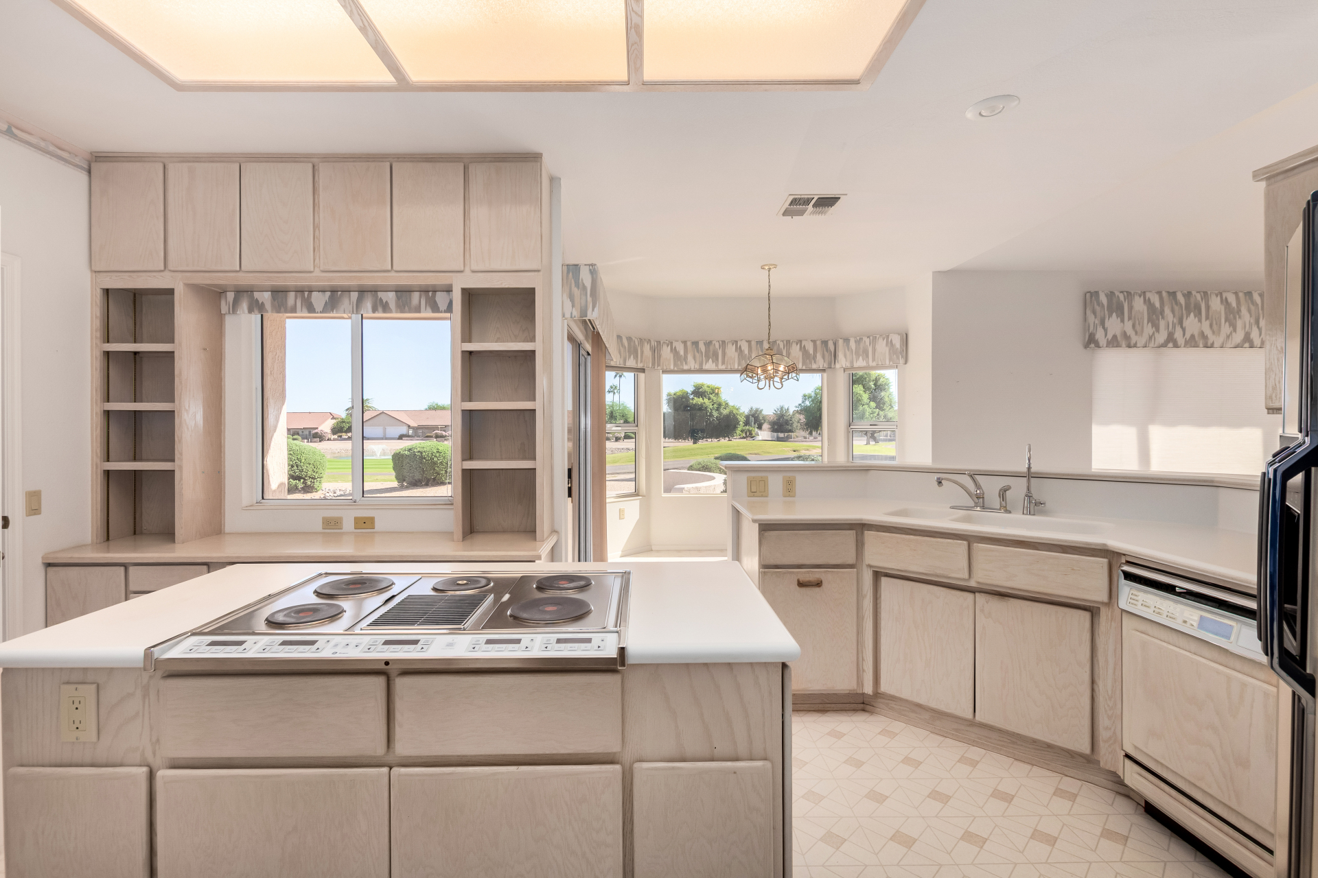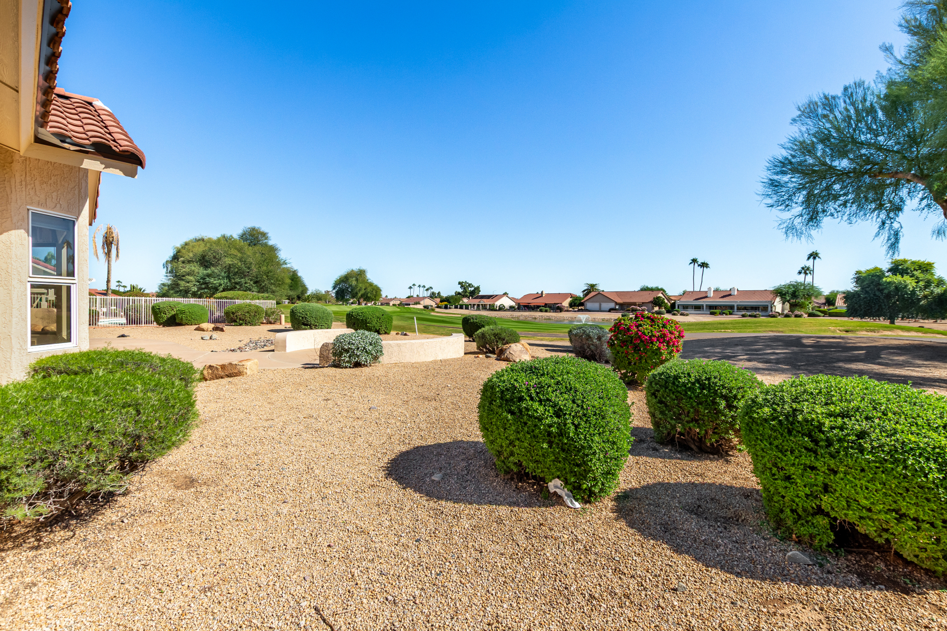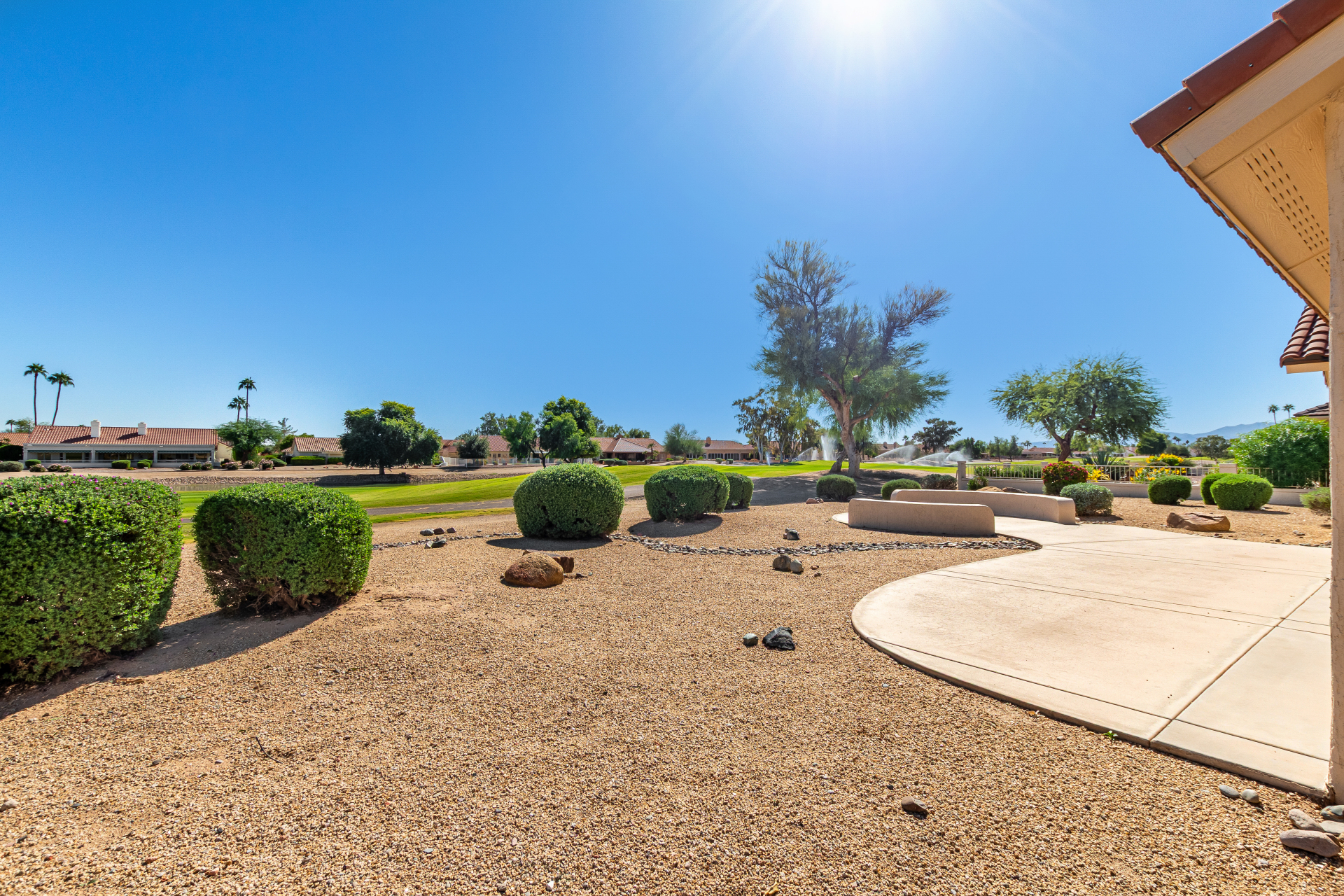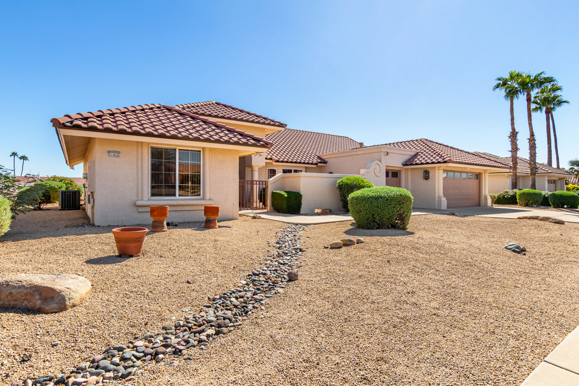 Golf course home in Sun City West with breathtaking lake views! This Montecito model charms with fantastic views of the course, fountain, and lake from nearly every room. Enjoy great curb appeal, low-maintenance landscaping, a 2-car garage, golf cart garage, and gated entryway. Inside, a spacious living/dining area flows effortlessly to the back patio, while the bright family room offers a semi-open layout filled with natural light. The kitchen boasts abundant cabinetry, ample counters, and built-in appliances. The main suite features a dual vanity, jetted tub, and walk-in closet. The laundry room with utility sink adds convenience. Relax on the patio and enjoy tranquil sunsets over the lush fairways!