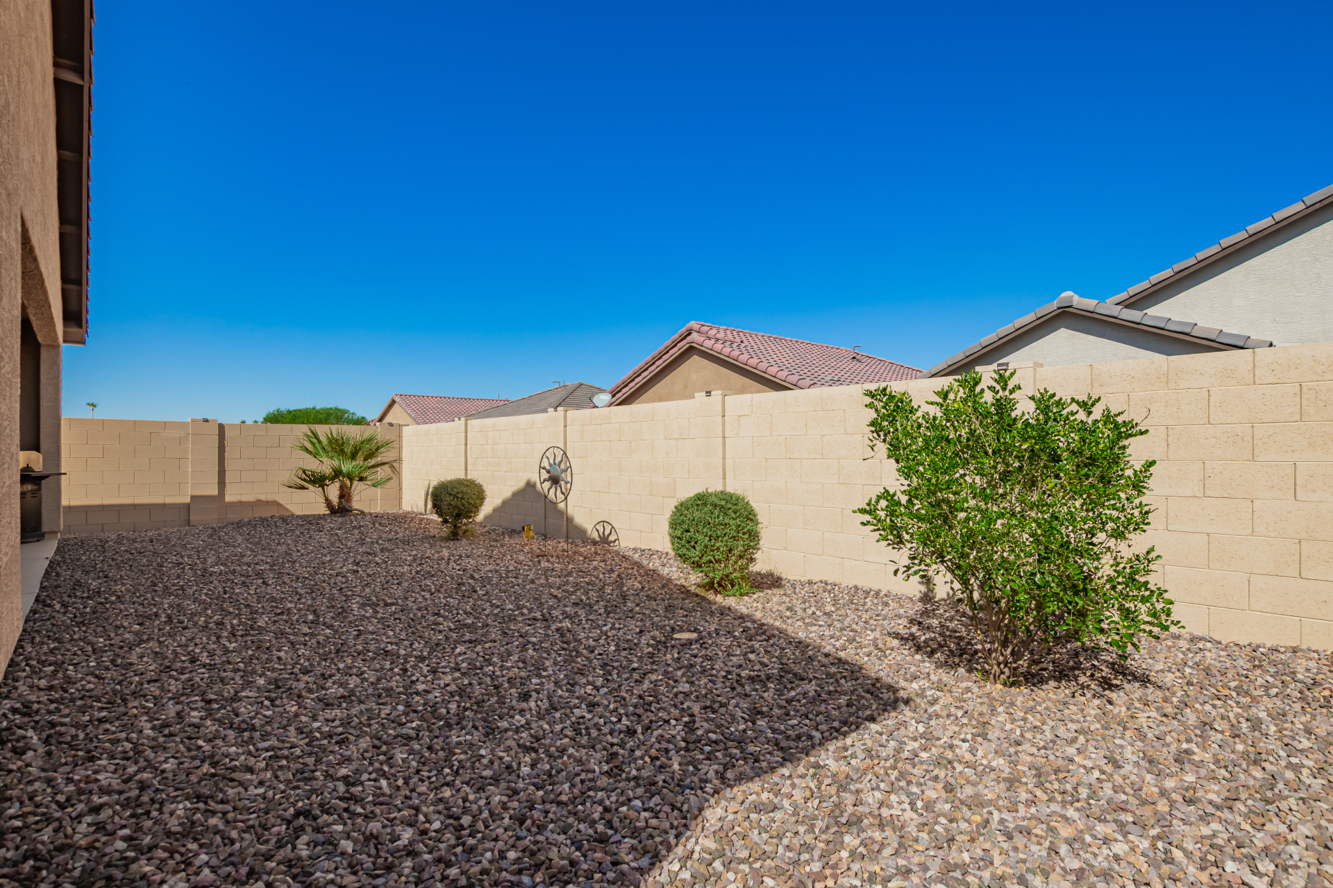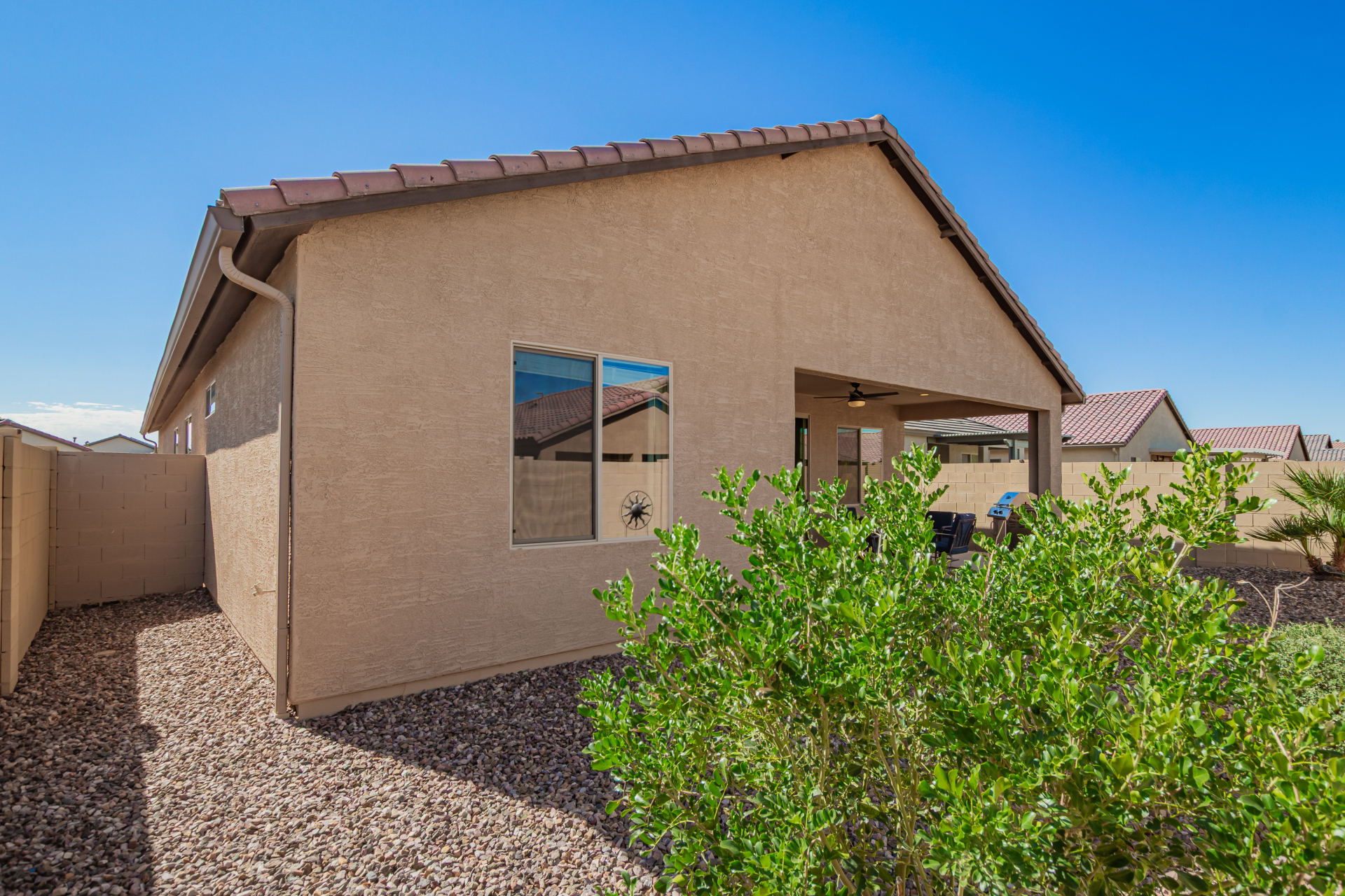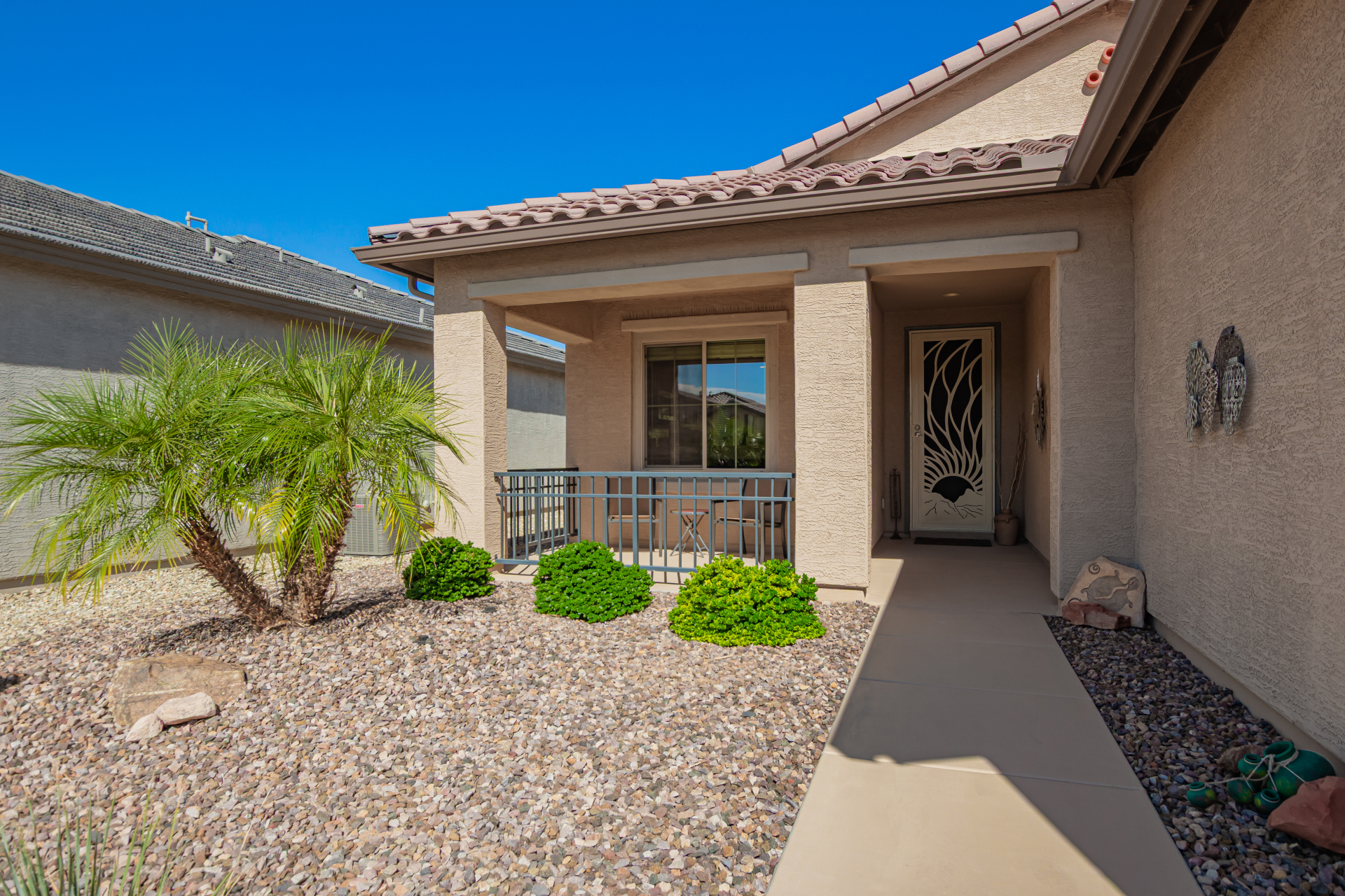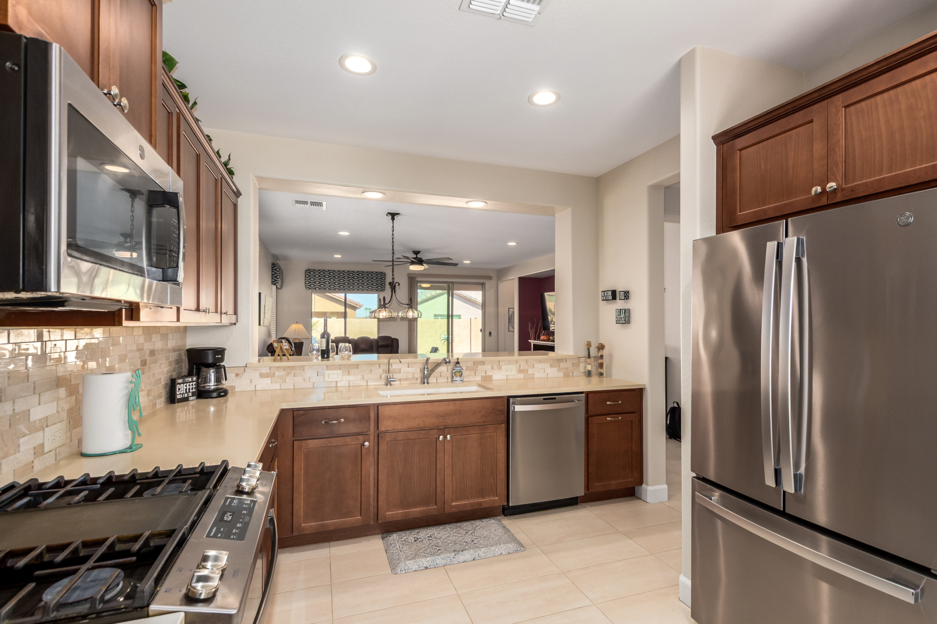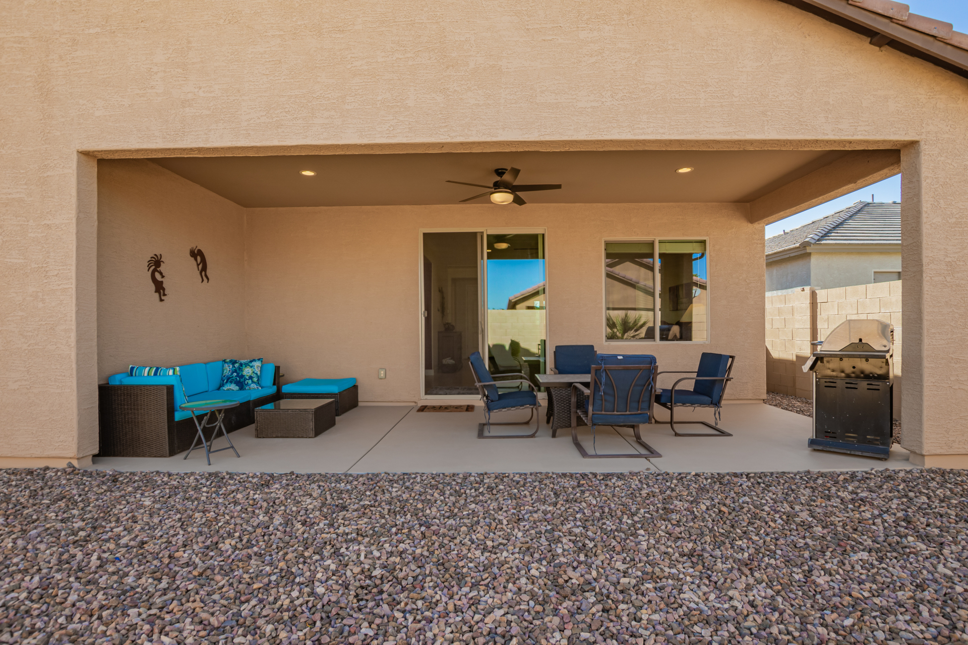 Live your best life in this beautifully furnished single-level home in the vibrant community of Robson Ranch Arizona! Designed for comfort and easy living, this gem welcomes you with a covered front porch and light-filled interiors. Inside, you'll find elegant light tile floors and an entertainer's kitchen with quartz counters, rich wood cabinets, stainless steel appliances, a walk-in pantry, and a bright front window overlooking the porch. The open dining area flows seamlessly into the inviting great room, featuring a free-standing fireplace, mounted TV, and reclining loungers perfect for relaxing or hosting friends. Step outside to your covered patio with epoxy flooring, complete with BBQ, gas stub, patio furniture, and a ceiling fan for year-round enjoyment.