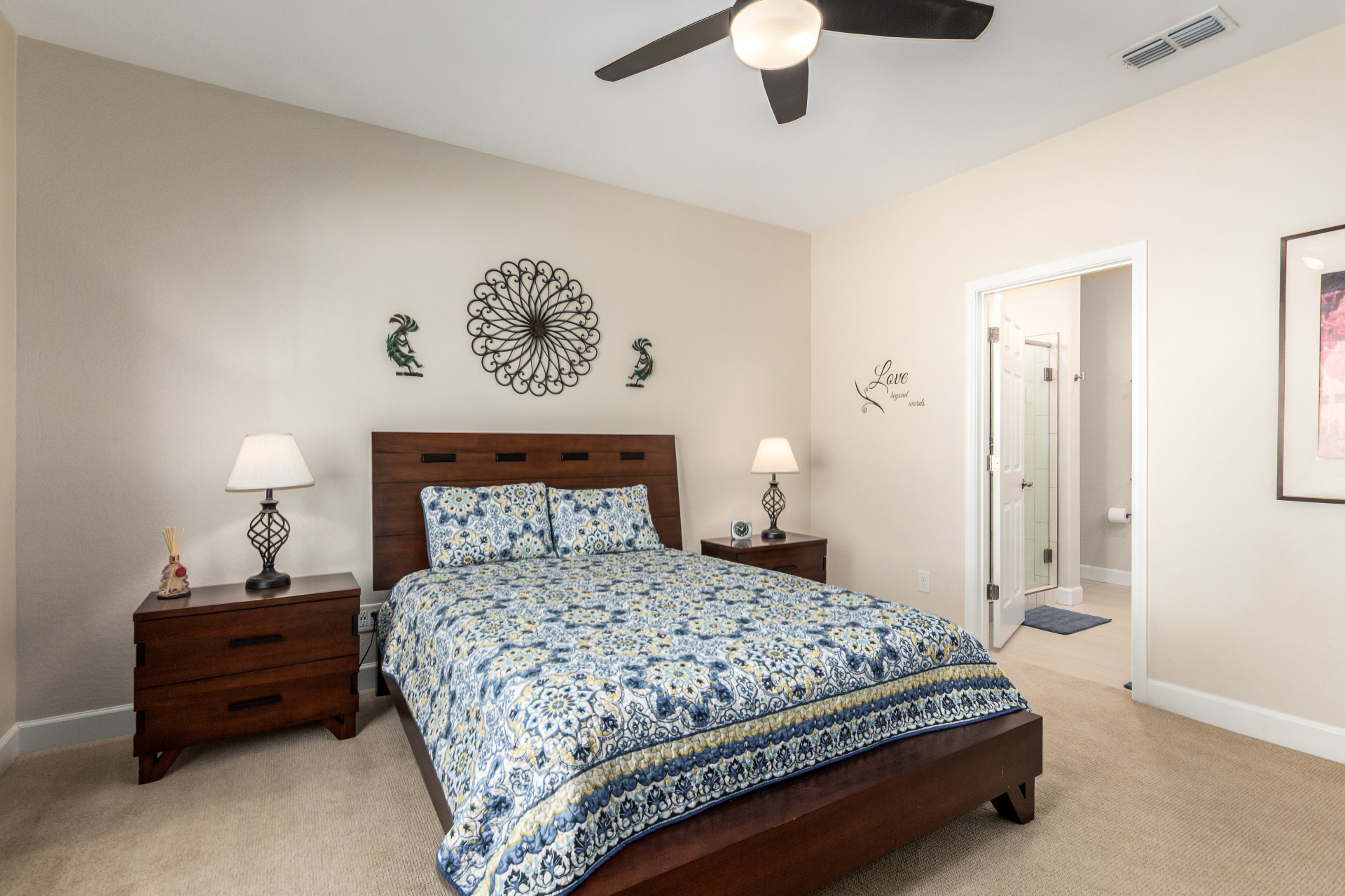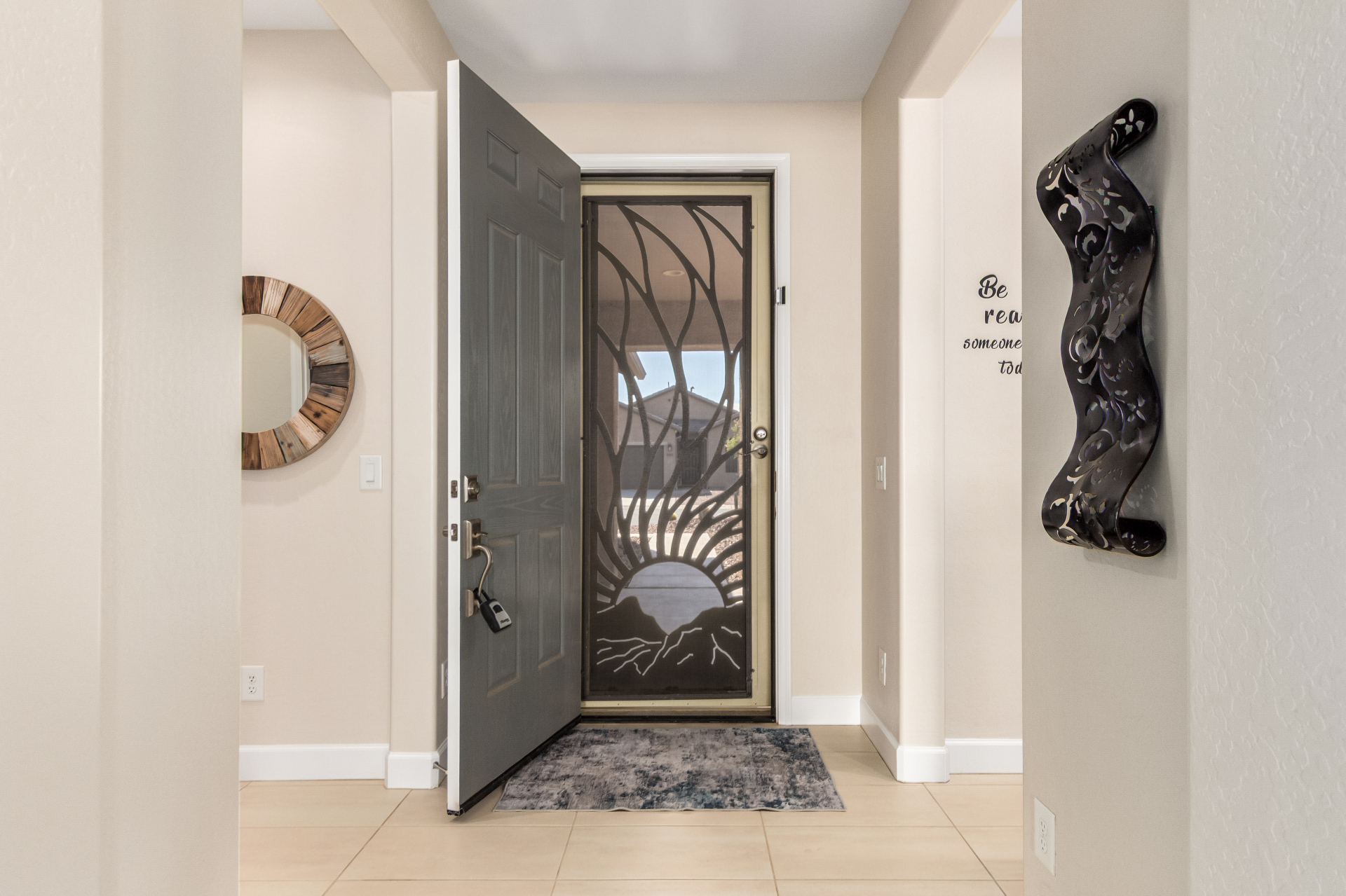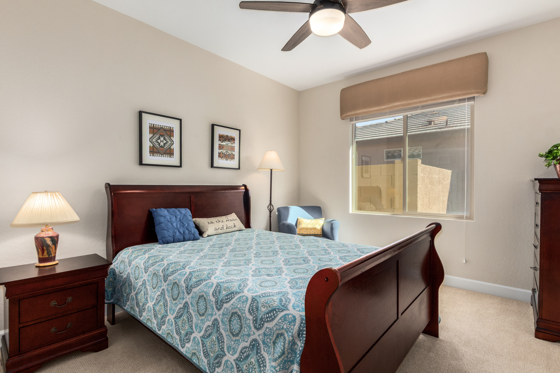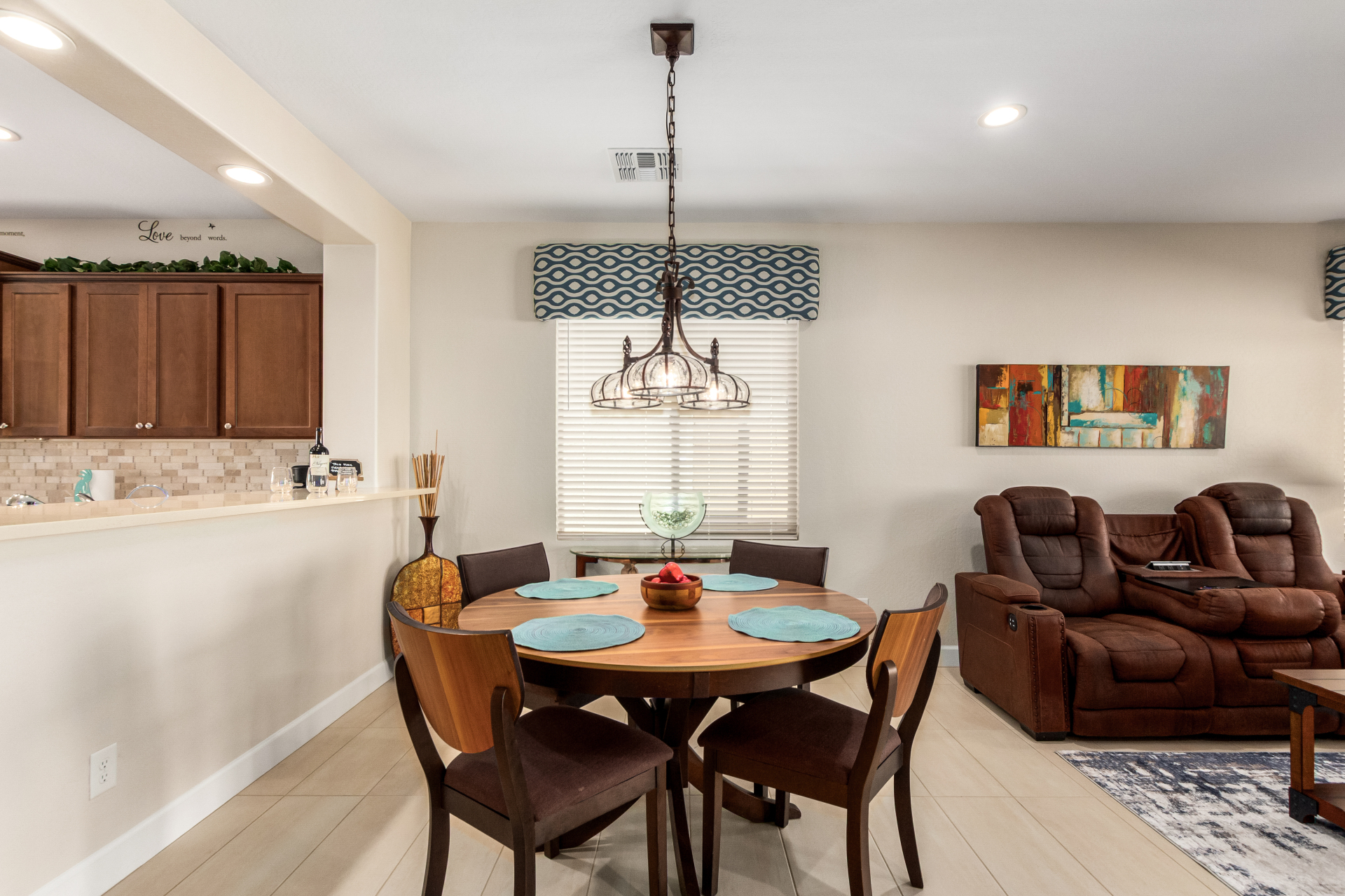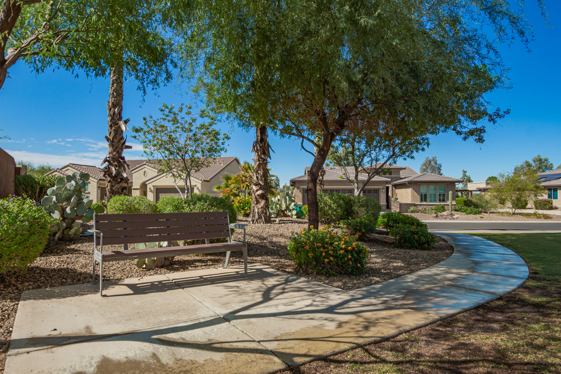 Live your best life in this beautifully furnished single-level home in the vibrant community of Robson Ranch Arizona! Designed for comfort and easy living, this gem welcomes you with a covered front porch and light-filled interiors. Inside, you'll find elegant light tile floors and an entertainer's kitchen with quartz counters, rich wood cabinets, stainless steel appliances, a walk-in pantry, and a bright front window overlooking the porch. The open dining area flows seamlessly into the inviting great room, featuring a free-standing fireplace, mounted TV, and reclining loungers perfect for relaxing or hosting friends. Step outside to your covered patio with epoxy flooring, complete with BBQ, gas stub, patio furniture, and a ceiling fan for year-round enjoyment.