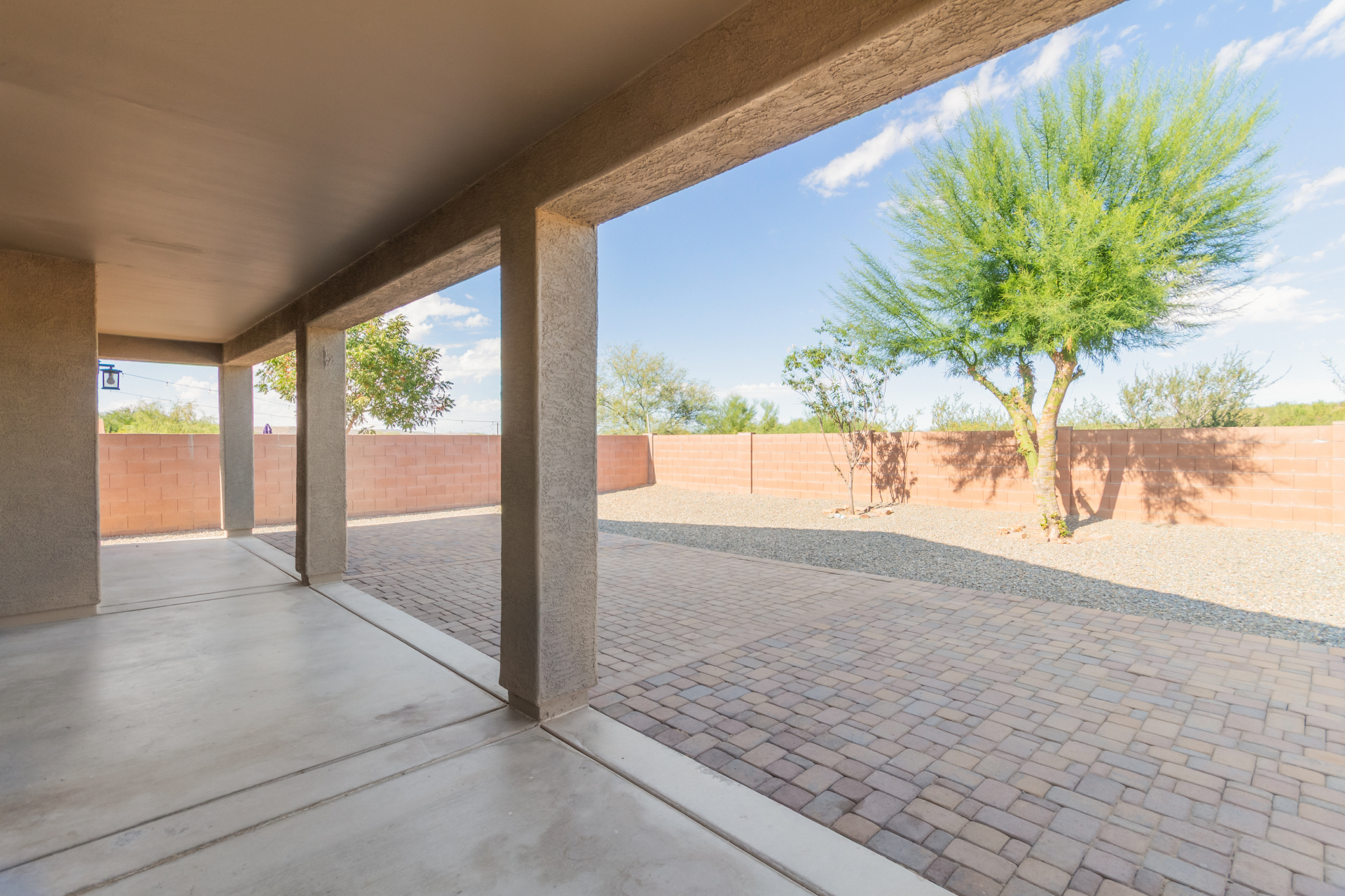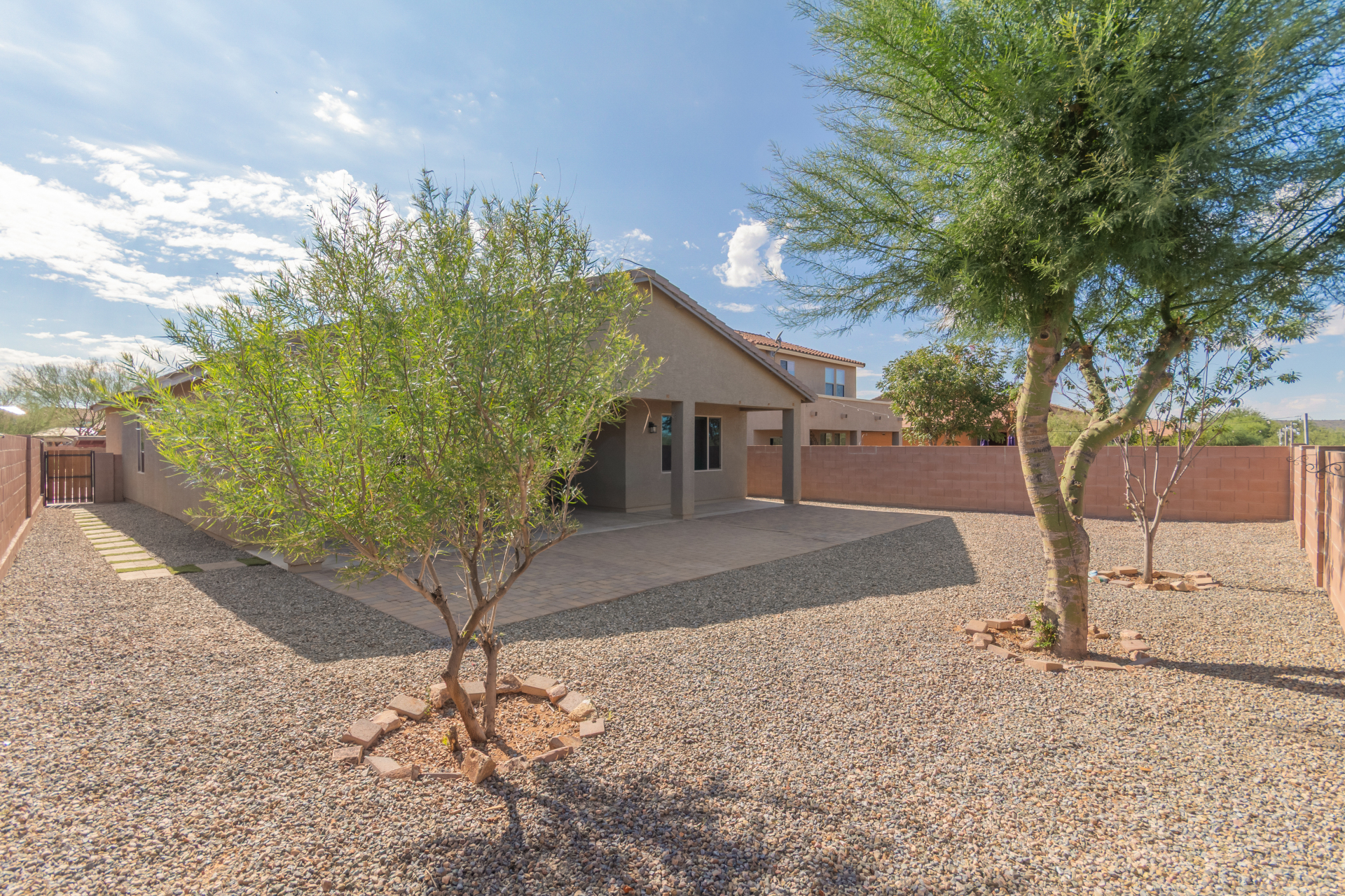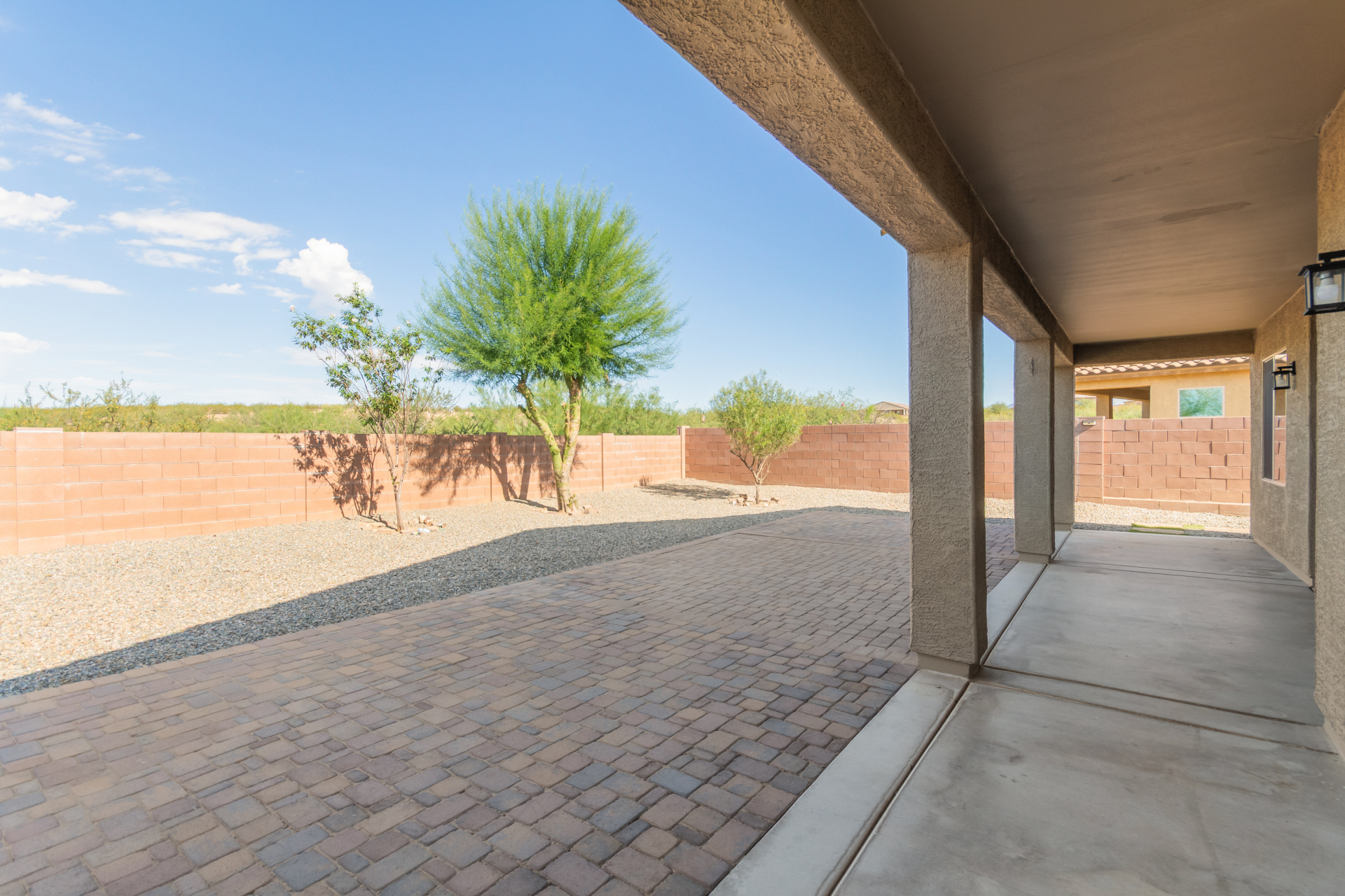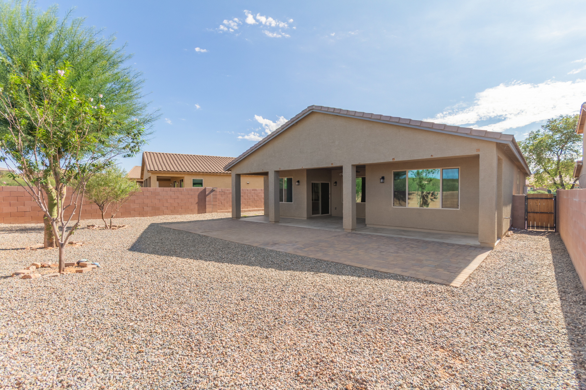You'll love the great curb appeal and a welcoming 2-car garage. Explore the open layout showcasing tile flooring, neutral tones, and abundant natural light. Wide-open kitchen features a large island with a breakfast bar, stainless steel appliances, recessed lighting, wood cabinetry, granite counters, and a pantry for extra storage. The main bedroom offers a relaxing retreat with direct backyard access, a walk-in closet, and a gorgeous bathroom complete with a step-in shower and dual vanities. Outside, enjoy a private and serene backyard highlighted by a covered patio, lovely pavers, and shade trees--the perfect setting for outdoor gatherings or quiet relaxation. Make it yours!