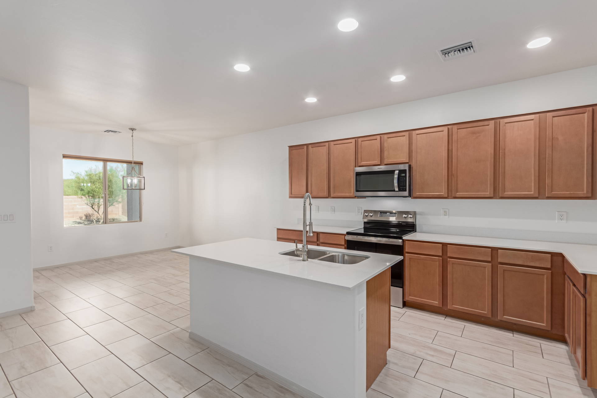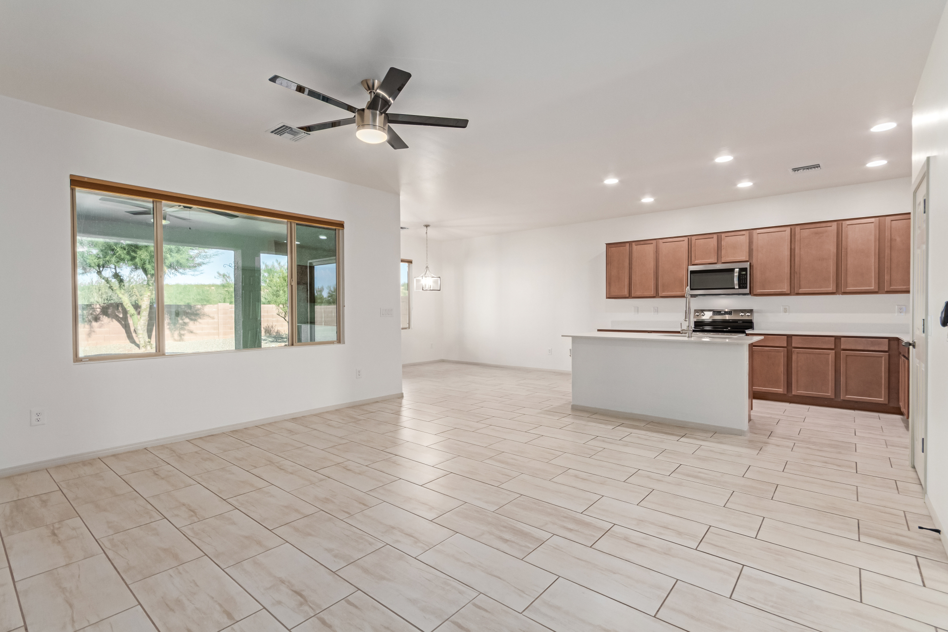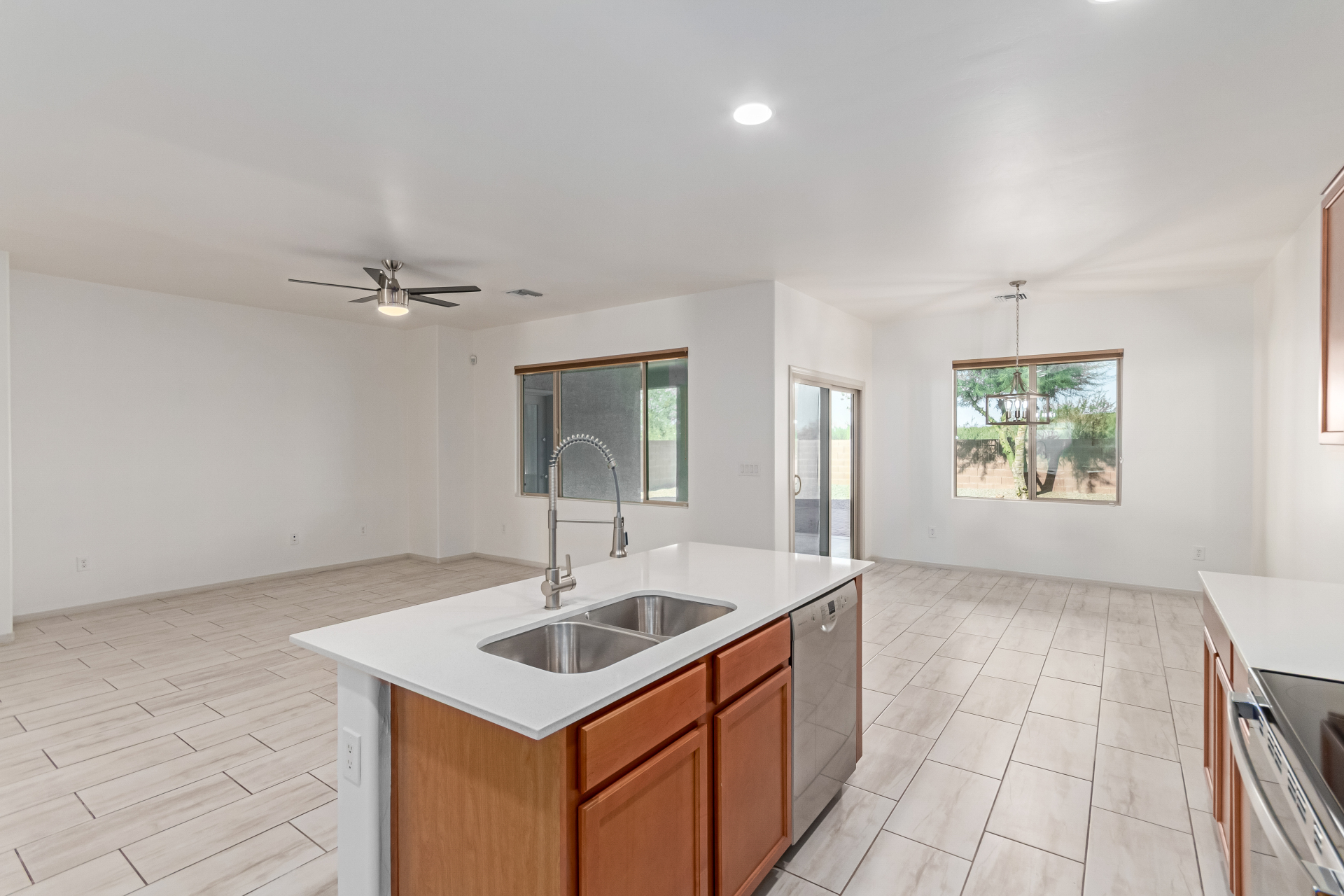 You'll love the great curb appeal and a welcoming 2-car garage. Explore the open layout showcasing tile flooring, neutral tones, and abundant natural light. Wide-open kitchen features a large island with a breakfast bar, stainless steel appliances, recessed lighting, wood cabinetry, granite counters, and a pantry for extra storage. The main bedroom offers a relaxing retreat with direct backyard access, a walk-in closet, and a gorgeous bathroom complete with a step-in shower and dual vanities. Outside, enjoy a private and serene backyard highlighted by a covered patio, lovely pavers, and shade trees--the perfect setting for outdoor gatherings or quiet relaxation. Make it yours!