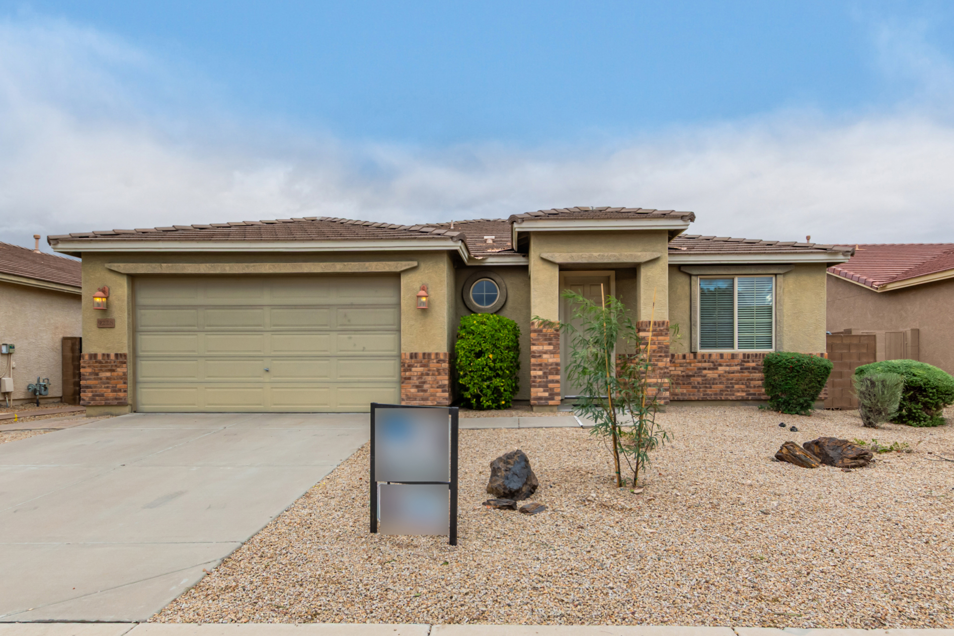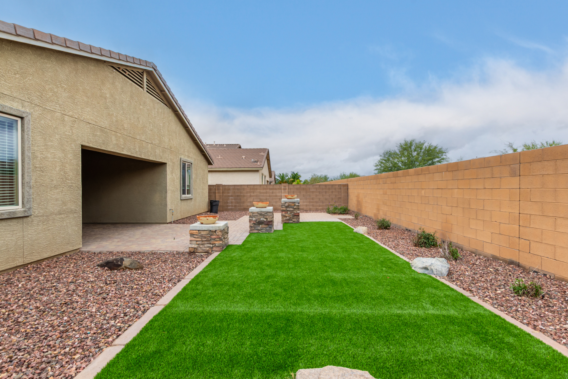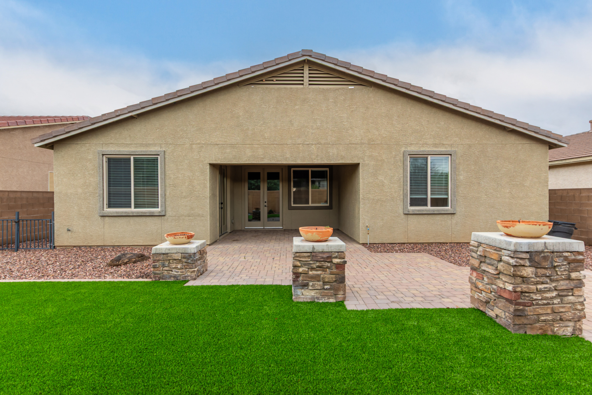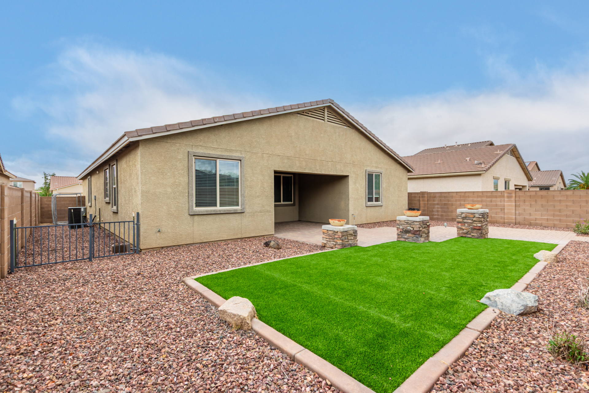 Take advantage of this fantastic rental opportunity! This stunning residence welcomes you with a 2-car garage, charming brick accents, & breathtaking mountain views. Discover a captivating open layout with high ceilings, a soothing palette, blinds, & durable tile flooring. The kitchen has granite counters, abundant wood cabinets with crown moulding, recessed lighting, built-in appliances, a pantry, & a two-tier island with a breakfast bar. Double doors lead to a versatile den, ideal for an office or lounge! The main bedroom showcases soft carpeting, backyard access, an ensuite with dual sinks, & a walk-in closet. Imagine enchanting evenings in the backyard, which offers a covered patio, stylish pavers, & artificial turf for outdoor activities. Don't miss out on this incredible gem!