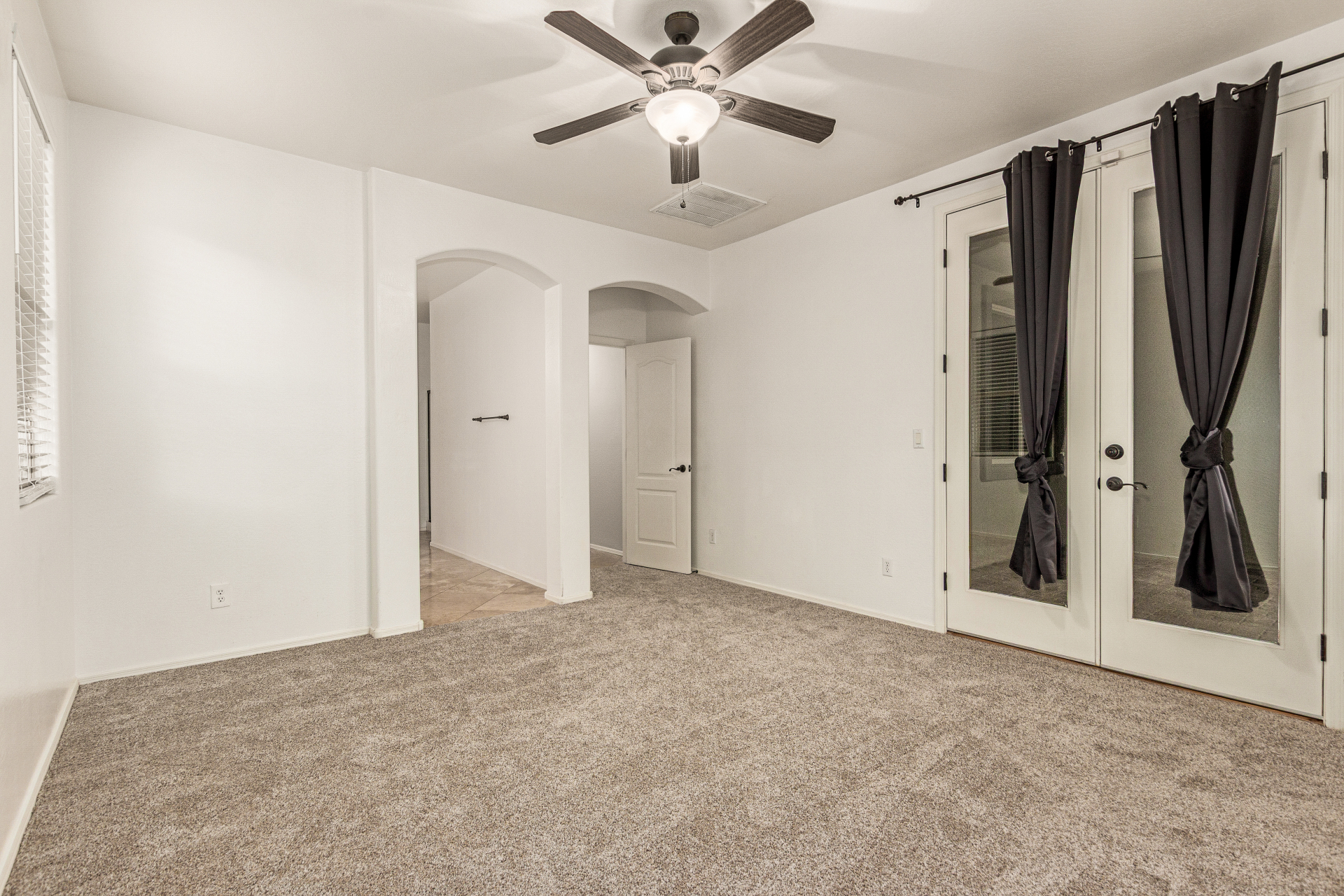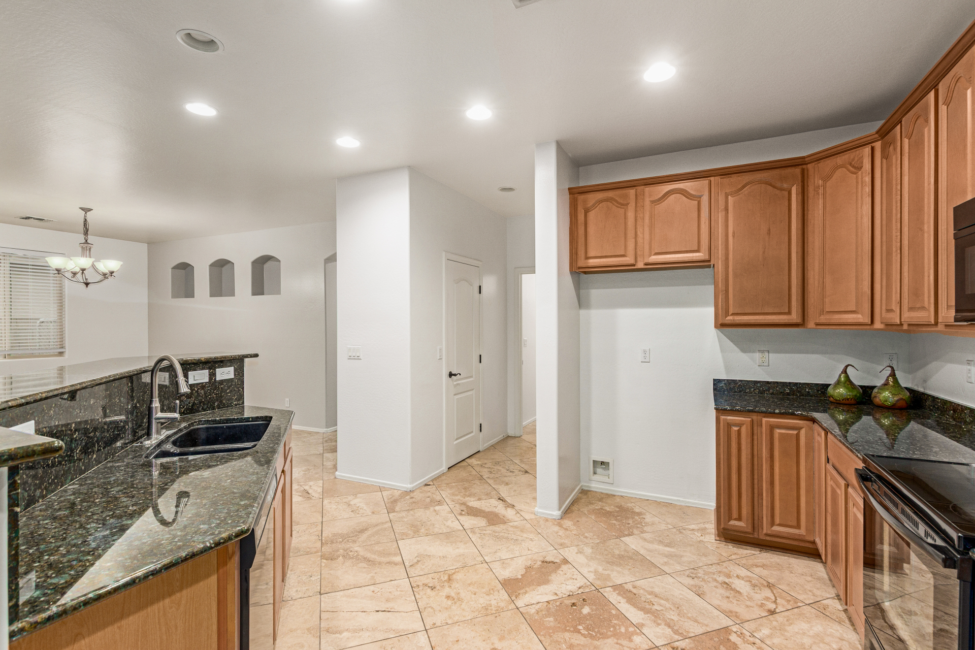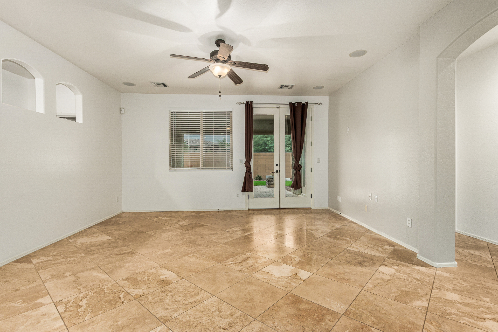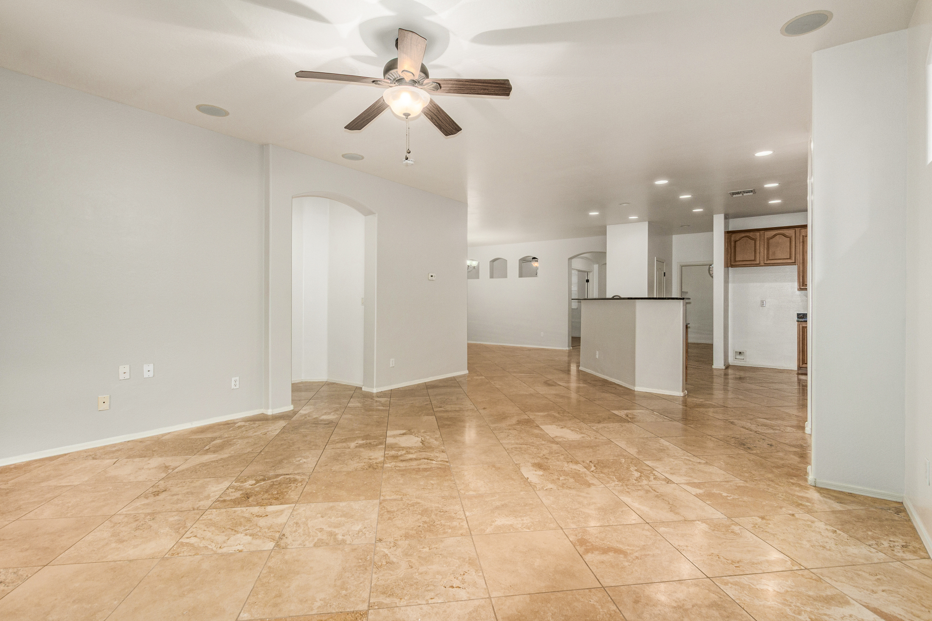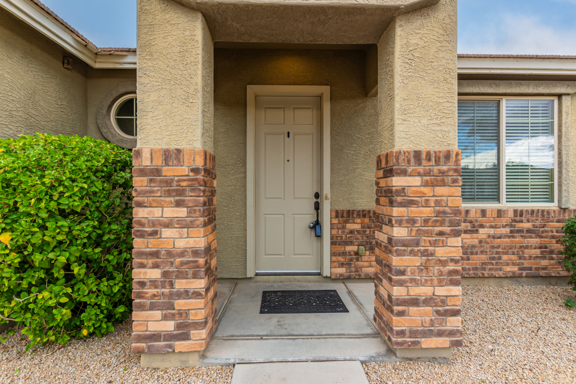 Take advantage of this fantastic rental opportunity! This stunning residence welcomes you with a 2-car garage, charming brick accents, & breathtaking mountain views. Discover a captivating open layout with high ceilings, a soothing palette, blinds, & durable tile flooring. The kitchen has granite counters, abundant wood cabinets with crown moulding, recessed lighting, built-in appliances, a pantry, & a two-tier island with a breakfast bar. Double doors lead to a versatile den, ideal for an office or lounge! The main bedroom showcases soft carpeting, backyard access, an ensuite with dual sinks, & a walk-in closet. Imagine enchanting evenings in the backyard, which offers a covered patio, stylish pavers, & artificial turf for outdoor activities. Don't miss out on this incredible gem!