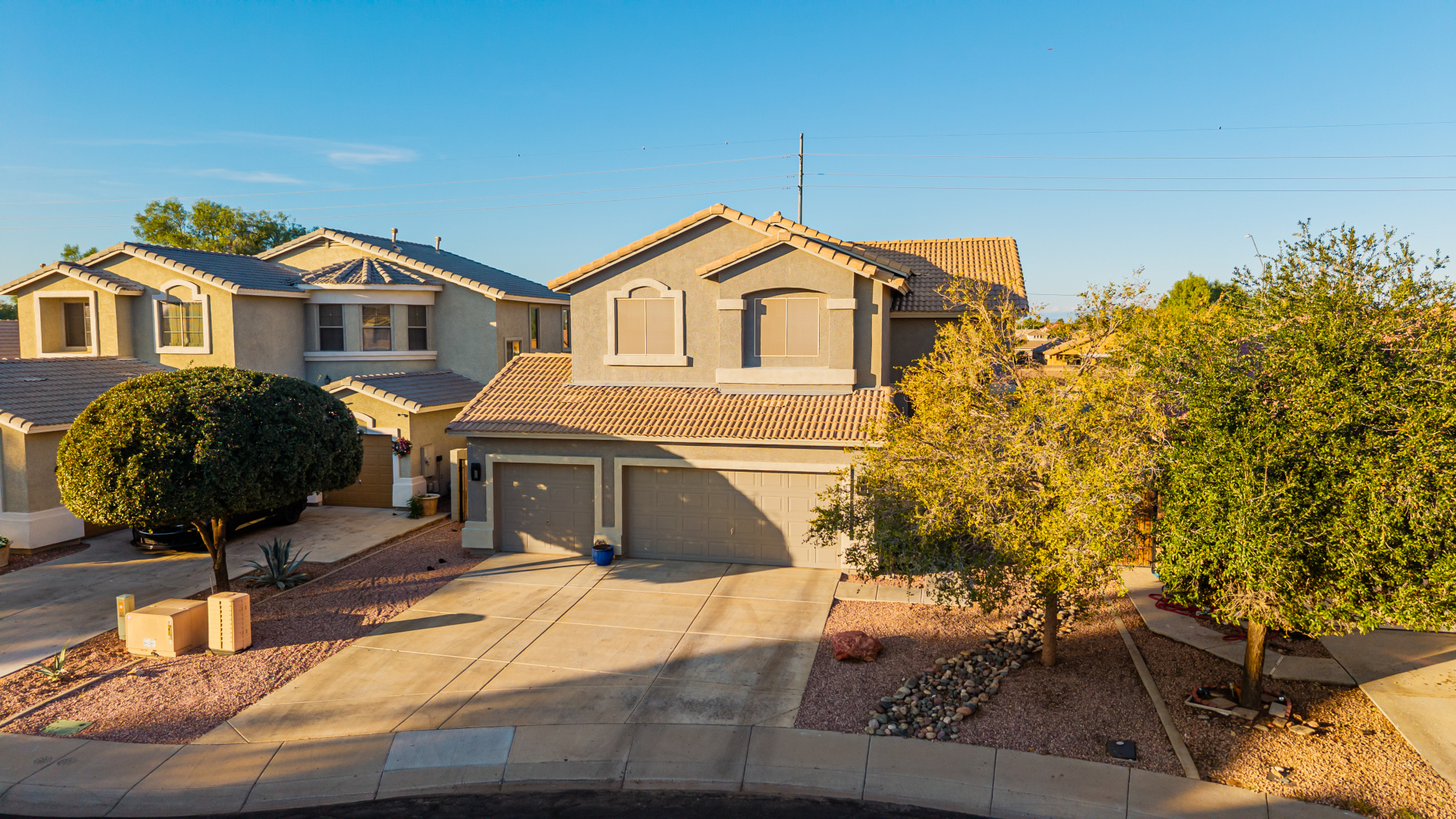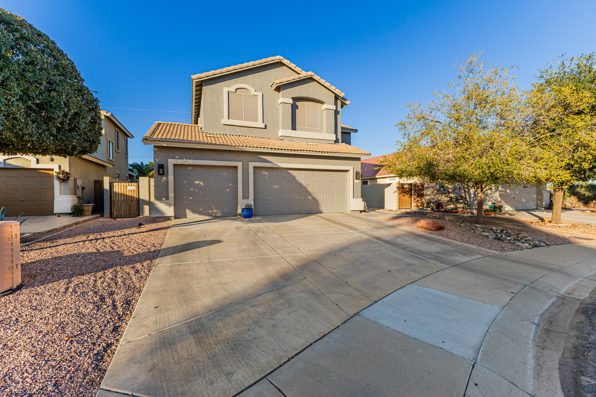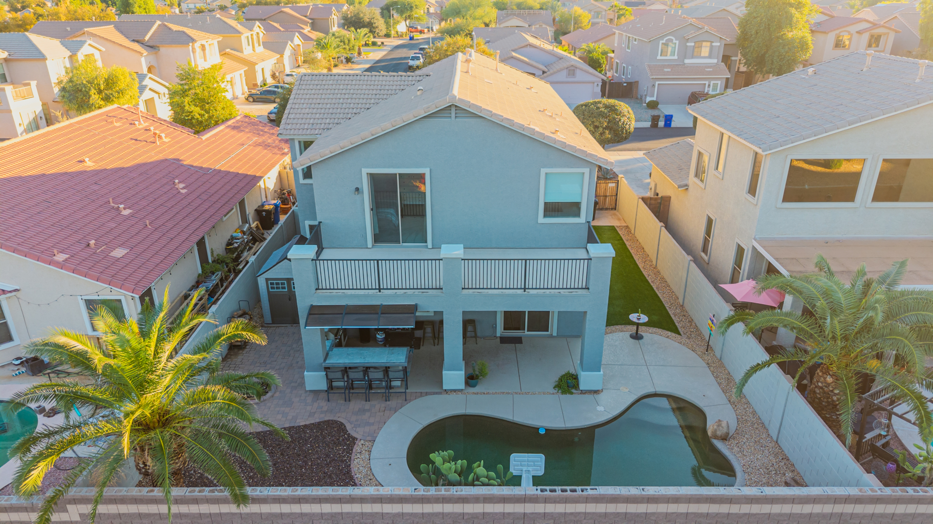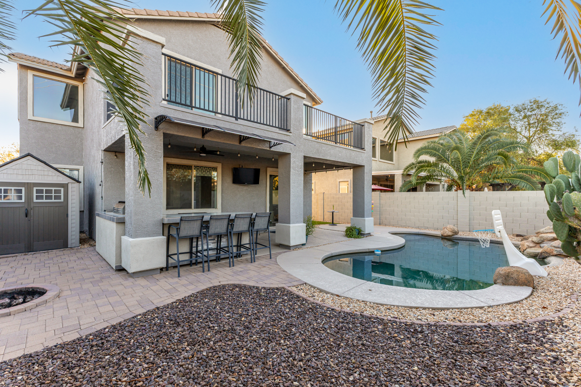 Discover this vibrant 2-story gem featuring a generous 3-car garage and inviting spaces throughout! Soaring ceilings and wood-look floors welcome you into a sizable living room that easily doubles as a fun game area. Family room offers charming wall niches, while the kitchen shines with SS appliances including double wall ovens, granite counters, a breakfast bar, ample cabinetry, and a tile backsplash. Primary bedroom offers a good night's sleep and treats you to direct balcony access. Loft is perfect for an office or creative corner. Sip your favorite beverage on the balcony, check out the backyard oasis boasting a covered patio, dry bar, built-in BBQ, firepit, shed, and a play pool ready for sunny days. This home truly has it all! Don't miss it!